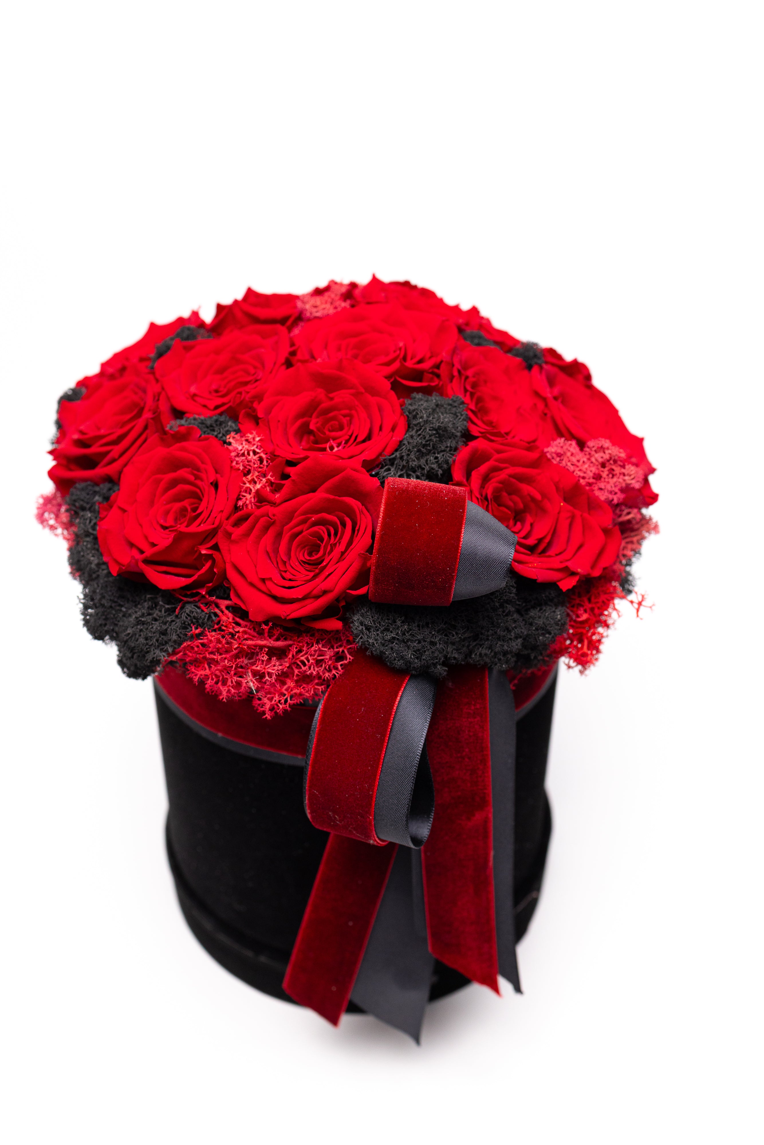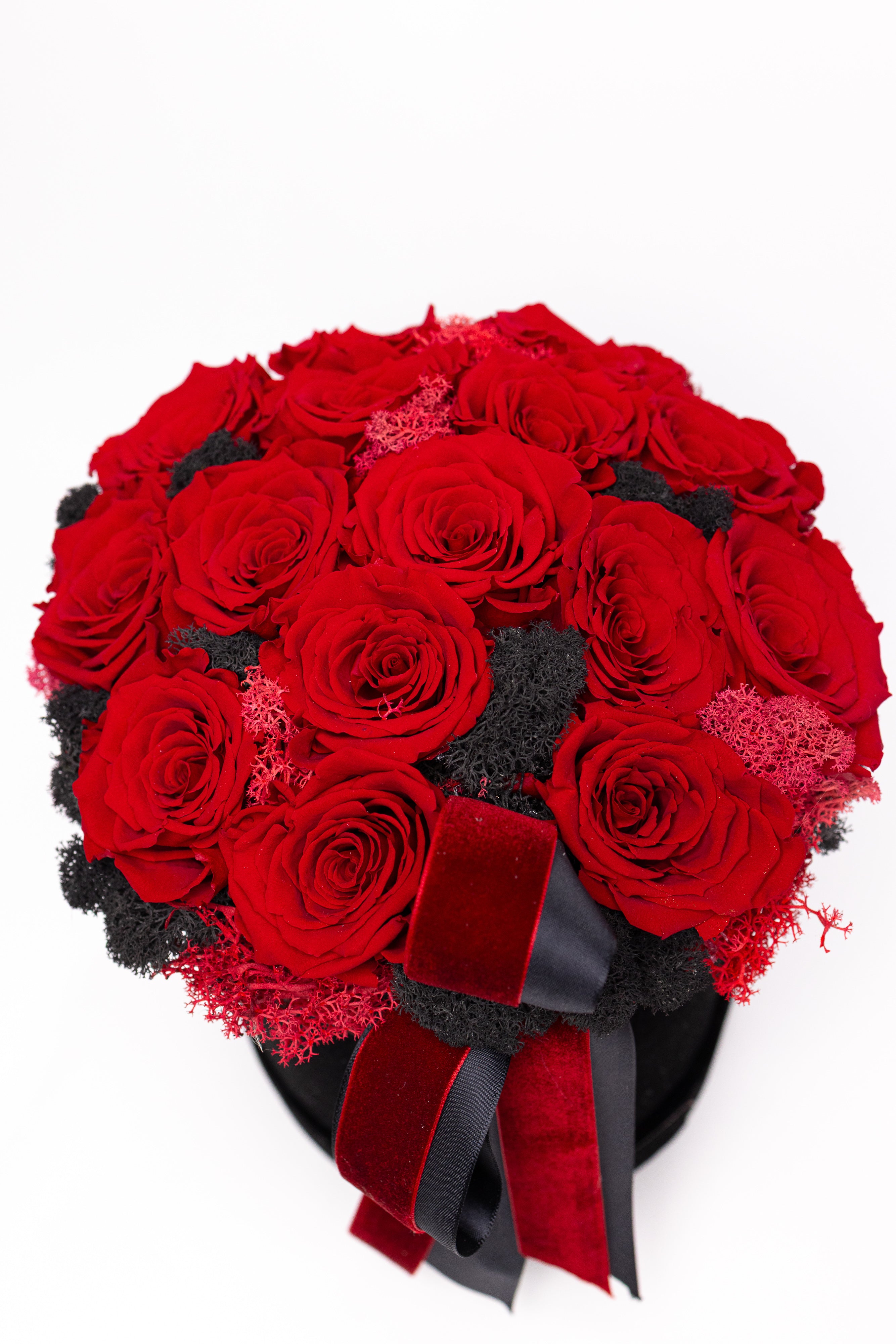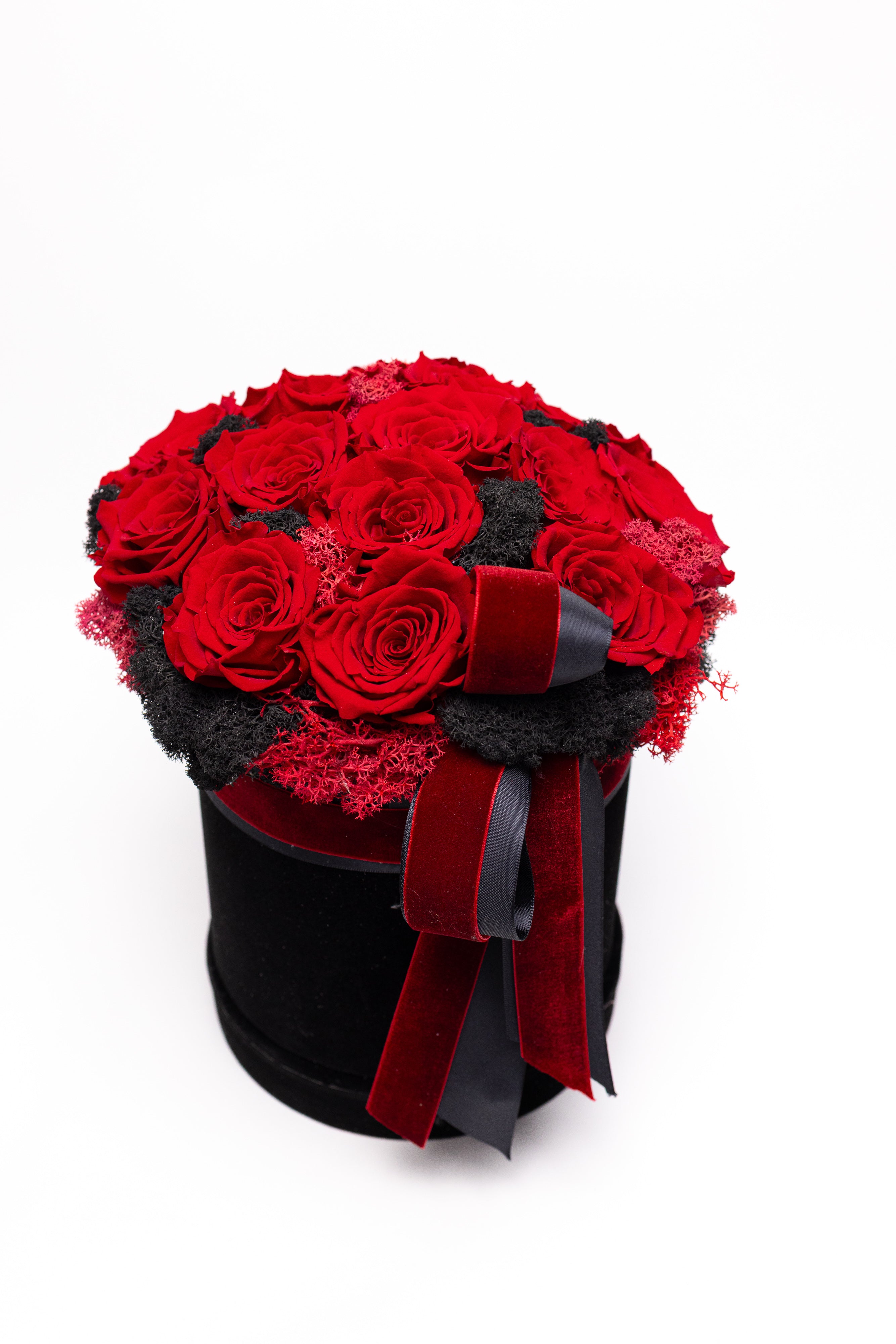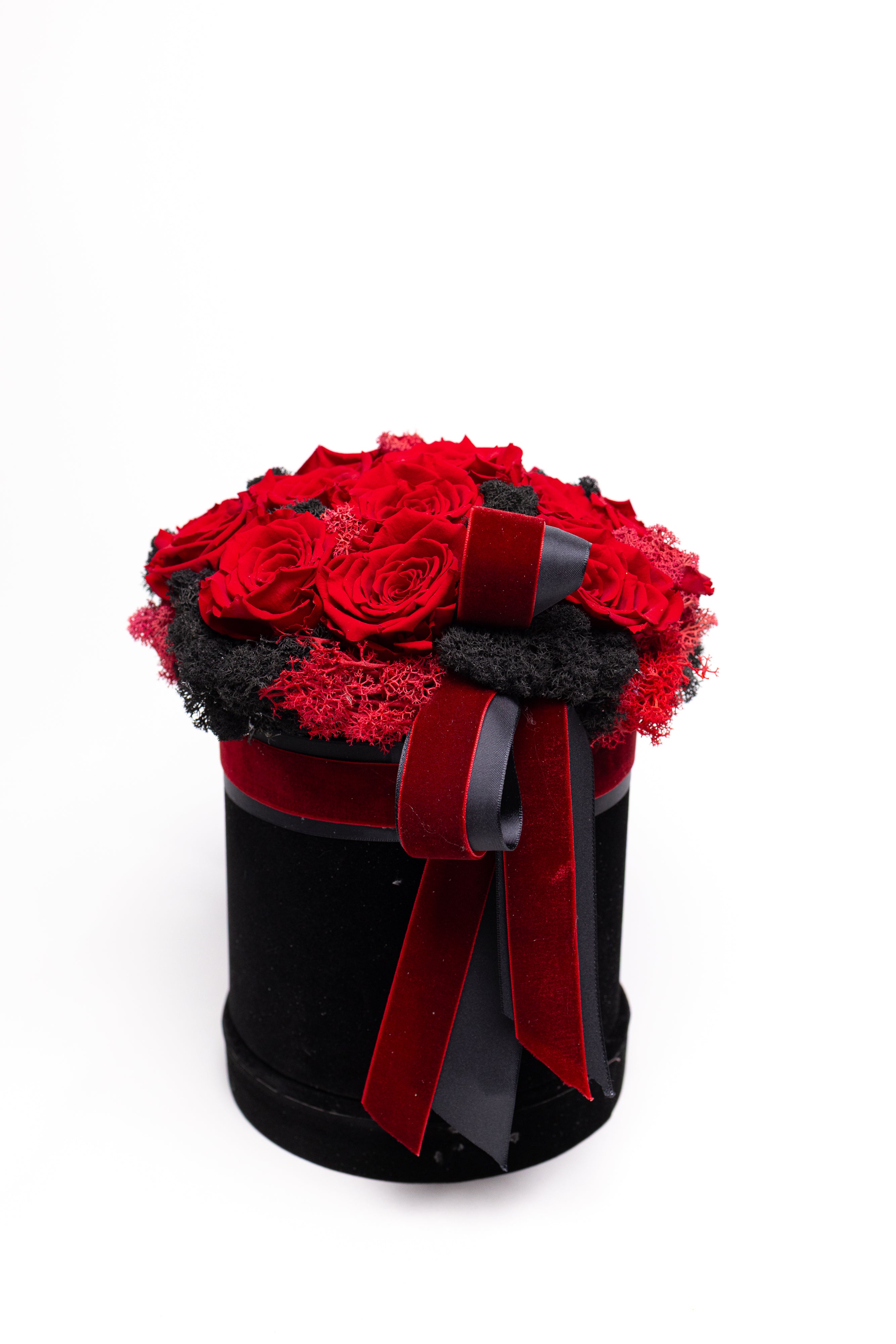 Cutie rotundă din catifea neagră cu 15 trandafiri criogenați roșii, așezați pe un pat de mușchi natural. Accesorizată cu o fundă elegantă bicoloră negru-roșu. Un cadou etern, vibrant și rafinat.
