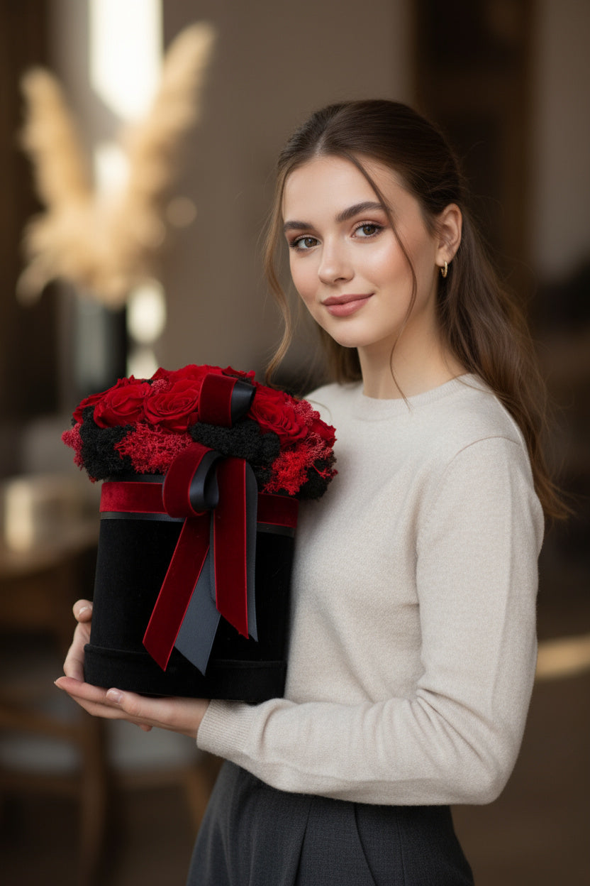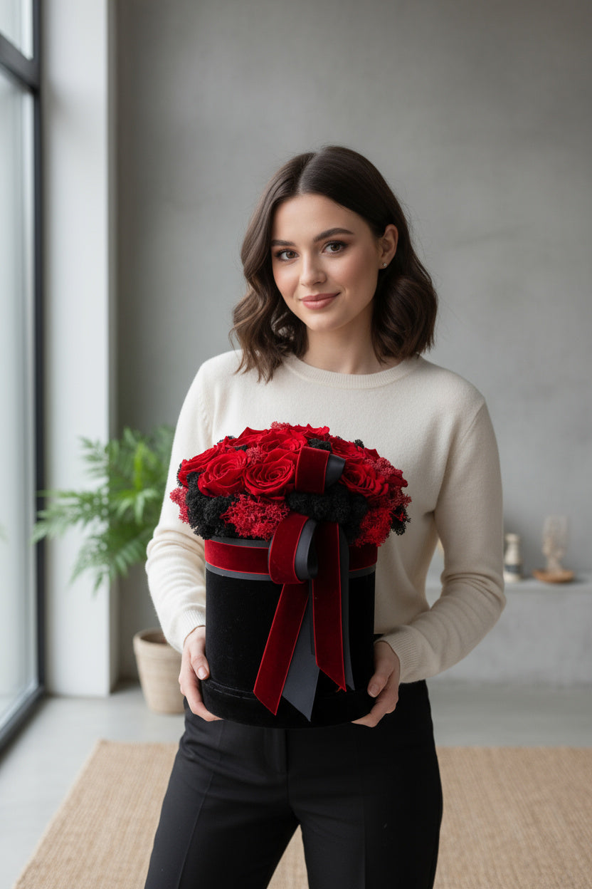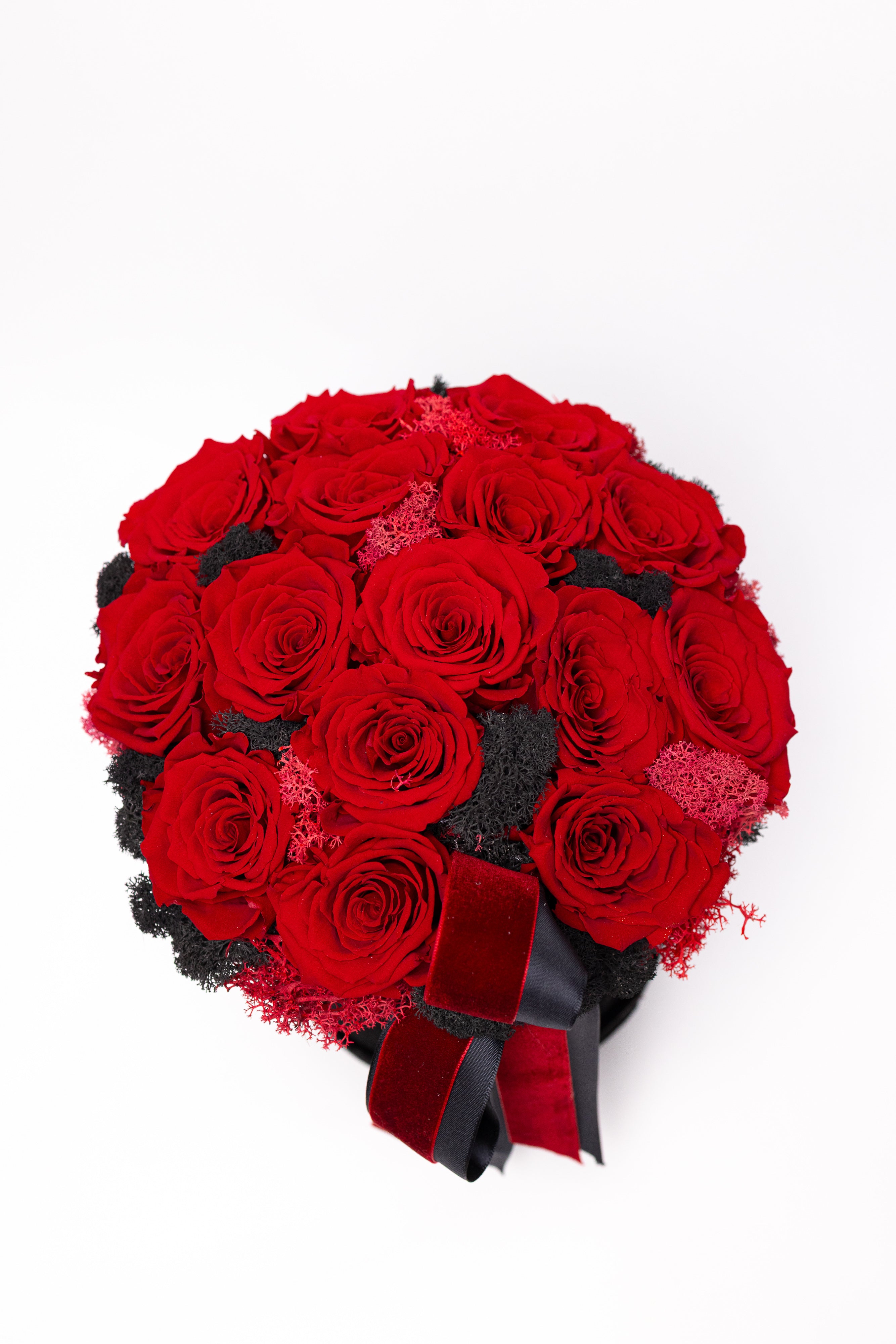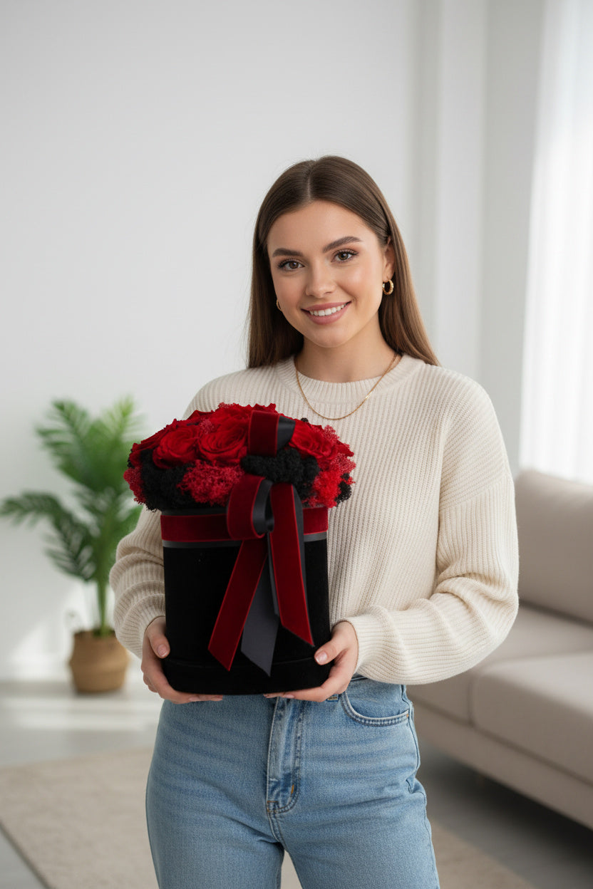 Cutie rotundă din catifea neagră cu 15 trandafiri criogenați roșii, așezați pe un pat de mușchi natural. Accesorizată cu o fundă elegantă bicoloră negru-roșu. Un cadou etern, vibrant și rafinat.