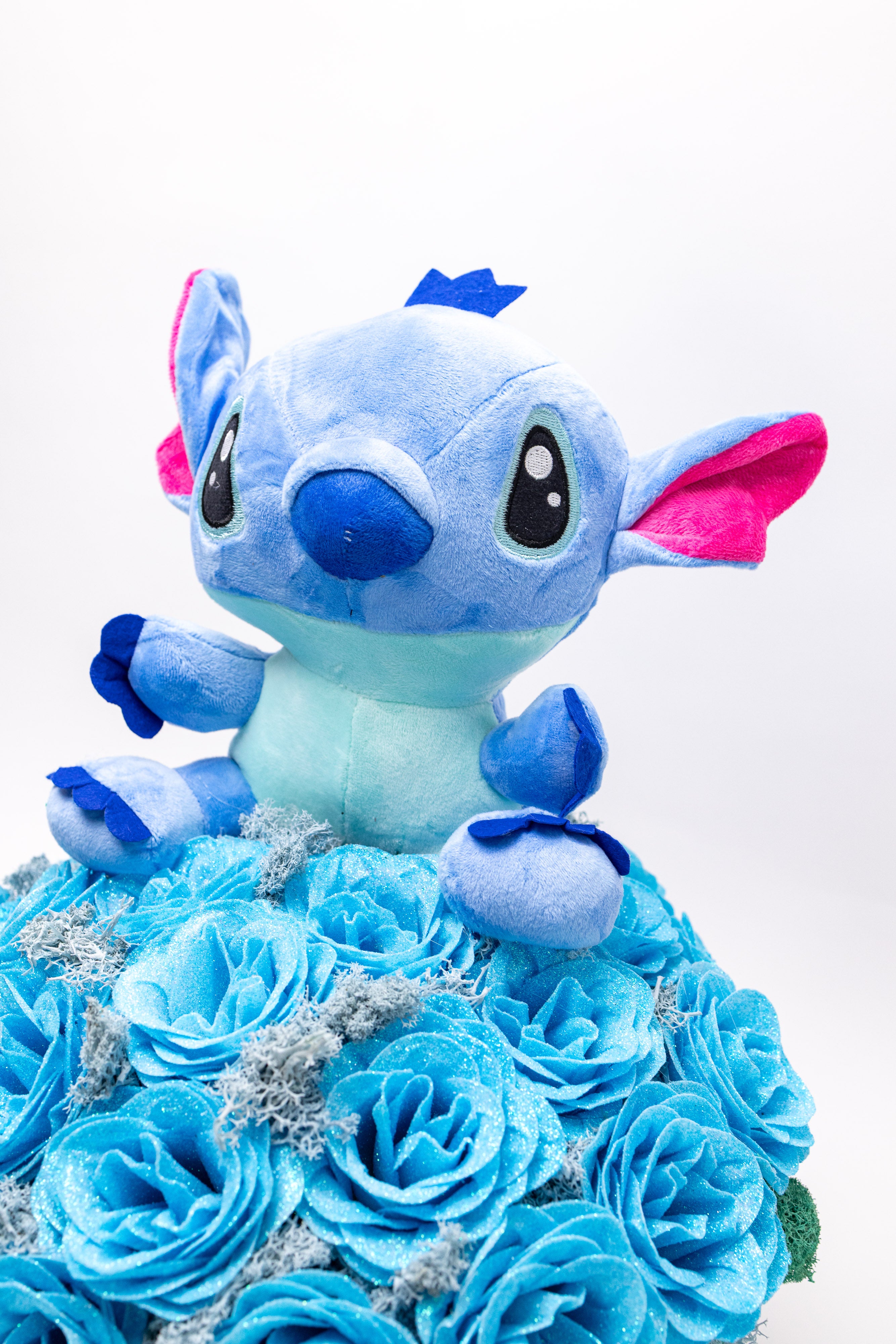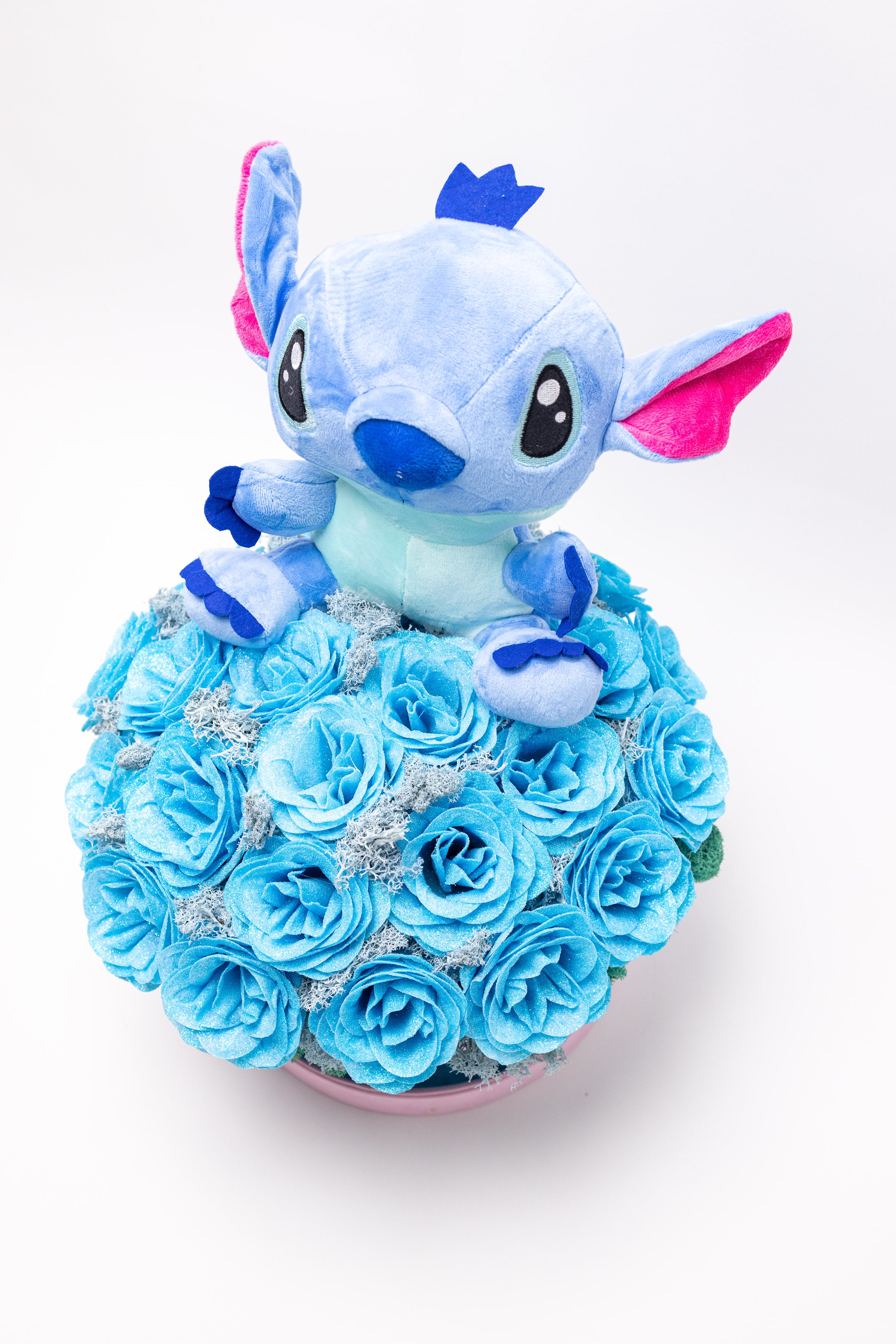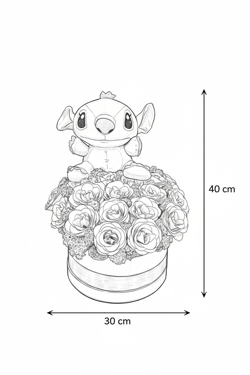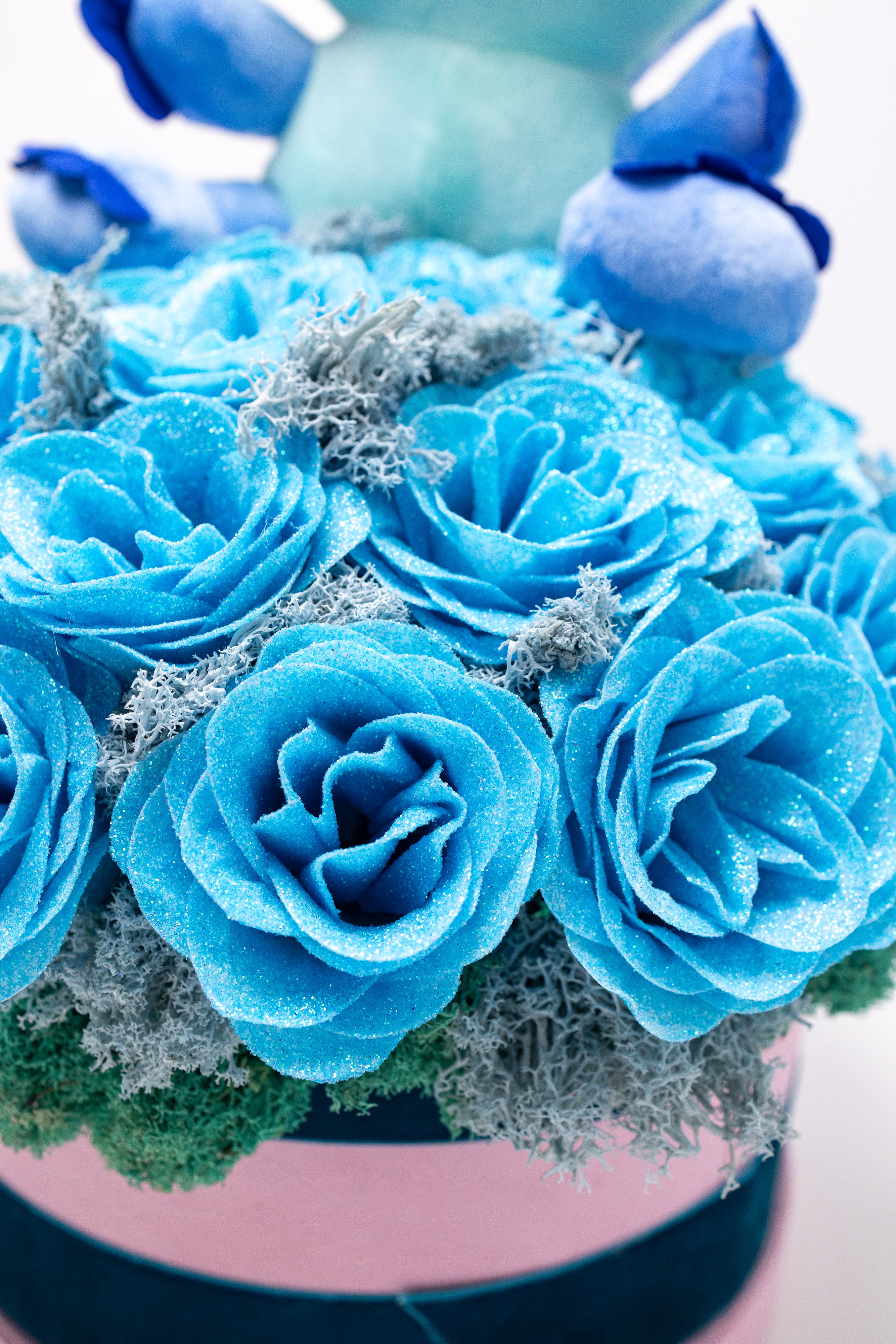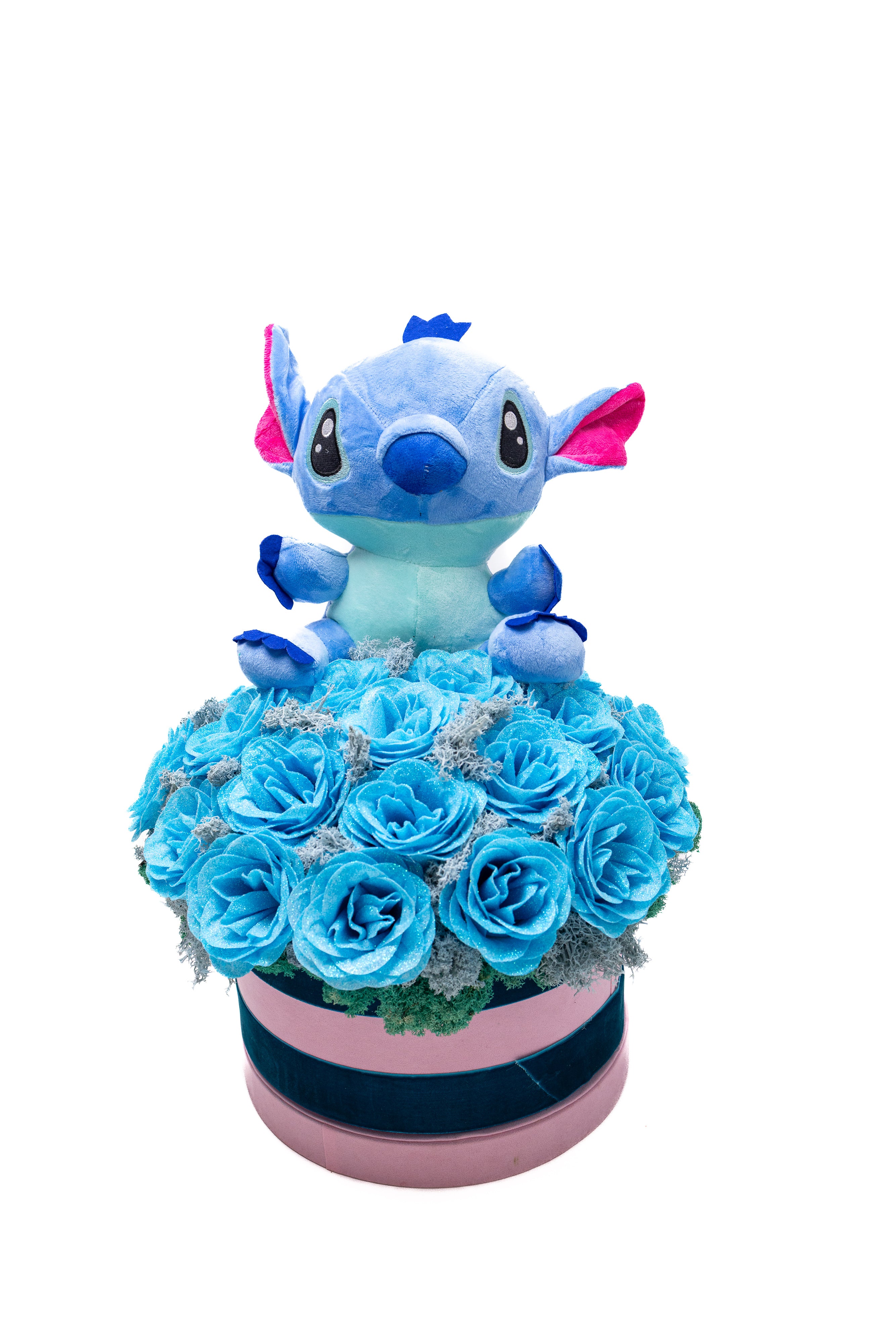 O compoziție jucăușă și strălucitoare, perfectă pentru fanii Disney. Cutia rotundă de culoare bleu (albastru deschis) găzduiește un ansamblu bogat de 23 de trandafiri de săpun "imperiali" în nuanțe de turcoaz-albastru, acoperiți cu un strat fin de glitter. Florile sunt așezate pe un pat de mușchi natural în tonuri de gri-argintiu, oferind un contrast elegant. Piesa centrală este simpaticul personaj Stitch din pluș albastru, care completează acest cadou vesel.