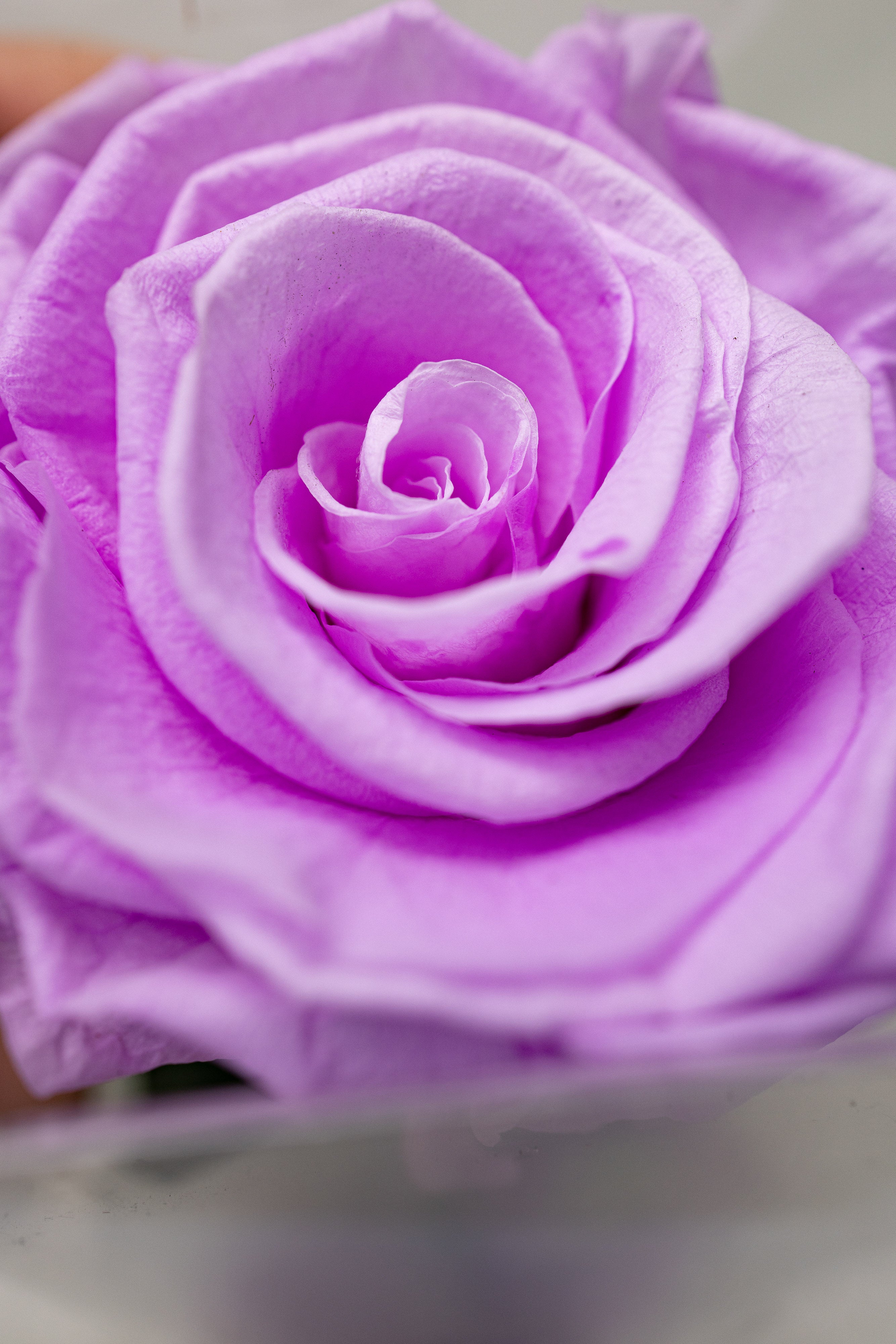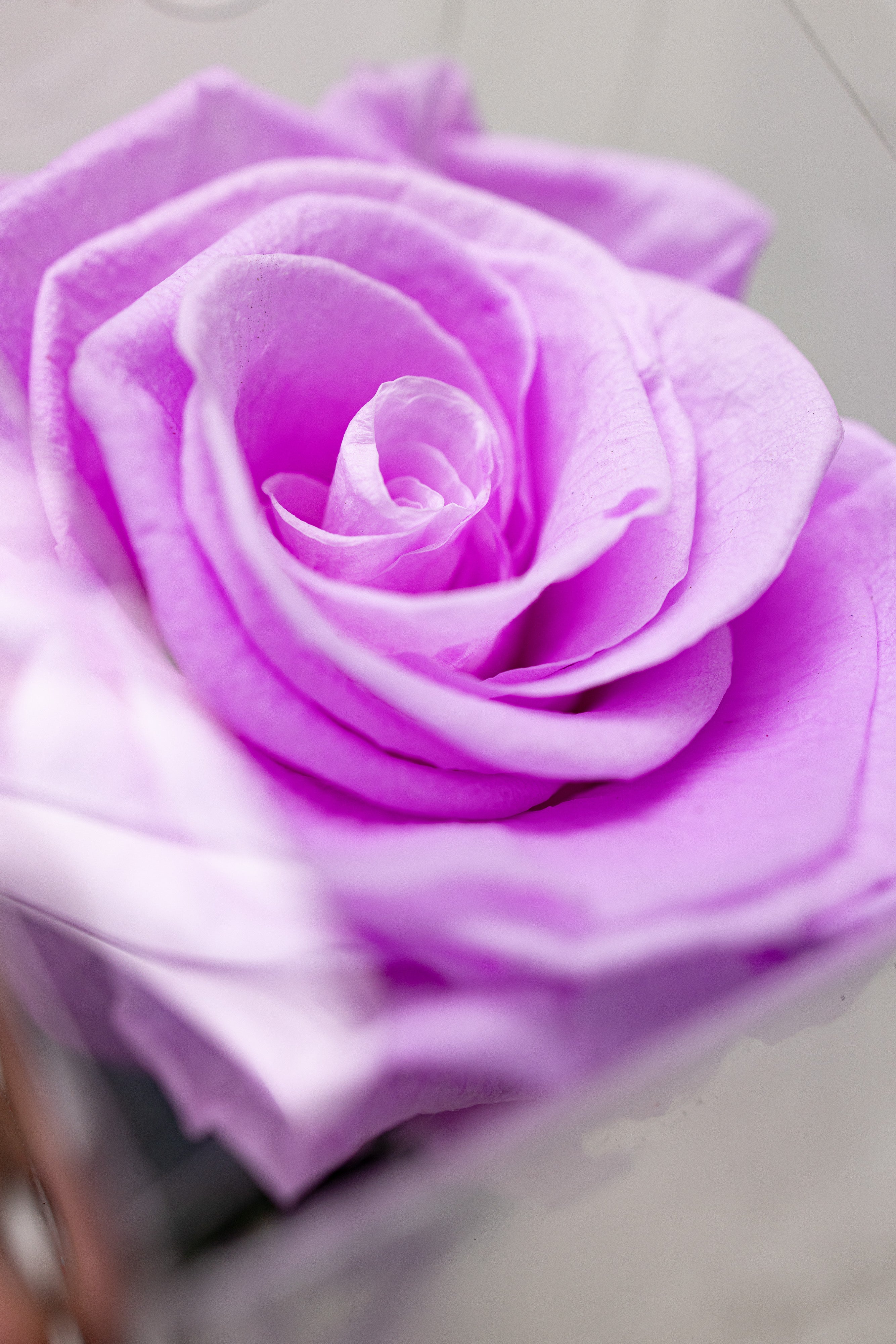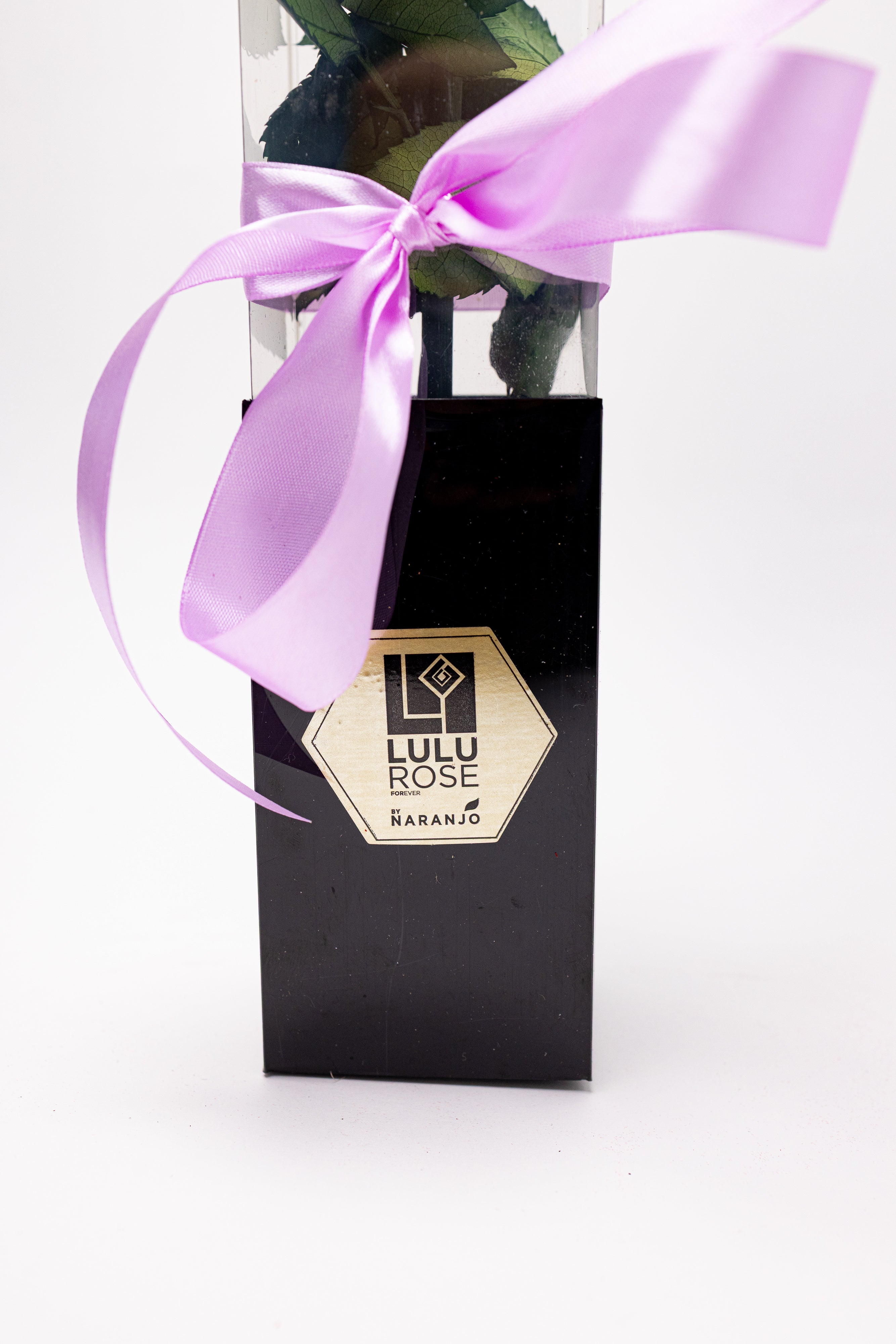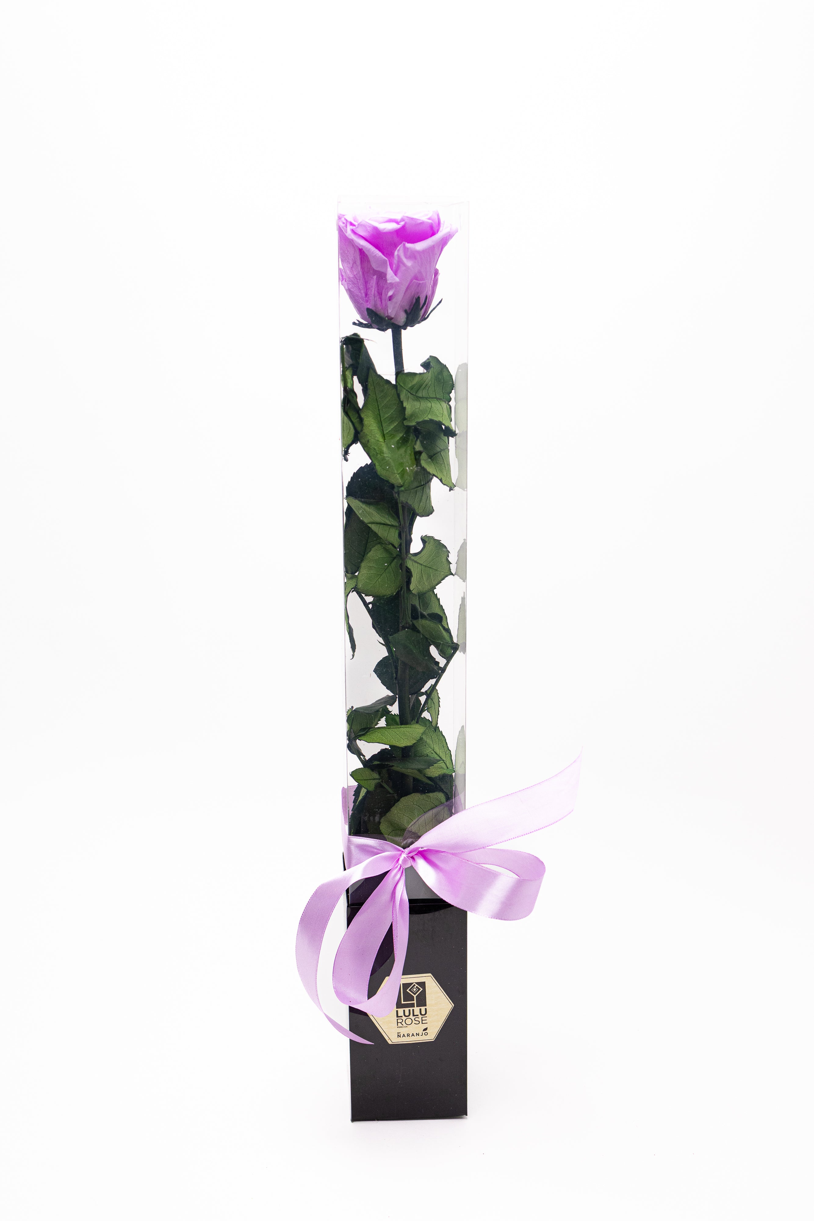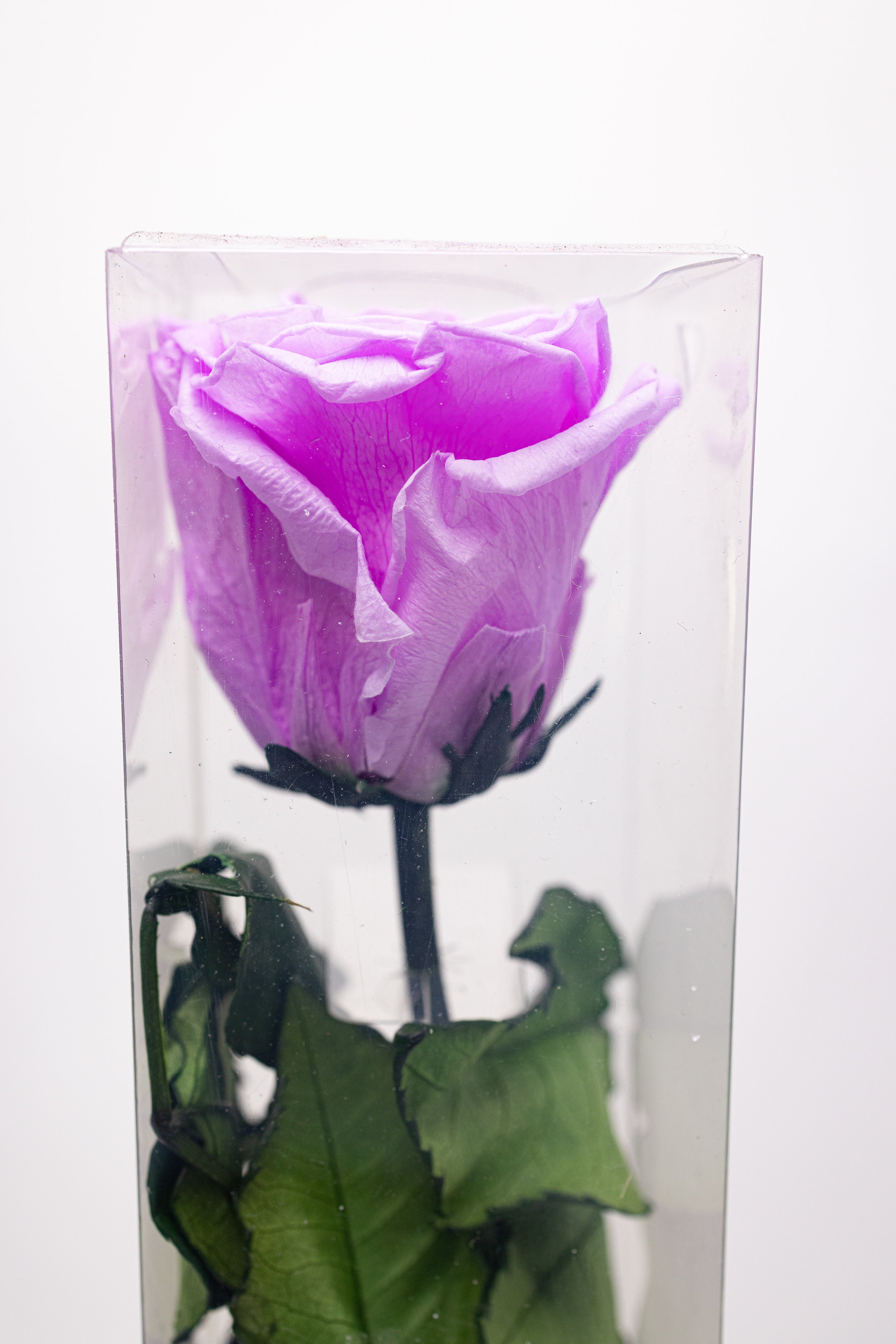 O operă de artă florală ce prezintă un trandafir criogenat lila impunător, păstrat pe tulpină naturală cu frunze verzi. Securizat într-o cutie verticală transparentă cu bază neagră și sigiliu auriu, acest simbol al eleganței eterne este desăvârșit de o fundă fină din satin roz-lila.