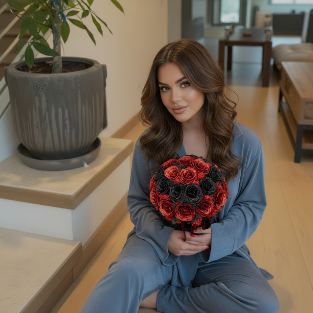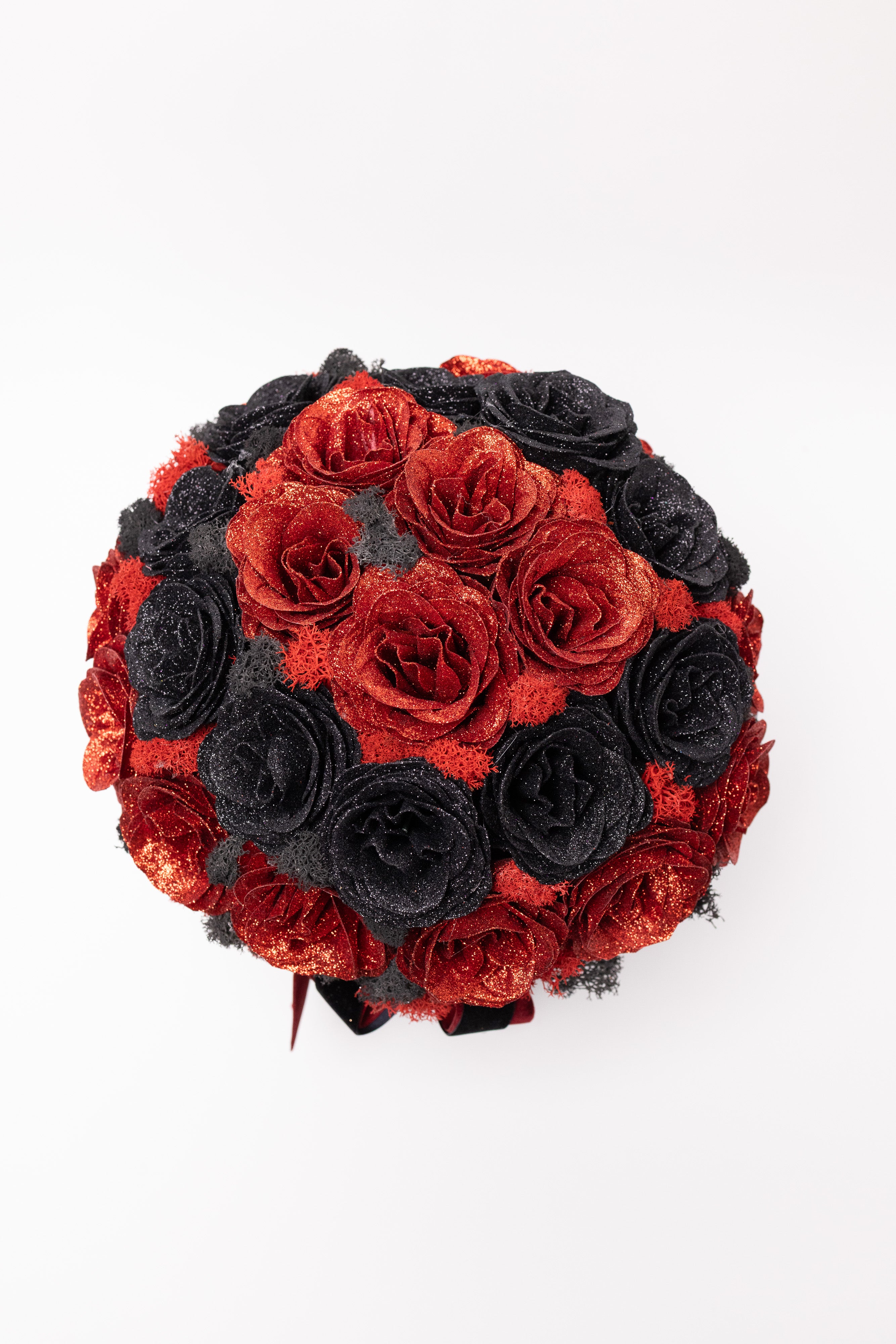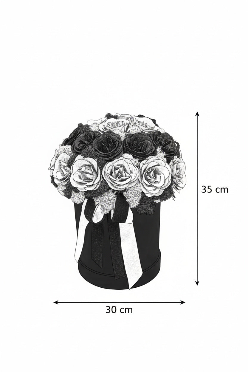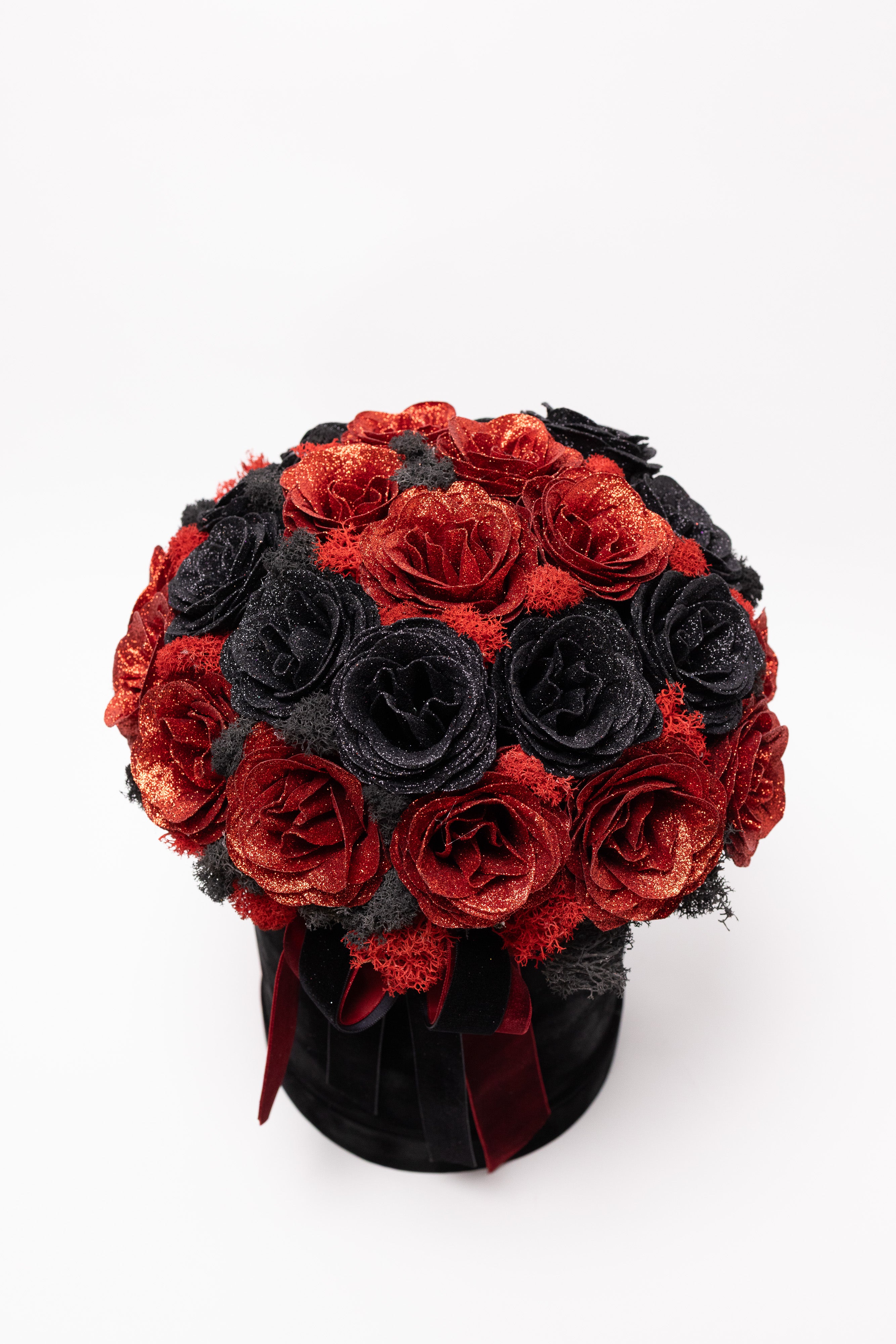 O capodoperă a designului floral de ultra-lux, prezentată într-o cutie cilindrică din catifea neagră profundă. Aranjamentul este compus din aprox. 35 de trandafiri imperiali de săpun cu glitter, într-o combinație dramatică de roșu rubiniu și negru onix. Textura sclipitoare a petalelor este pusă în valoare de un decor bogat din mușchi natural și licheni roșii stabilizați. Ansamblul este finisat cu o fundă dublă somptuoasă din catifea grena și neagră, definind eleganța absolută.