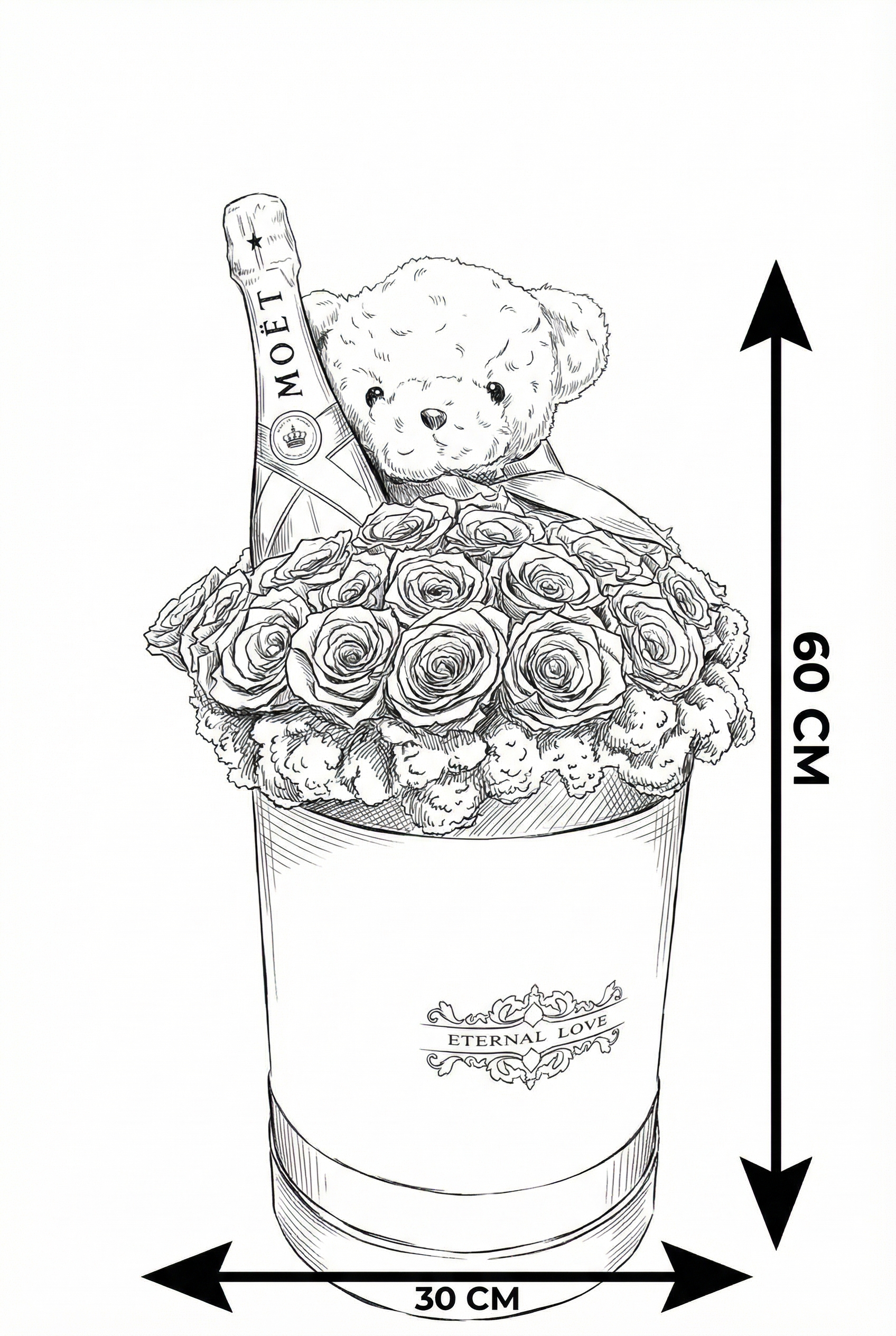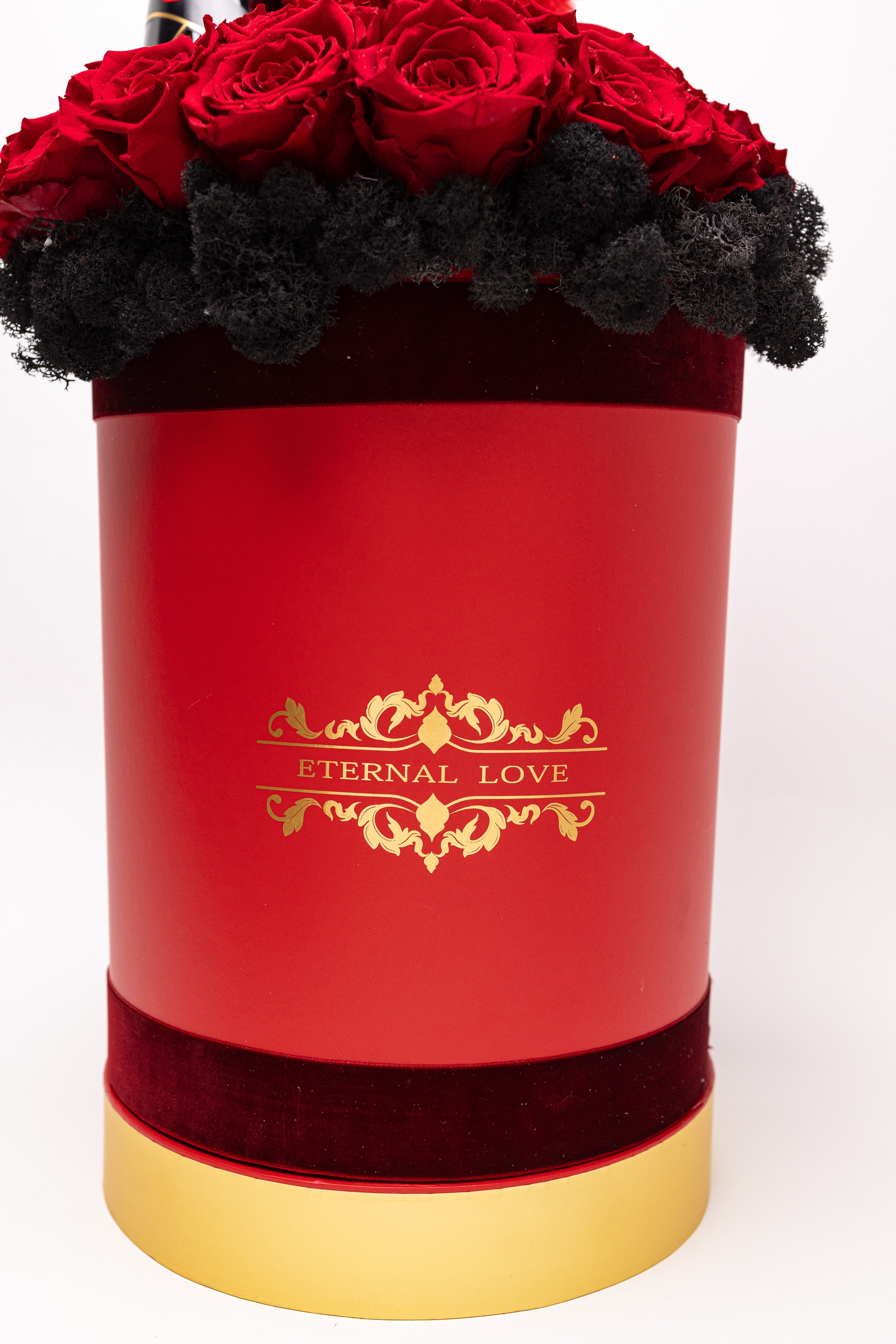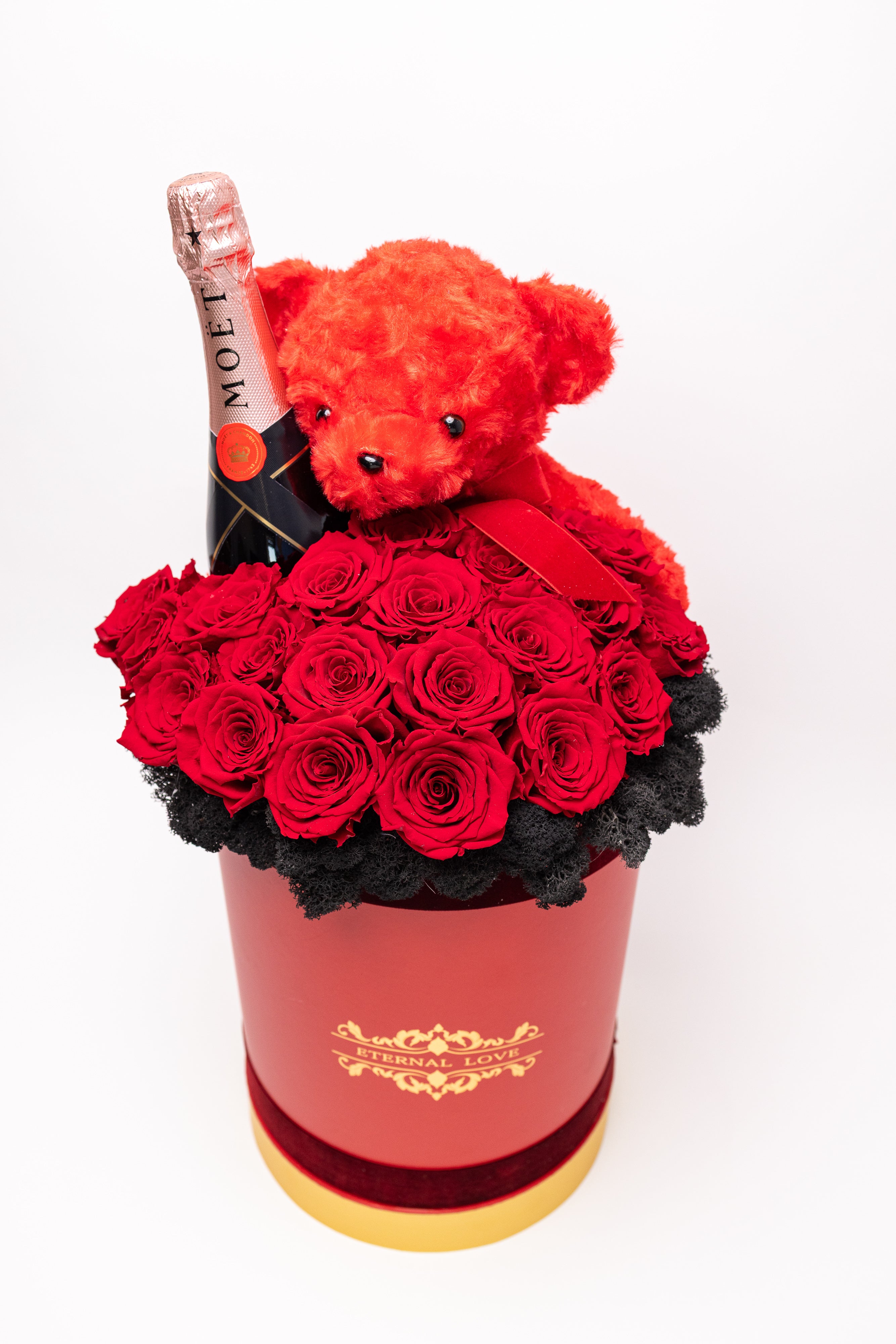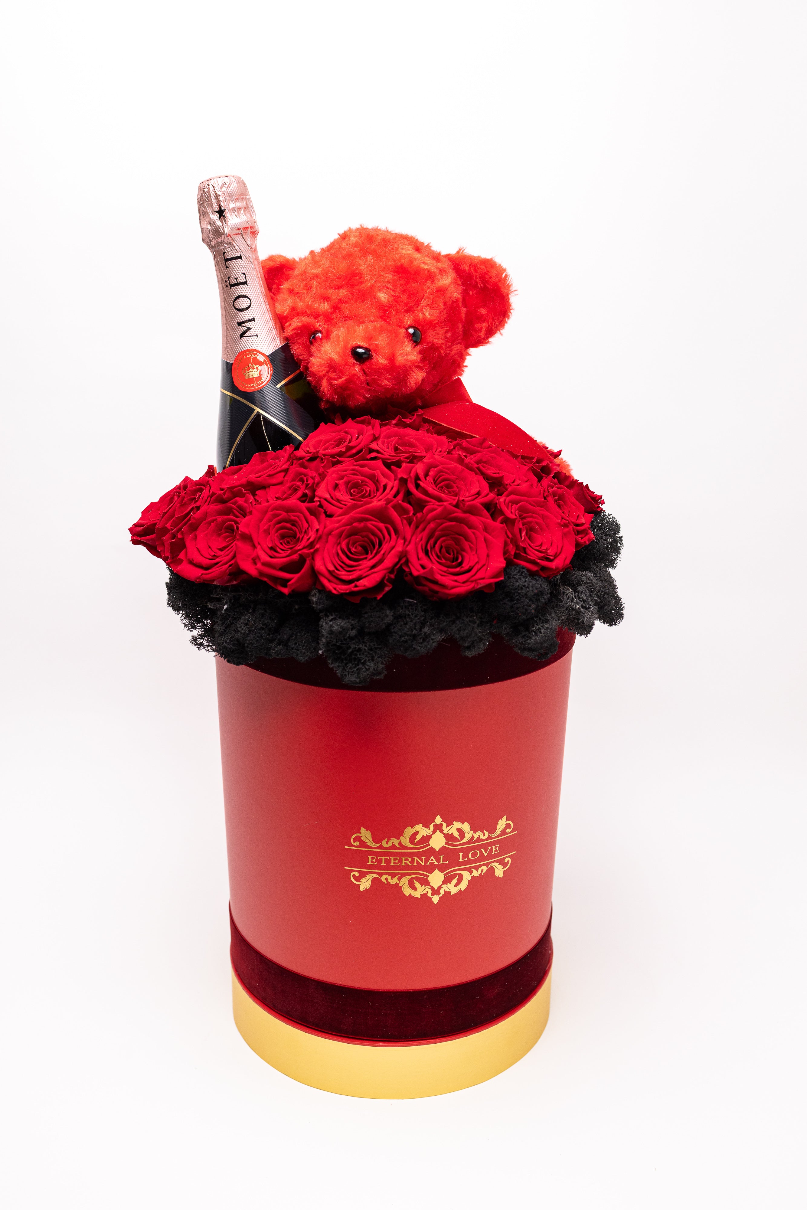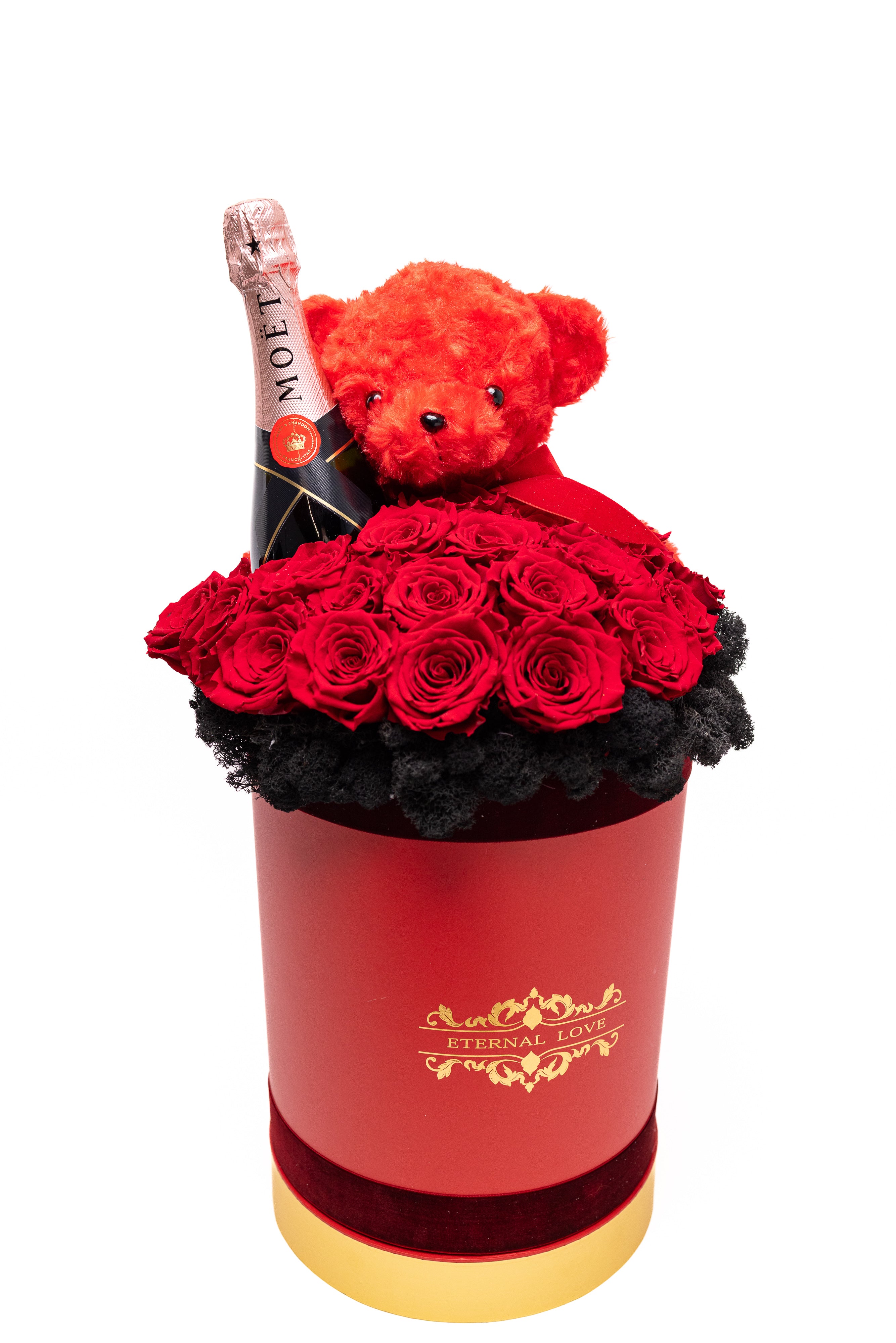 O piesă grandioasă de înaltă clasă. Conține 25 trandafiri criogenați regali, o sticlă de șampanie Moët & Chandon, ursuleț din pluș roșu și un pat sofisticat de licheni negri. Totul este prezentat într-o cutie cilindrică înaltă, finisată cu detalii aurii, emanând un lux absolut lucrat manual.