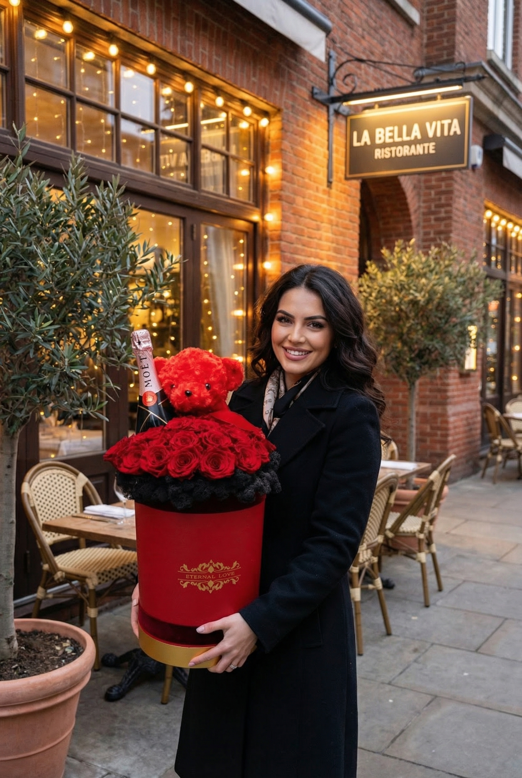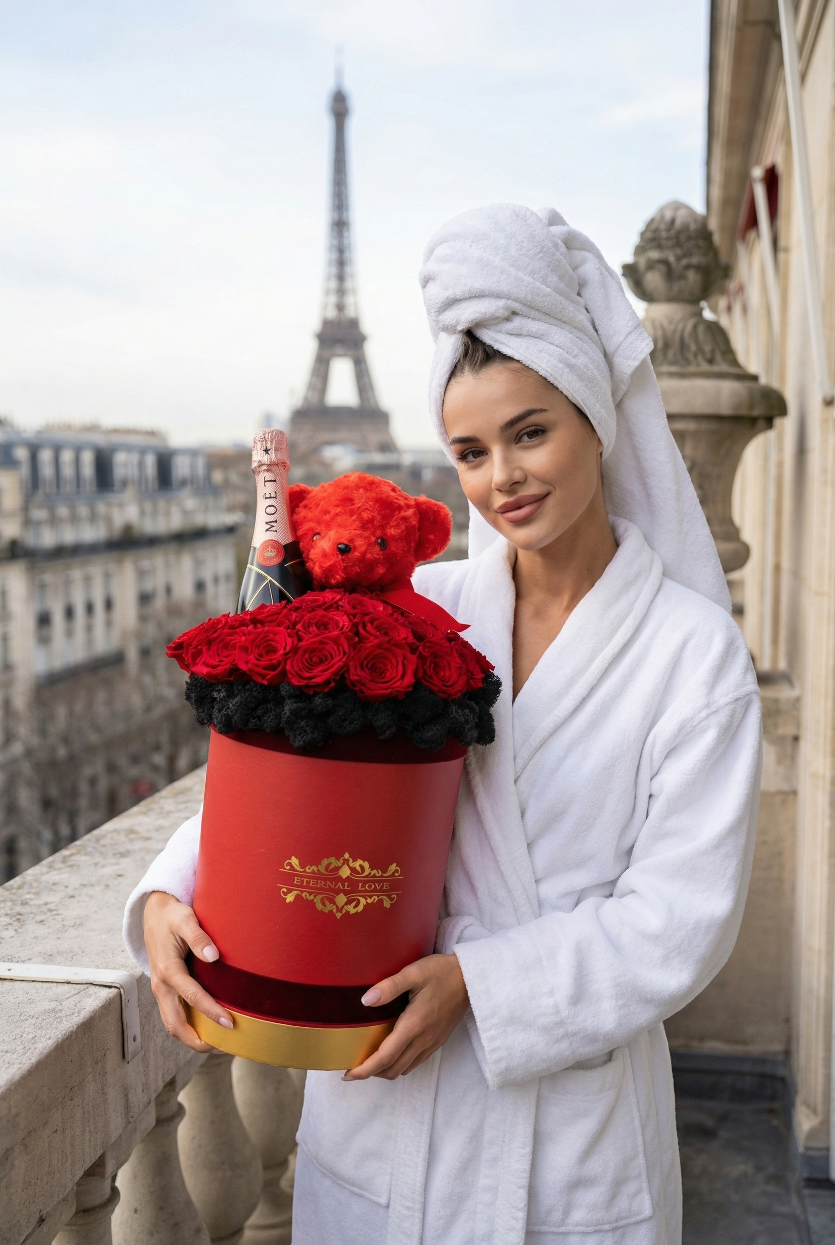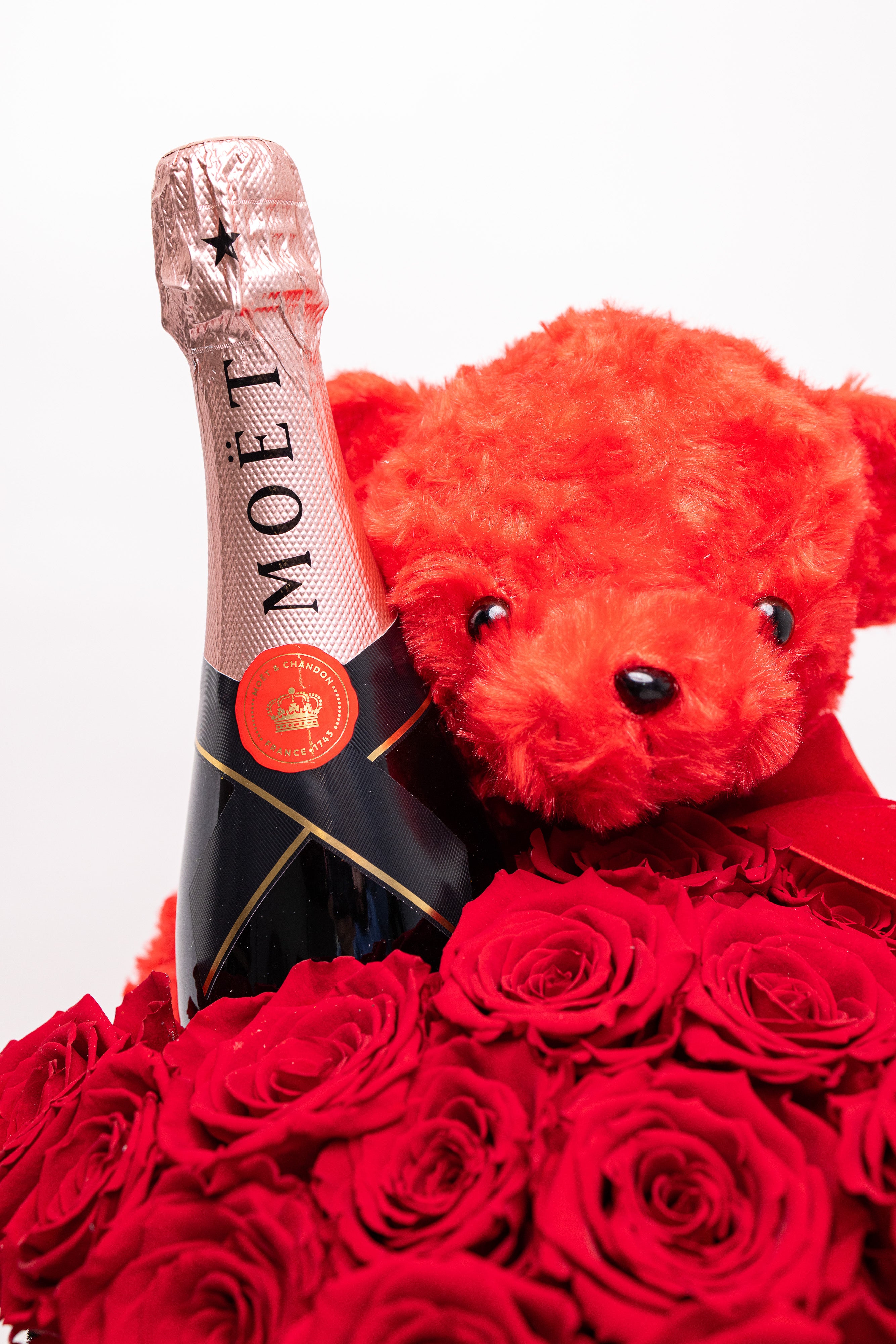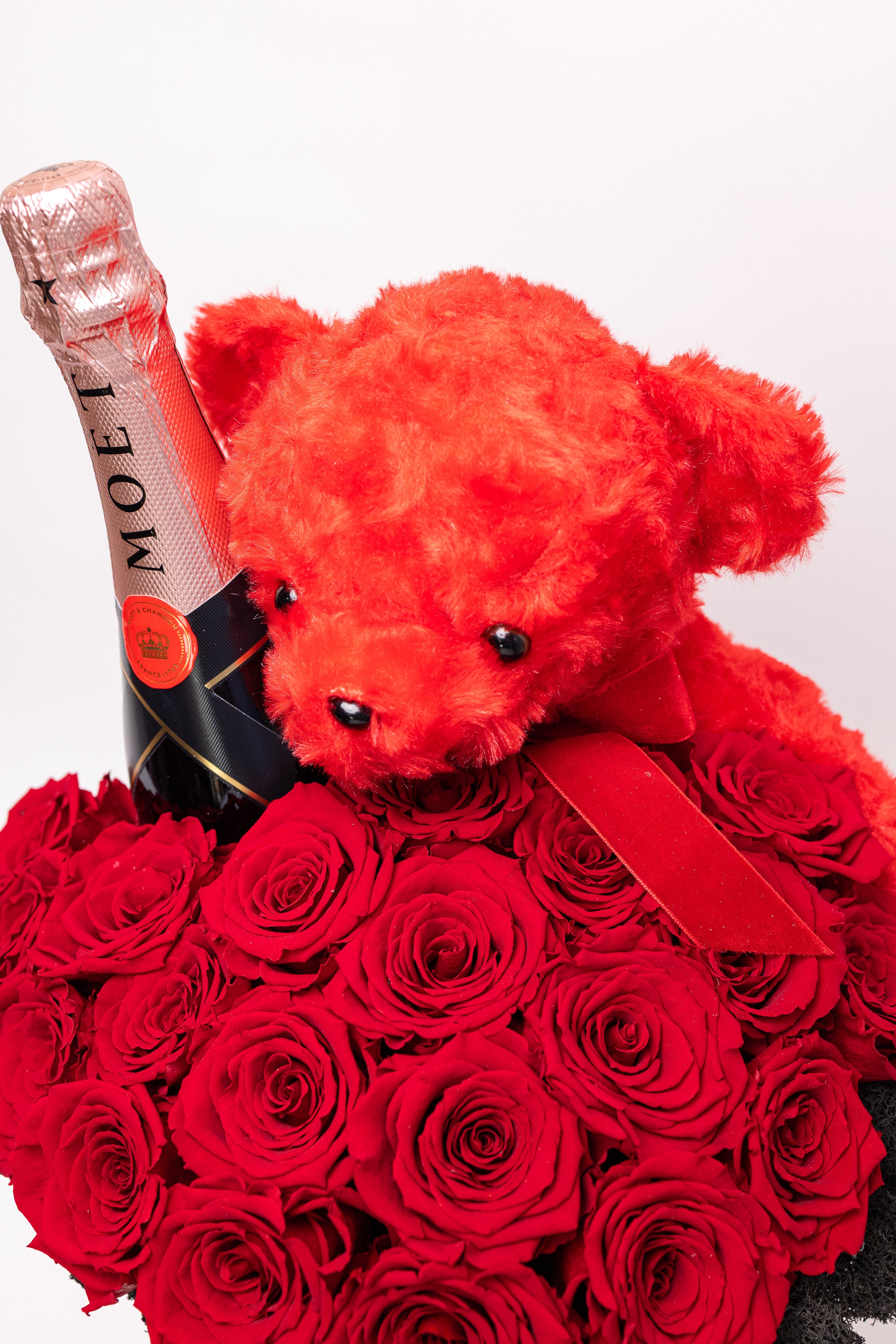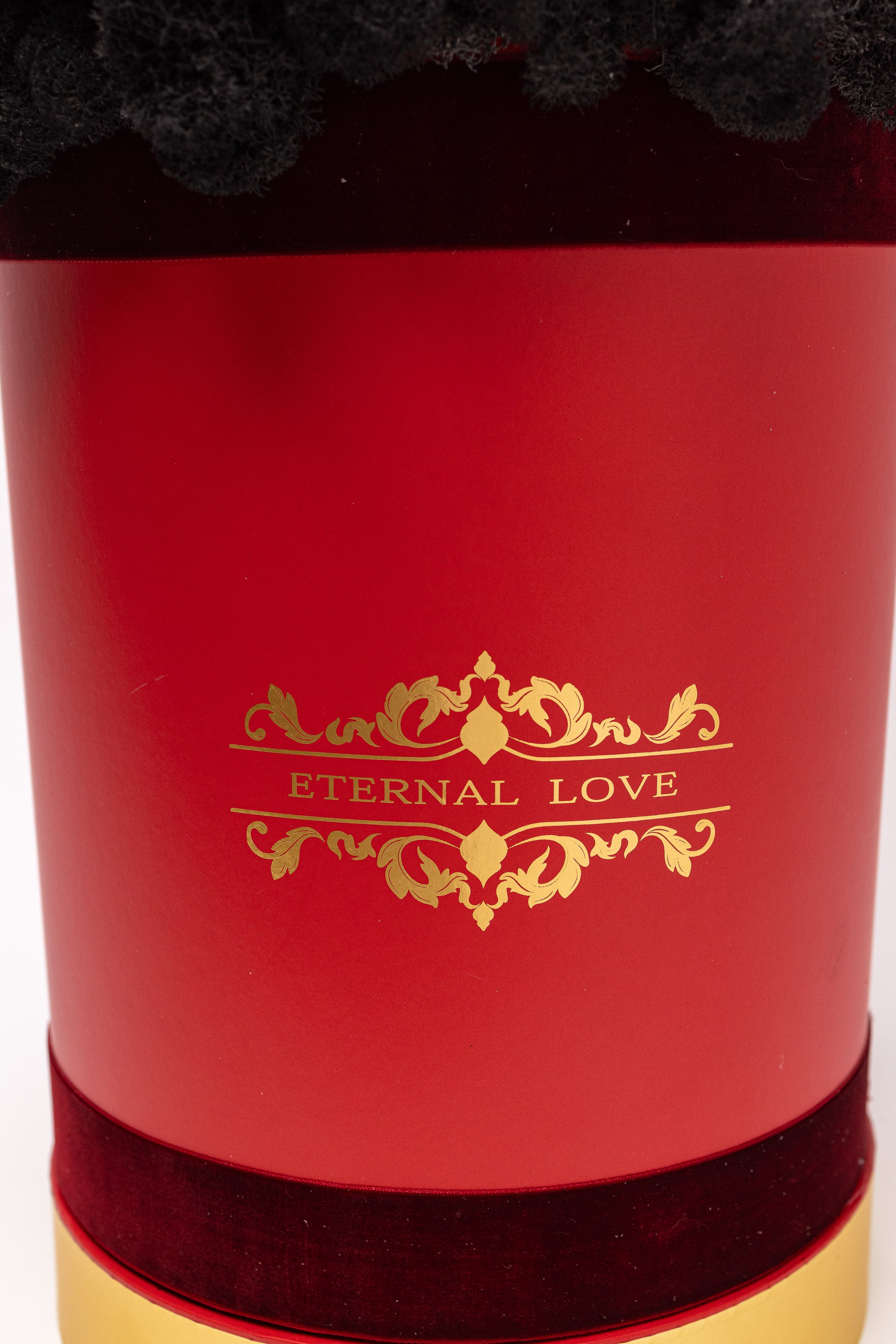 O piesă grandioasă de înaltă clasă. Conține 25 trandafiri criogenați regali, o sticlă de șampanie Moët & Chandon, ursuleț din pluș roșu și un pat sofisticat de licheni negri. Totul este prezentat într-o cutie cilindrică înaltă, finisată cu detalii aurii, emanând un lux absolut lucrat manual.