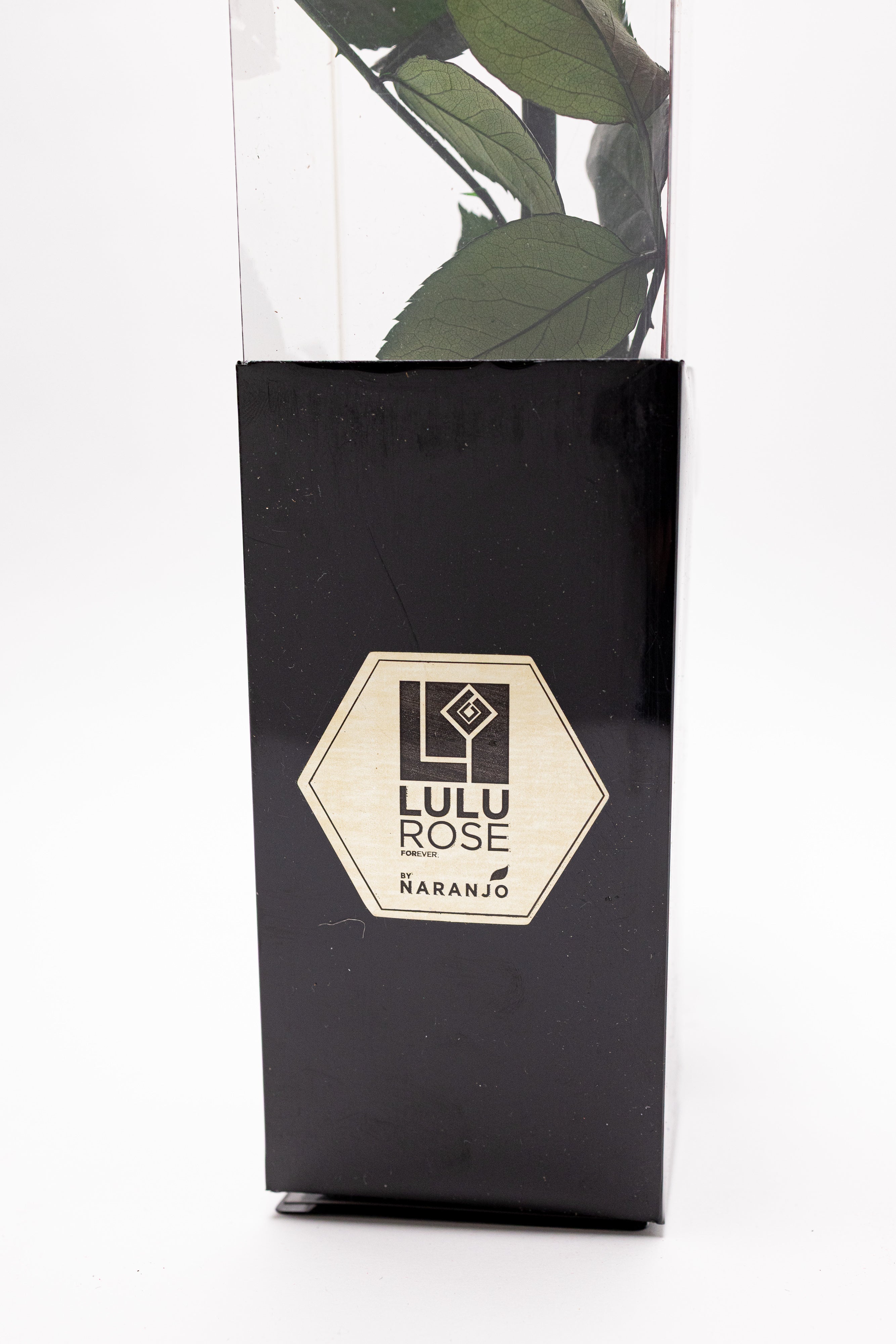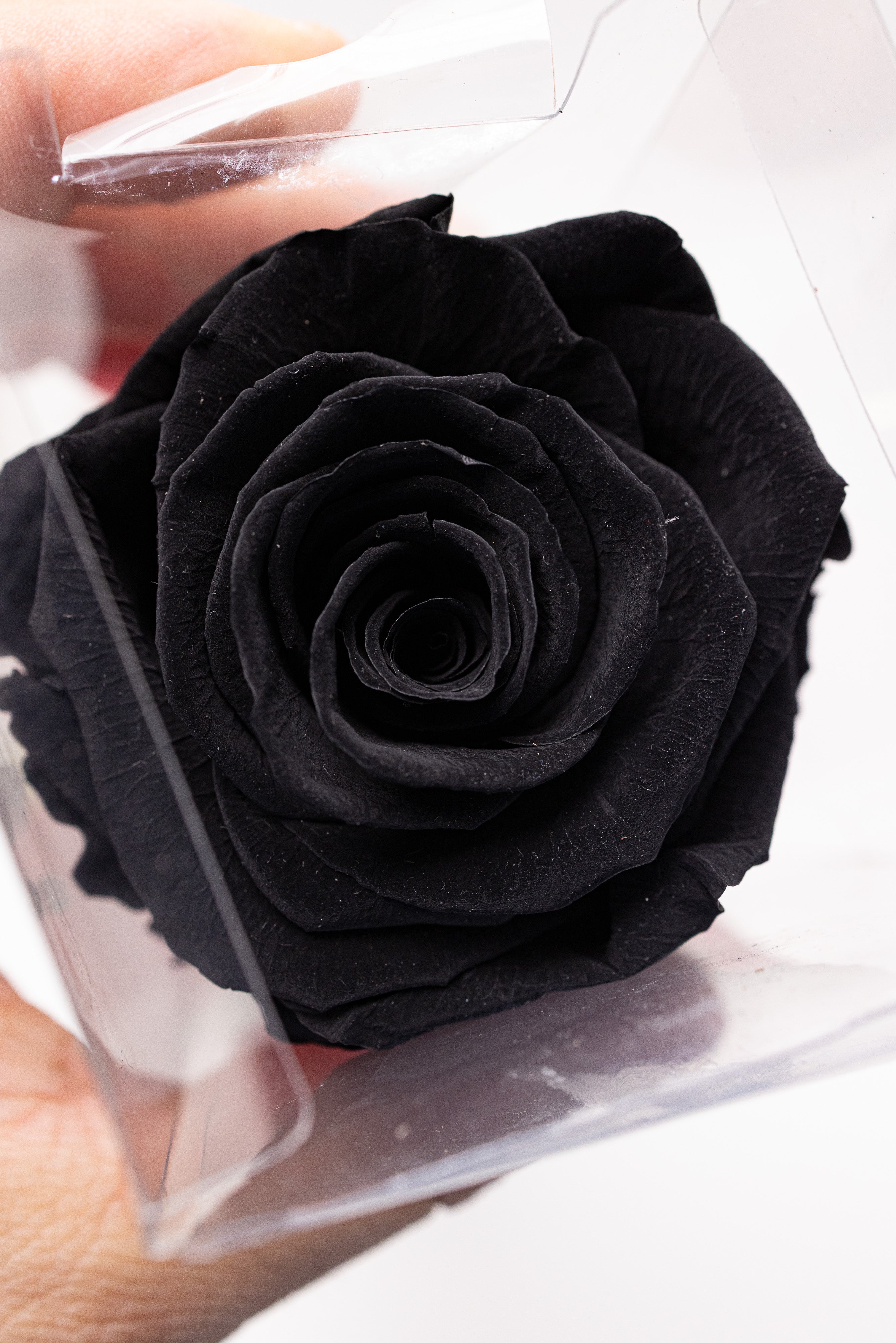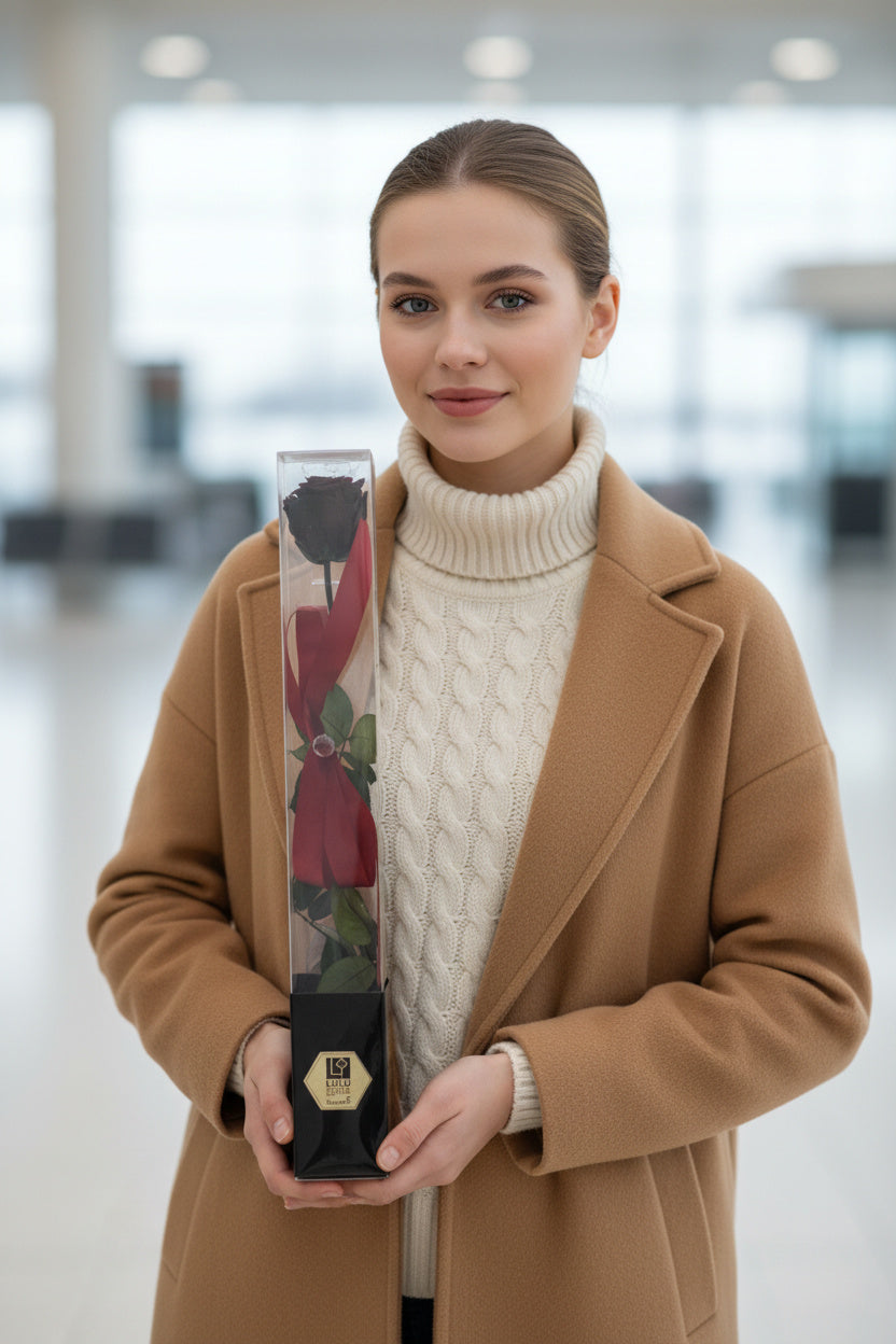 O piesă rară de colecție ce prezintă un trandafir criogenat negru intens pe tulpină naturală cu frunze verzi. Securizat într-o cutie verticală transparentă cu bază neagră și sigiliu auriu, acest simbol al rafinamentului absolut este finisat cu o fundă roșie din satin pentru un contrast dramatic.