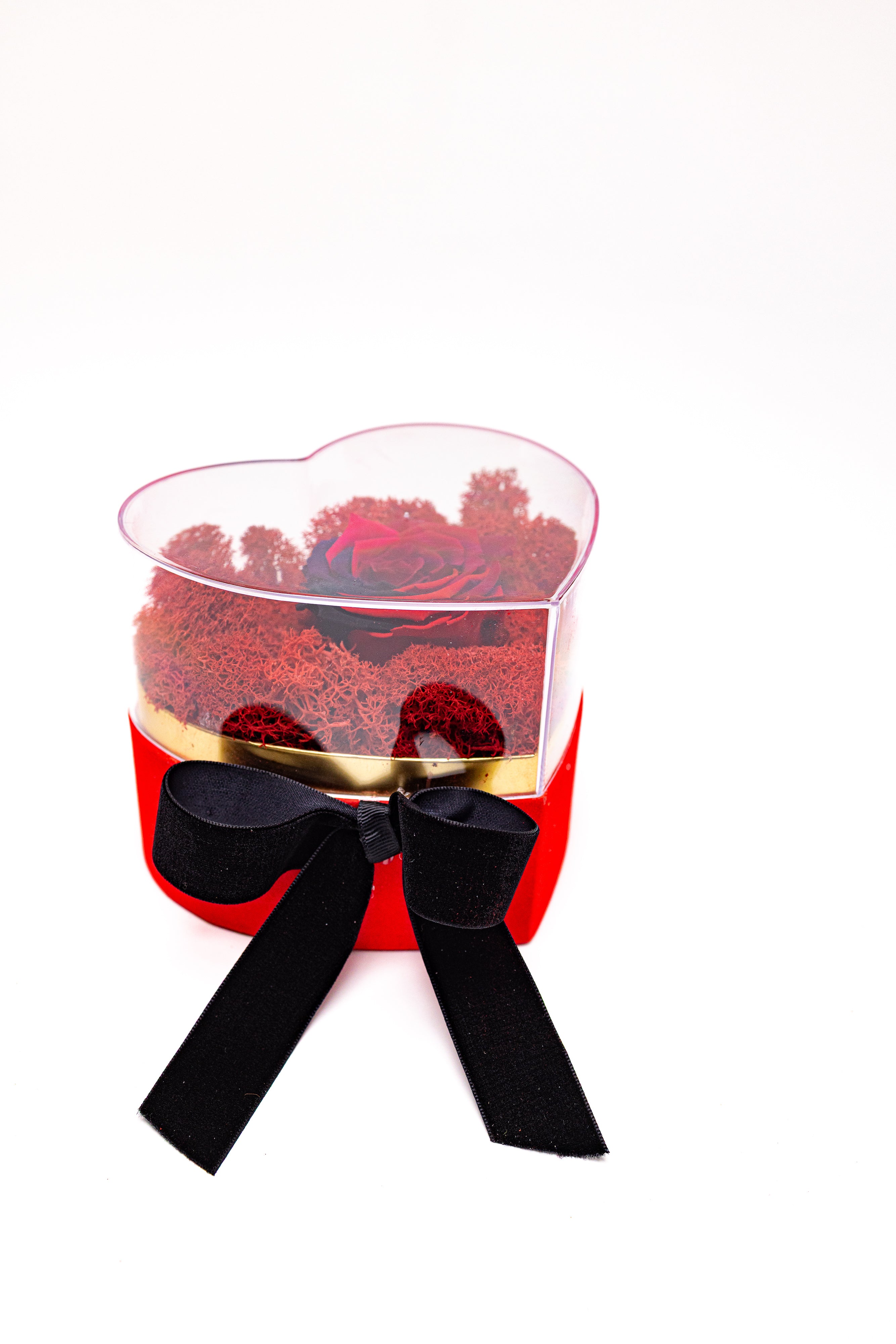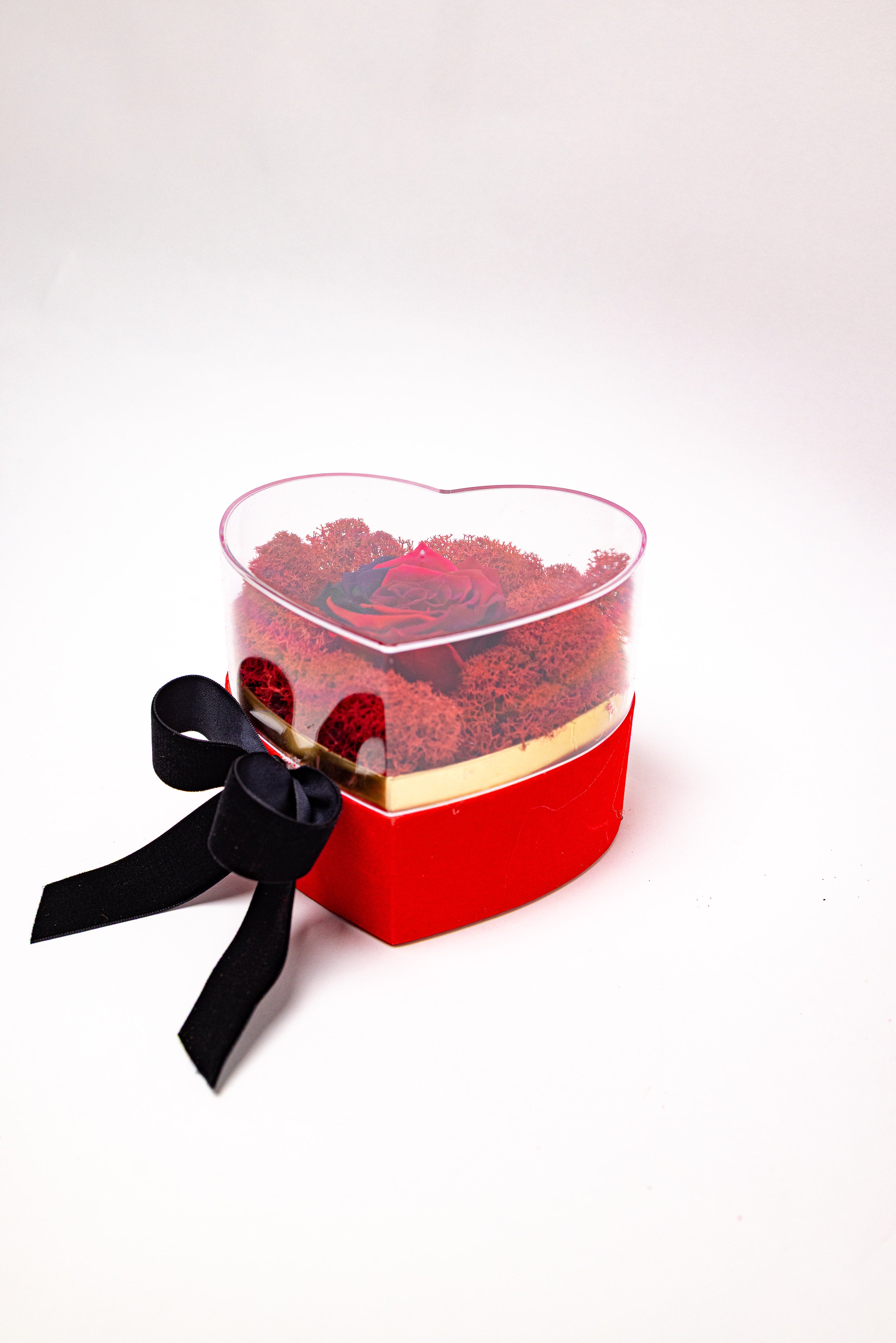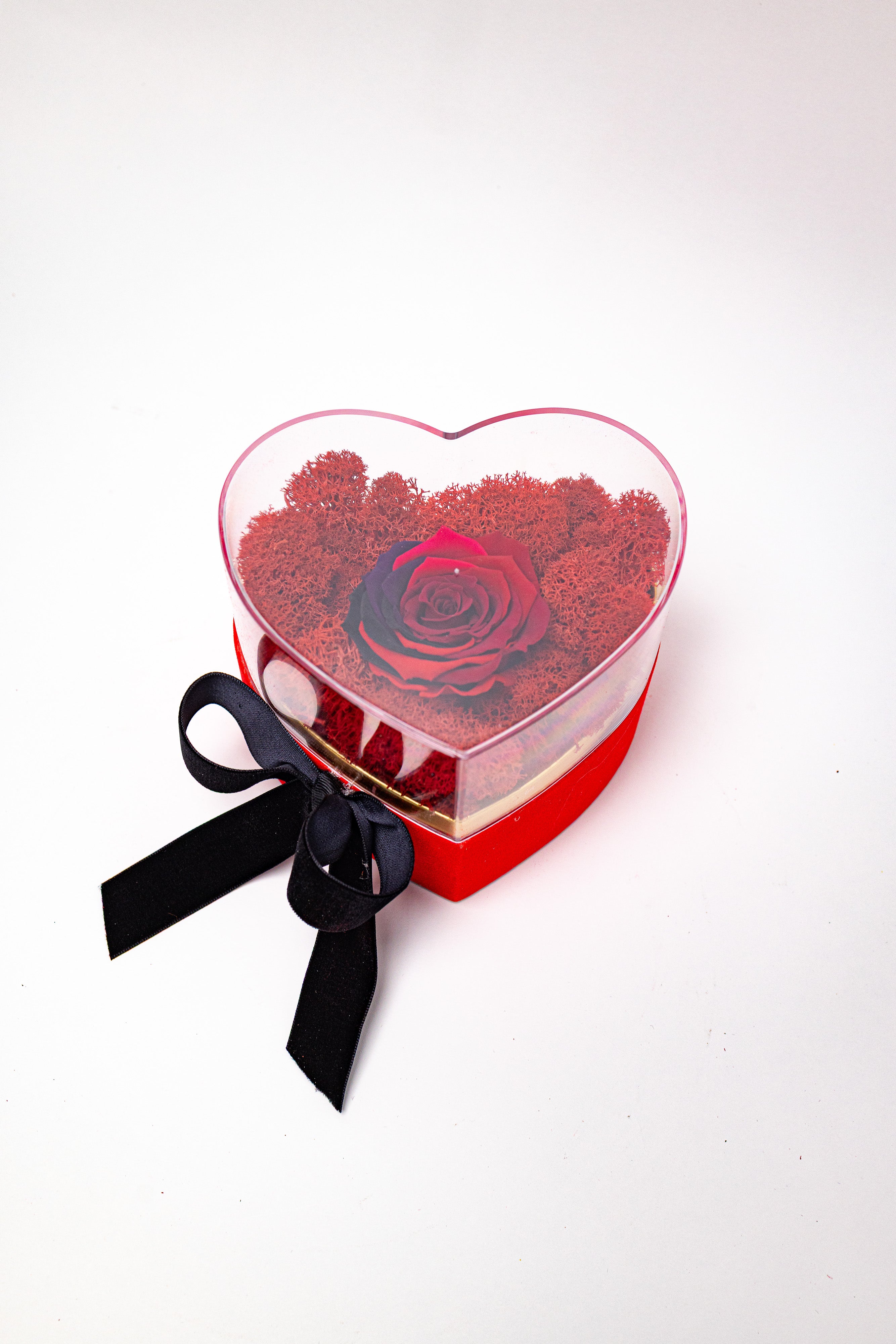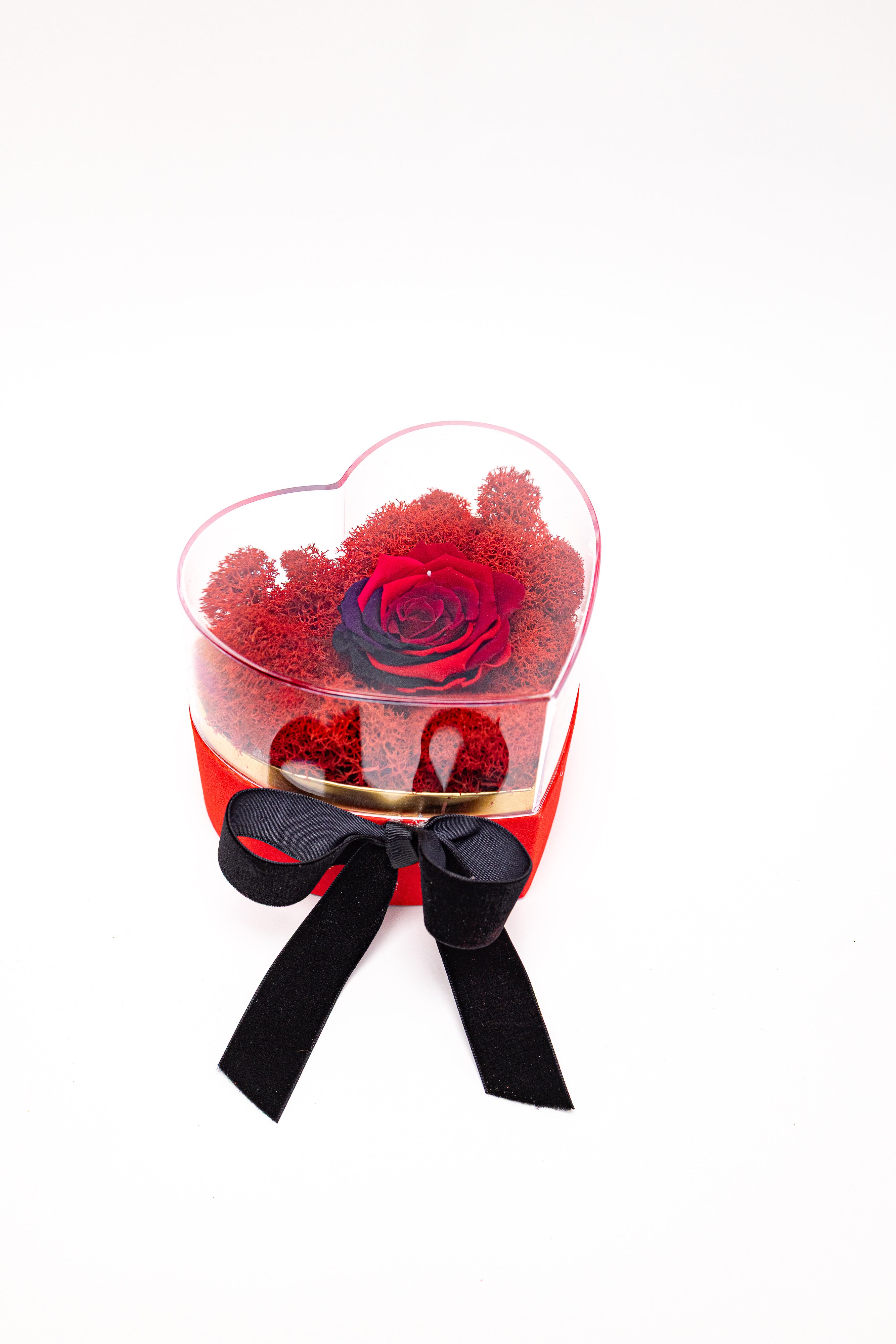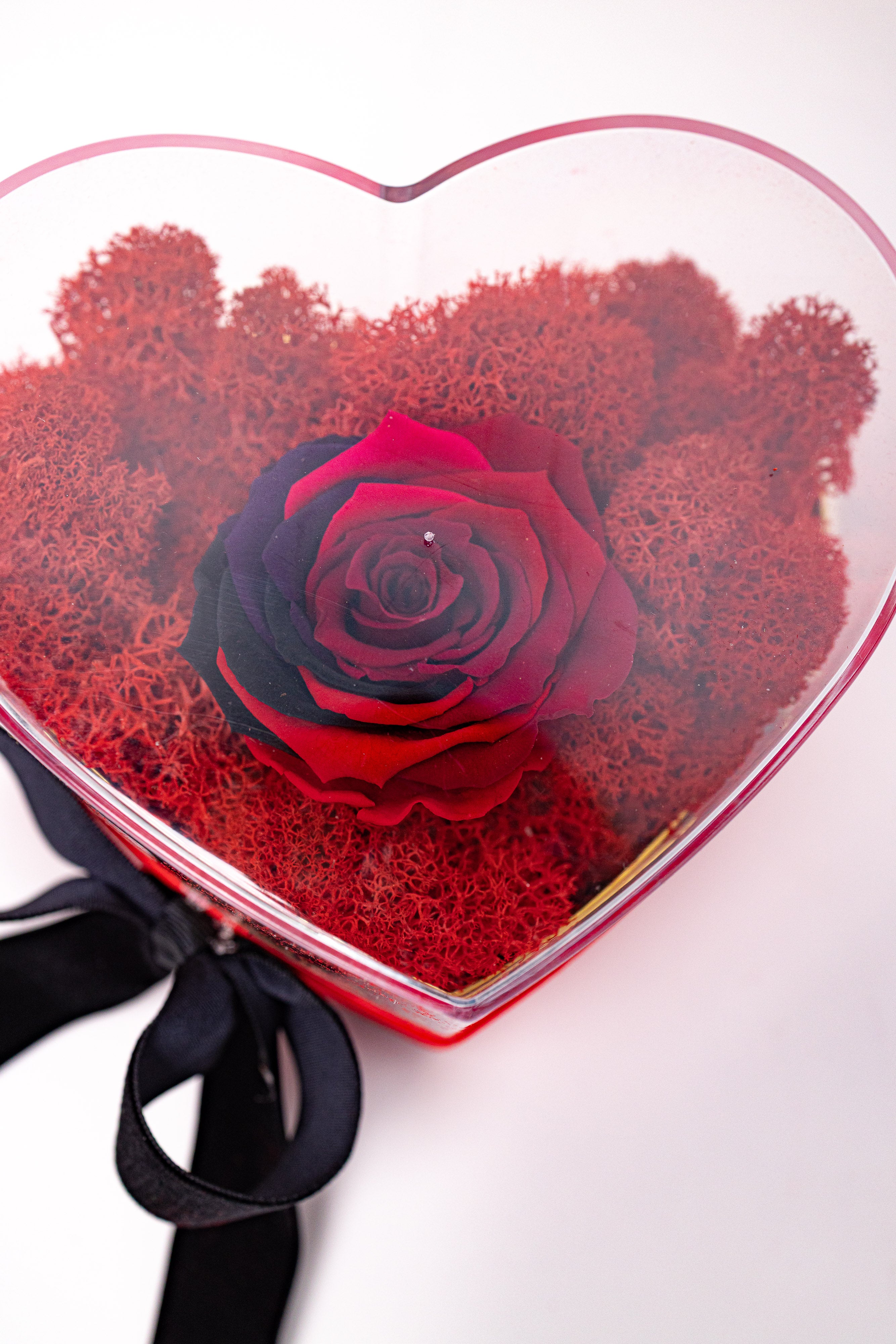 O operă de artă florală unică, lucrată manual petală cu petală pentru a crea un spectacol cromatic rainbow. Trandafirul criogenat este așezat pe un pat de licheni roșii, protejat de o inimă acrilică premium cu fundă de catifea. Simbolul suprem al rarității și al eleganței eterne.