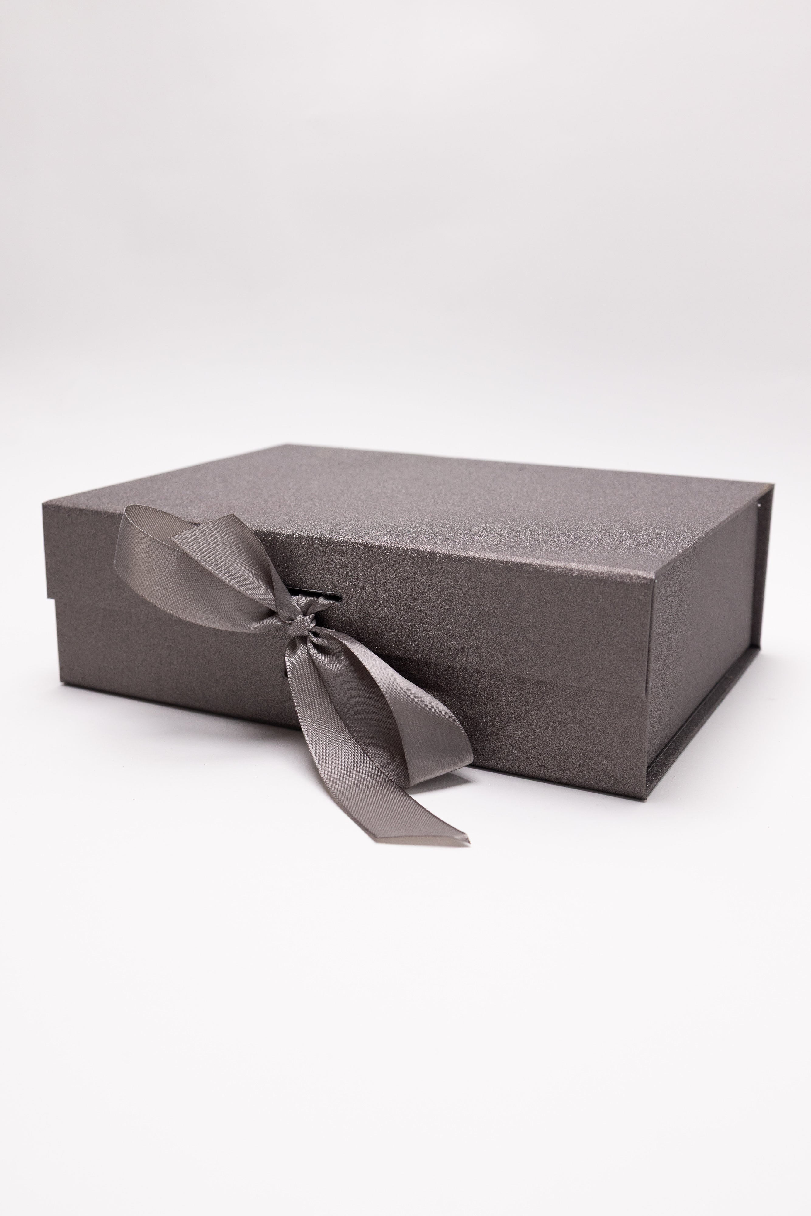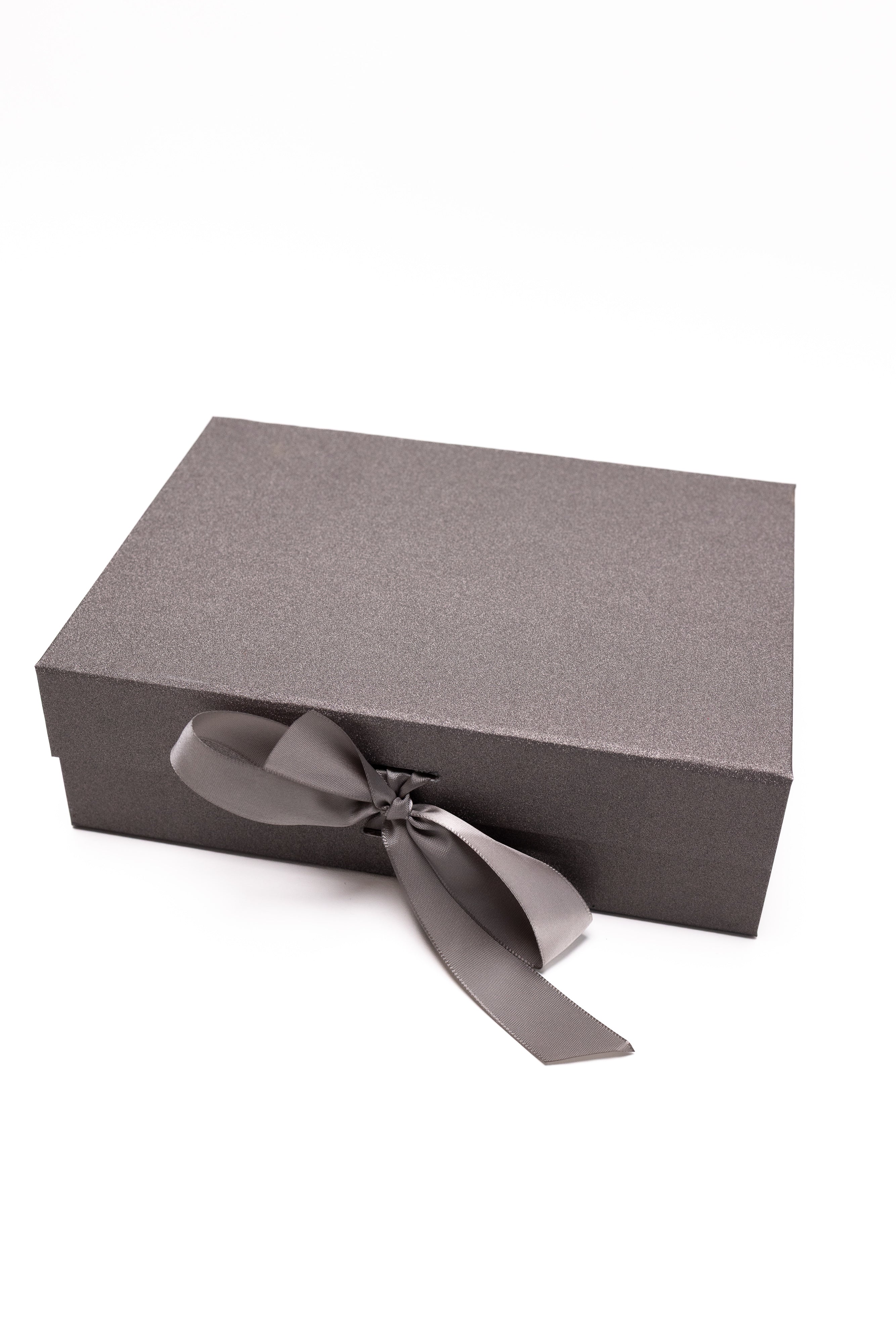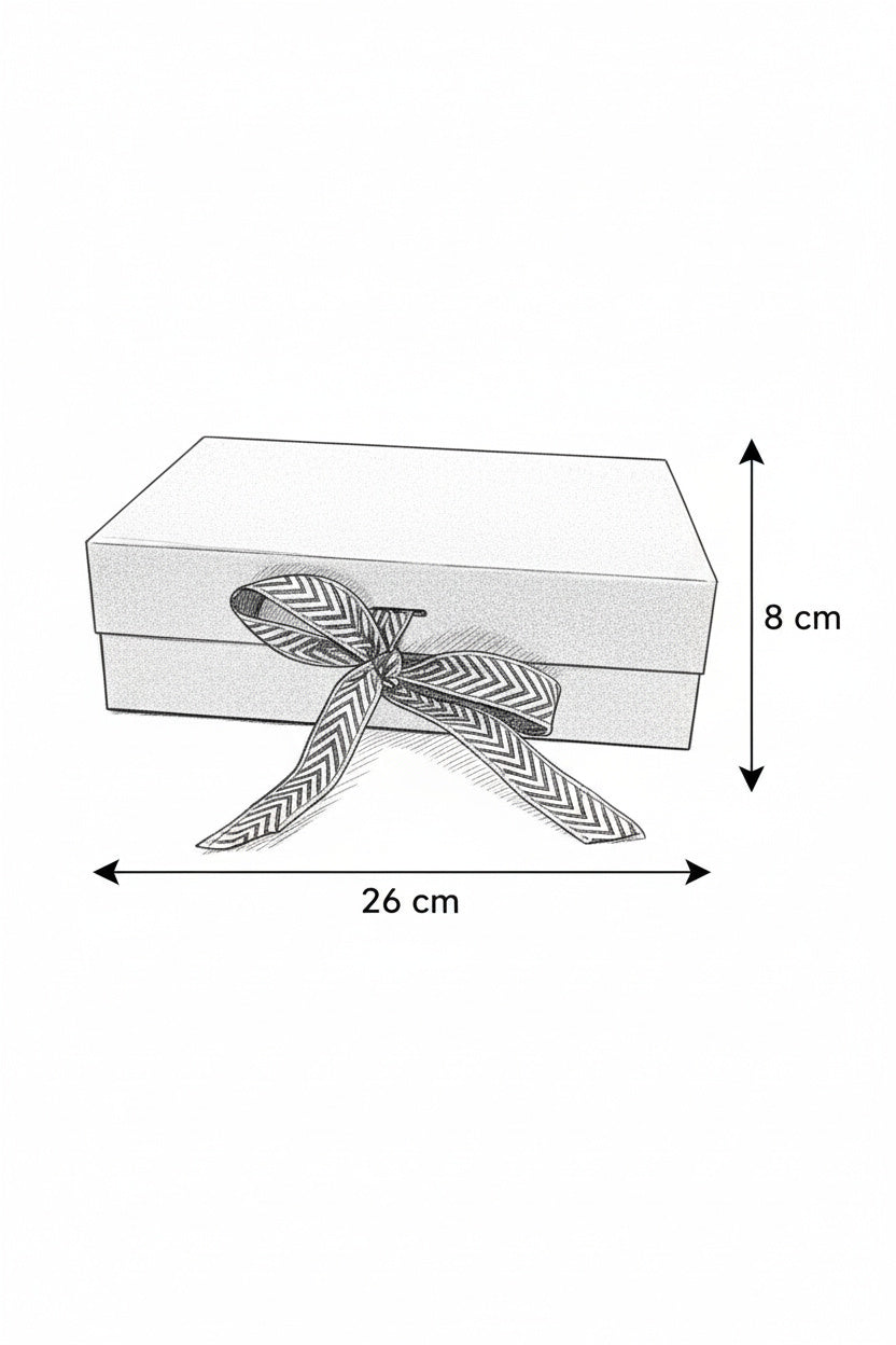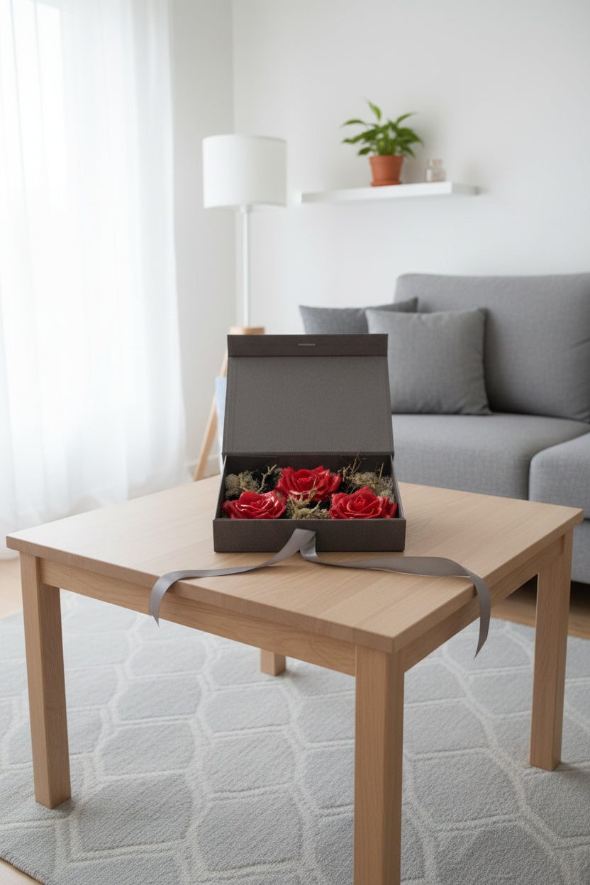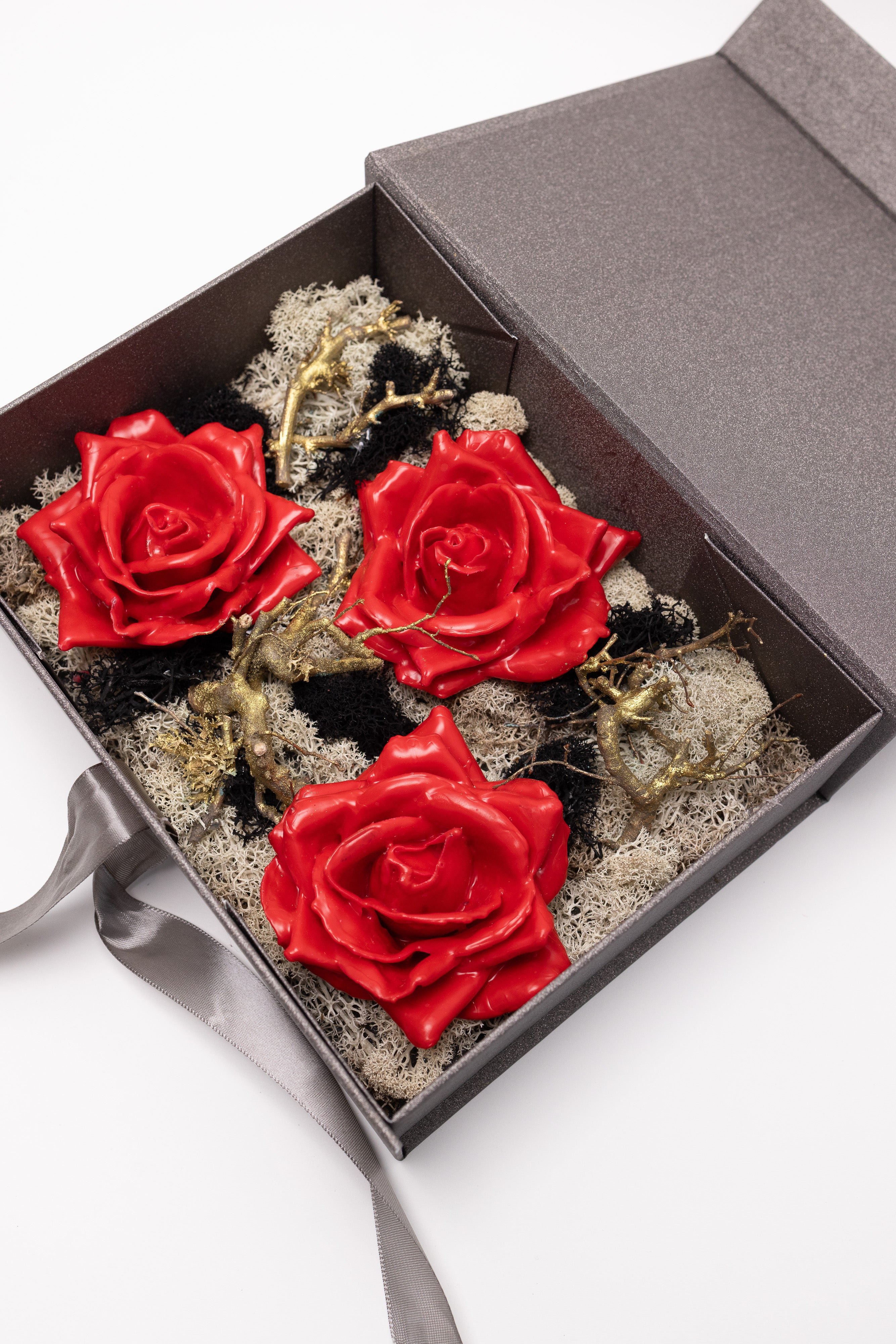 O expresie a rafinamentului într-o casetă gri sidefată. Conține 3 trandafiri de săpun modelați artizanal cu finisaj roșu metalic, așezați pe un pat de licheni naturali albi și negri. Decorat cu ramuri aurii și fundă de satin, acest ansamblu de lux este creat pentru a impresiona prin design exclusivist.