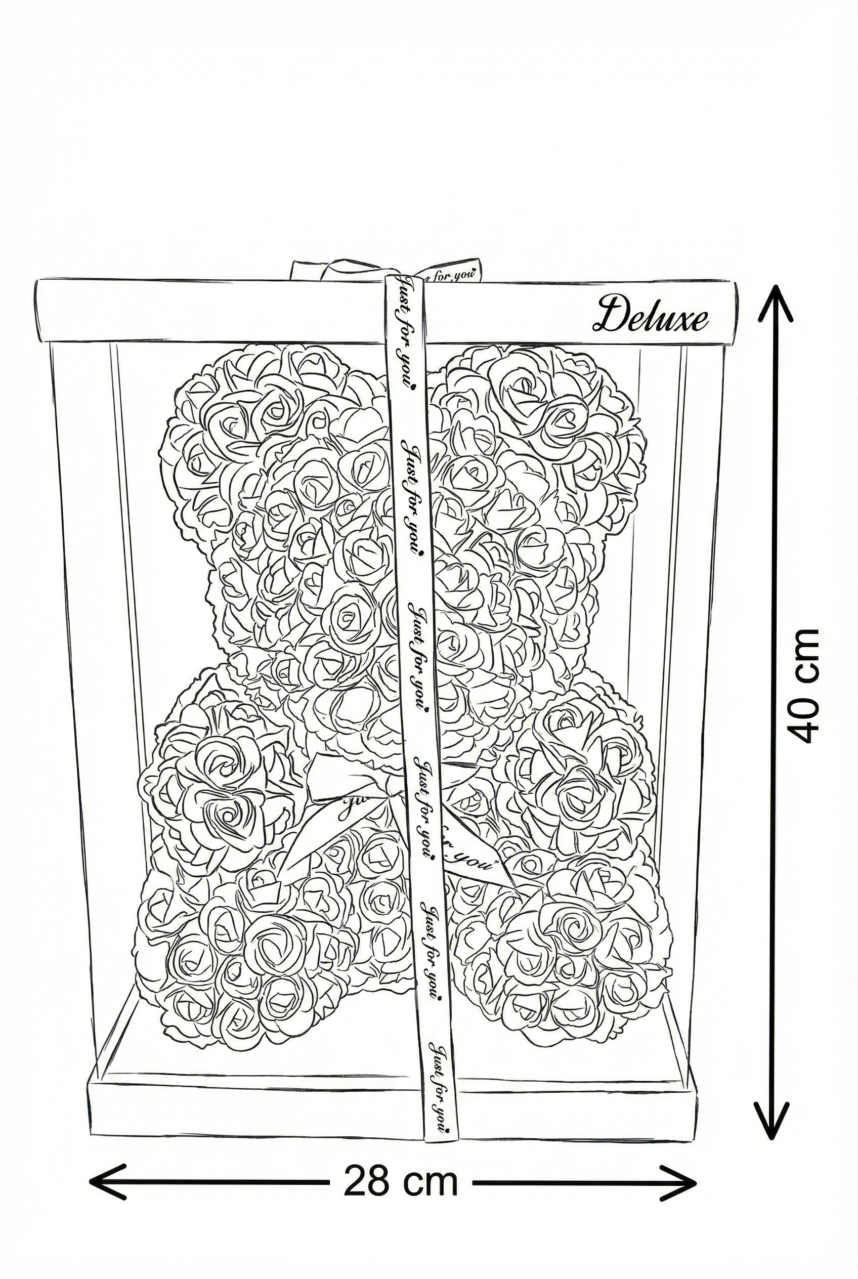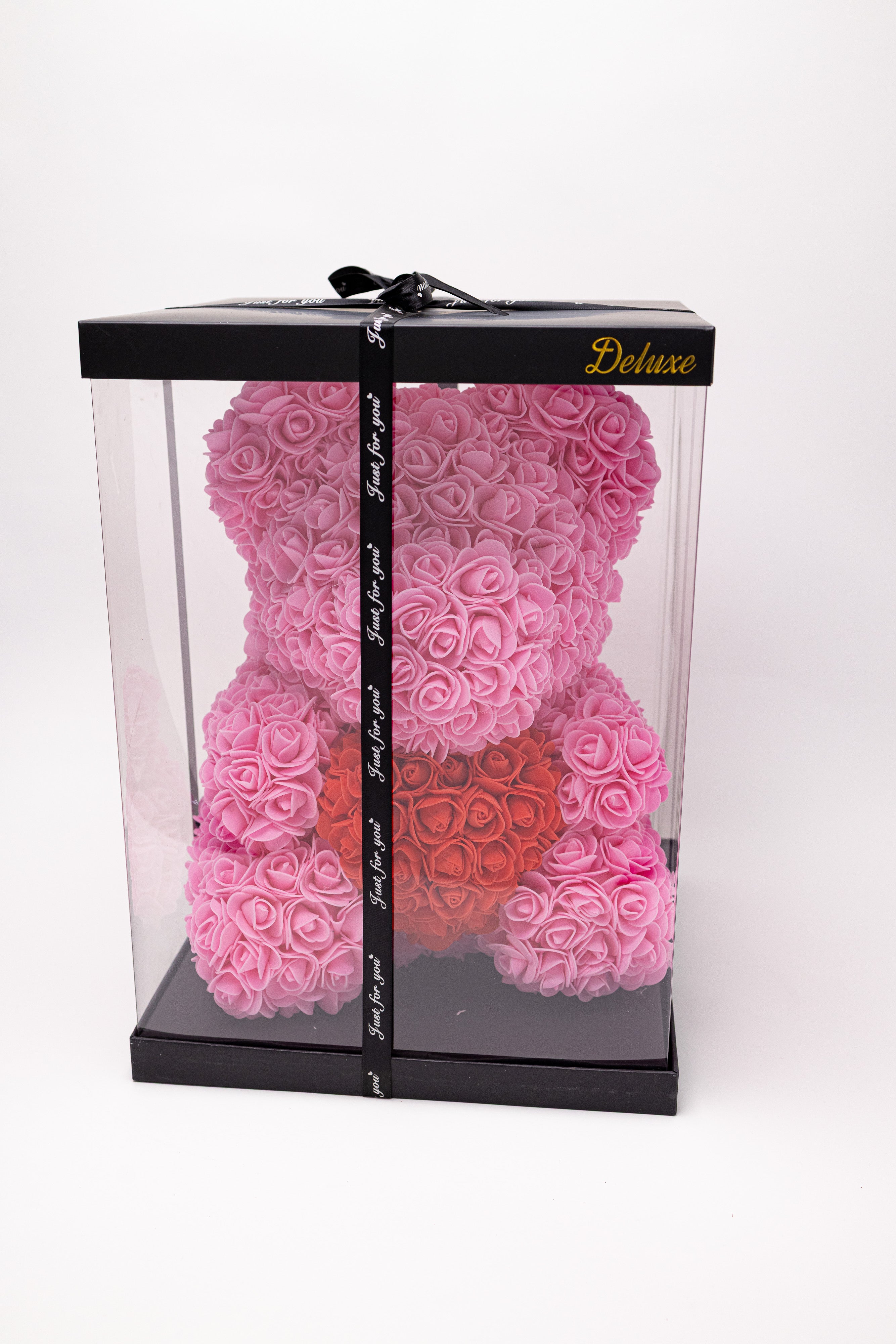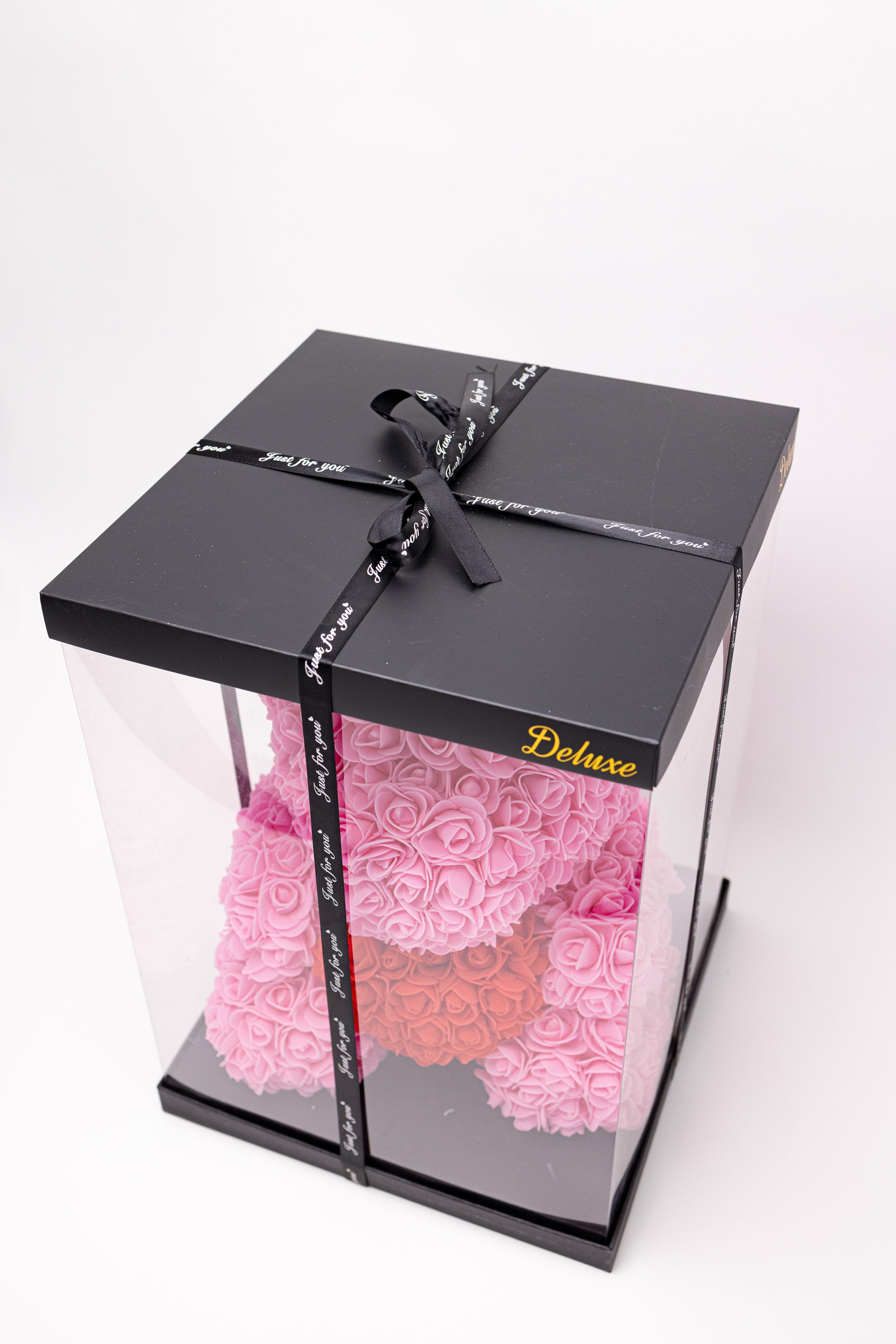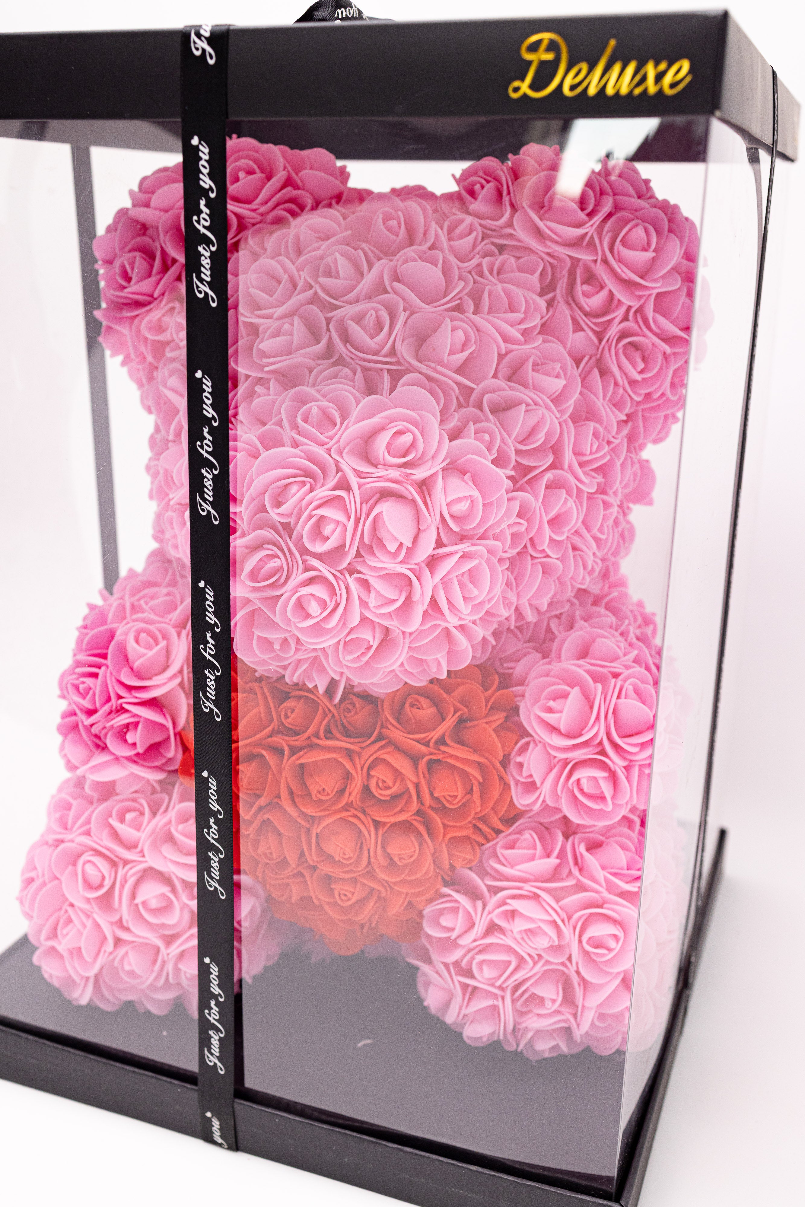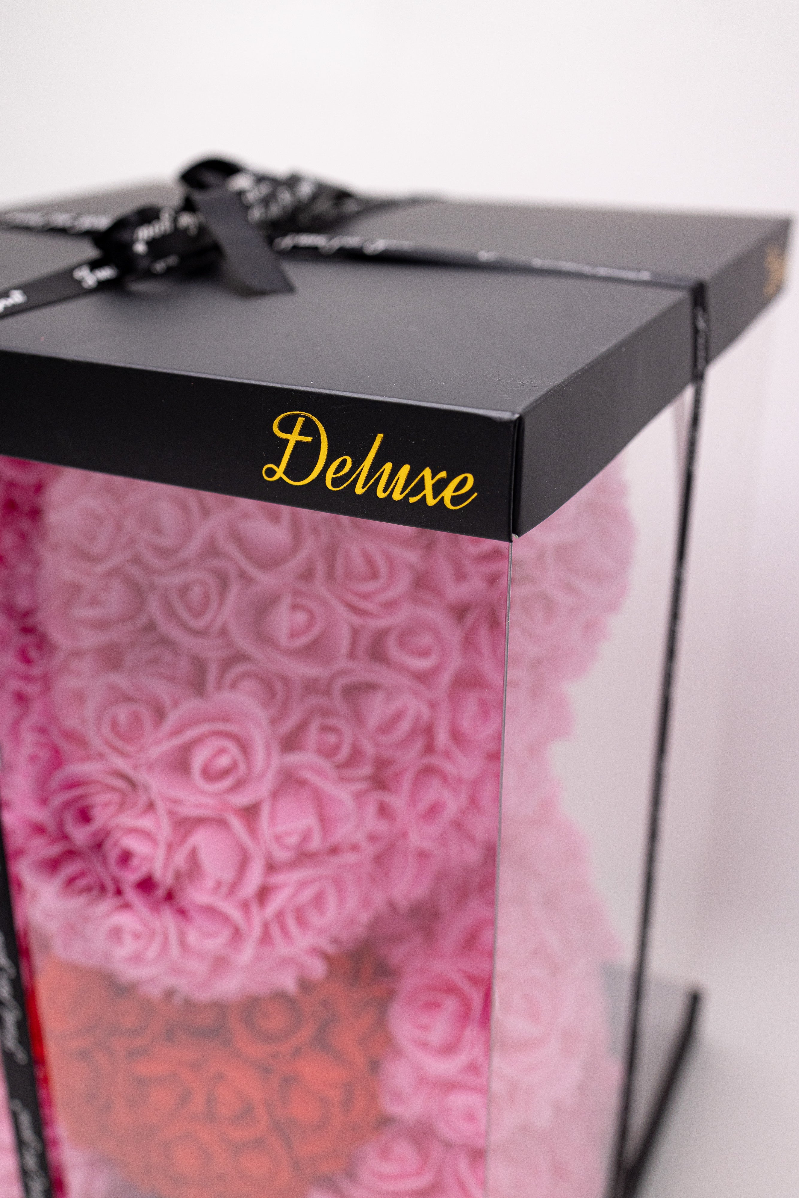 O sculptură florală adorabilă realizată manual din aprox. 300 trandafiri de săpun roz, purtând o inimă roșie pasională. Protejat într-o vitrină transparentă premium cu ramă neagră și sigiliu auriu "Deluxe", acest ursuleț este finisat cu panglică satinată, fiind simbolul suprem al luxului și tandreței.