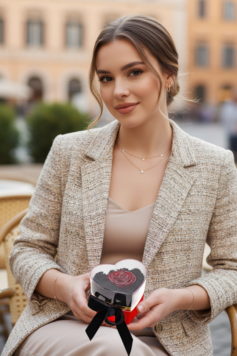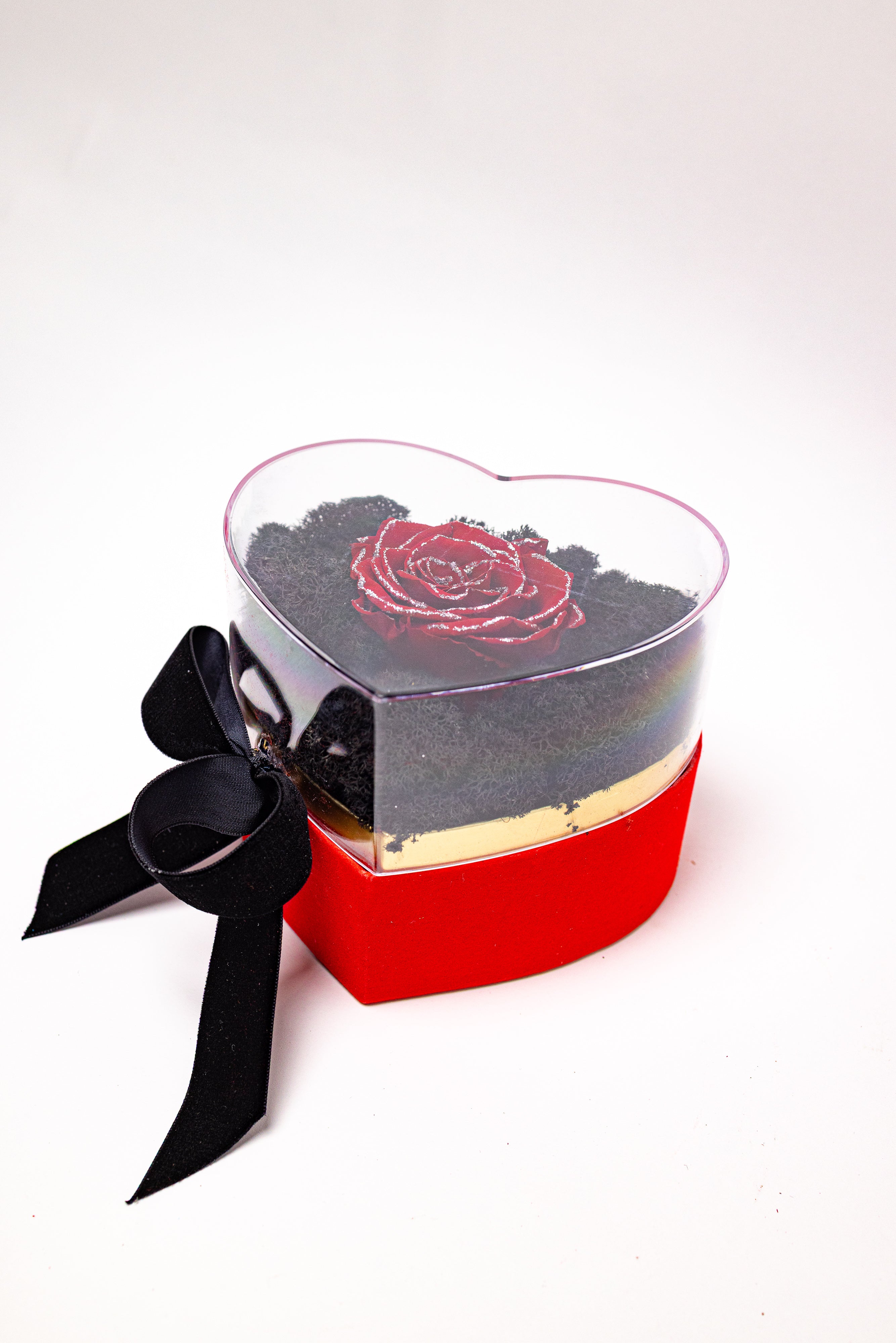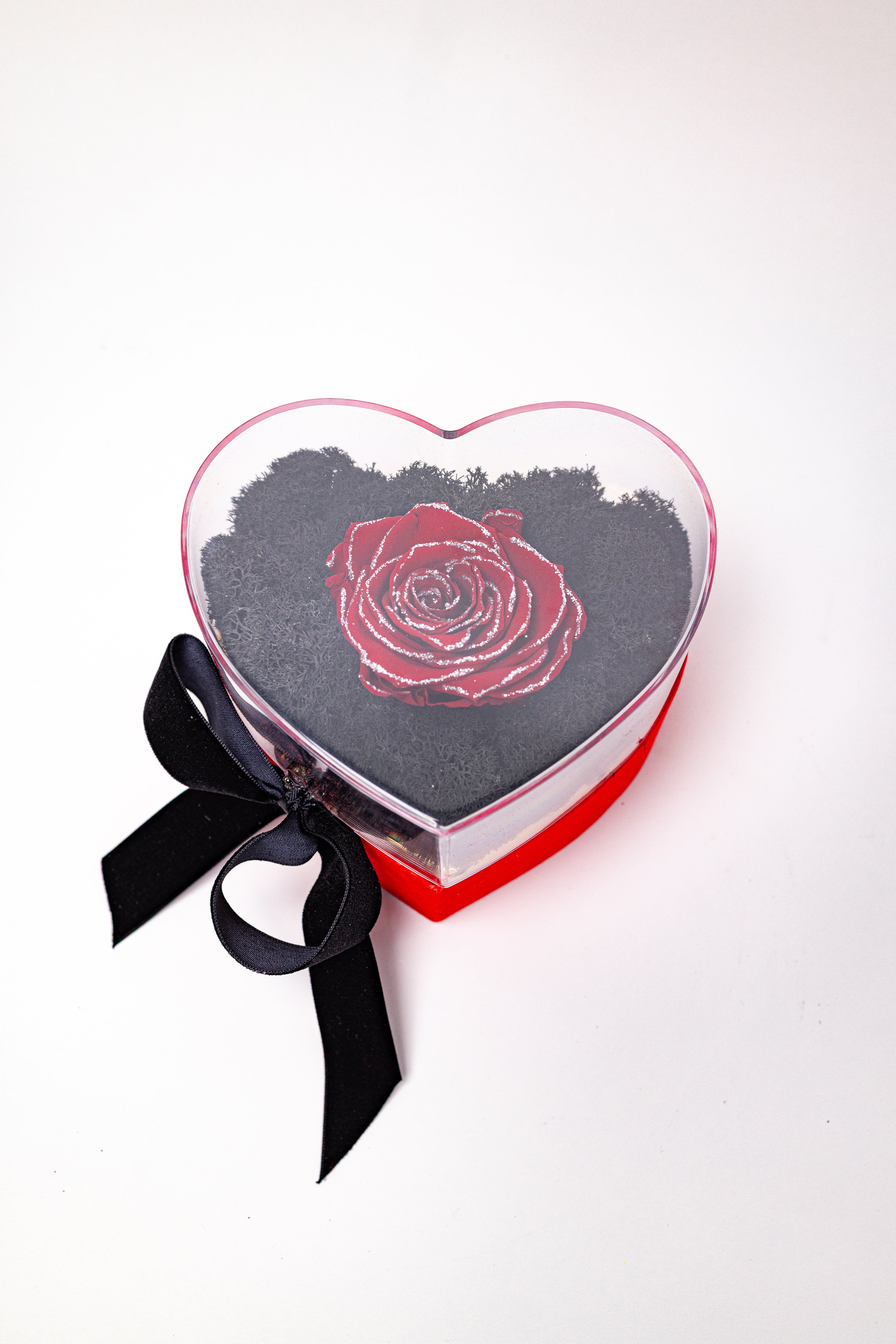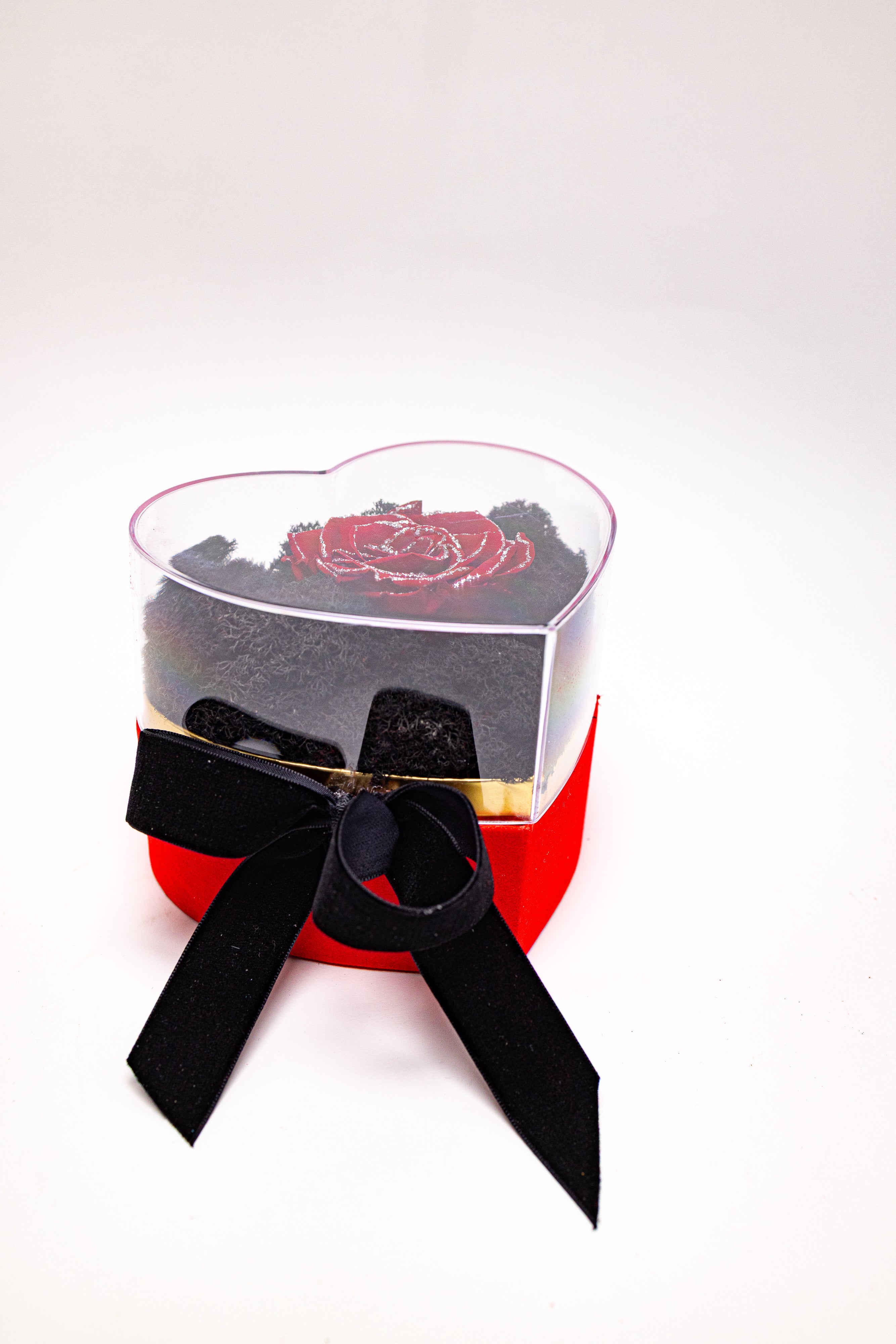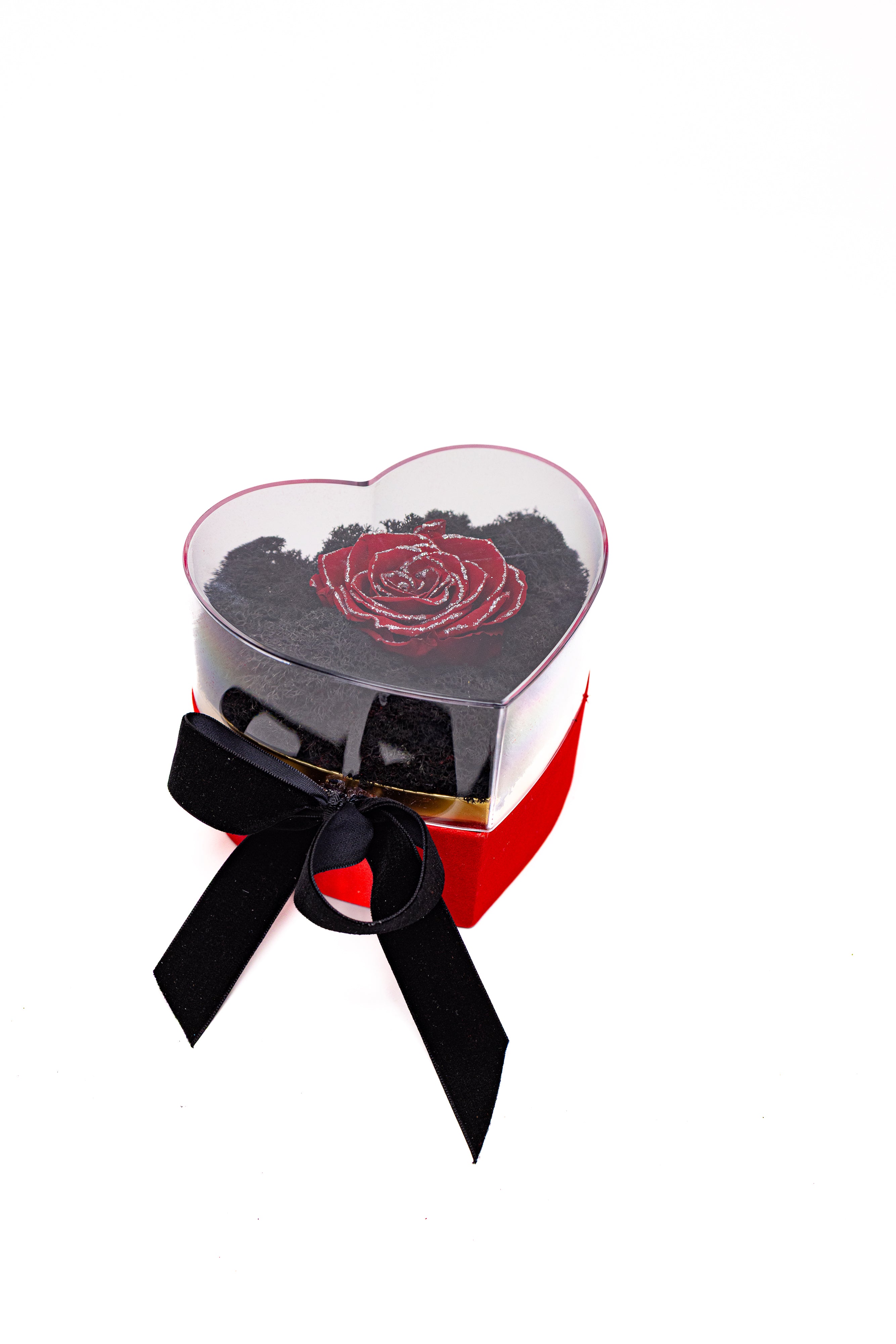 O bijuterie florală eternă prezentată într-o cutie de catifea roșie în formă de inimă, cu capac de sticlă. Conține un trandafir criogenat roșu premium cu glitter argintiu cu Swarovski, așezat pe un pat de licheni negri stabilizați. Finisat cu o fundă neagră din catifea, este simbolul luxului și al dragostei nemuritoare.