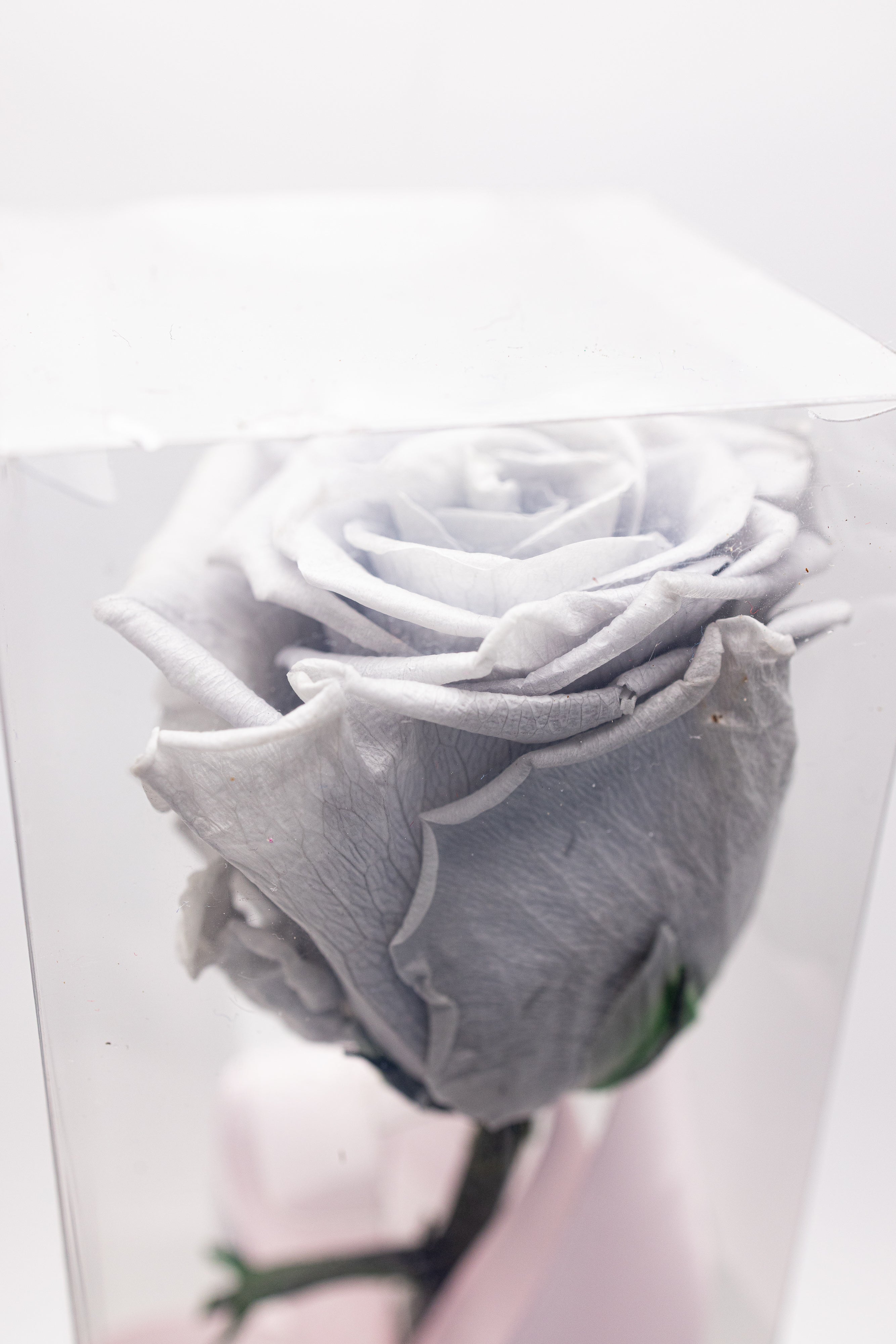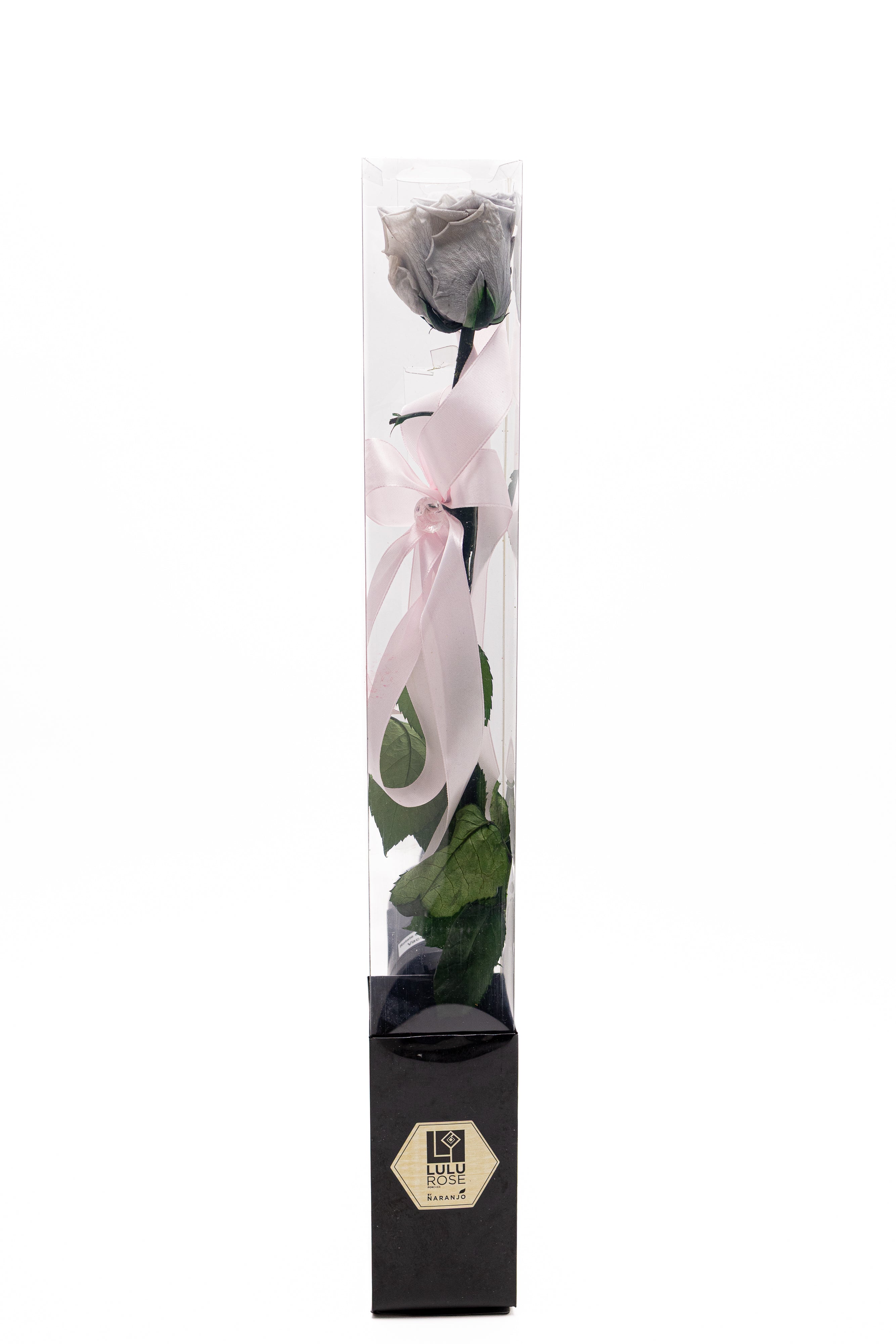 O piesă rară de design floral ce prezintă un trandafir criogenat gri argintiu pe tulpină naturală cu frunze verzi. Securizat într-o cutie verticală transparentă cu bază neagră și sigiliu auriu, acest simbol al rafinamentului este finisat cu o fundă roz pal din satin și un cristal discret.