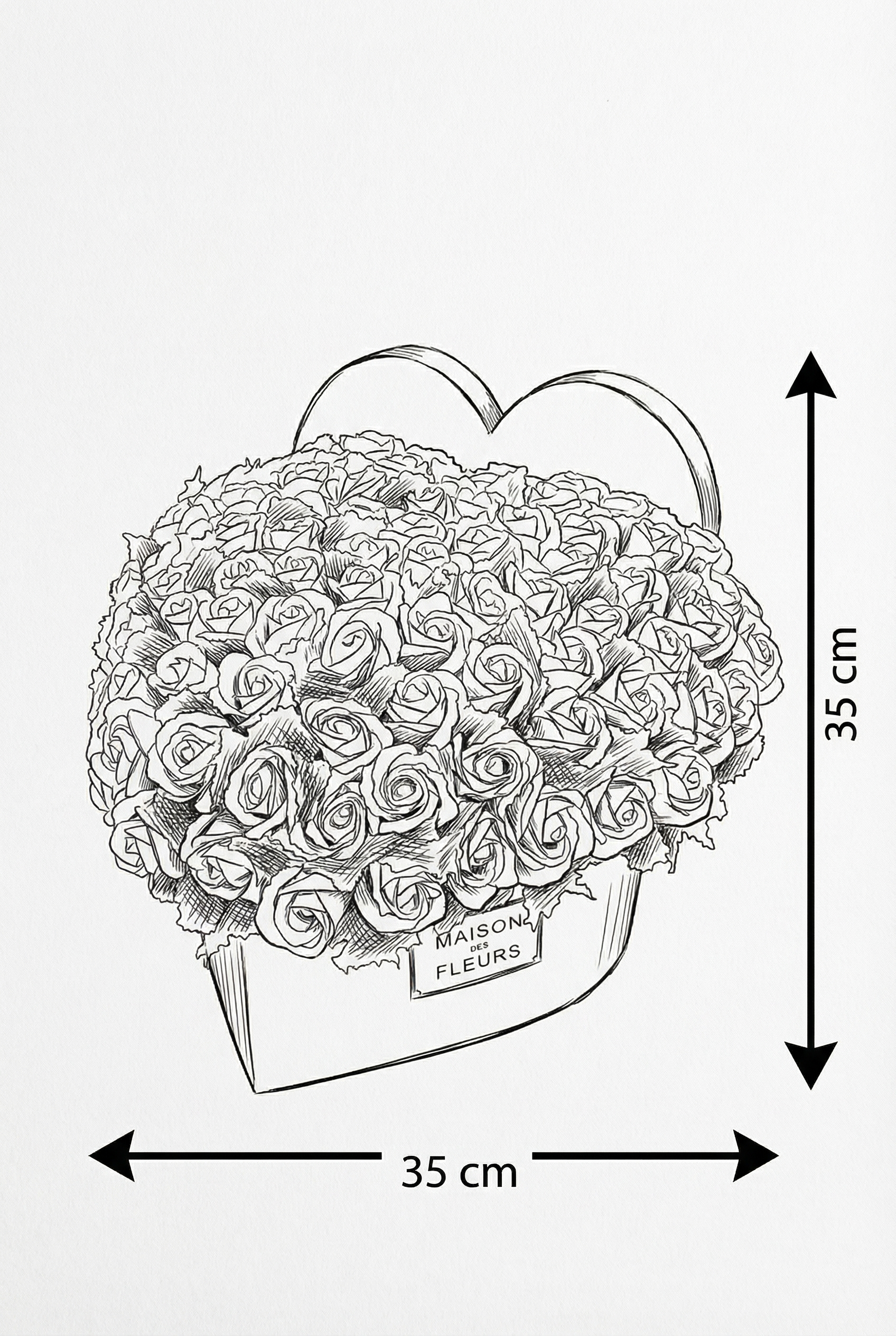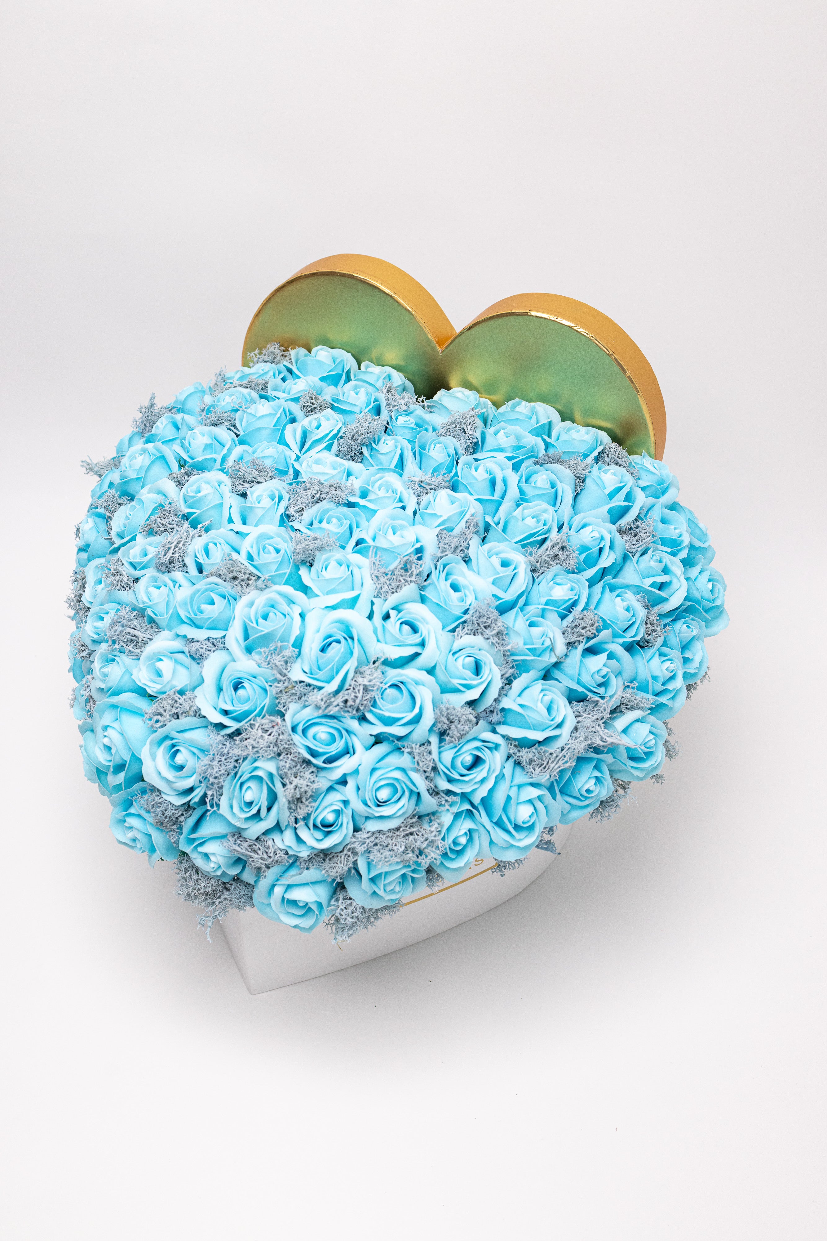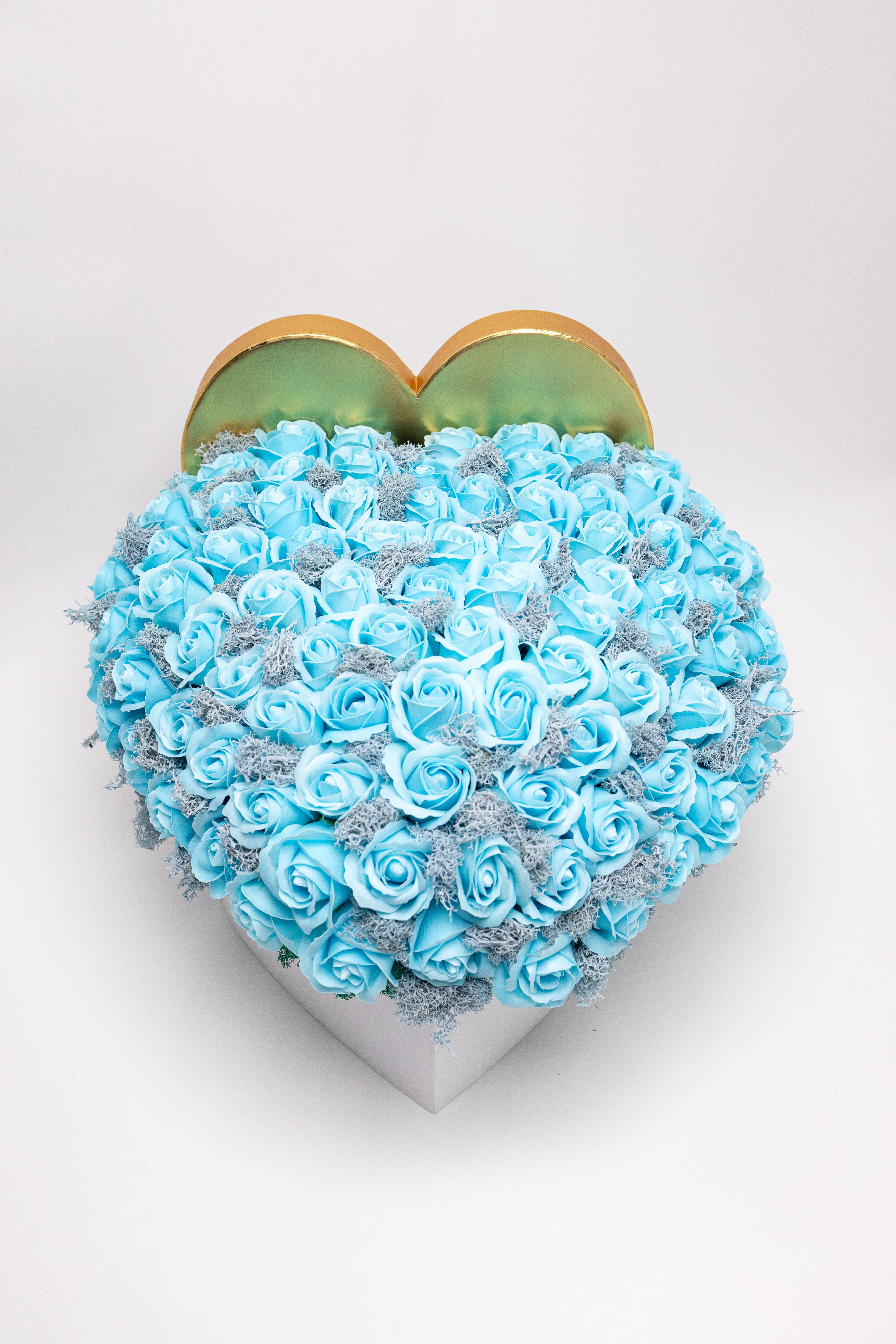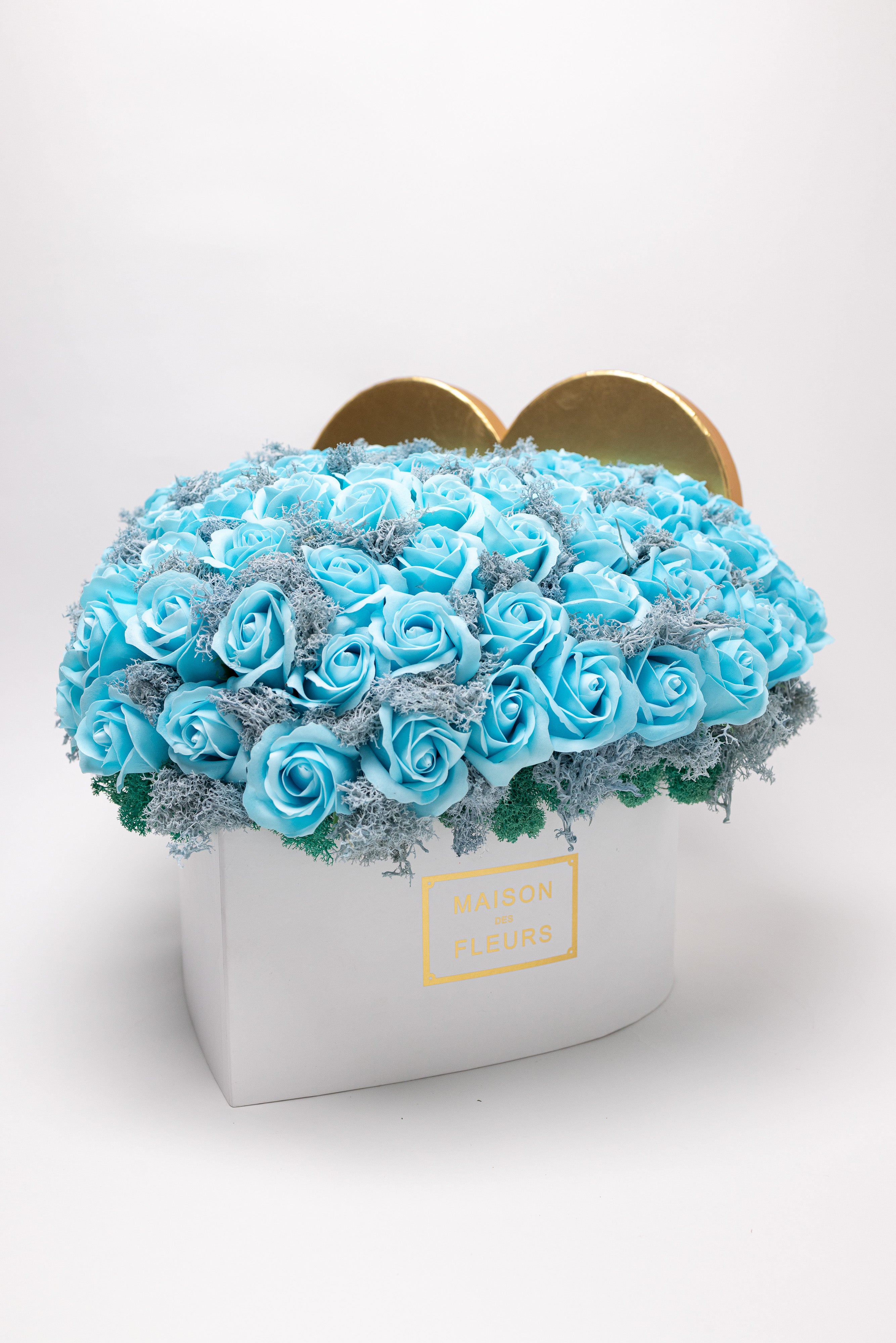 Un design spectaculos în cutie argintie sub formă de inimă, decorată cu două inimi aurii emblematice. Conține aprox. 70 trandafiri de săpun bleu ciel, flancați de muschi natural și licheni gri. O piesă de lux lucrată manual, ideală pentru a impresiona prin eleganță și rafinament absolut.