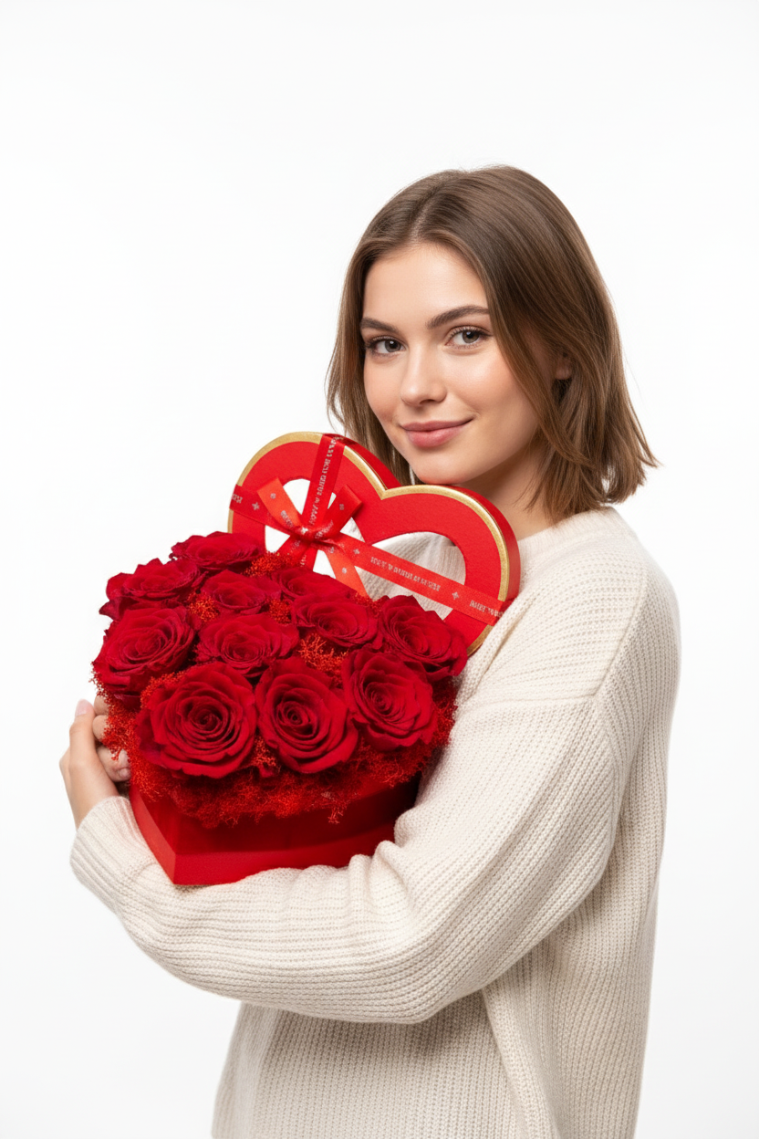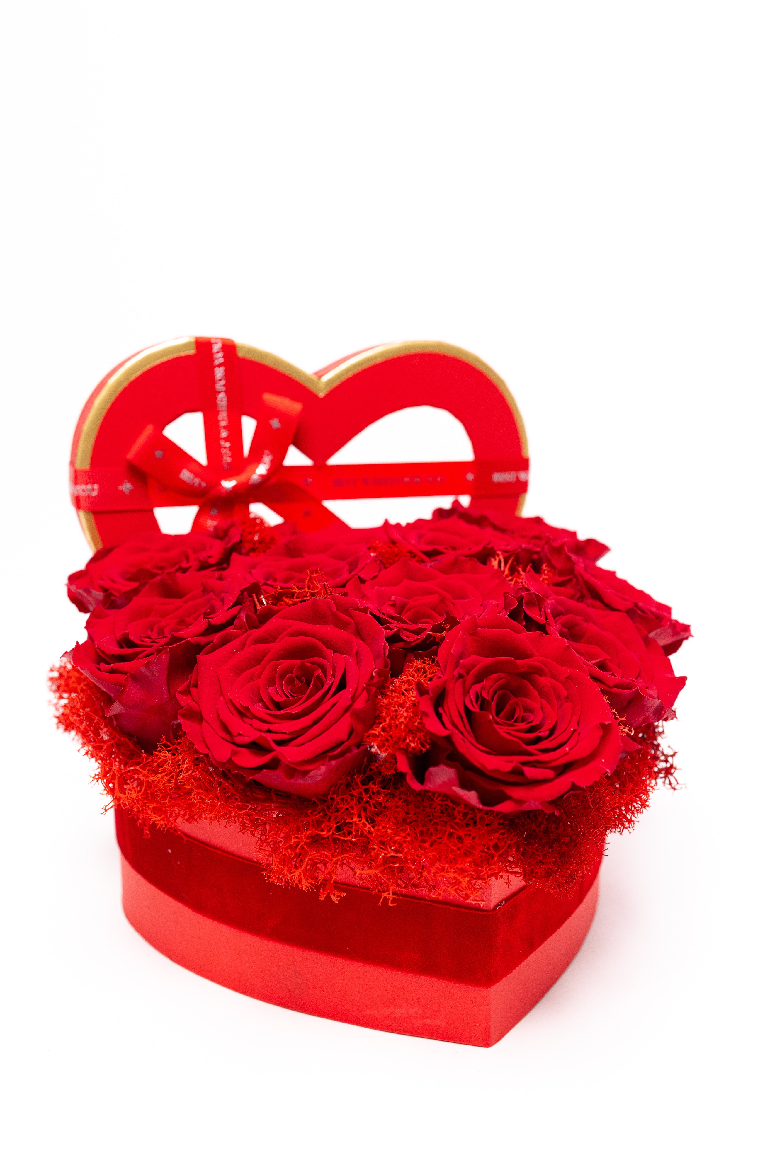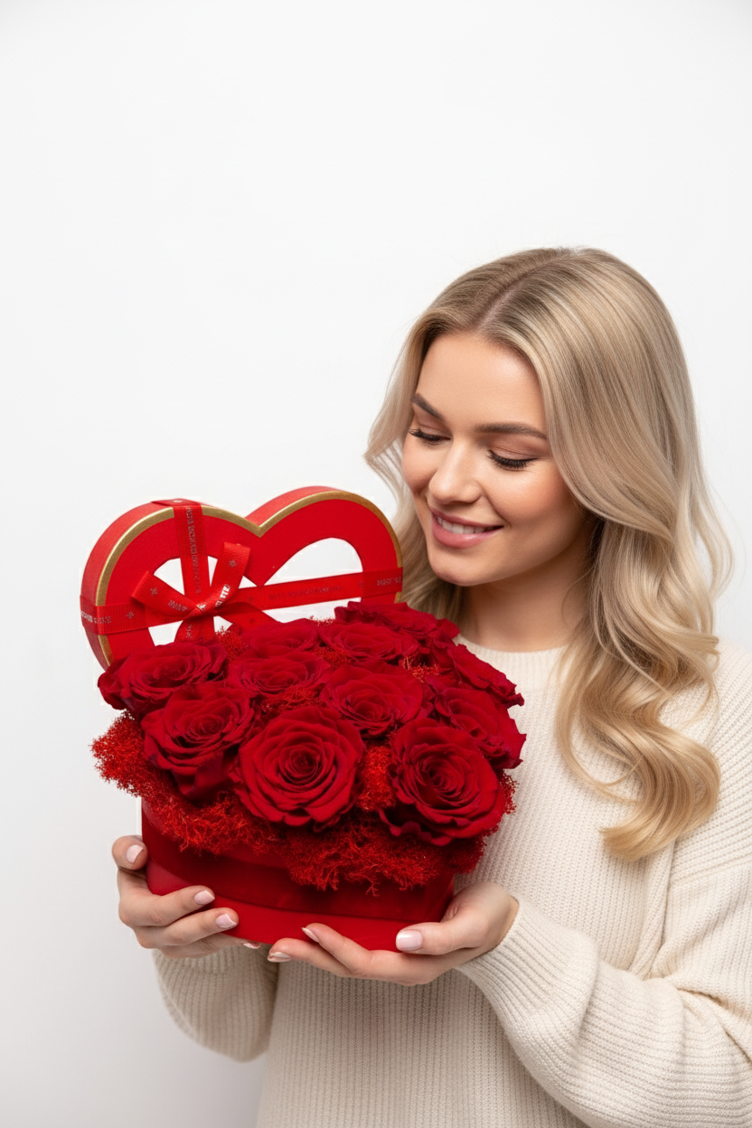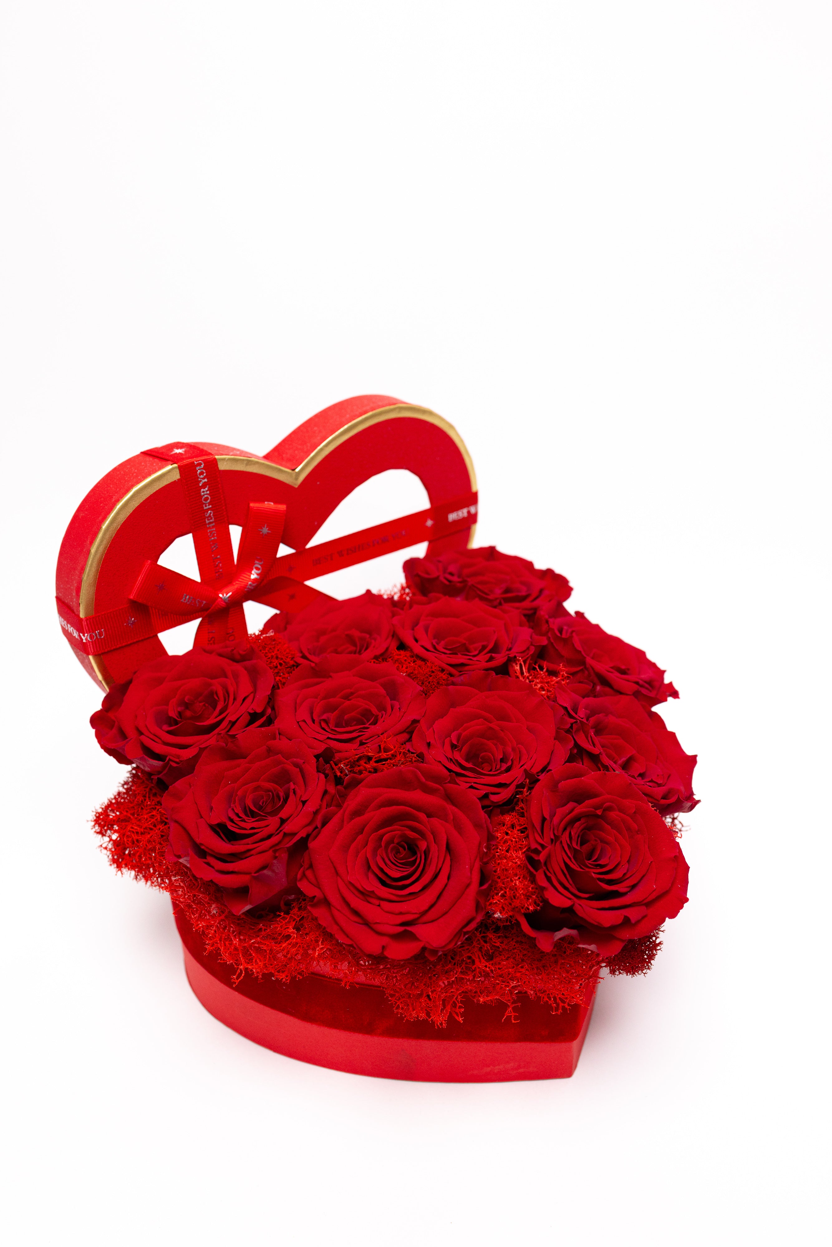 Cutie inimă din catifea fină cu 11 trandafiri criogenați roșii, așezați pe un pat de mușchi. Simbolul pasiunii ce rezistă ani la rând. Textură premium, culoare intensă și eleganță desăvârșită.