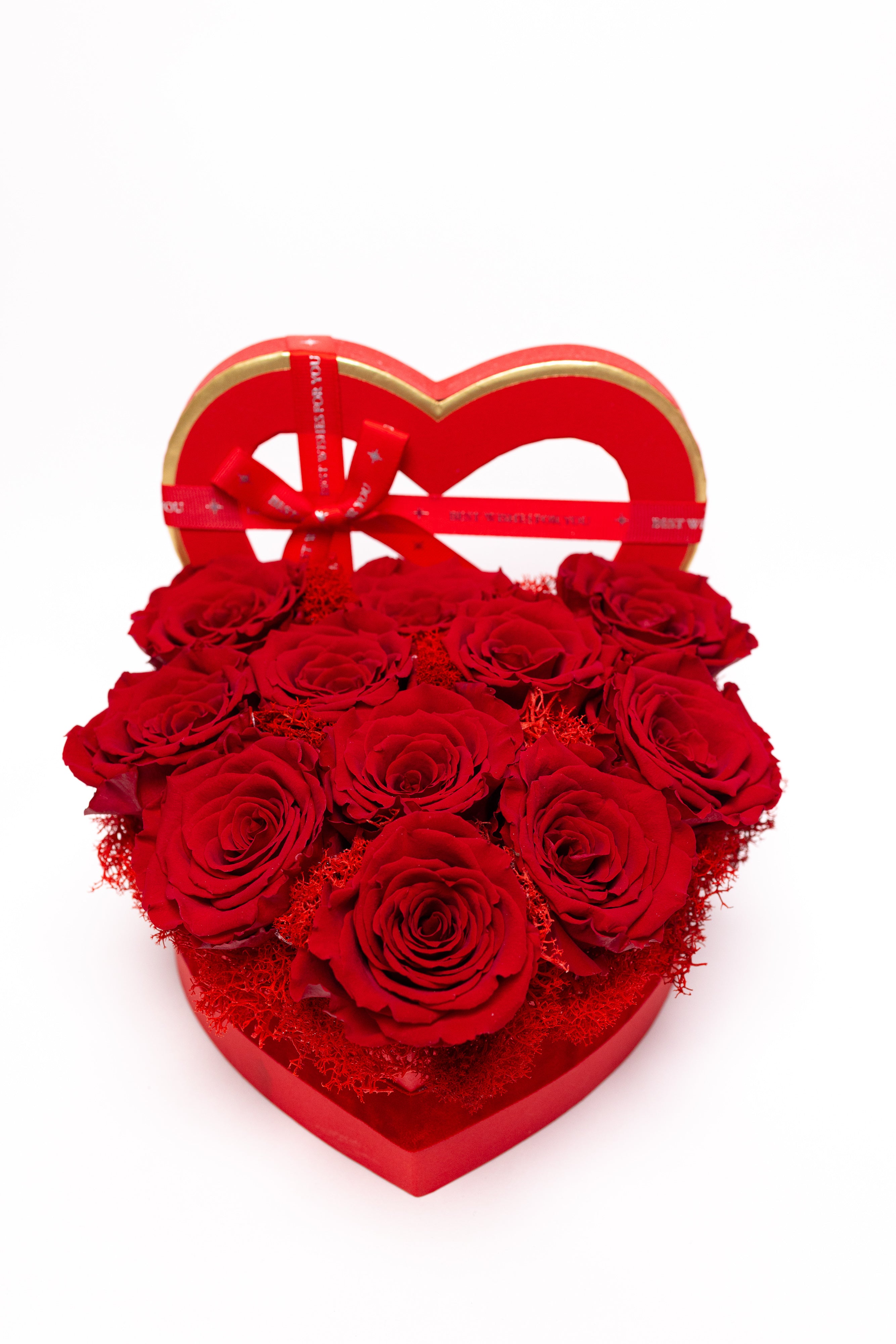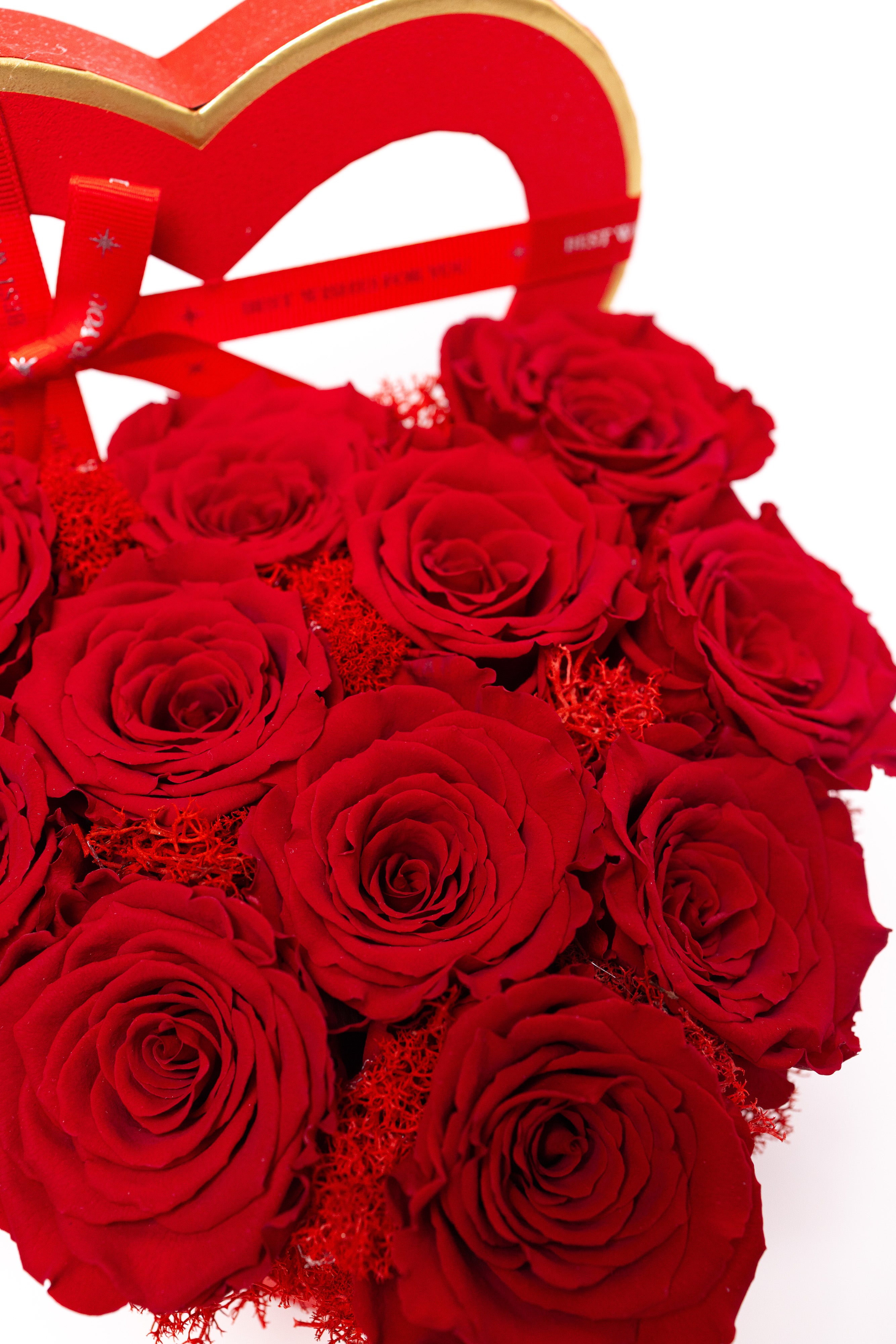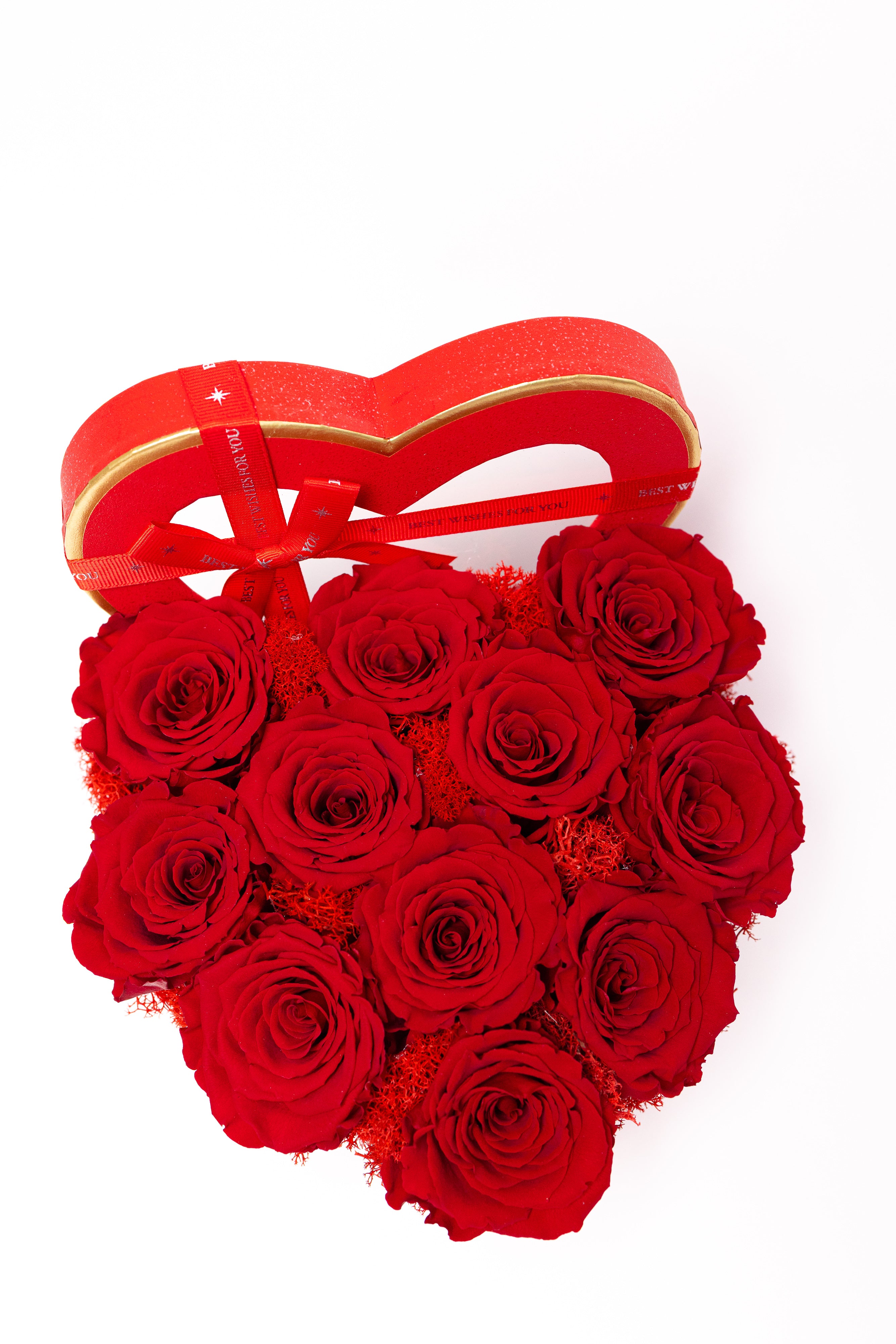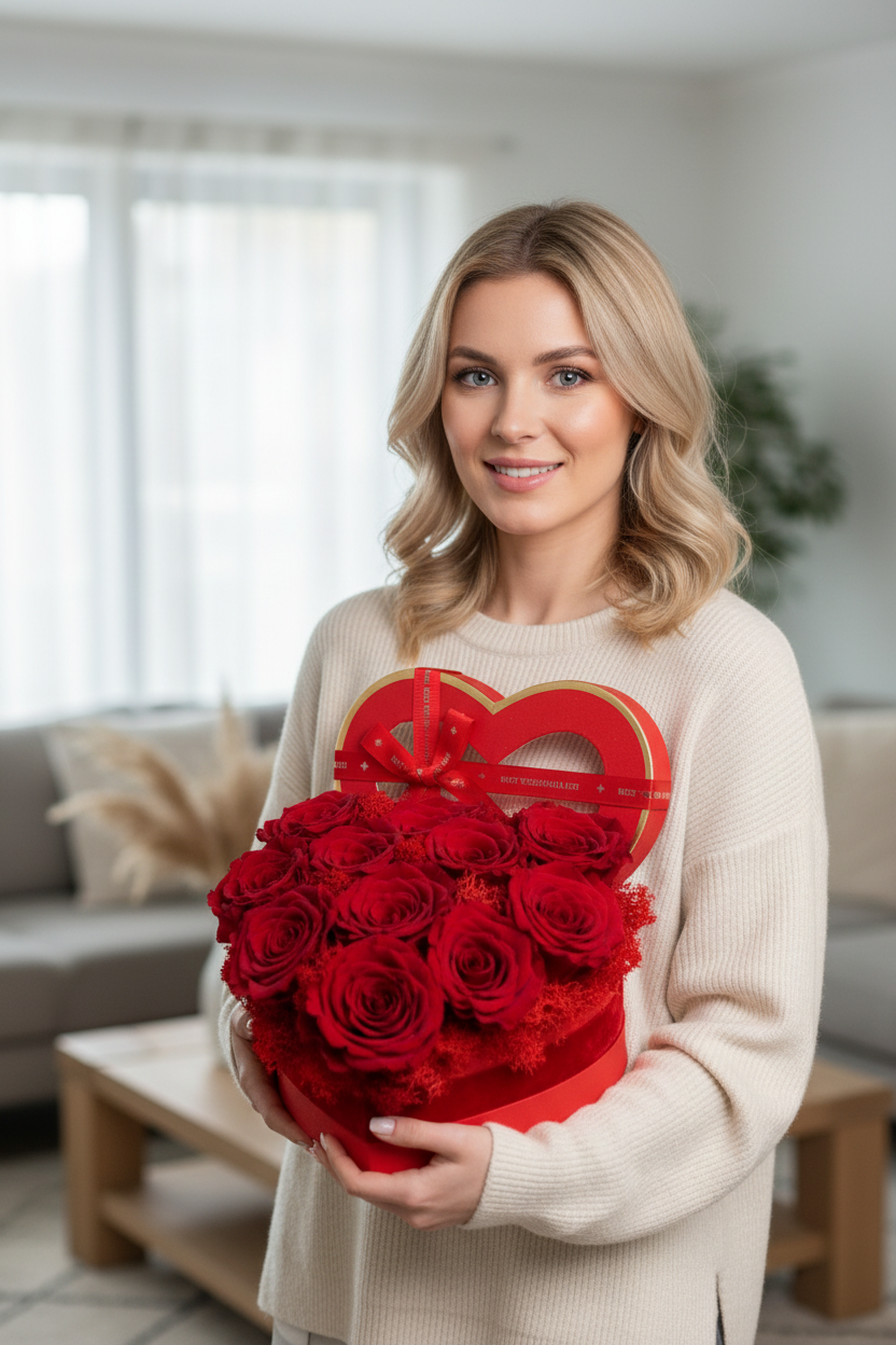 Cutie inimă din catifea fină cu 11 trandafiri criogenați roșii, așezați pe un pat de mușchi. Simbolul pasiunii ce rezistă ani la rând. Textură premium, culoare intensă și eleganță desăvârșită.