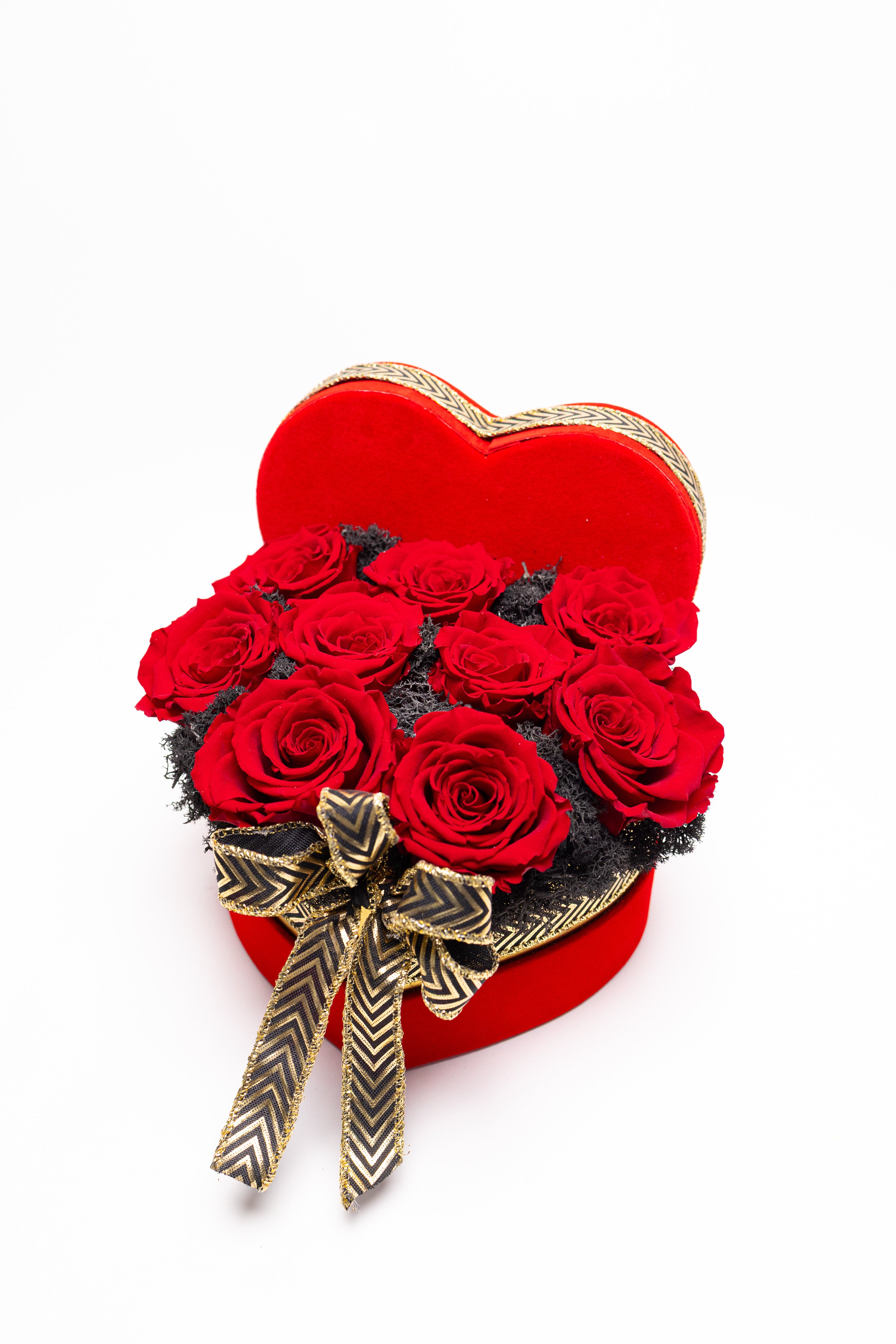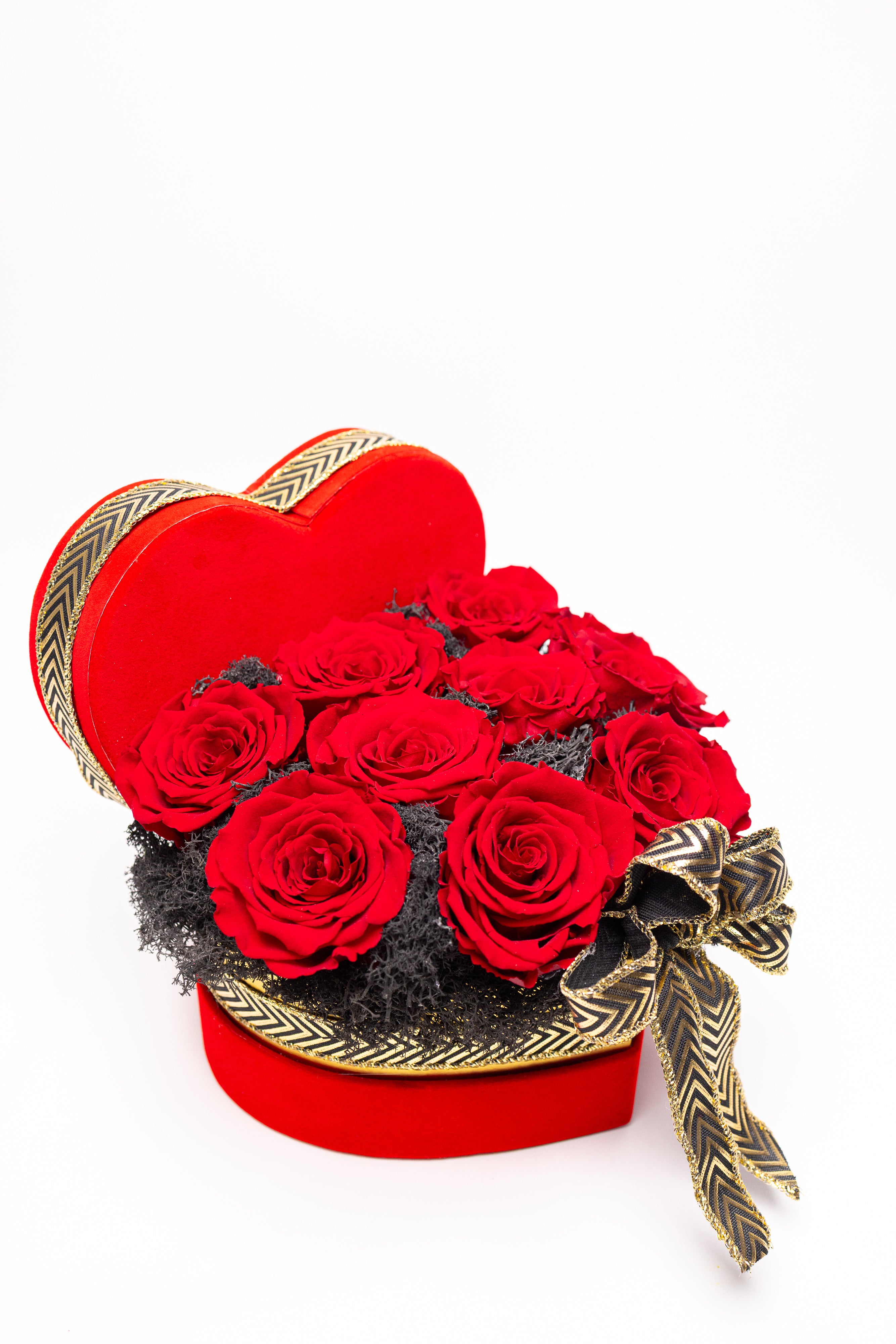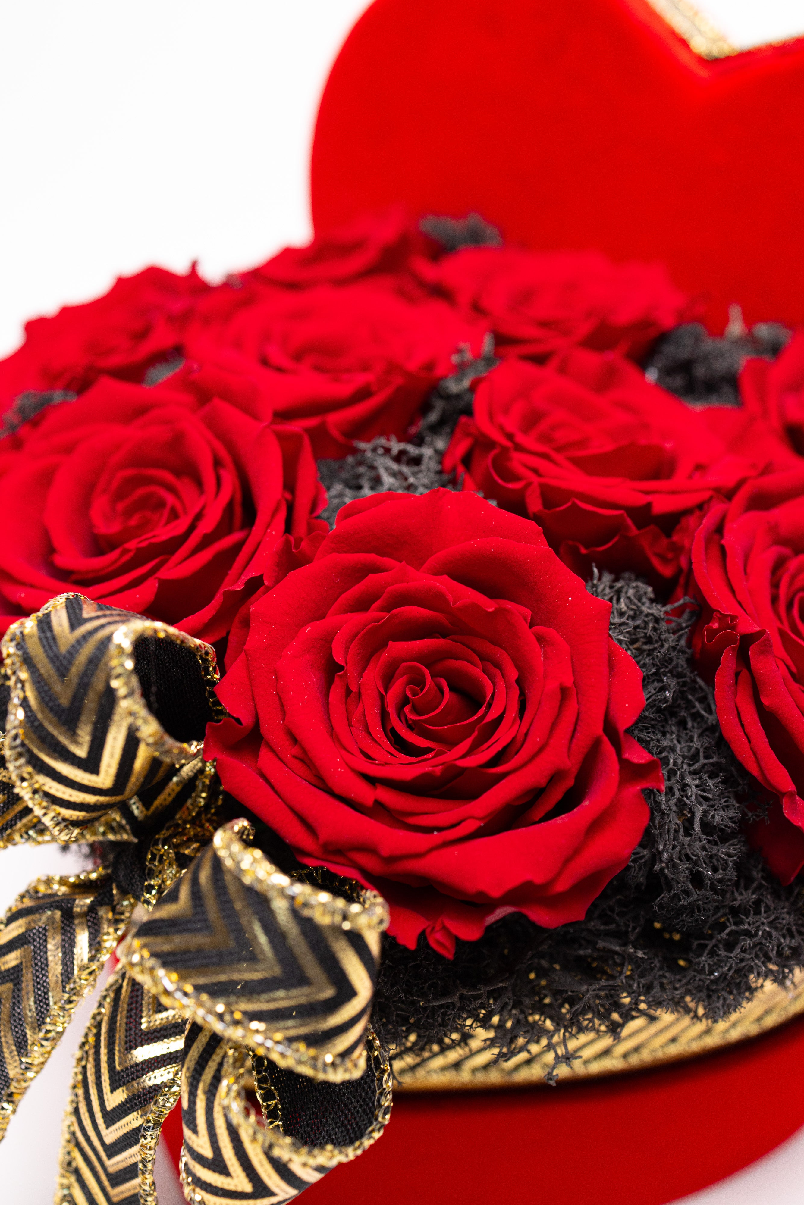 Cutie inimă din catifea roșie cu 9 trandafiri criogenați roșii, pe pat de mușchi natural negru. Decorată cu o fundă elegantă neagră cu auriu. Un simbol etern al iubirii pasionale.