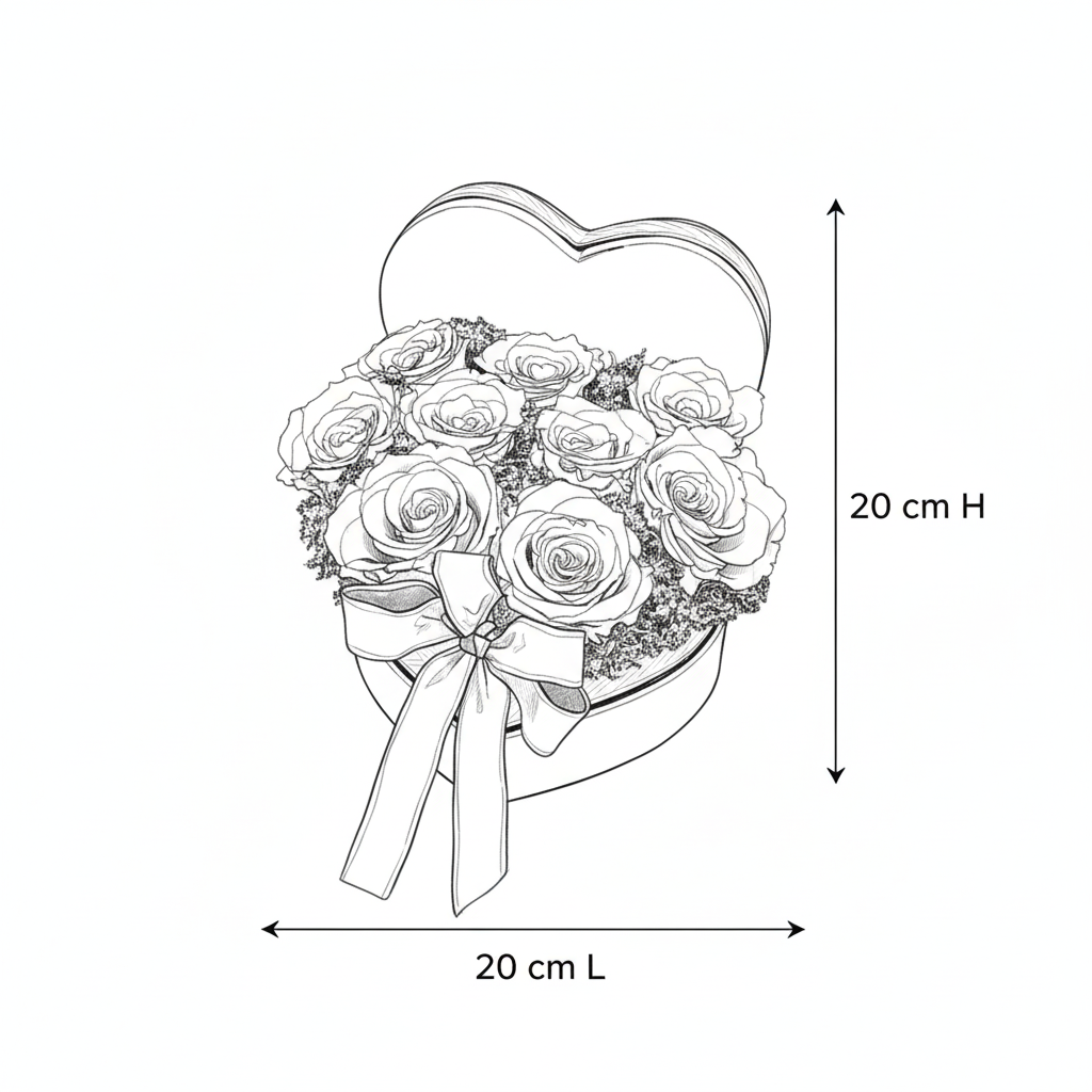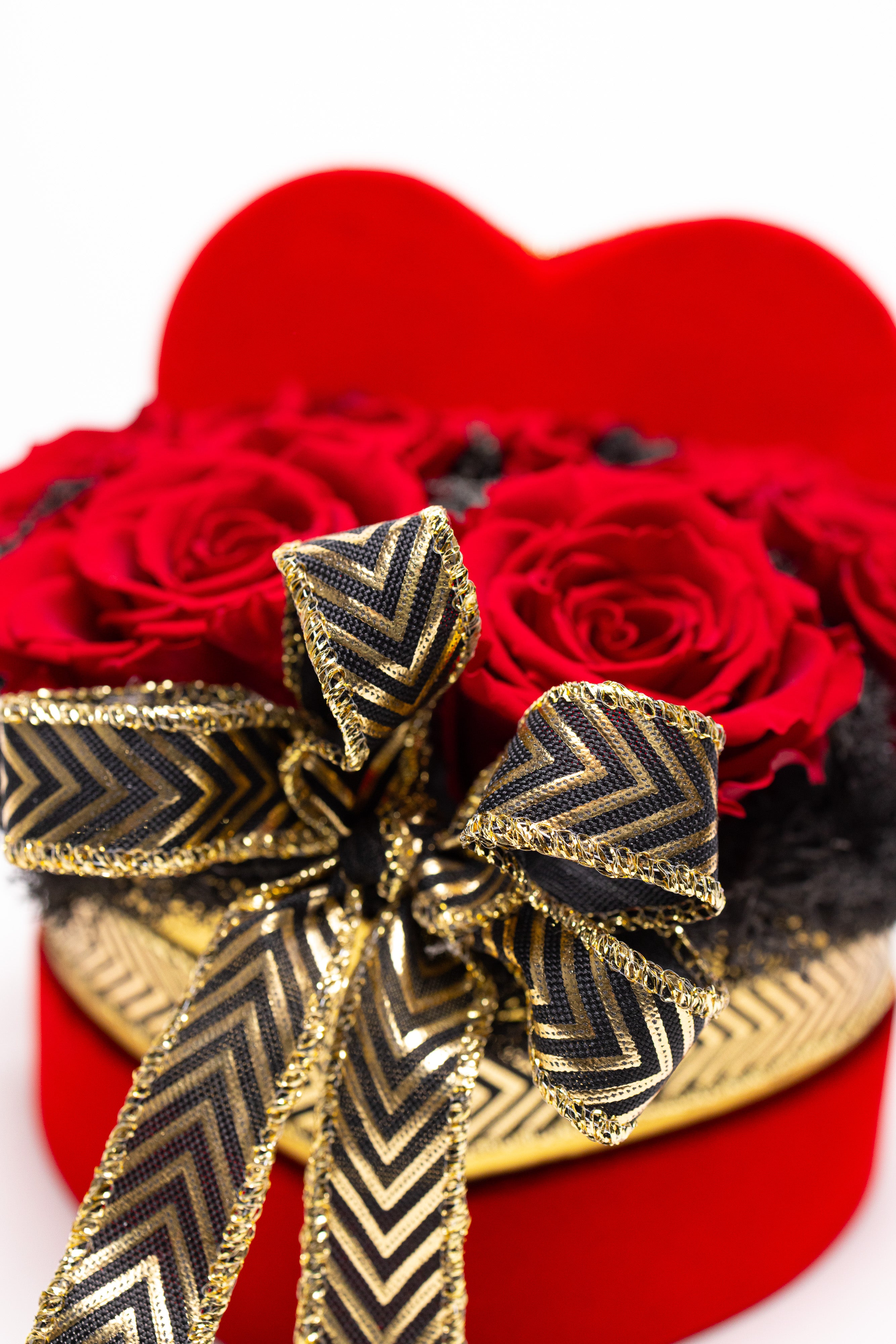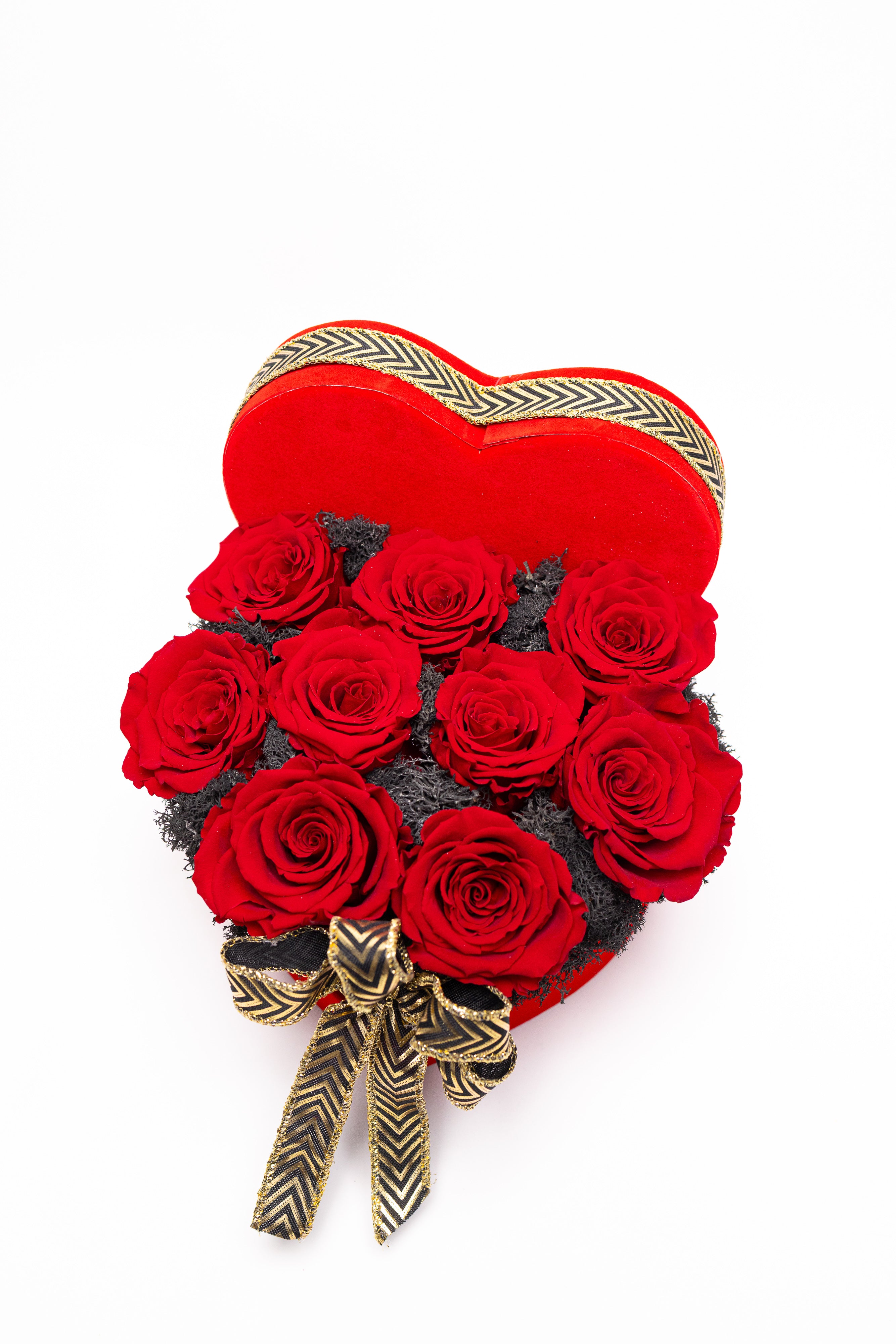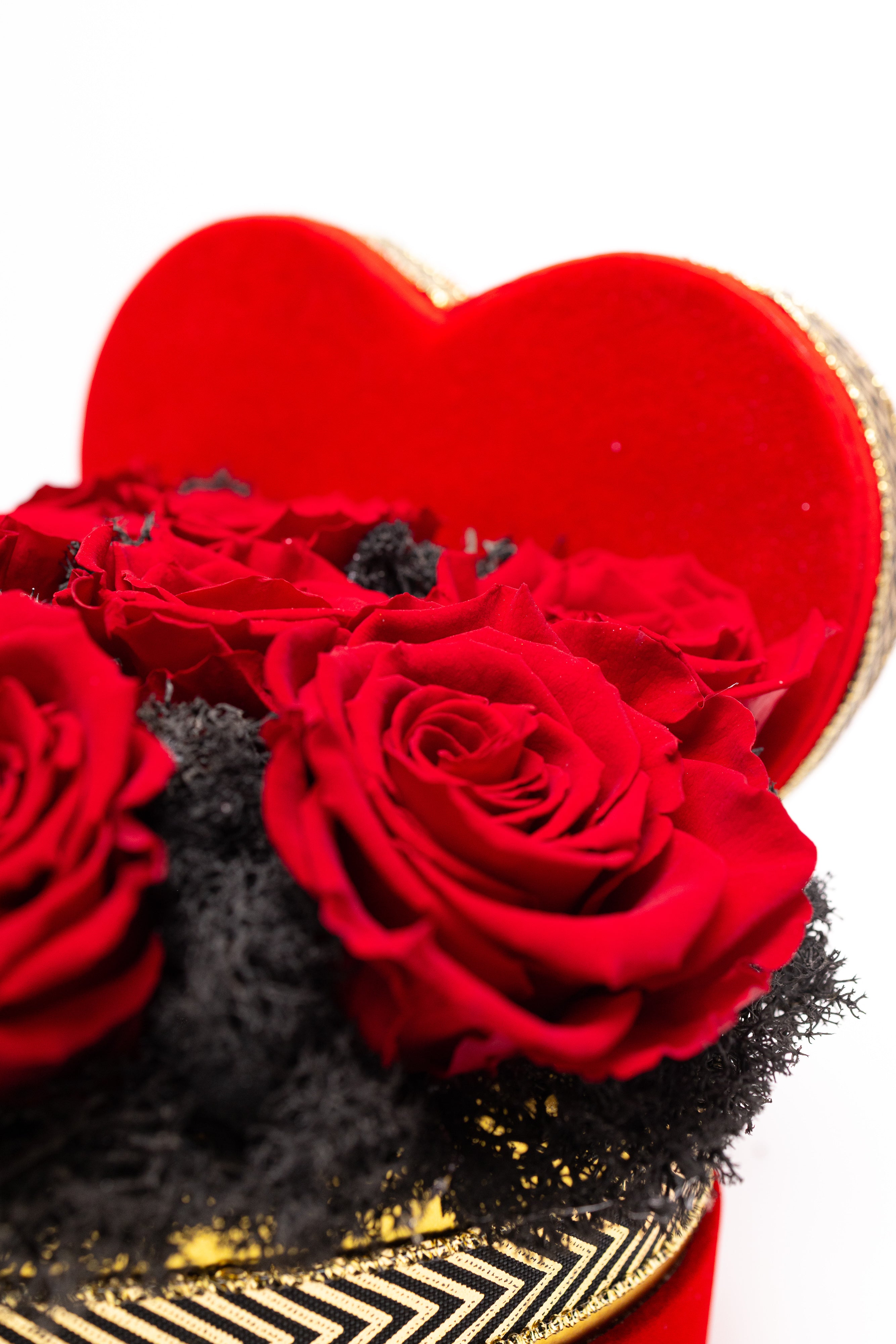 Cutie inimă din catifea roșie cu 9 trandafiri criogenați roșii, pe pat de mușchi natural negru. Decorată cu o fundă elegantă neagră cu auriu. Un simbol etern al iubirii pasionale.