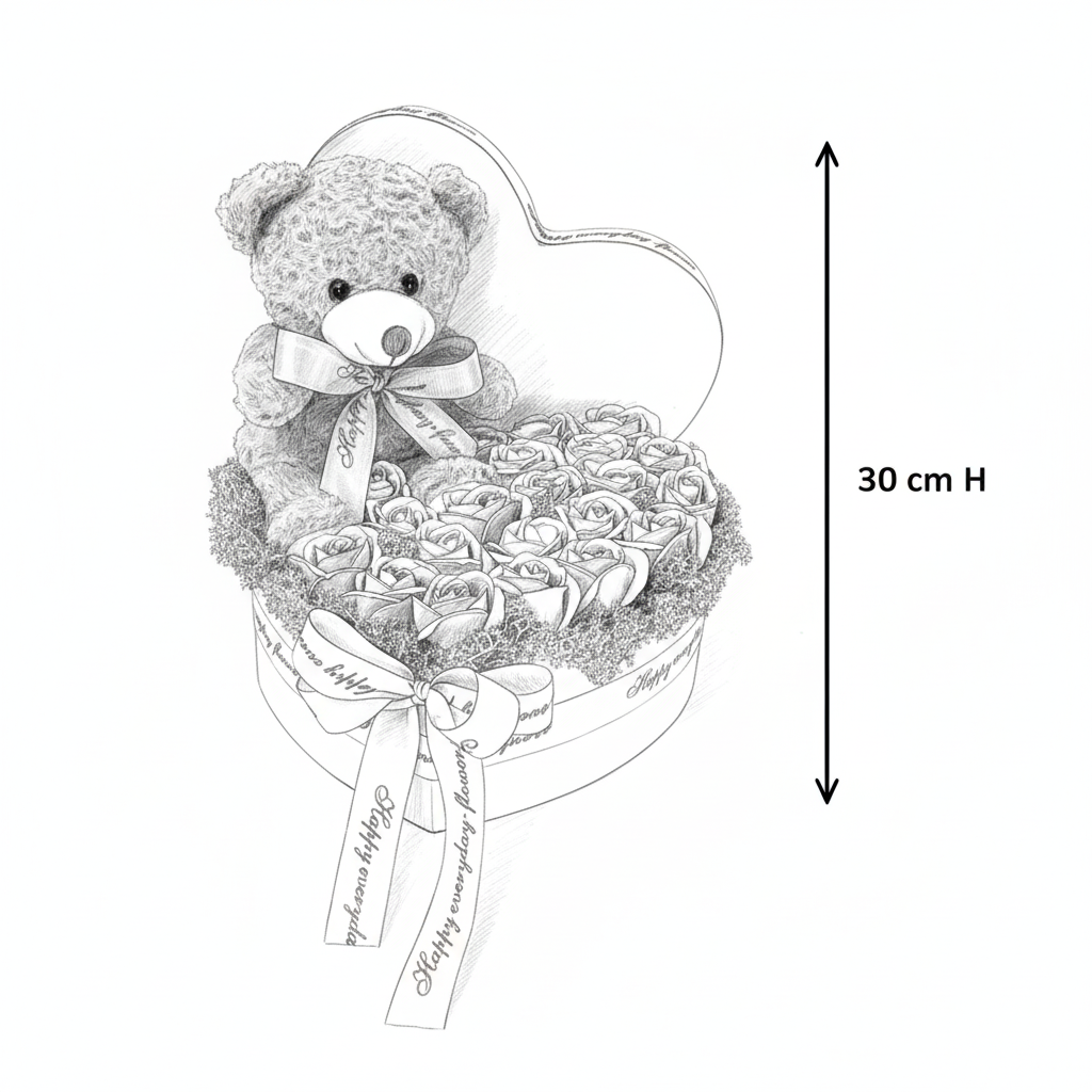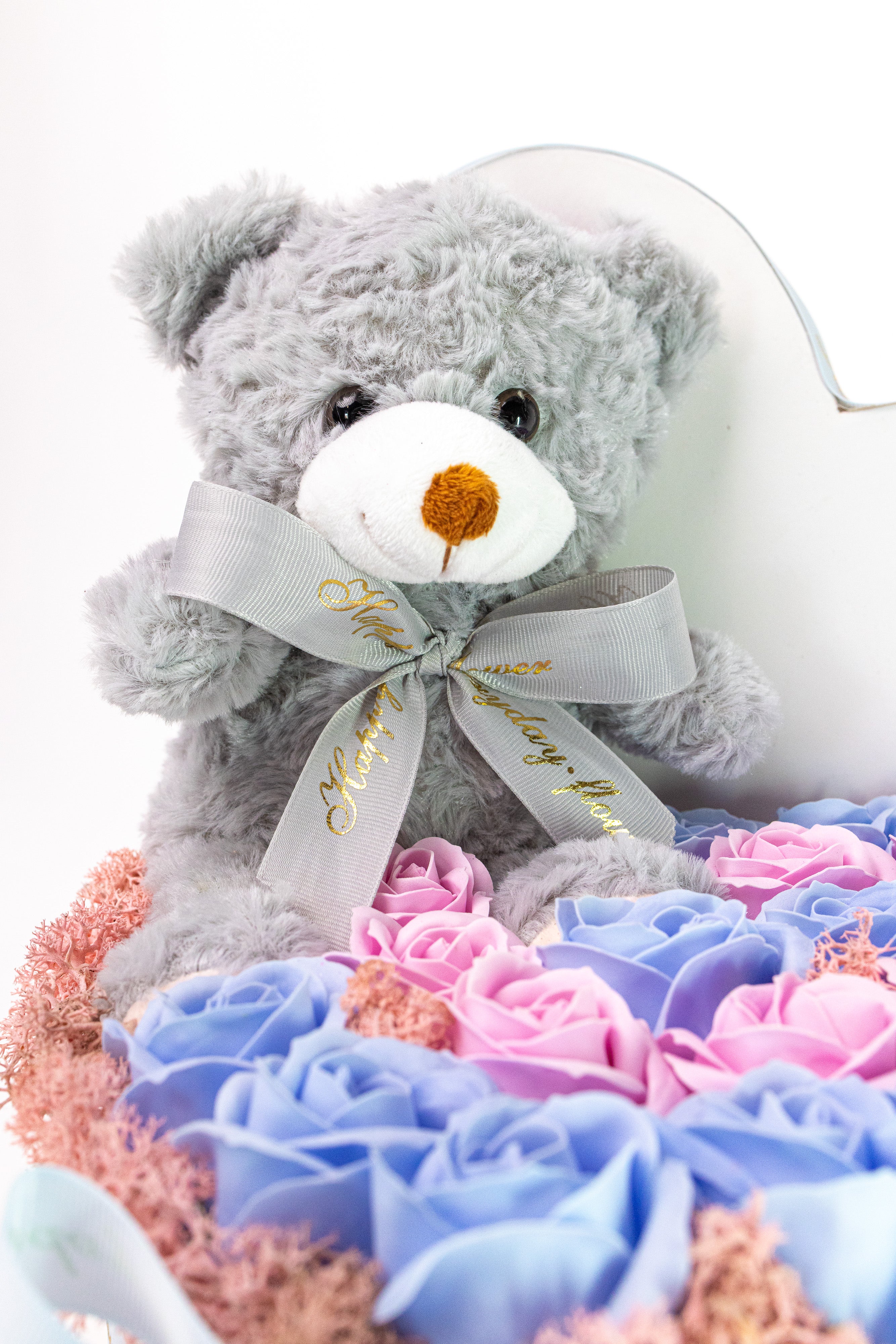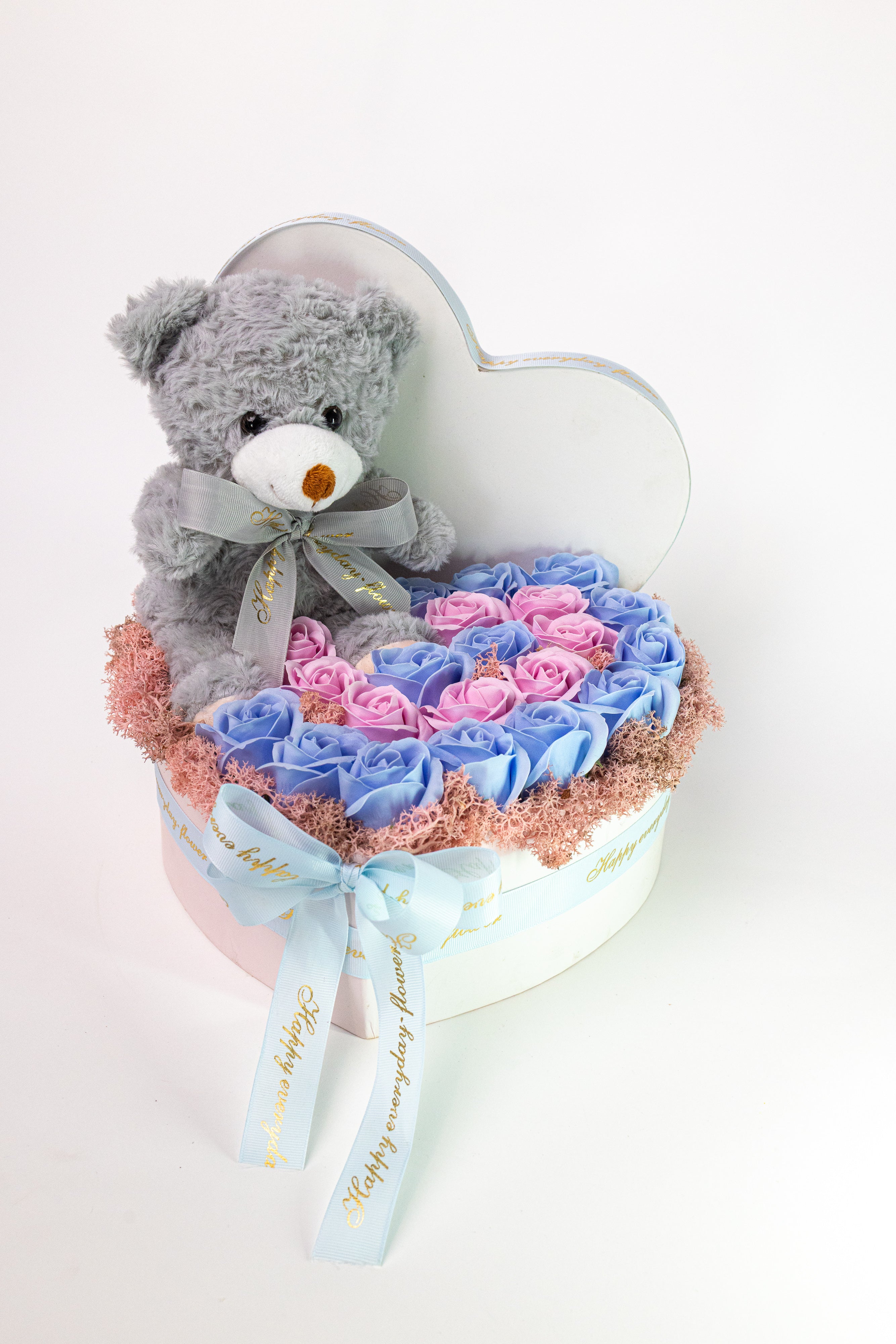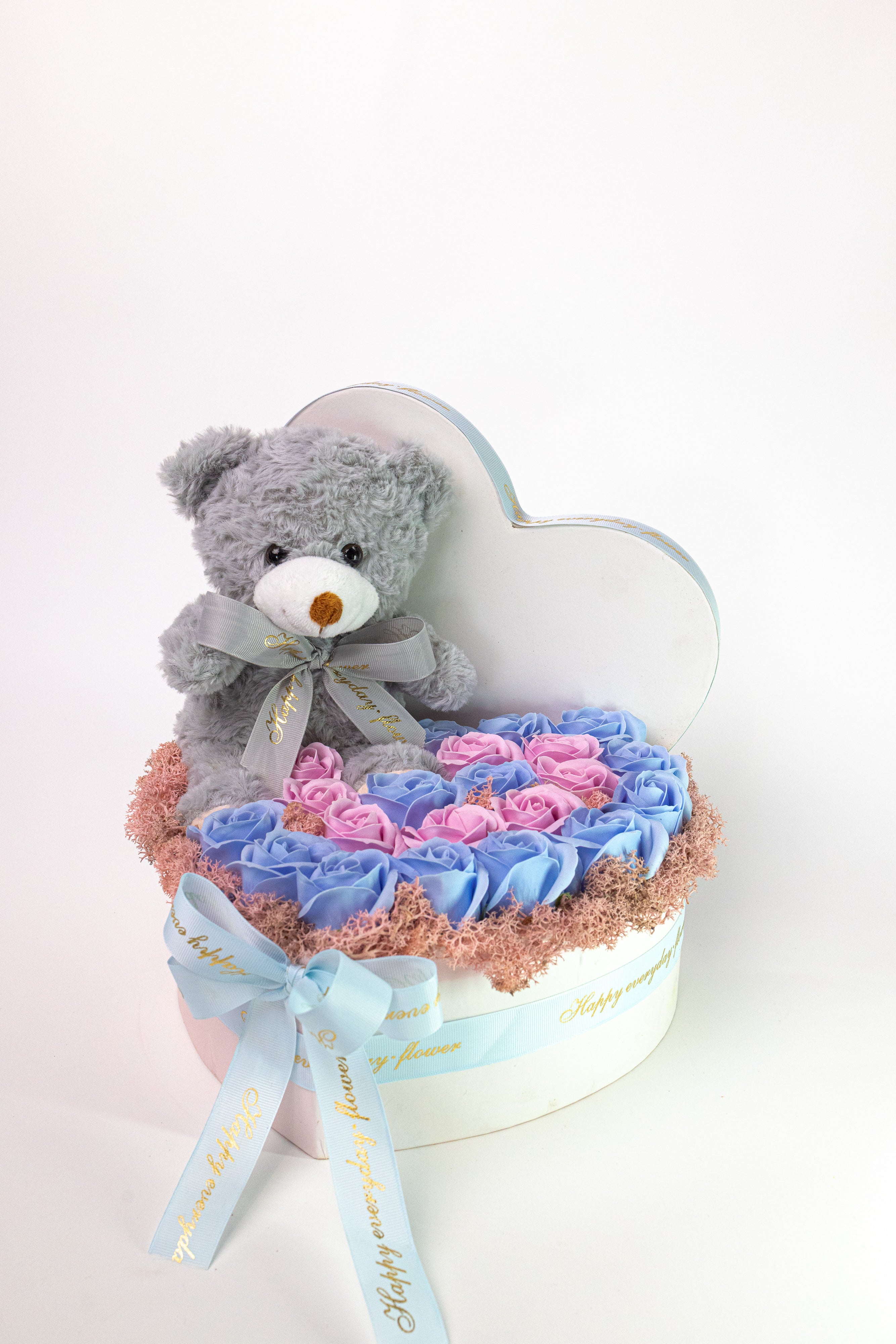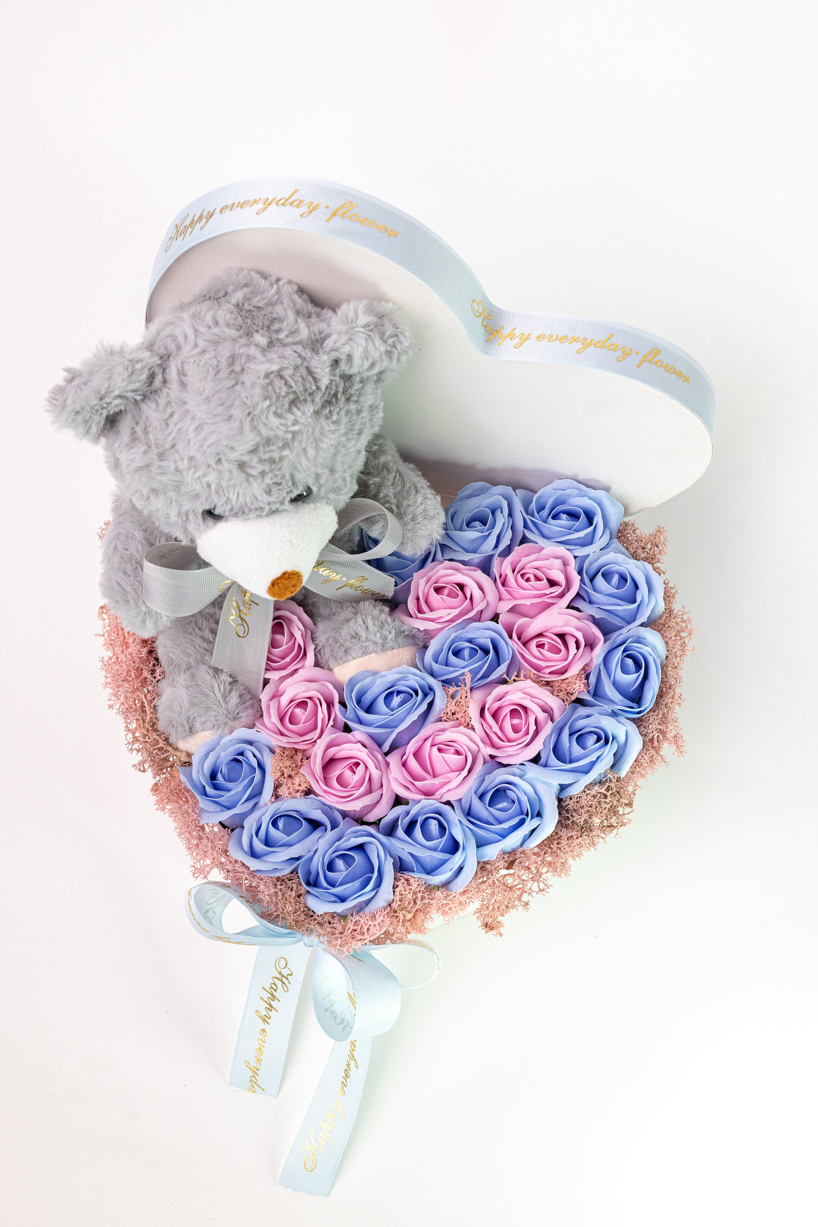 Cutie inimă elegantă cu trandafiri de săpun roz și albaștri, ursuleț gri pufos și bordură din mușchi natural. Textură fină, parfum delicat și rezistență eternă. Un cadou tandru și rafinat.