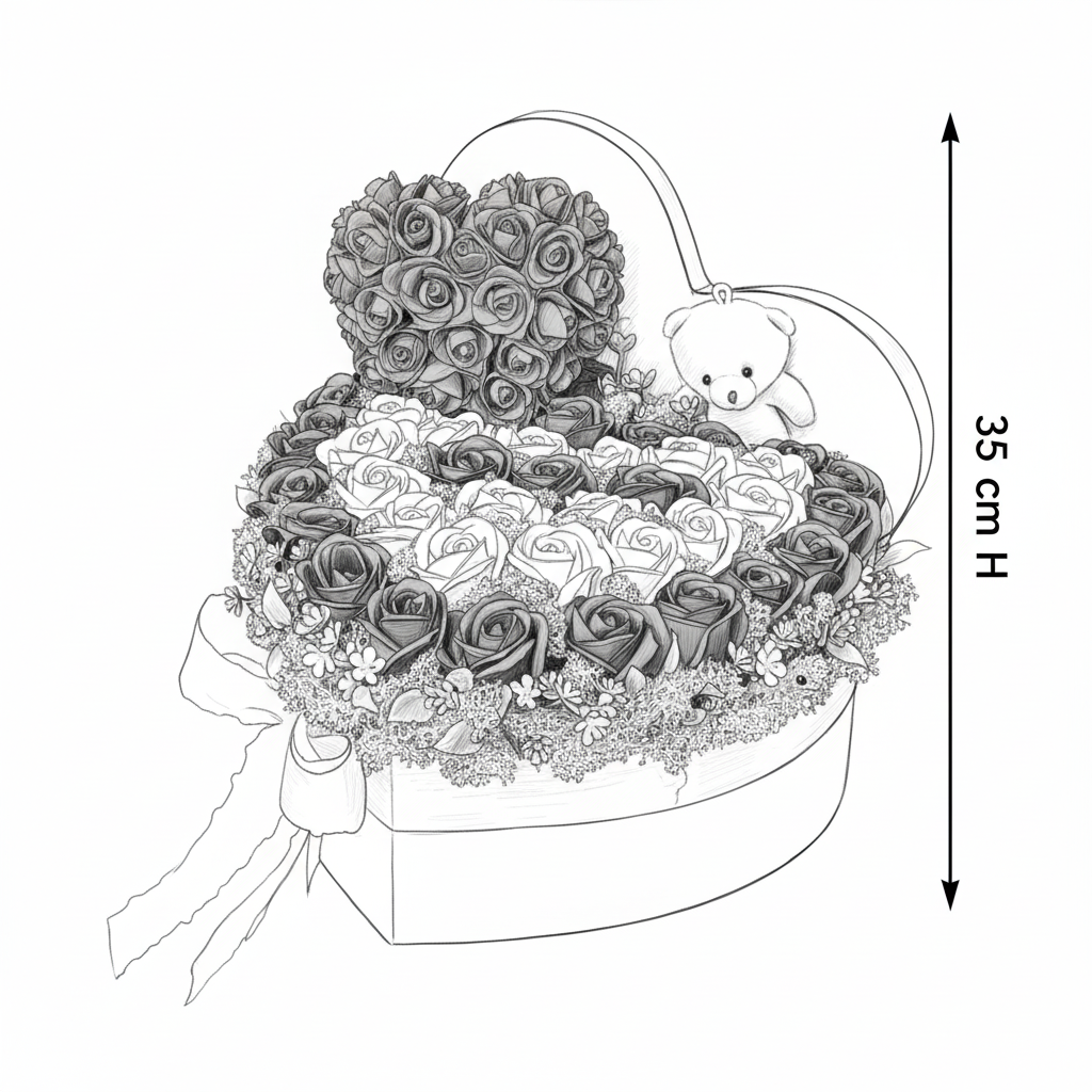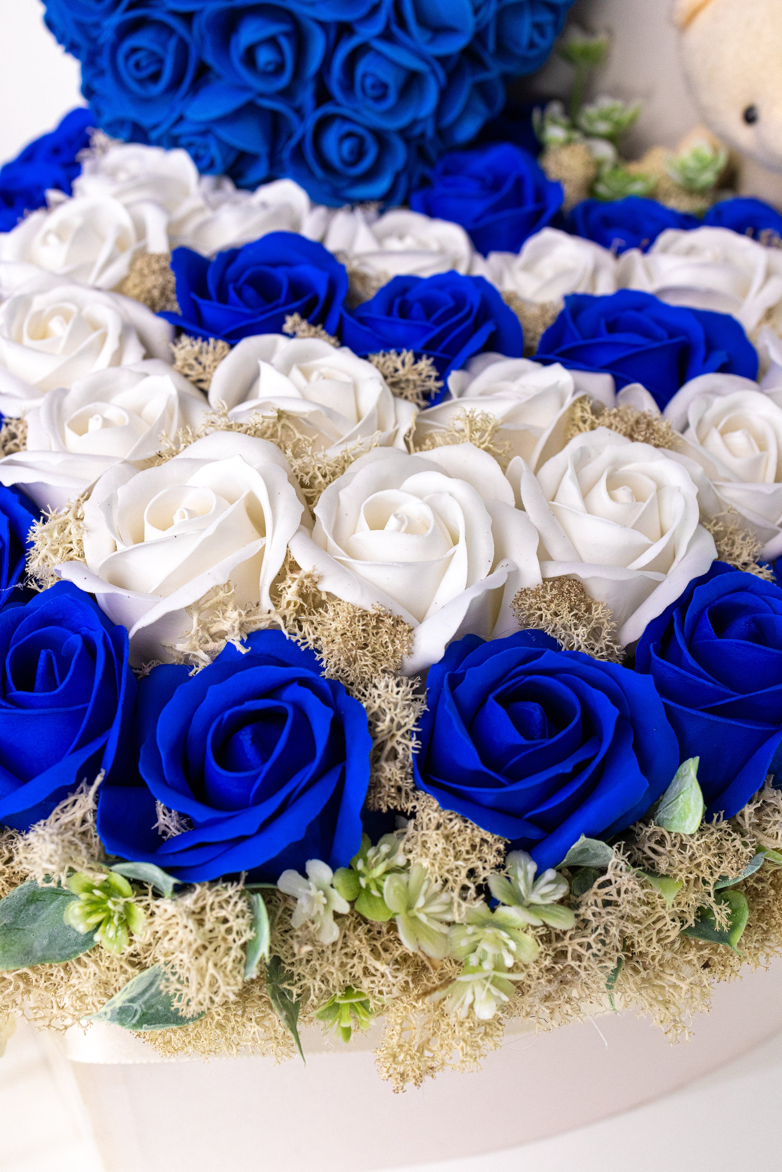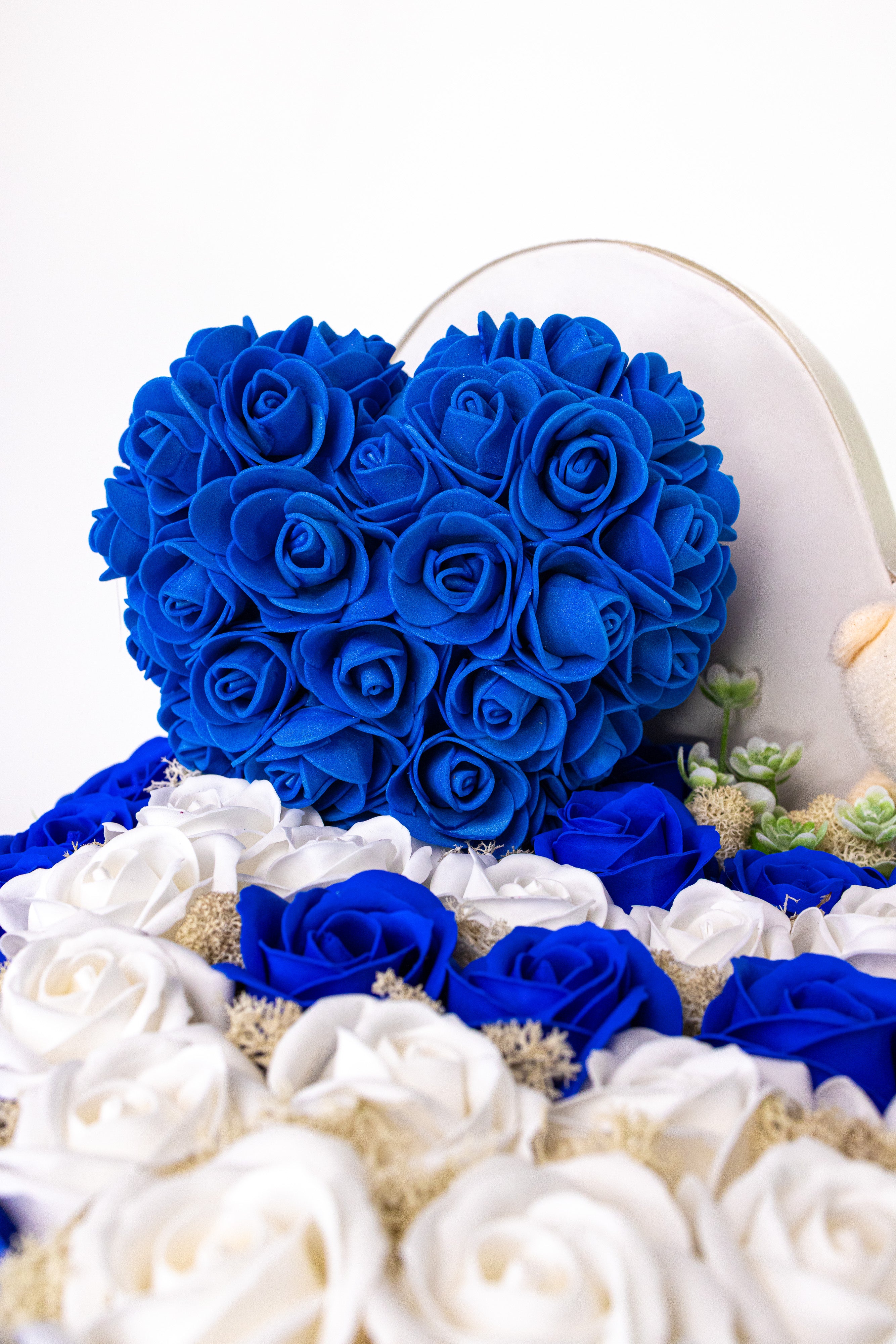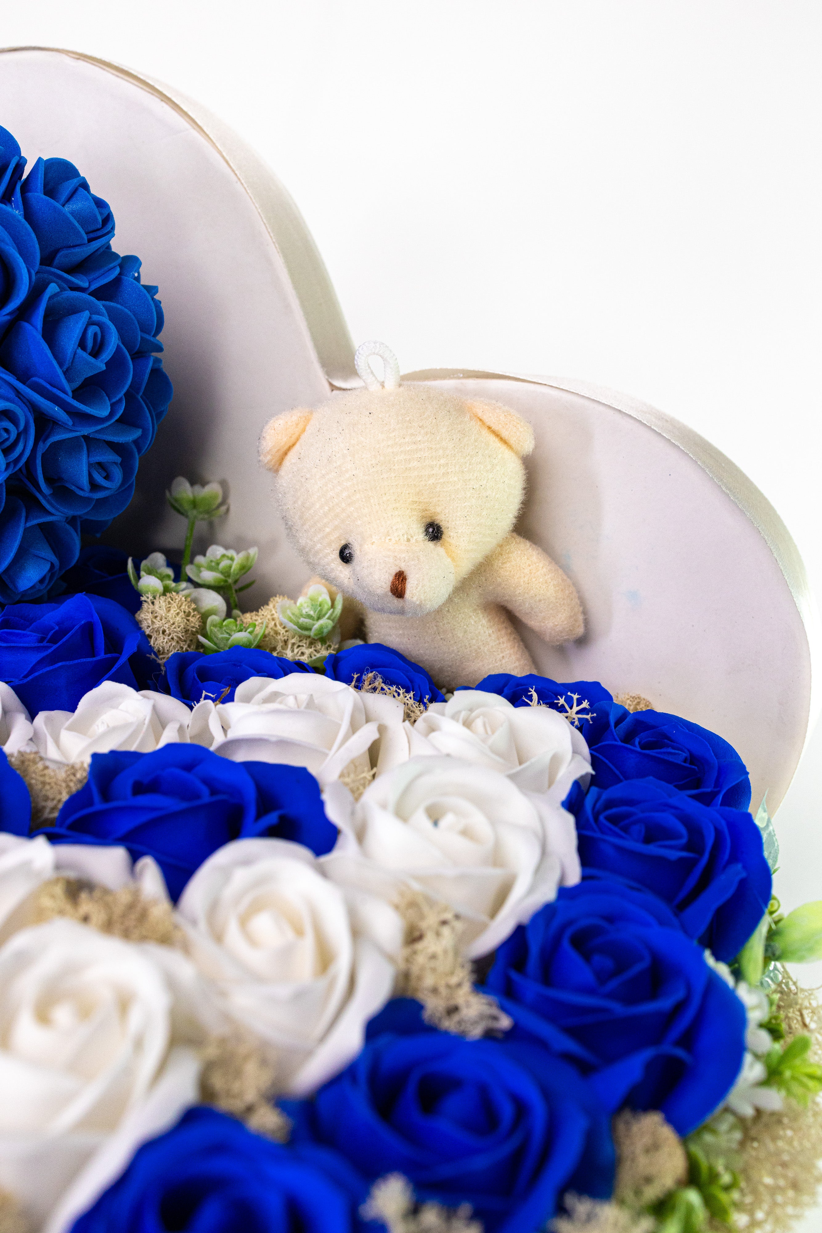 Aranjament Inimă Lux Trandafiri Săpun Albastru-Alb & Ursulet