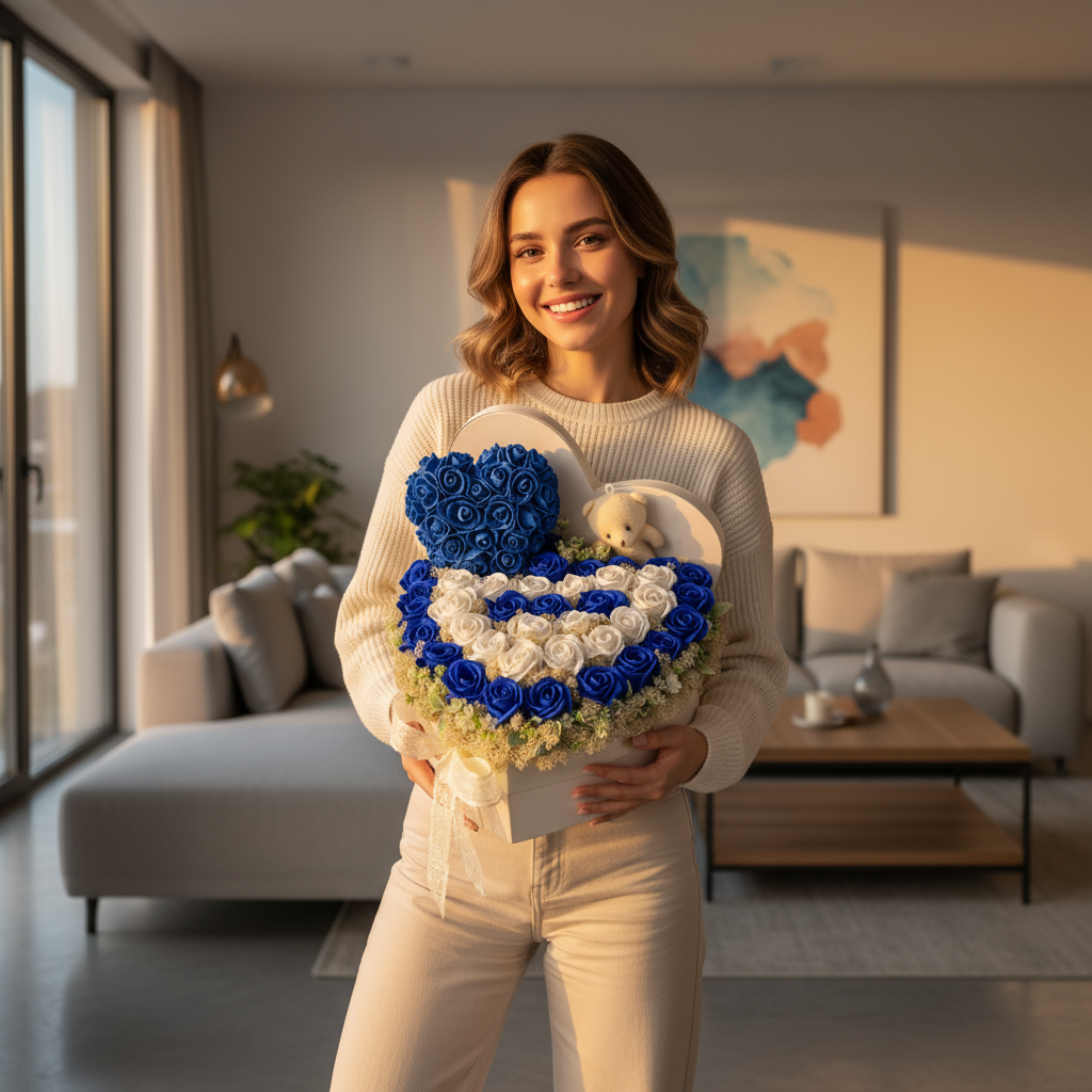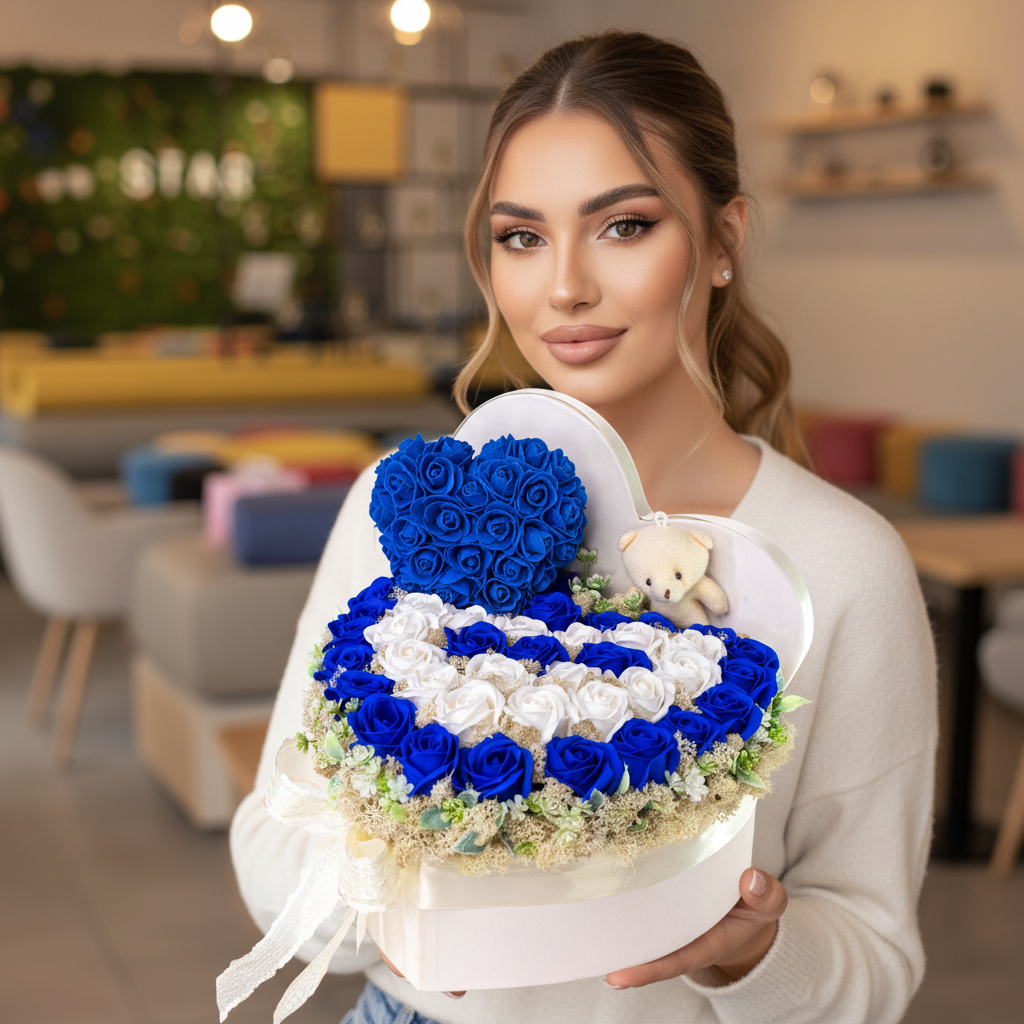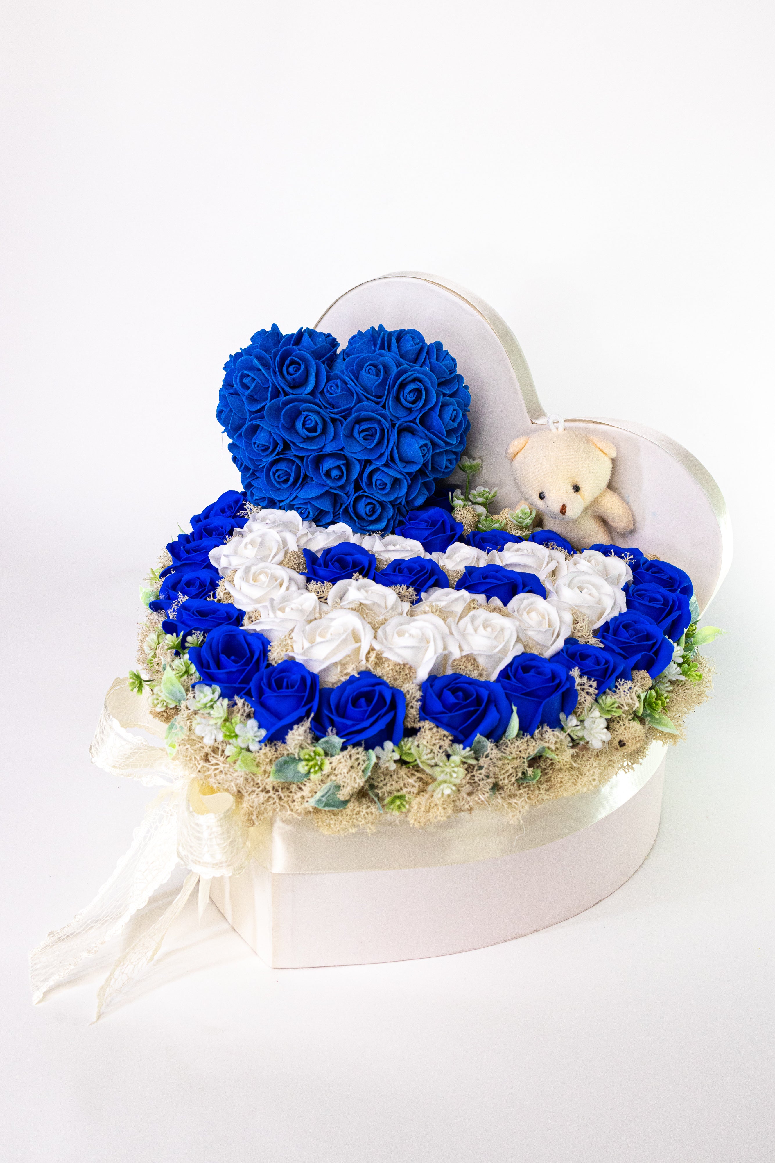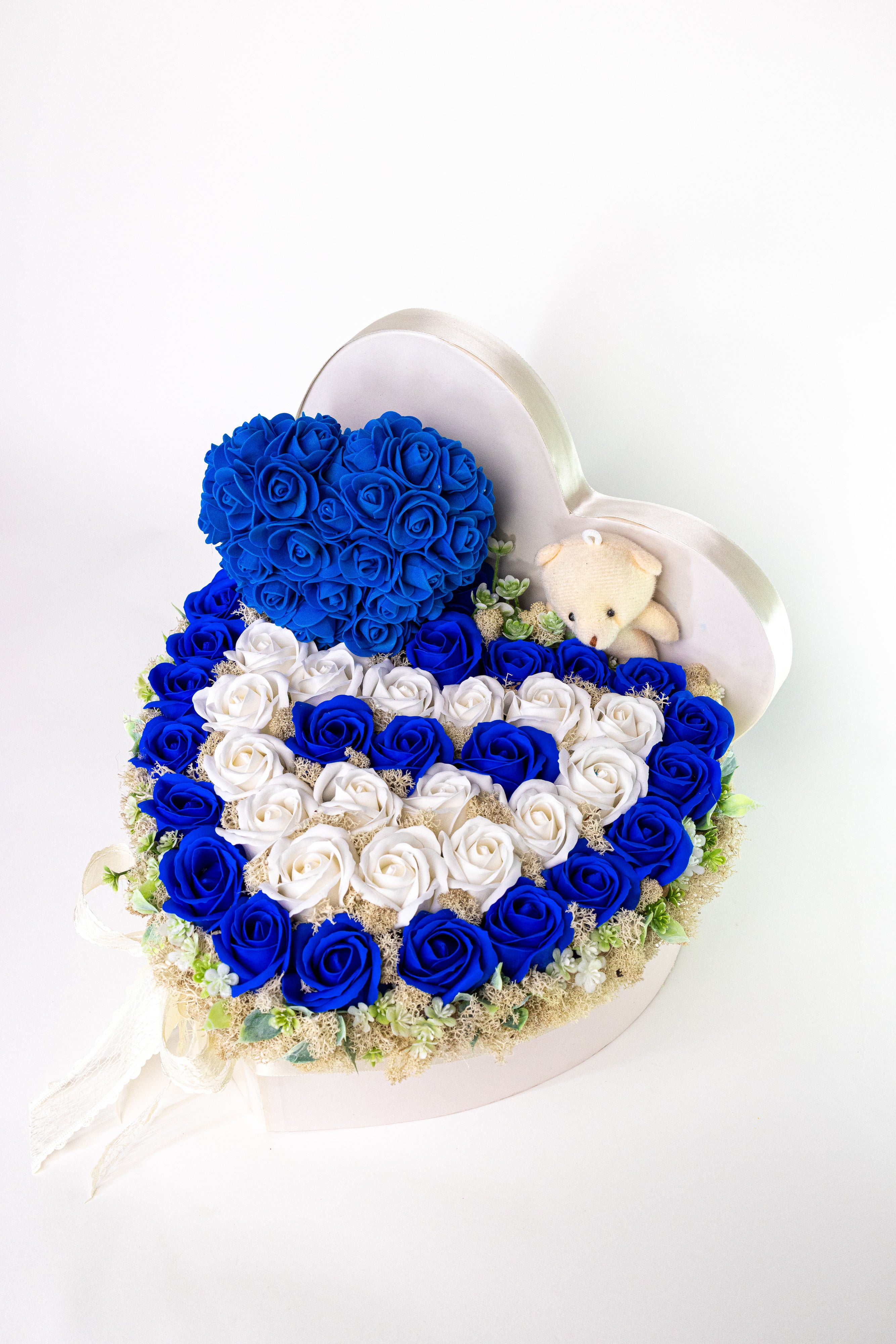 Cutie inimă elegantă cu trandafiri de săpun albastru și alb, decorată cu mușchi natural. Include o inimioară handmade și un ursuleț de pluș. Un aranjament etern, parfumat, cu textură fină și aspect regal.