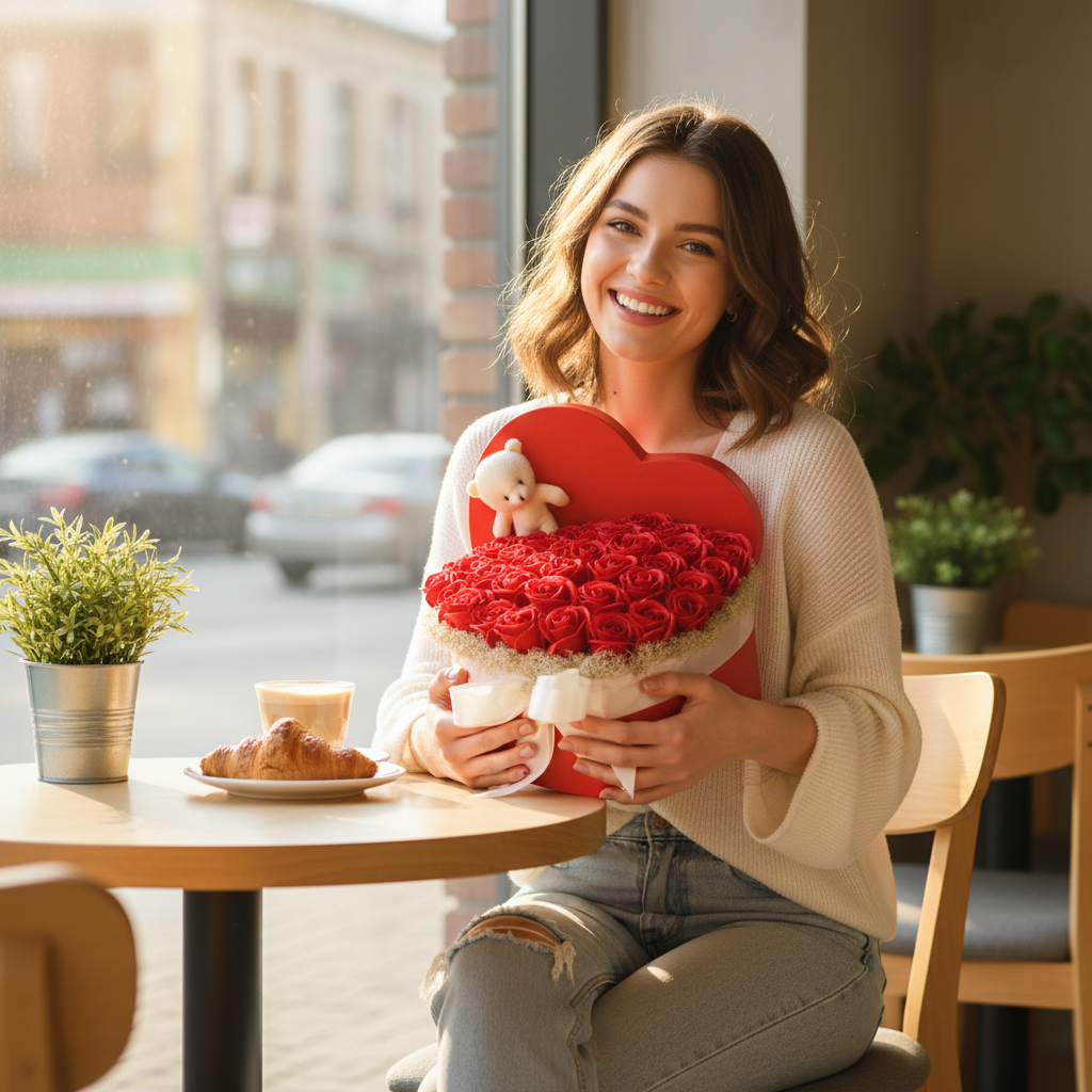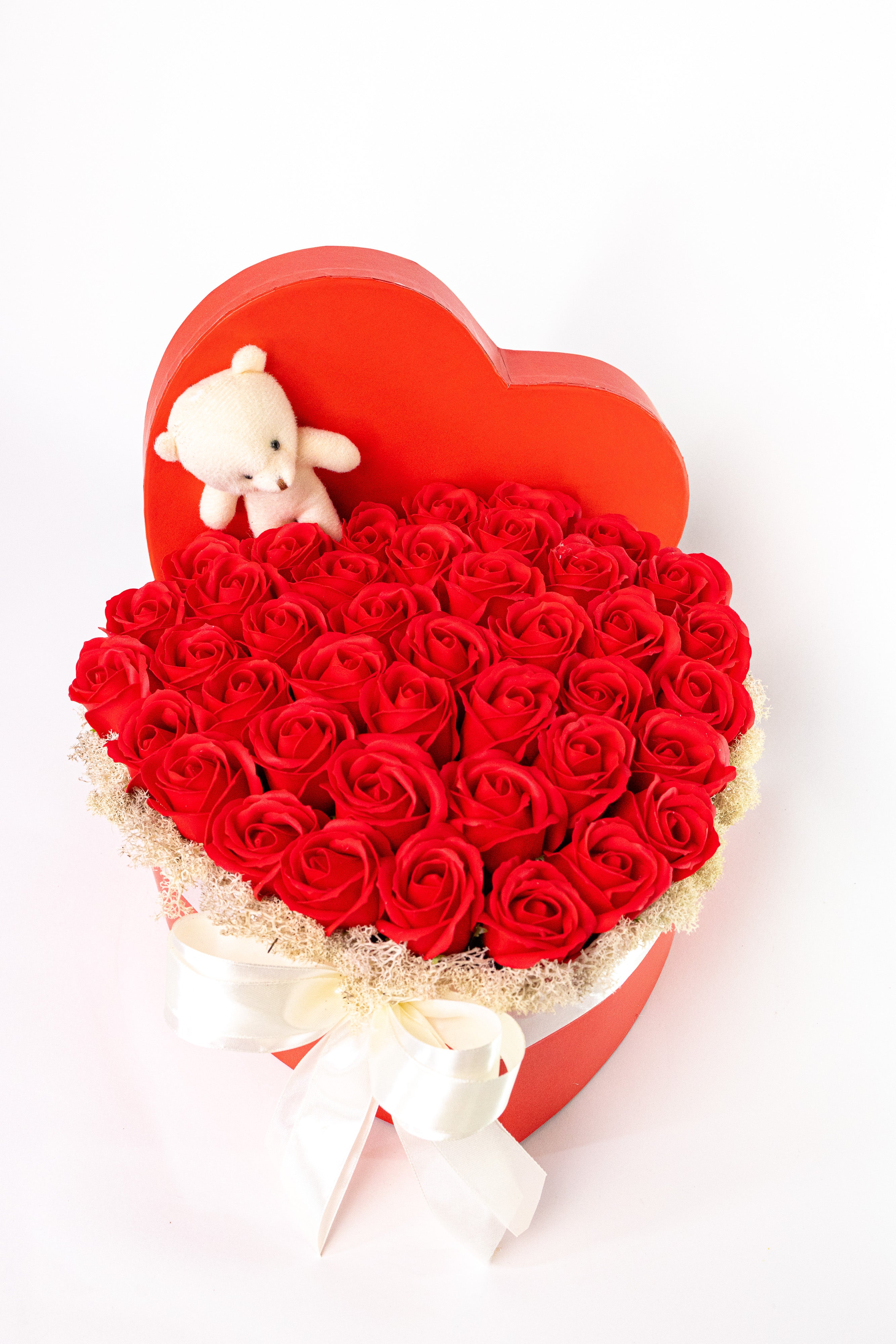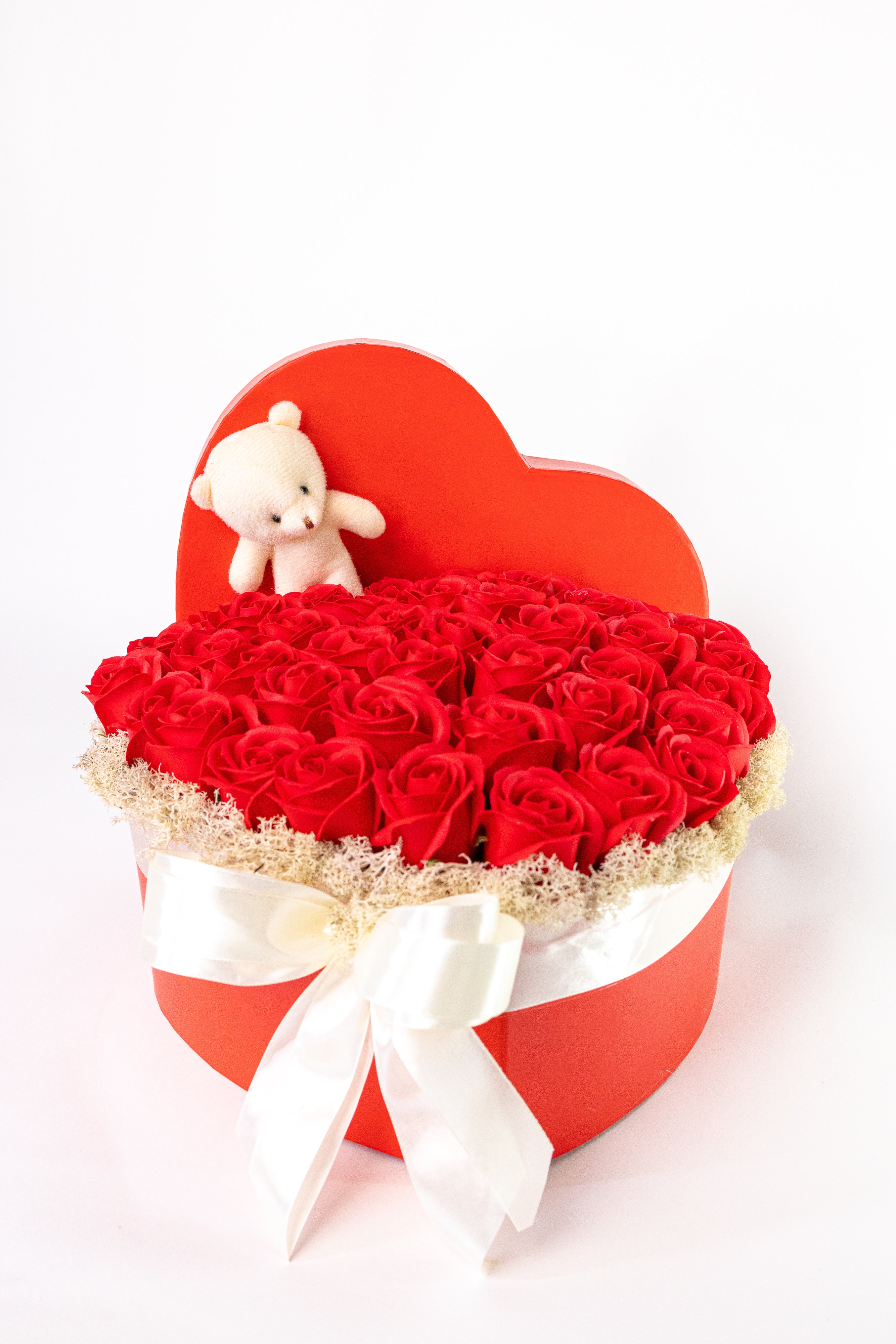 Cutie inimă roșie elegantă cu trandafiri de săpun roșii vibranți și un ursuleț alb de pluș. Decorat cu mușchi natural și o fundă albă din satin. Un cadou romantic, parfumat și etern.