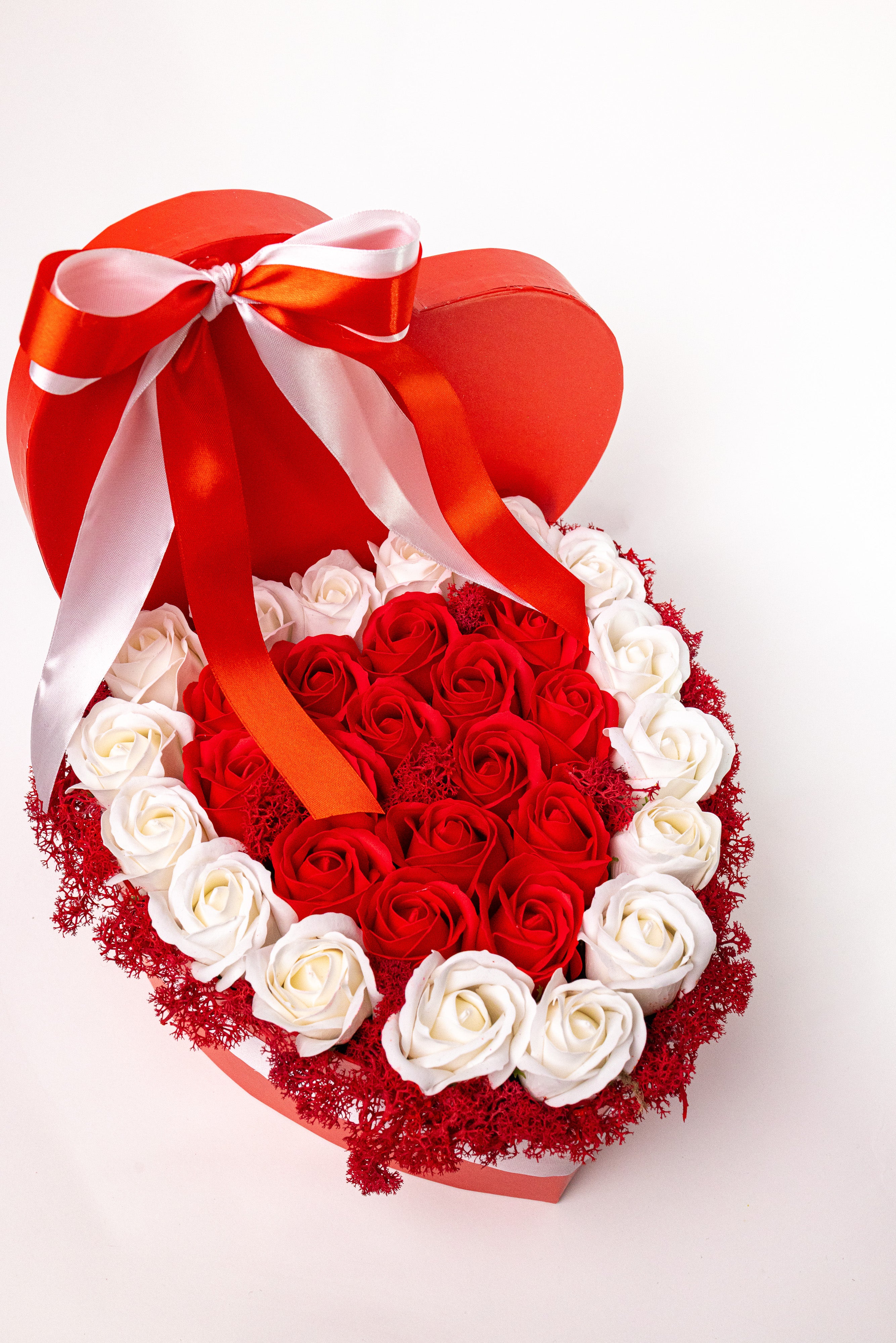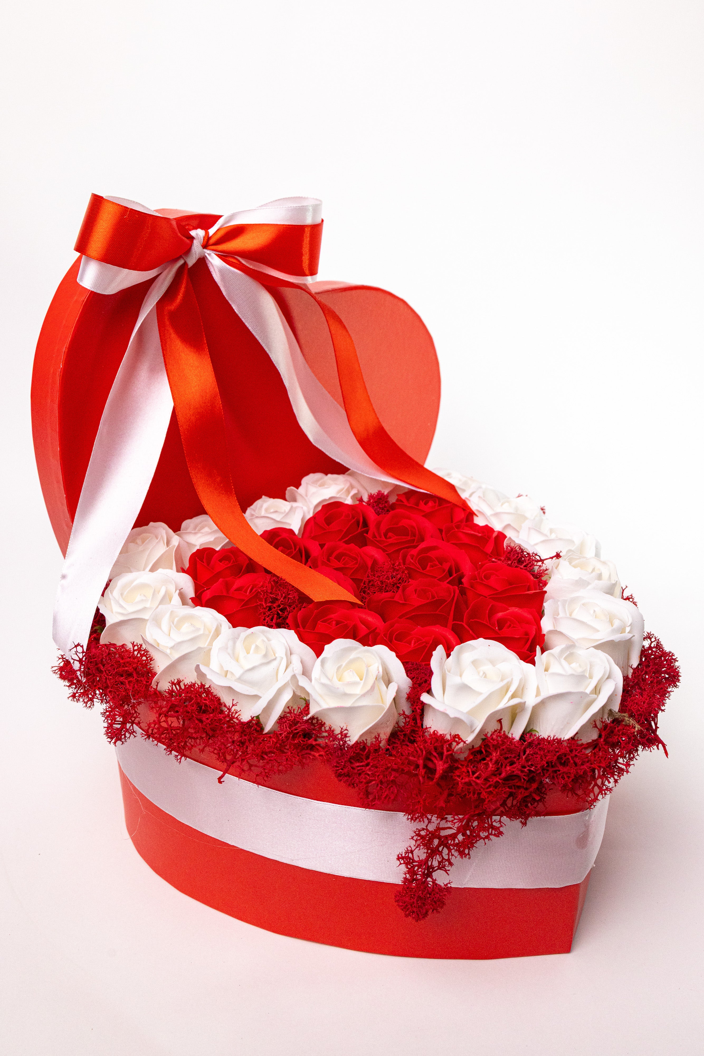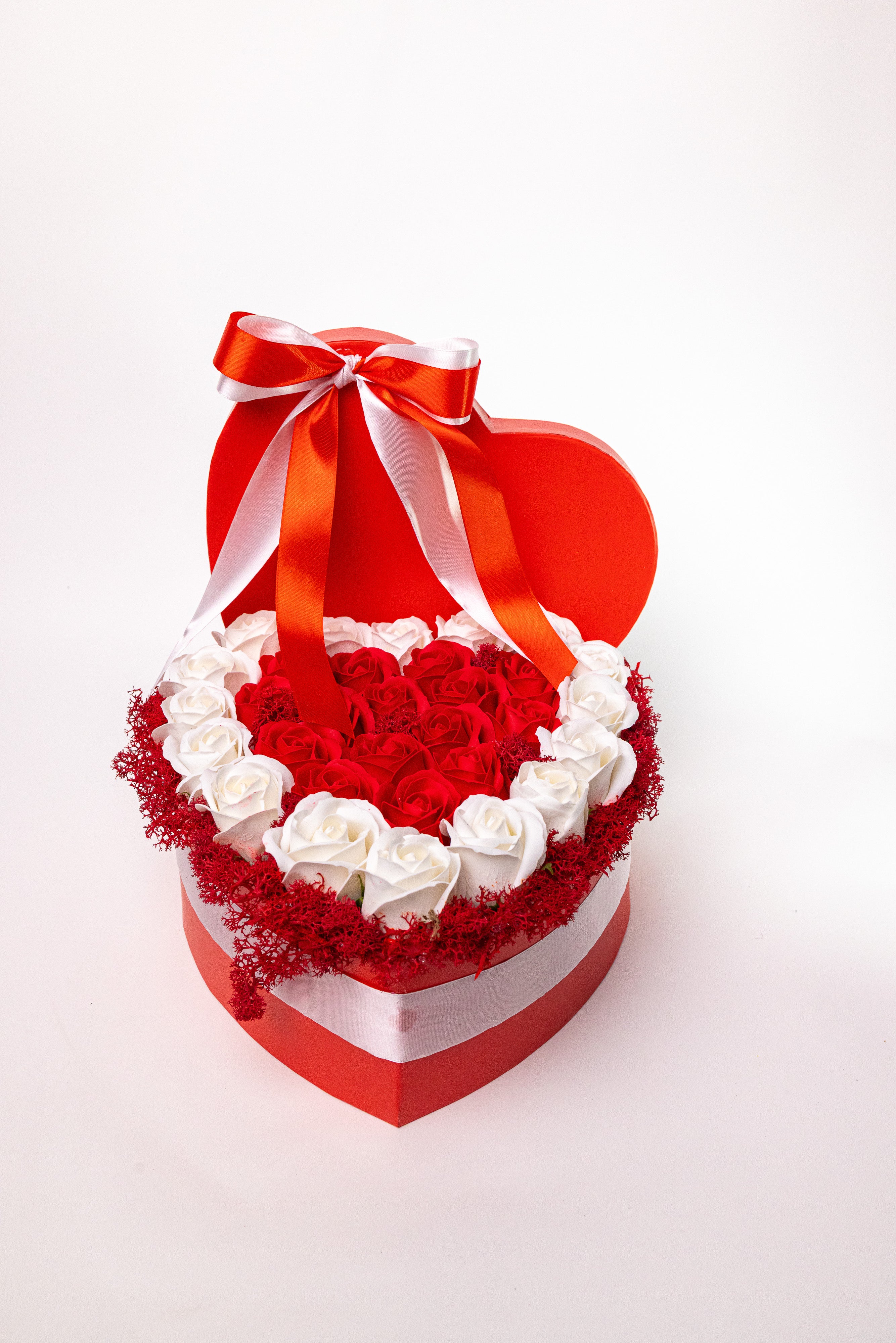 Cutie inimă roșie cu trandafiri de săpun alb-roșu și mușchi natural. Accesorizată cu o fundă satinată elegantă. Petale fine, parfumate și rezistență eternă. Un cadou romantic și vibrant.