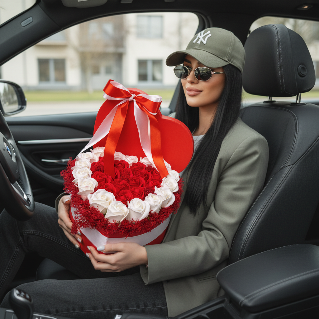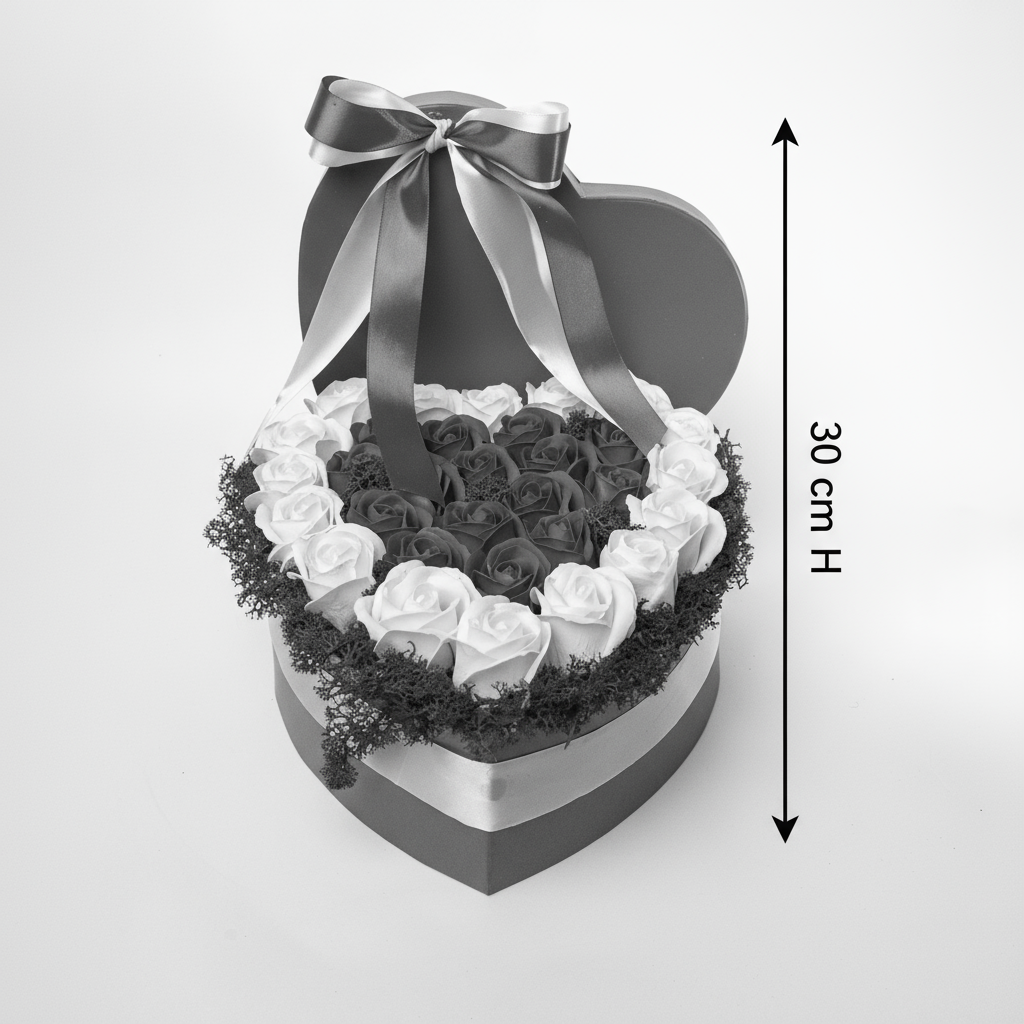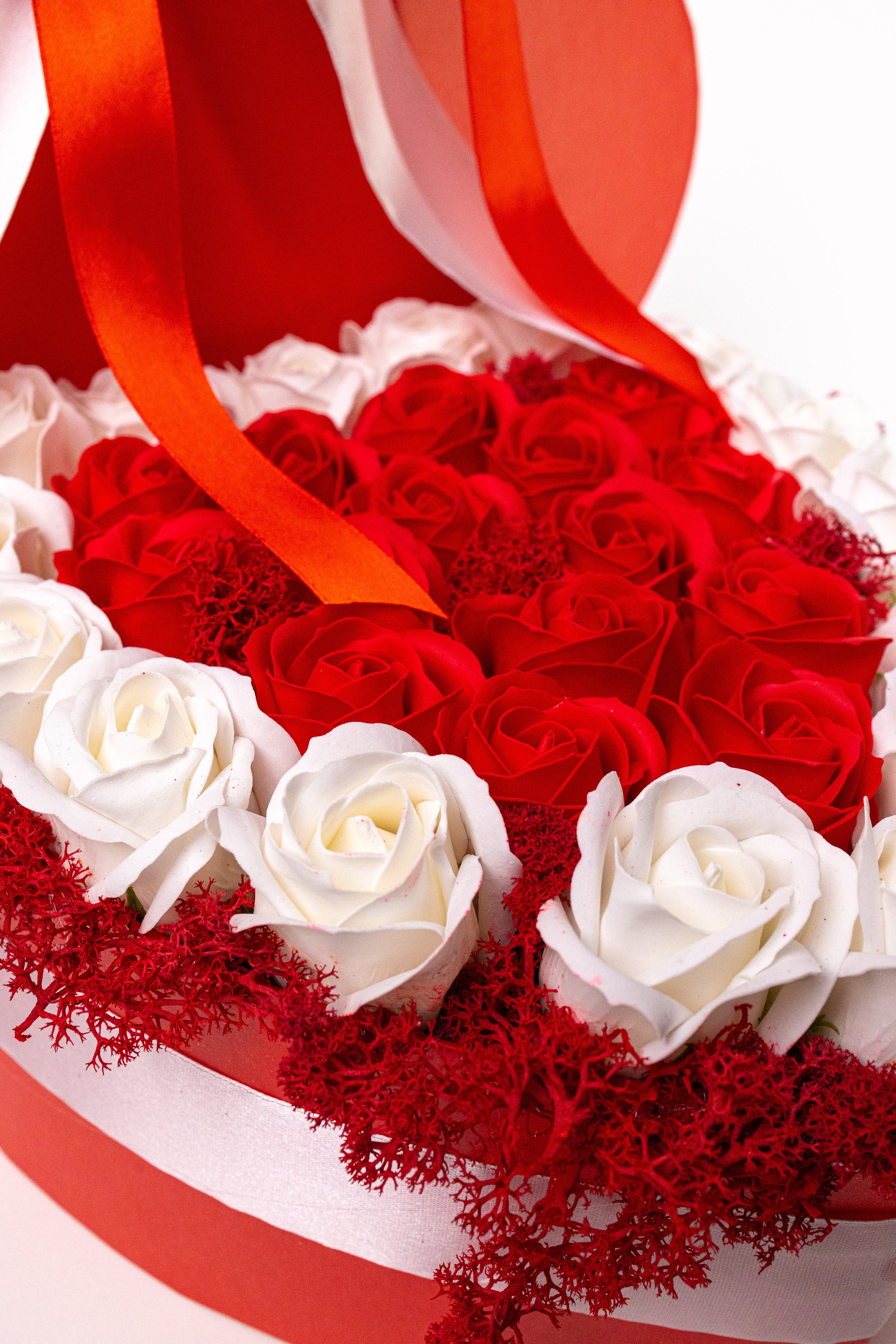 Cutie inimă roșie cu trandafiri de săpun alb-roșu și mușchi natural. Accesorizată cu o fundă satinată elegantă. Petale fine, parfumate și rezistență eternă. Un cadou romantic și vibrant.