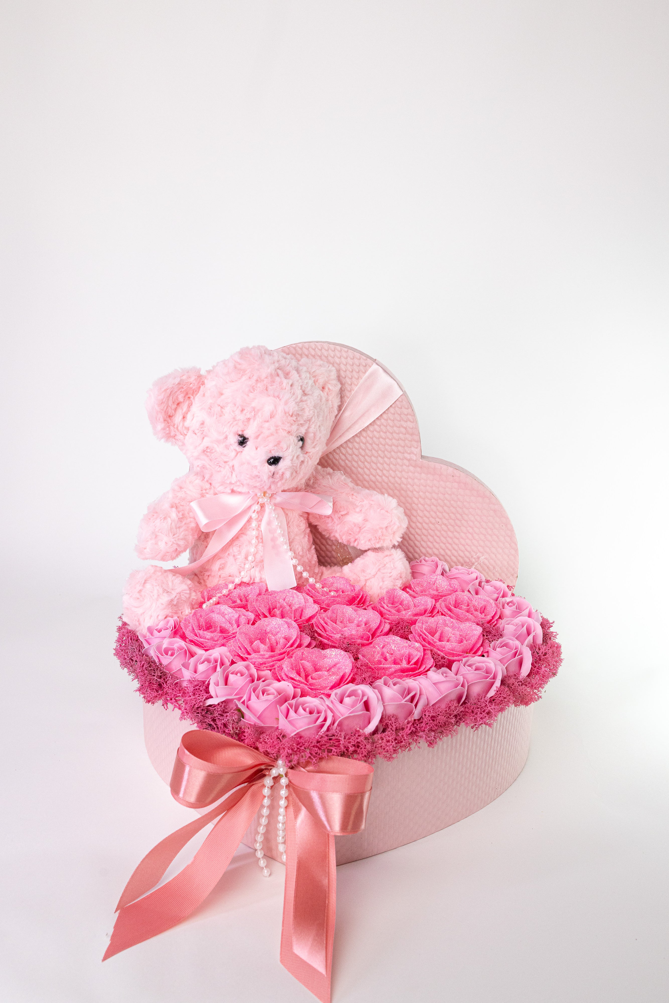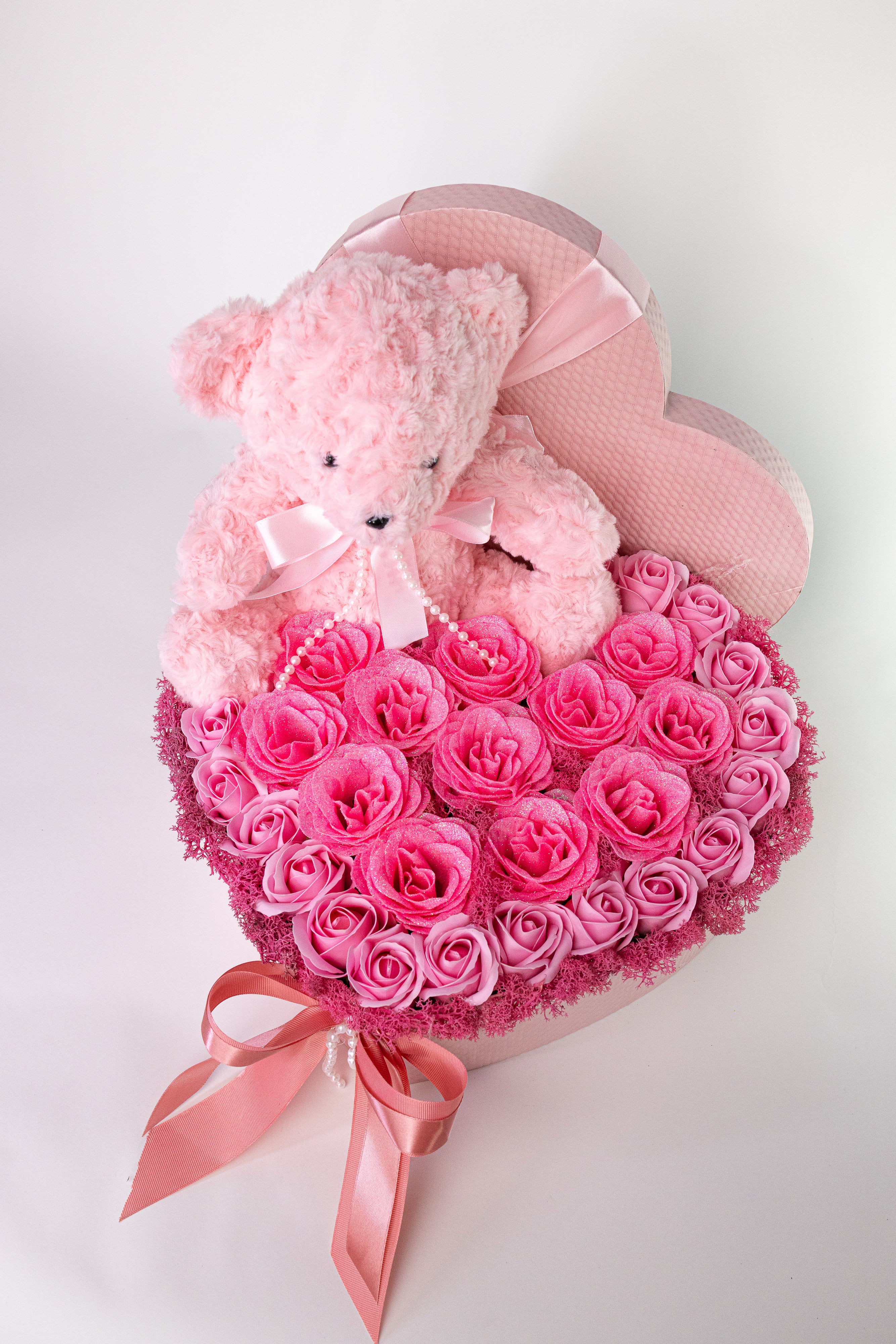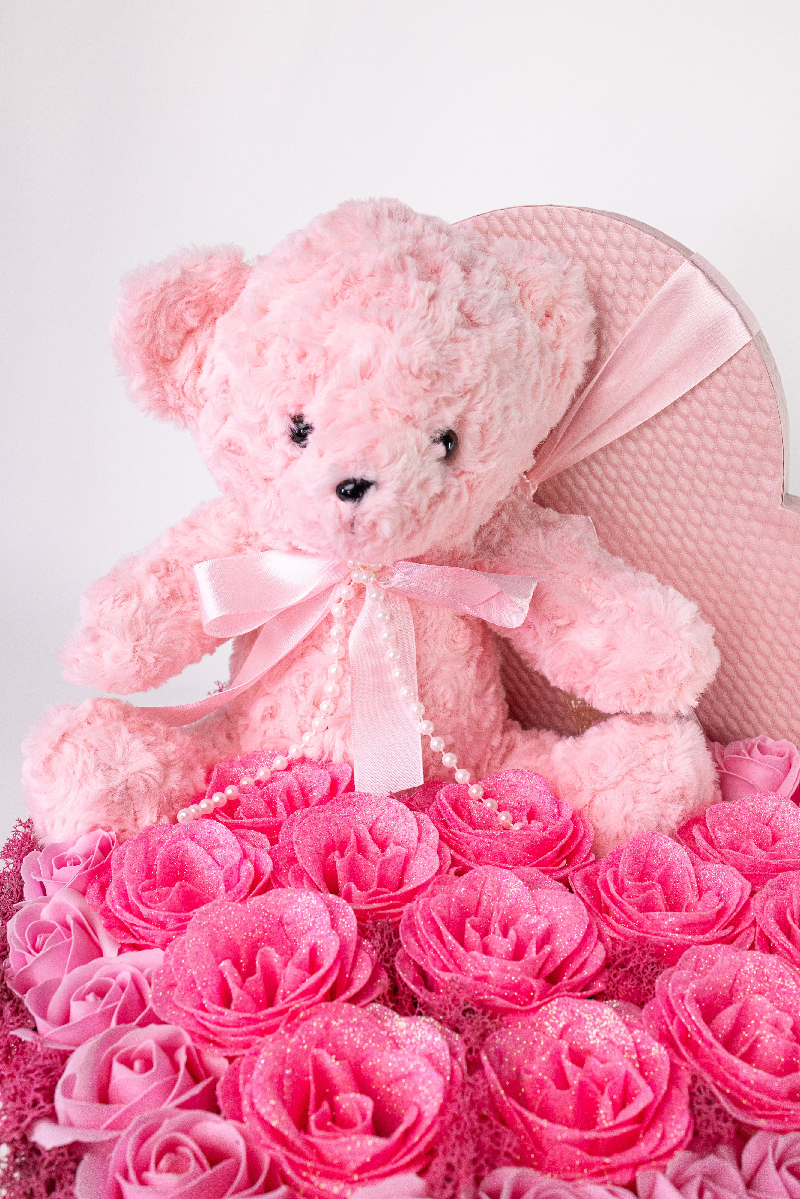 Cutie inimă roz texturată, cu trandafiri de săpun parfumați și ursuleț din catifea premium, accesorizat cu perle. Decorat cu mușchi și fundă satinată. Un cadou etern, rafinat și plin de tandrețe.