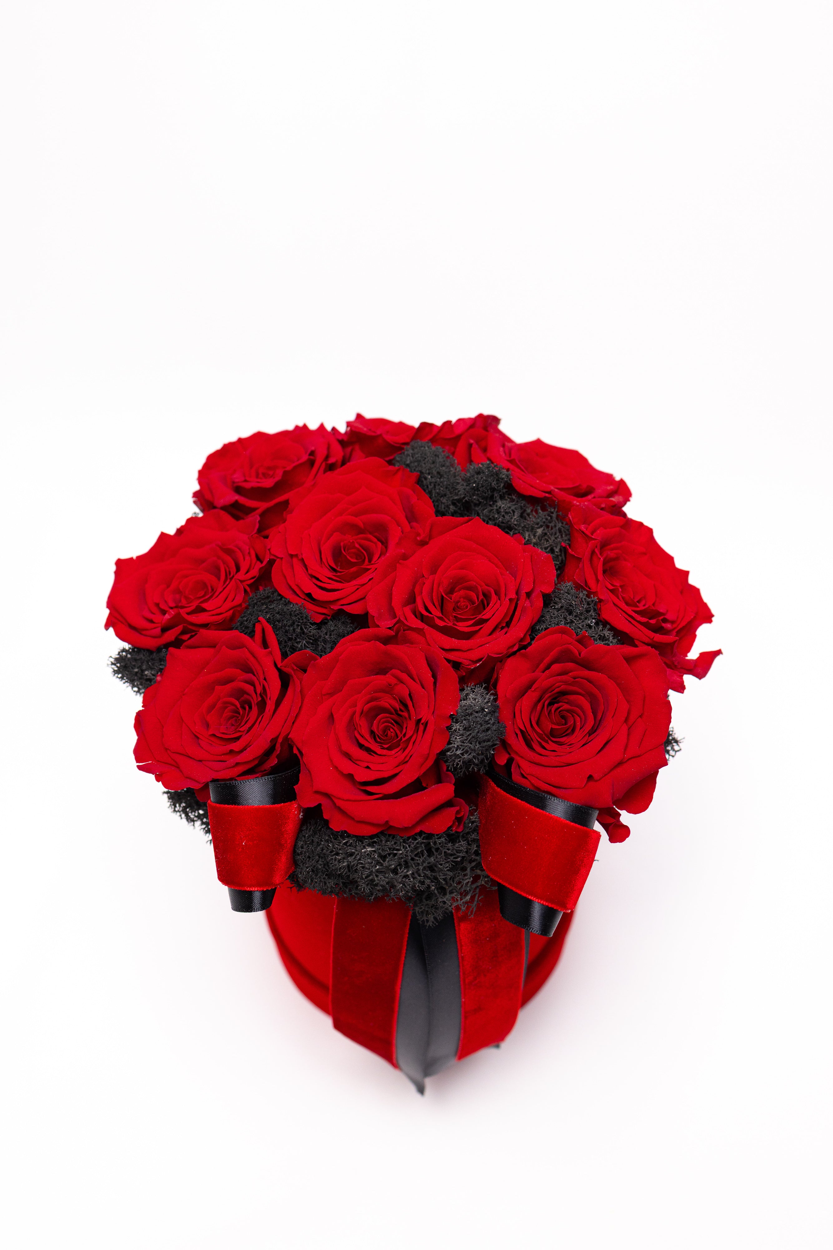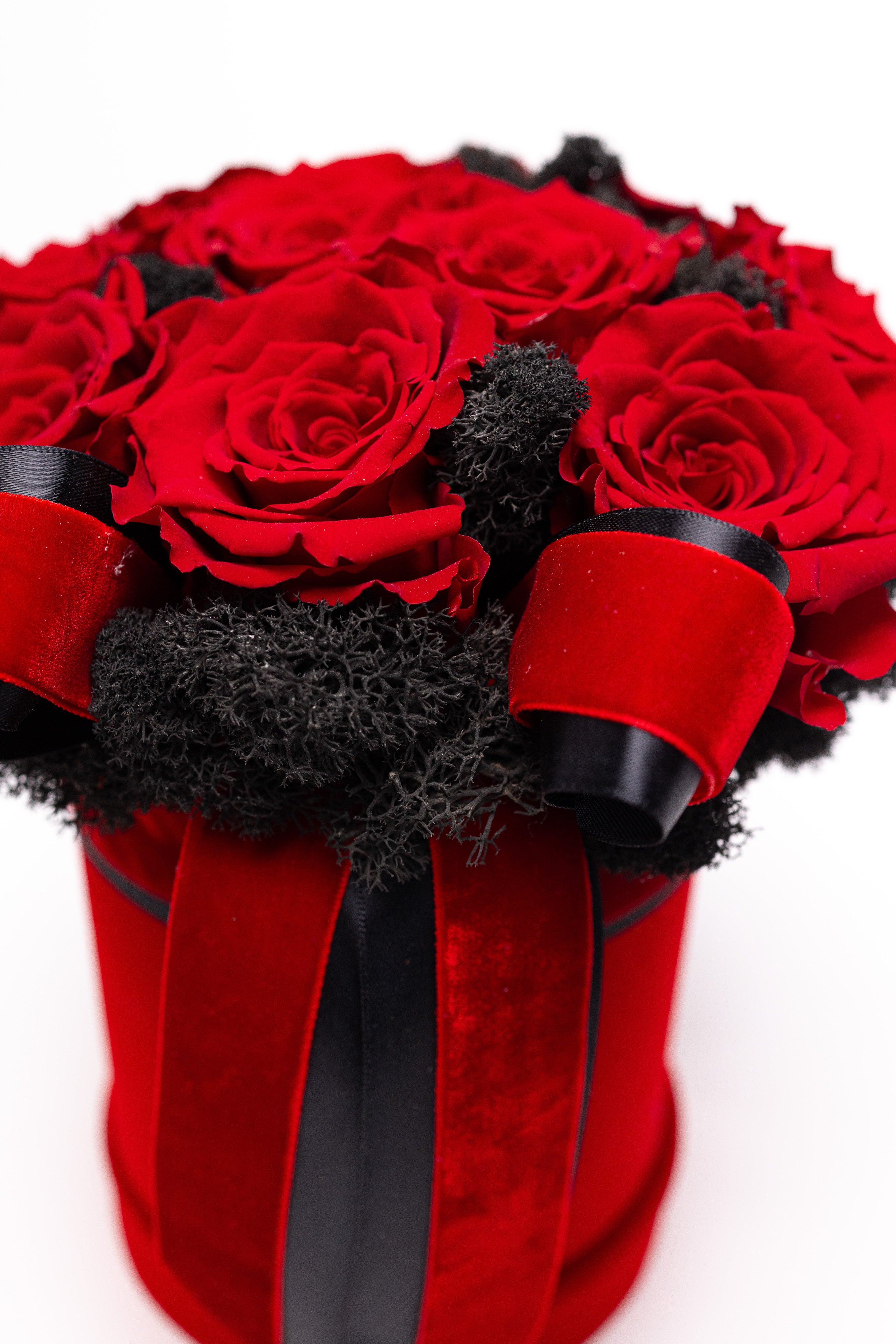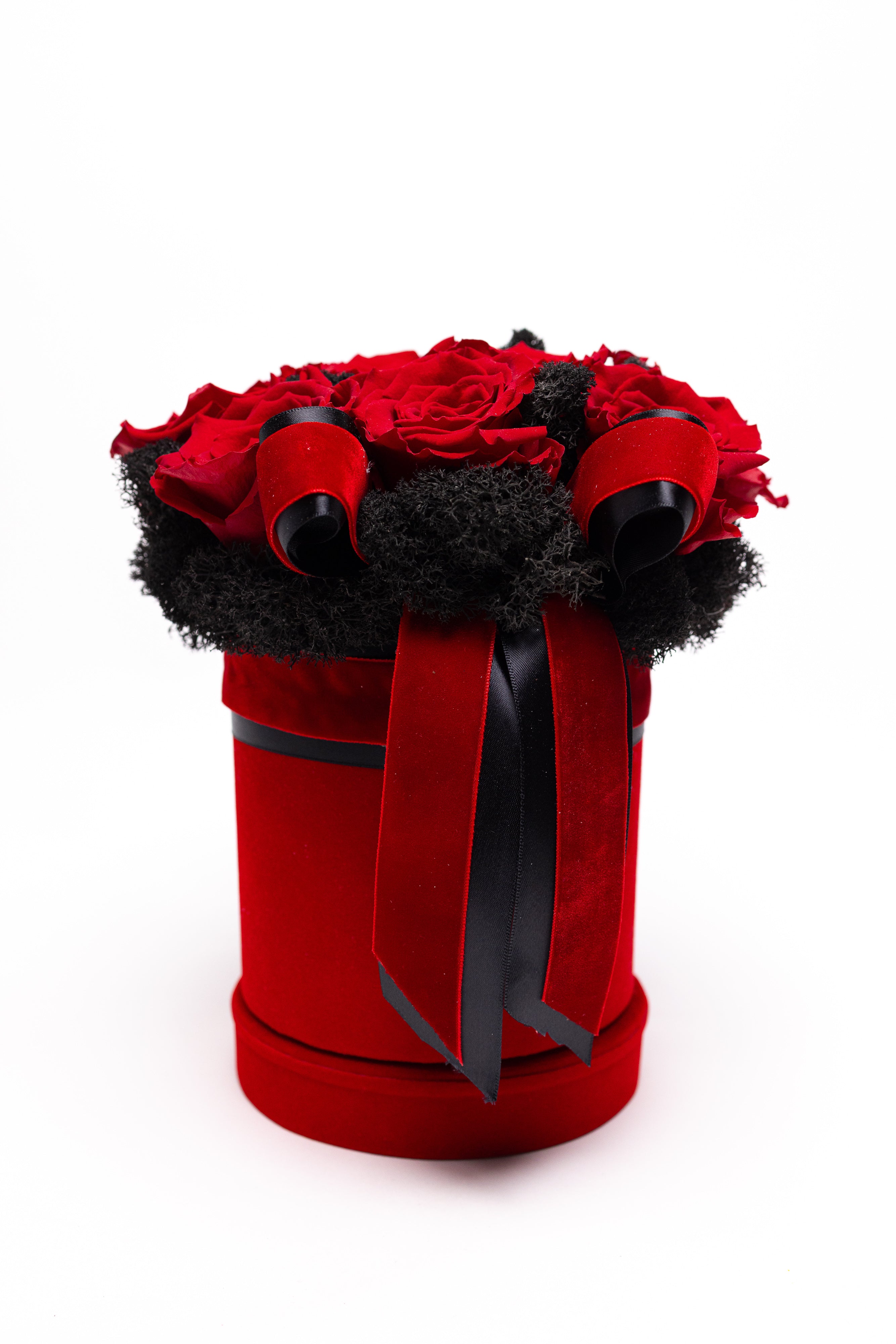 Cutie rotundă din catifea roșie, ce găzduiește 11 trandafiri criogenați roșii vibranți, așezați pe un pat contrastant de mușchi natural negru. Aranjamentul este finisat cu o fundă dublă din catifea în nuanțe de negru și roșu, oferind o notă de eleganță supremă. Un cadou etern, simbol al pasiunii.