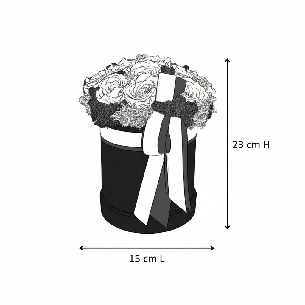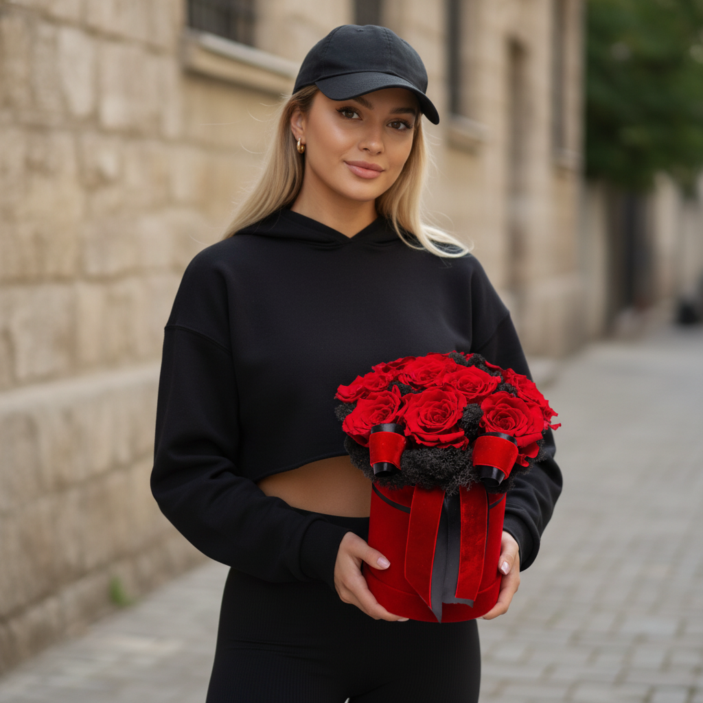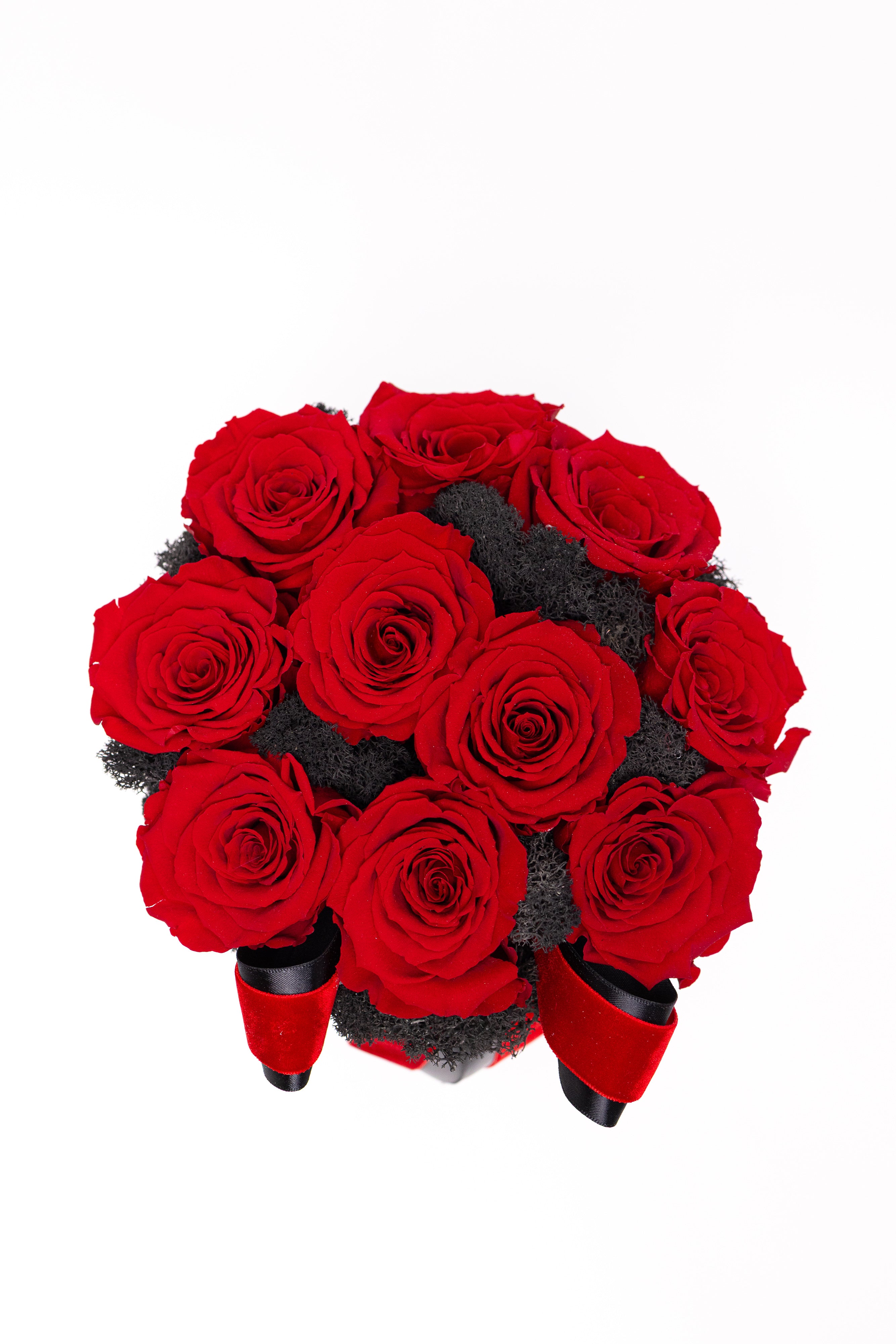 Cutie rotundă din catifea roșie, ce găzduiește 11 trandafiri criogenați roșii vibranți, așezați pe un pat contrastant de mușchi natural negru. Aranjamentul este finisat cu o fundă dublă din catifea în nuanțe de negru și roșu, oferind o notă de eleganță supremă. Un cadou etern, simbol al pasiunii.