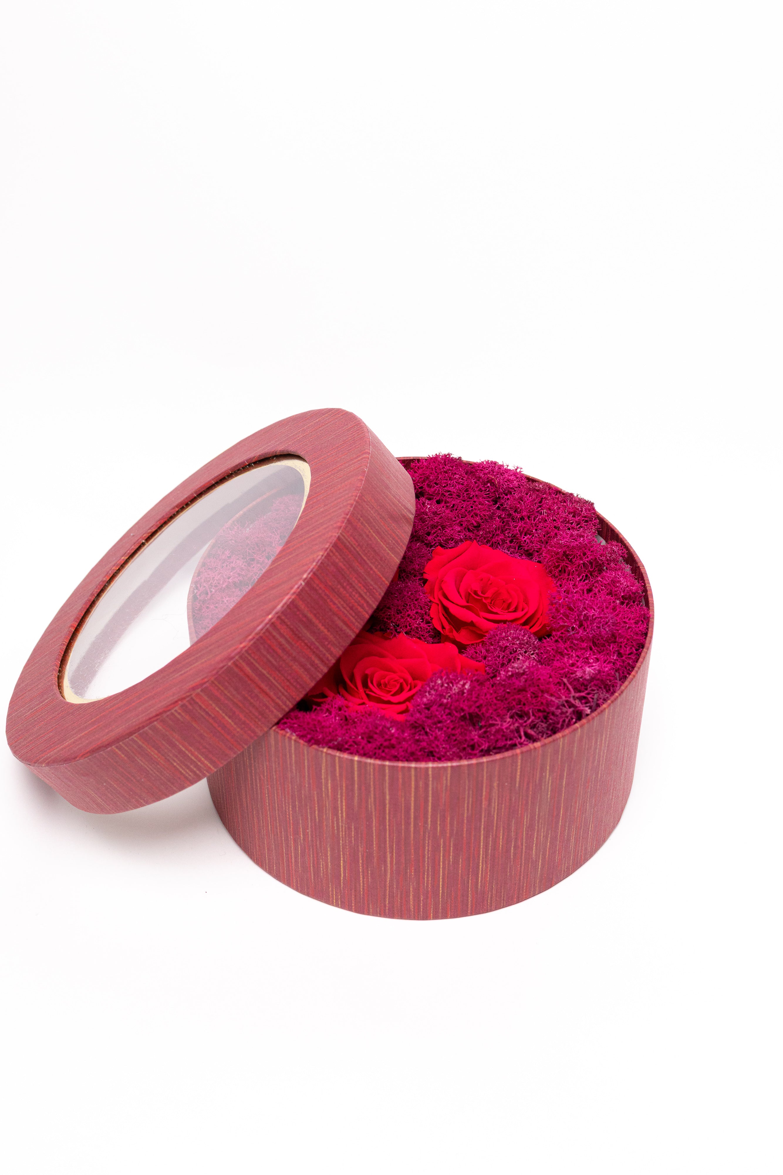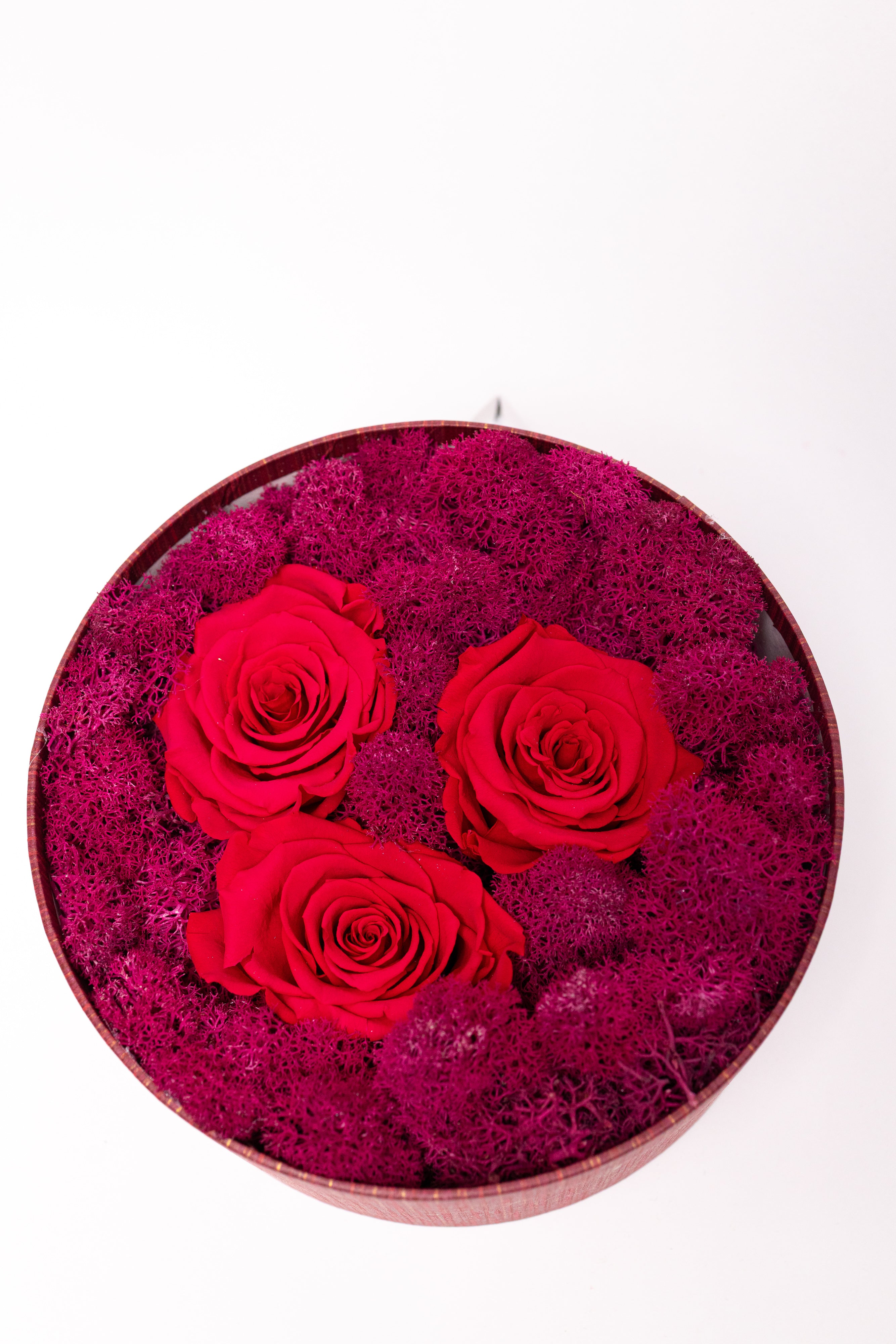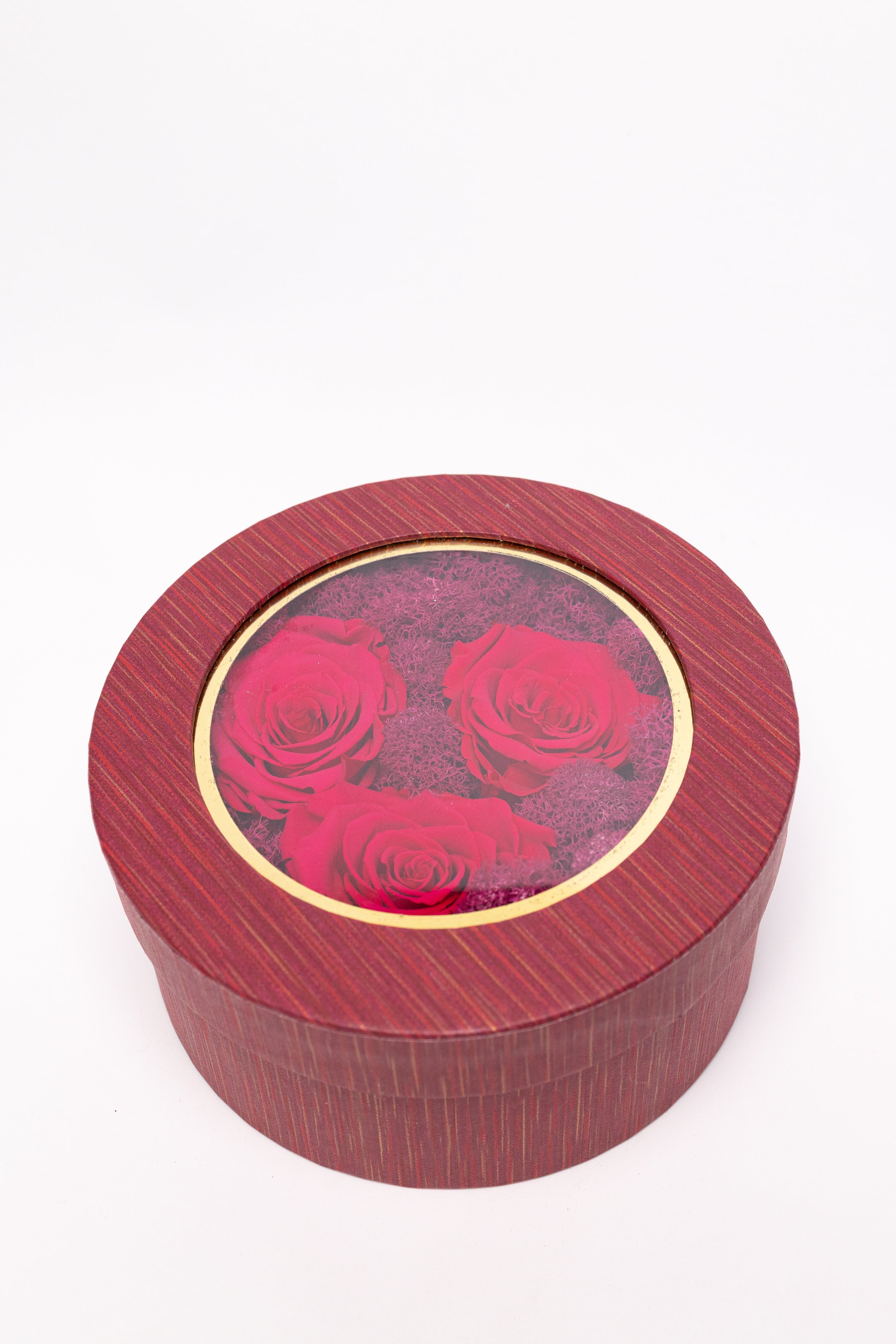 Cutie rotundă texturată, de culoare bordo, prevăzută cu un capac cu fereastră transparentă ce permite vizualizarea conținutului. Interiorul dezvăluie 3 trandafiri criogenați roșii, așezați elegant pe un pat vibrant de mușchi natural magenta. Un cadou rafinat, compact și etern, ideal pentru a surprinde persoana iubită.