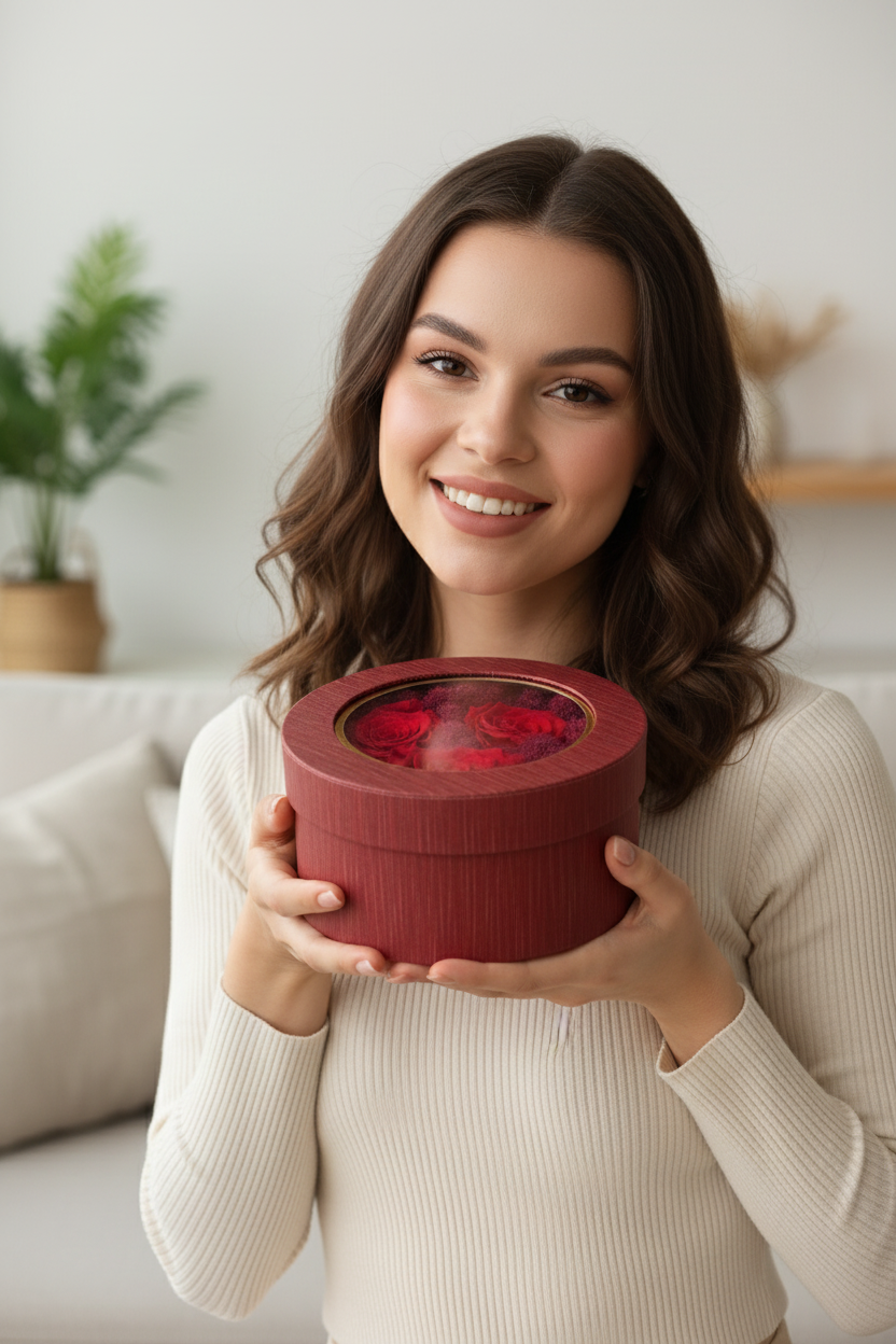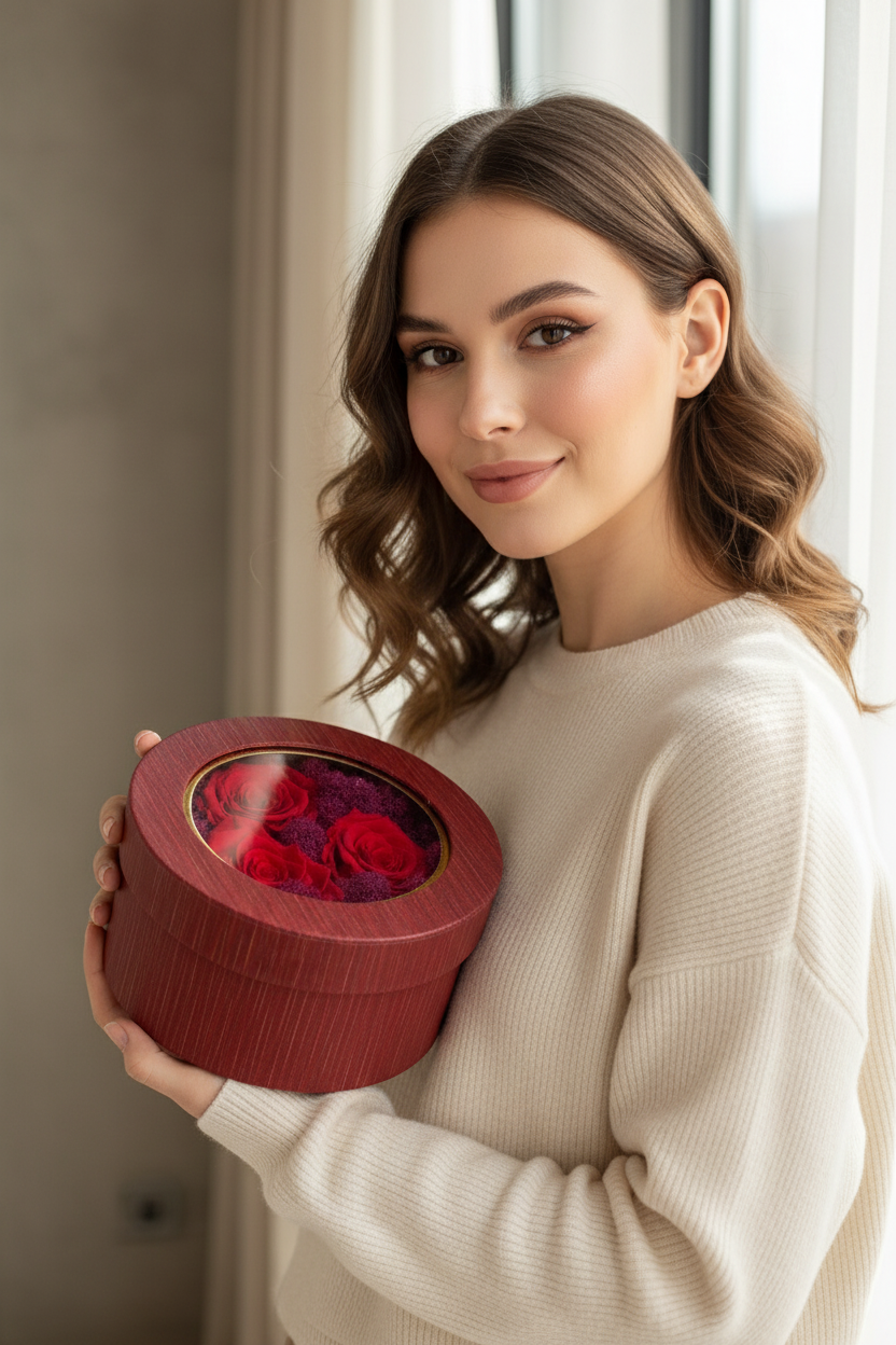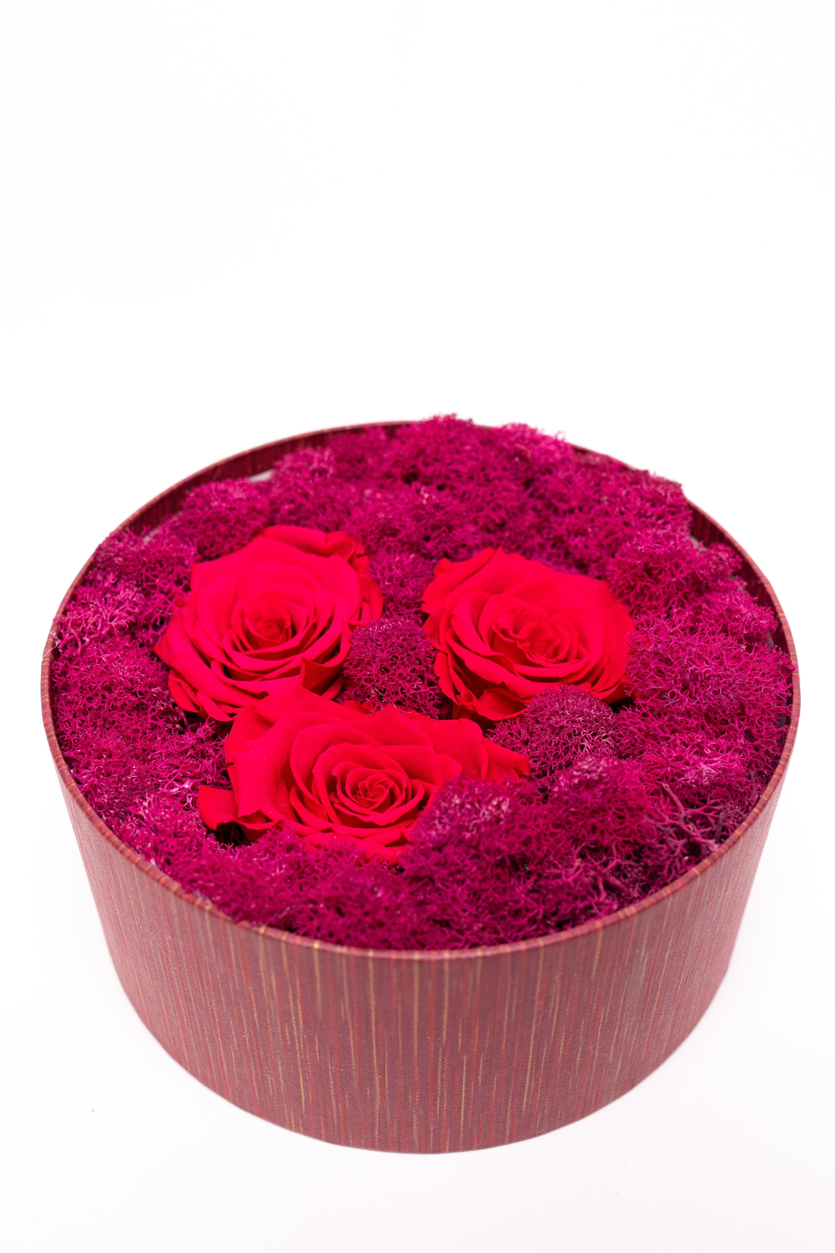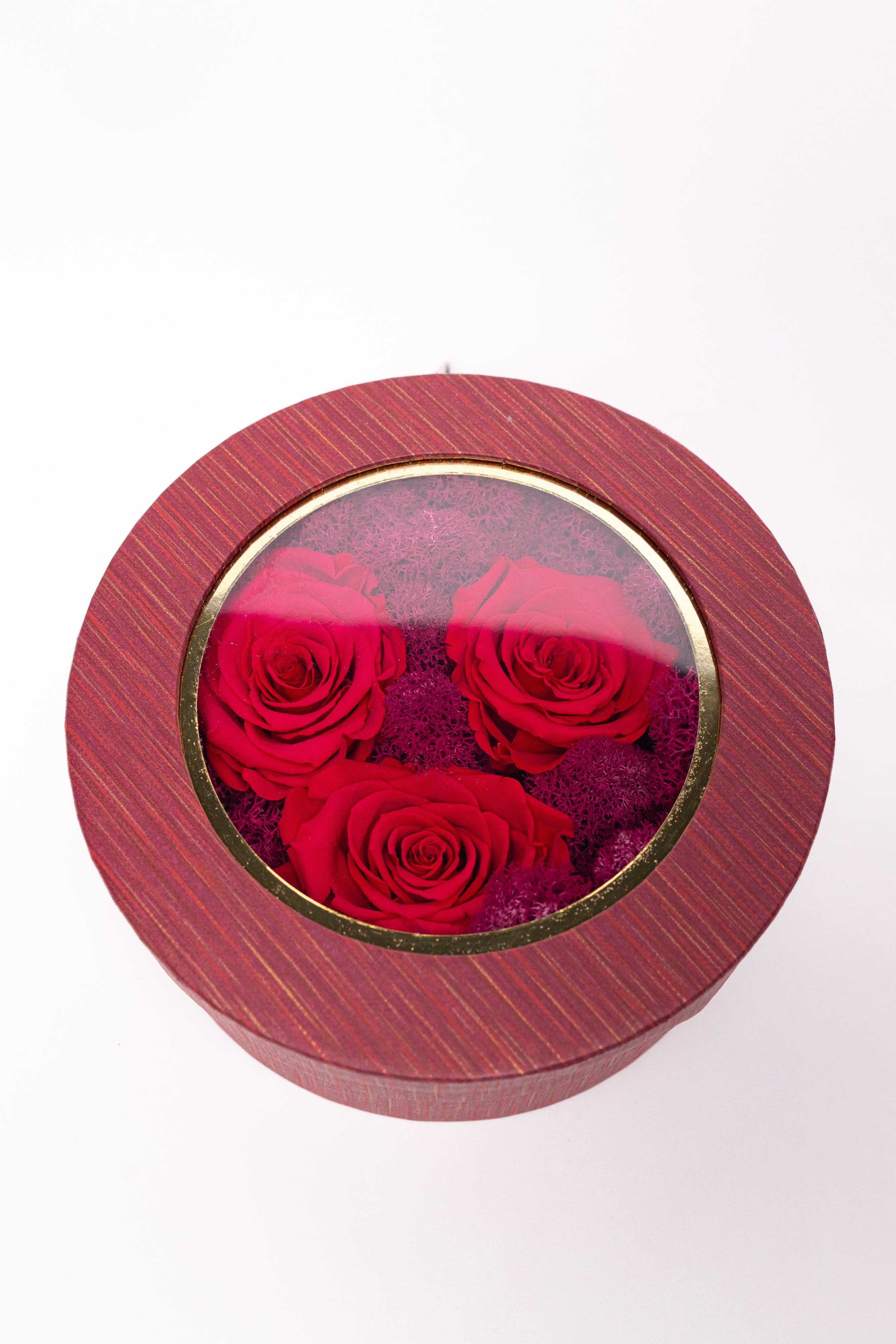 Cutie rotundă texturată, de culoare bordo, prevăzută cu un capac cu fereastră transparentă ce permite vizualizarea conținutului. Interiorul dezvăluie 3 trandafiri criogenați roșii, așezați elegant pe un pat vibrant de mușchi natural magenta. Un cadou rafinat, compact și etern, ideal pentru a surprinde persoana iubită.