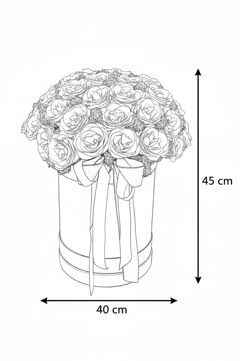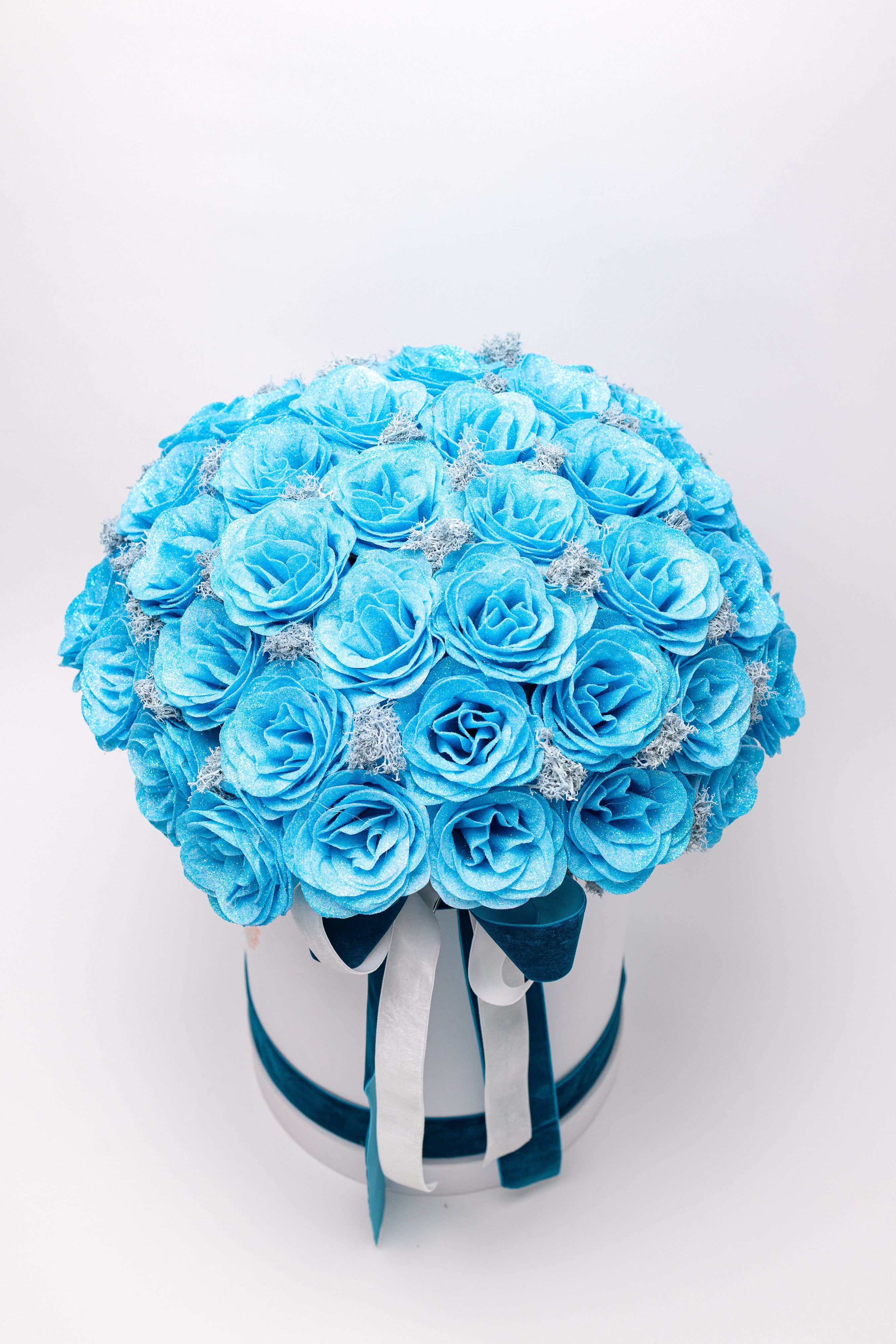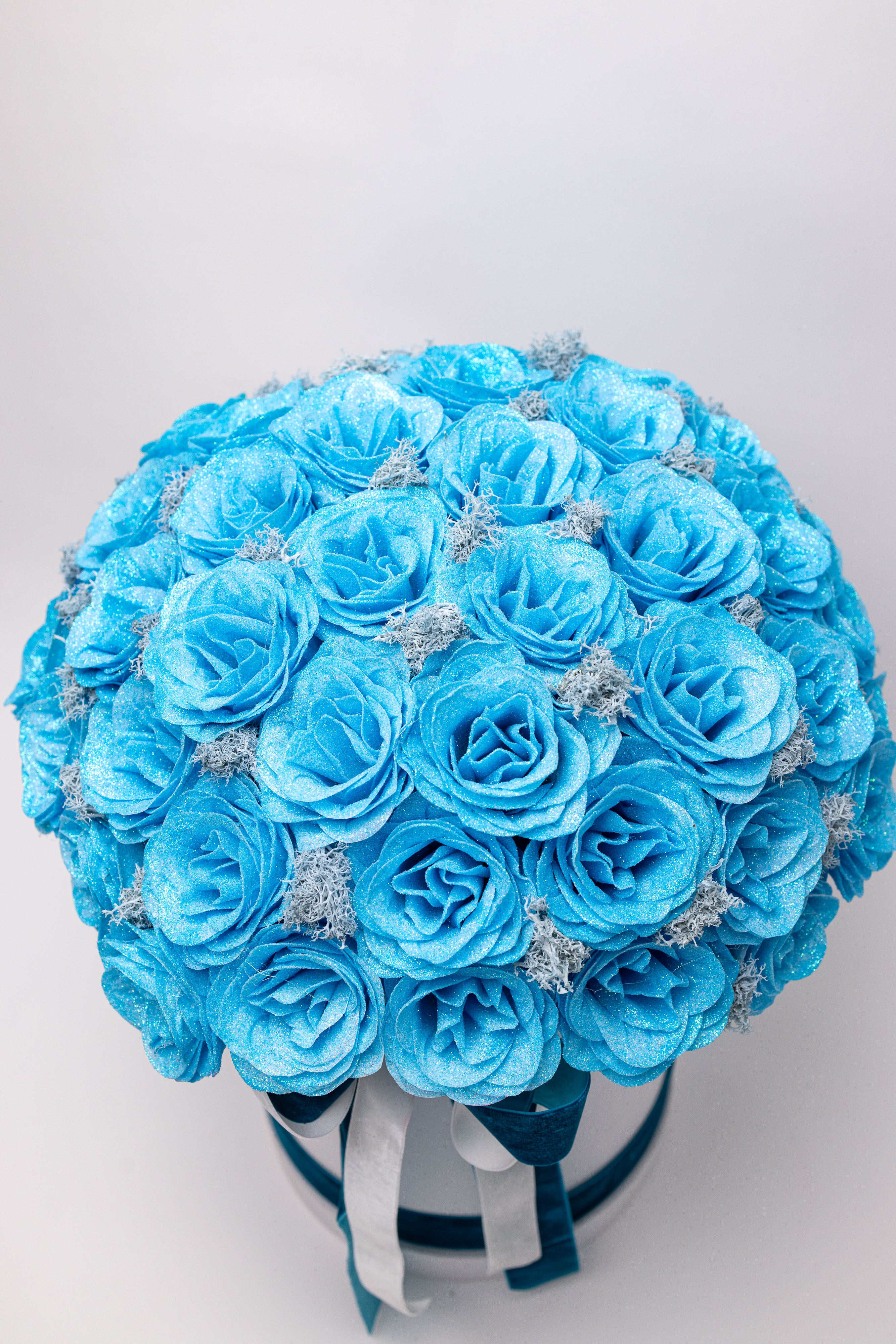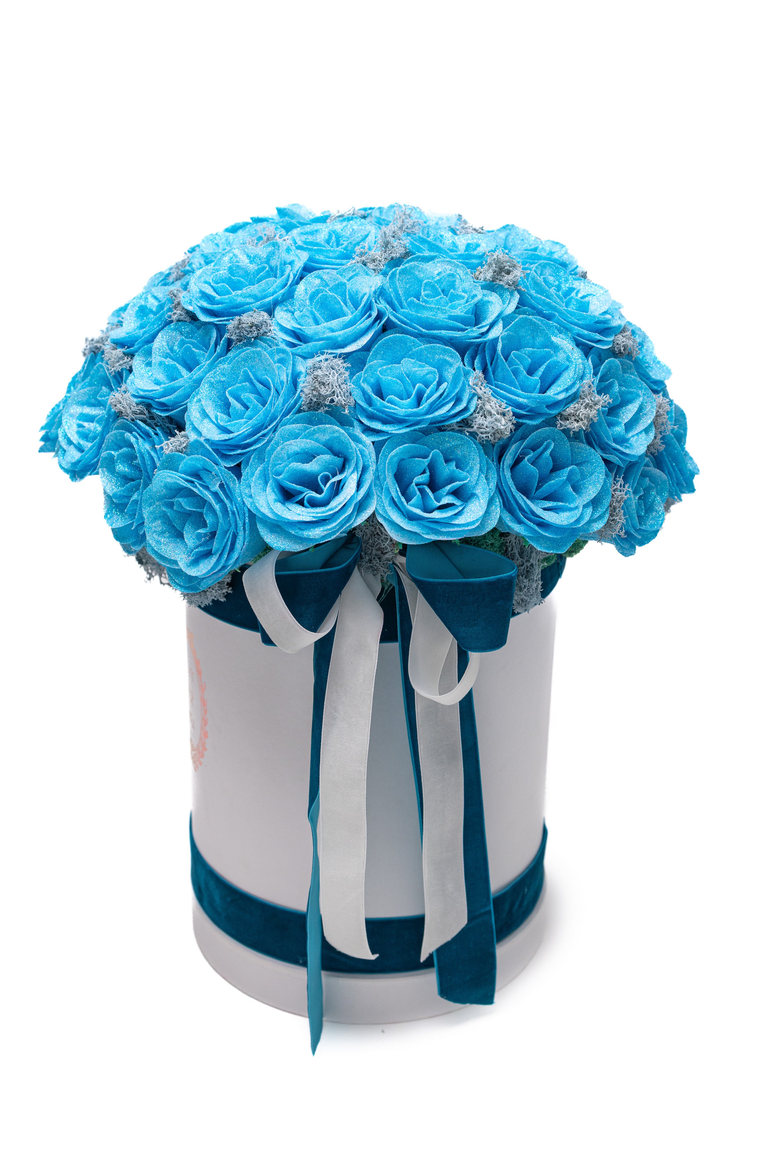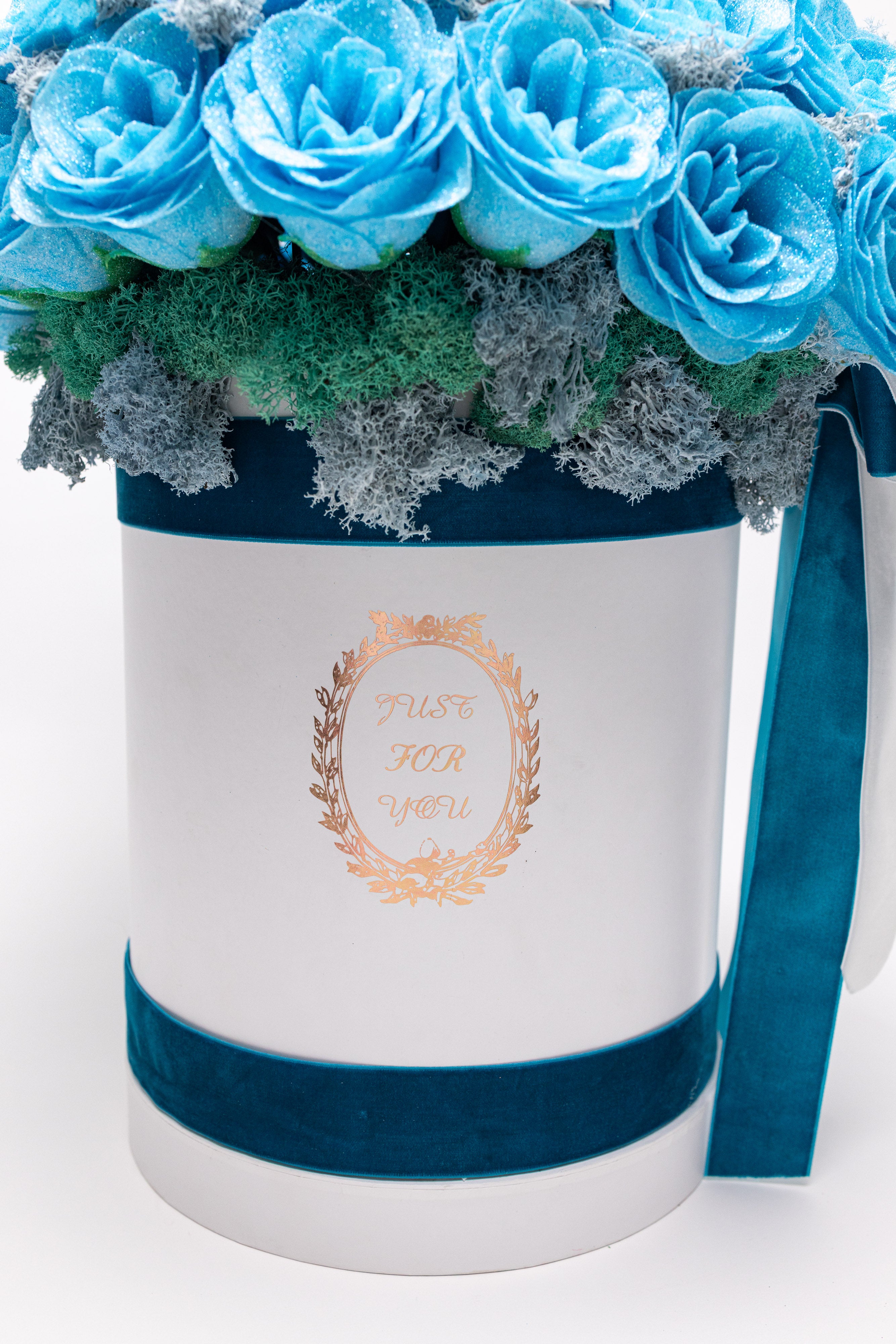 O piesă centrală vibrantă, care aduce prospețimea oceanului în orice încăpere. Cutia rotundă, de un alb imaculat, este accesorizată elegant cu benzi din catifea de culoare albastru-petrol (turcoaz închis) și o fundă amplă, dublă, în nuanțe de alb și turcoaz. Aranjamentul voluminos cuprinde 51 de trandafiri imperiali de săpun într-o nuanță electrică de bleu-turcoaz, cu finisaj glitter. Florile sunt evidențiate de inserții de mușchi natural (licheni) de culoare gri-argintiu, completând perfect cromatica rece și sofisticată.