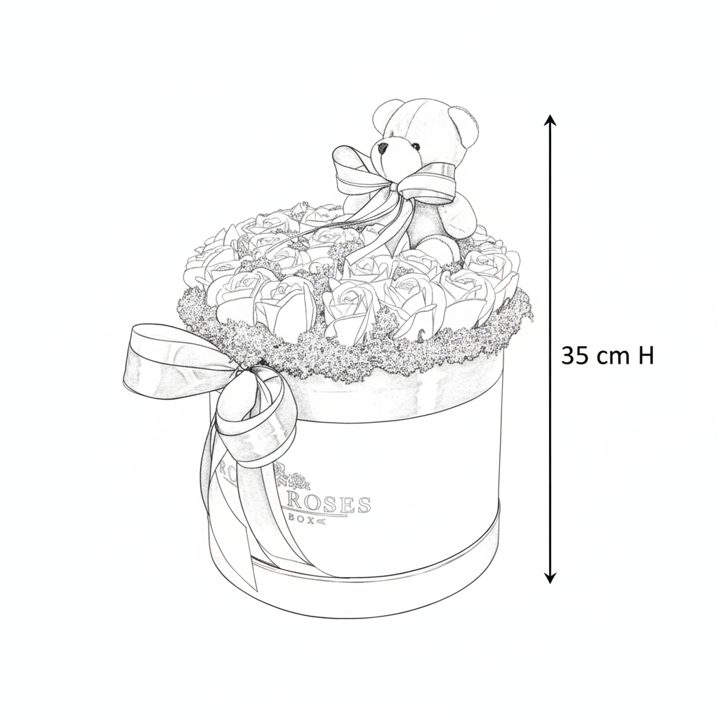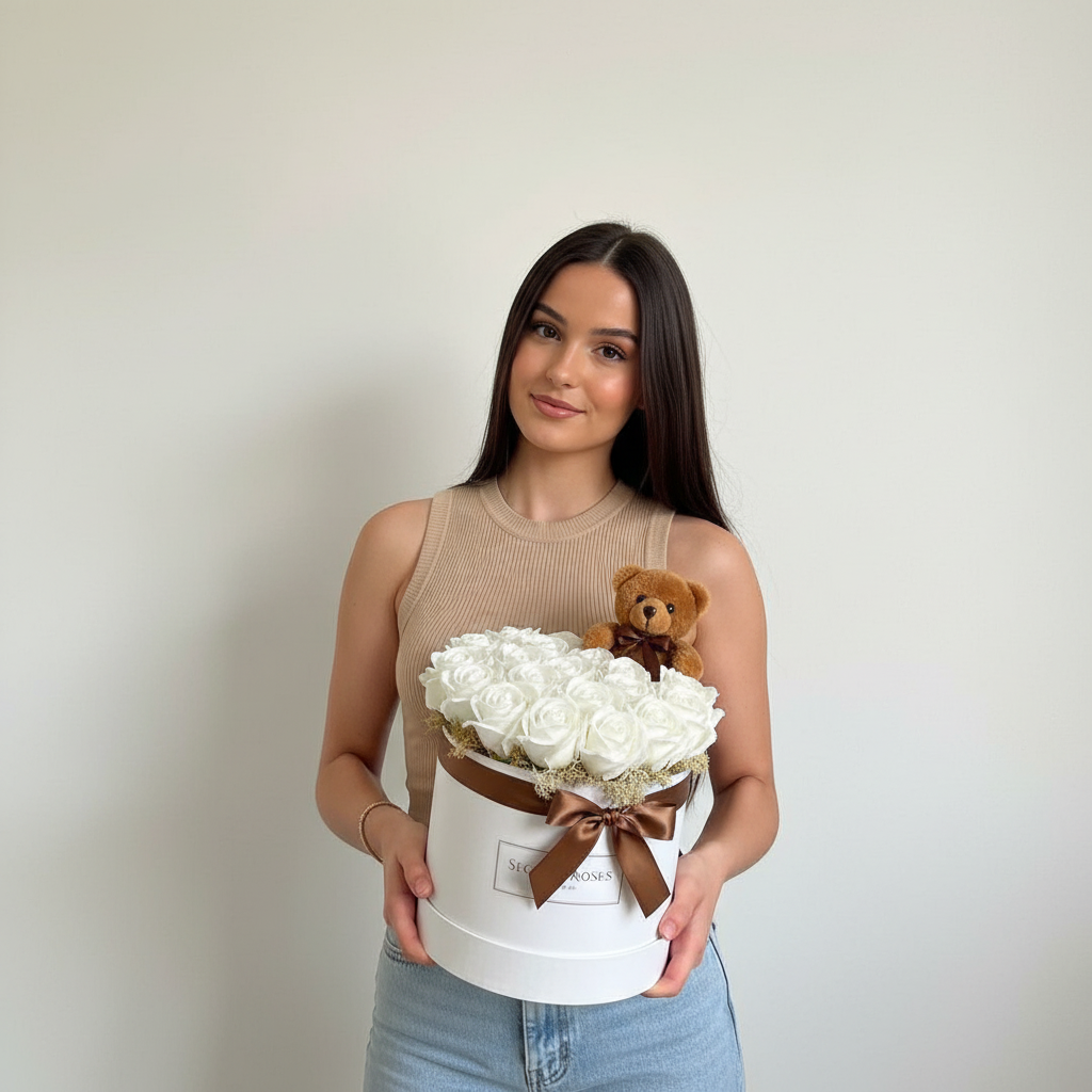 Cutie albă elegantă cu 39 trandafiri de săpun albi imaculați și mușchi natural. Include un ursuleț din catifea premium maro. Un aranjament etern, fin la atingere, cu un parfum delicat și rafinat.