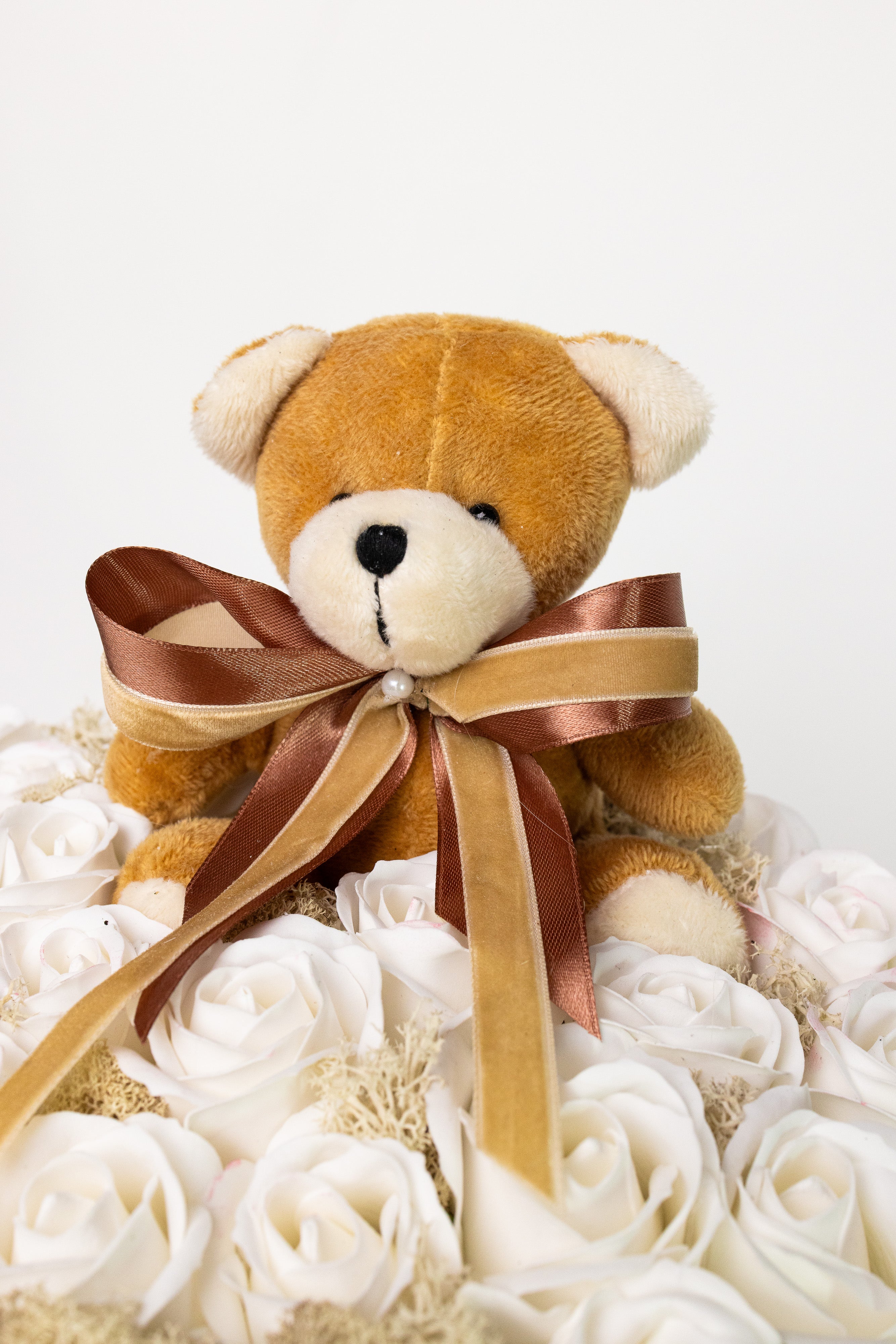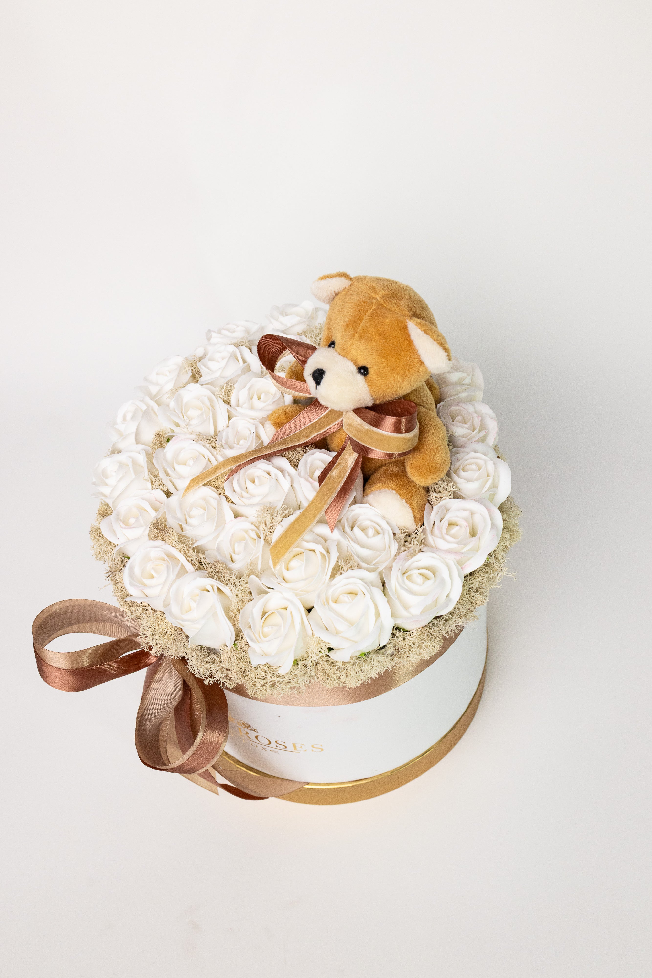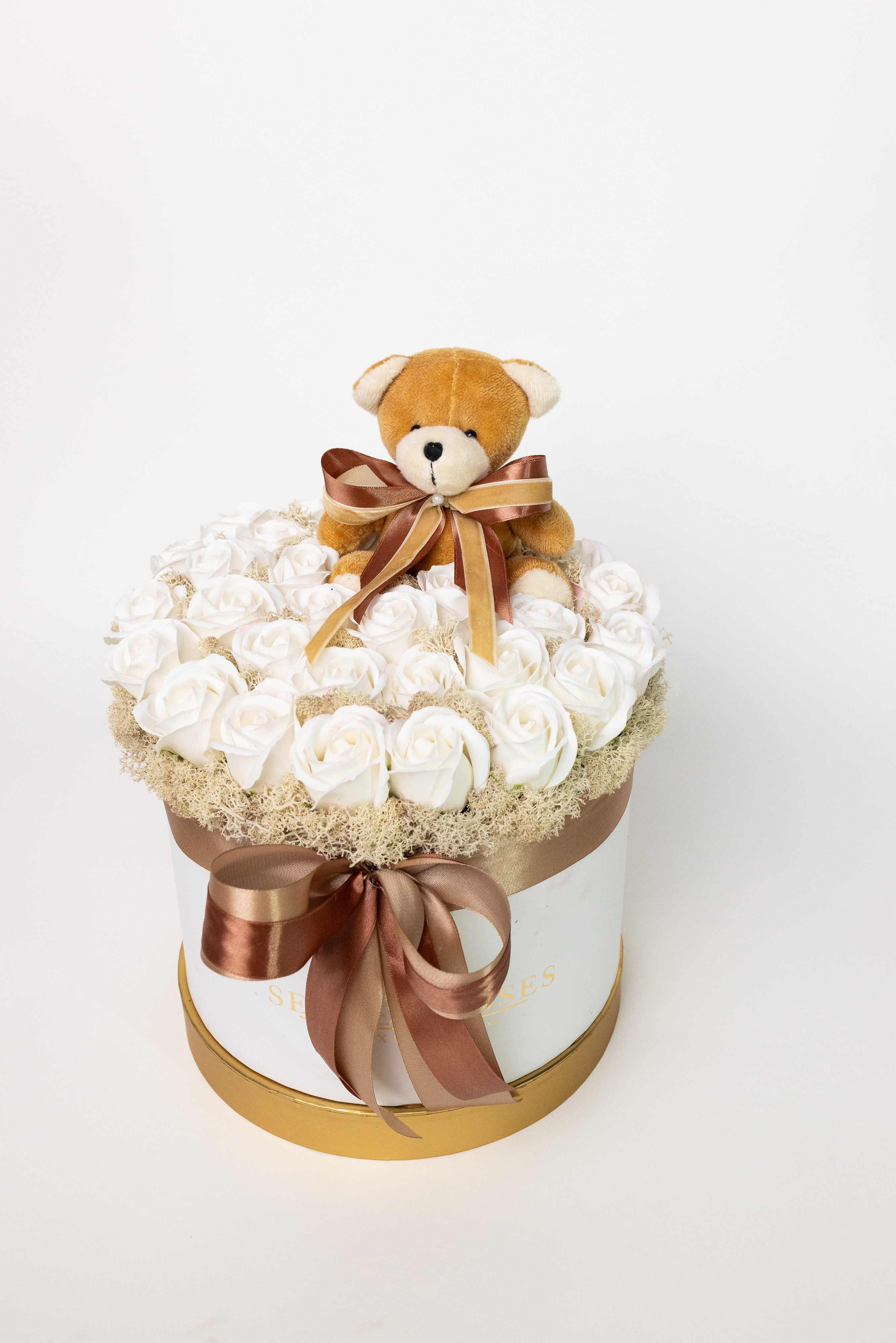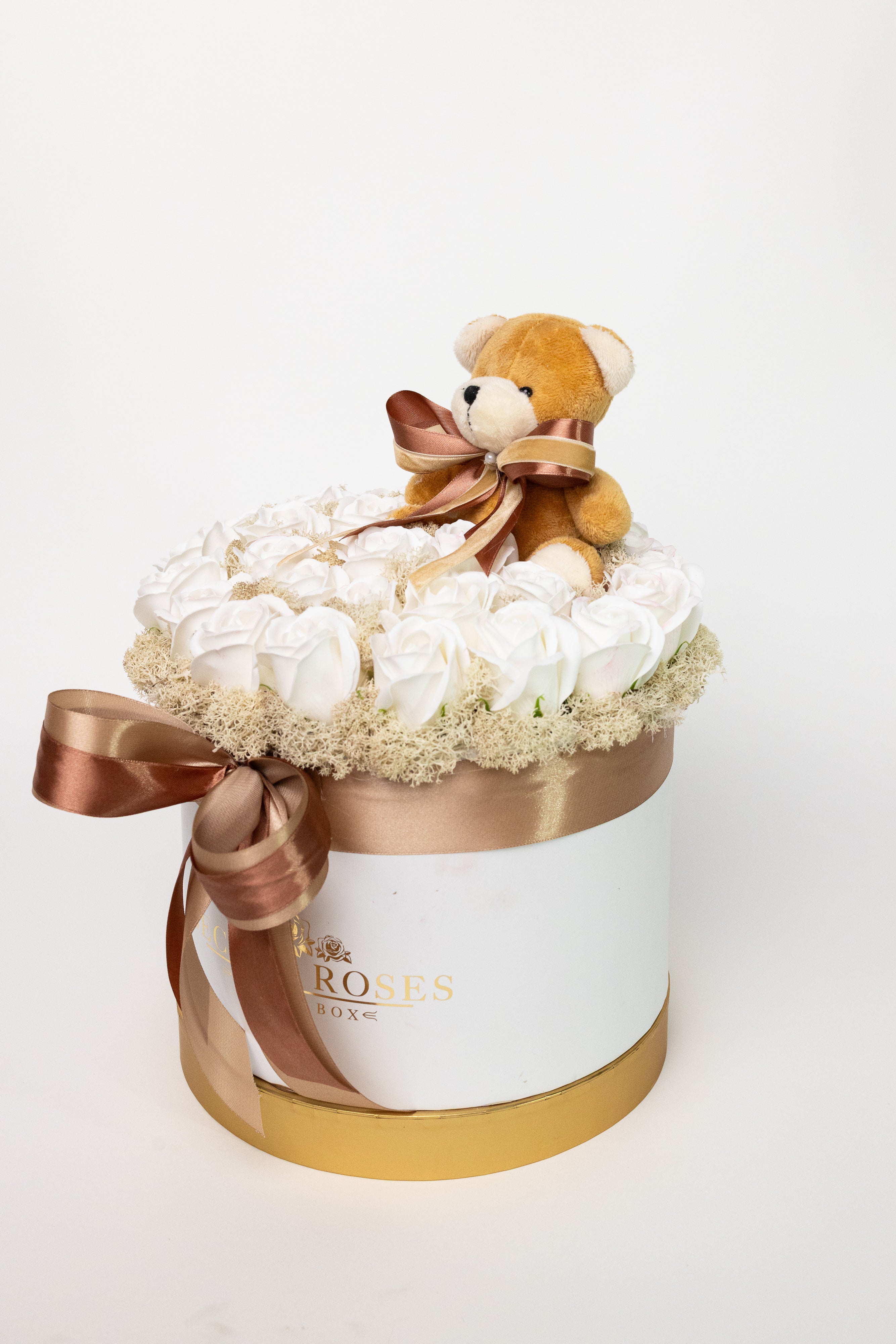 Aranjament Lux Trandafiri Săpun Albi și Ursulet Catifea