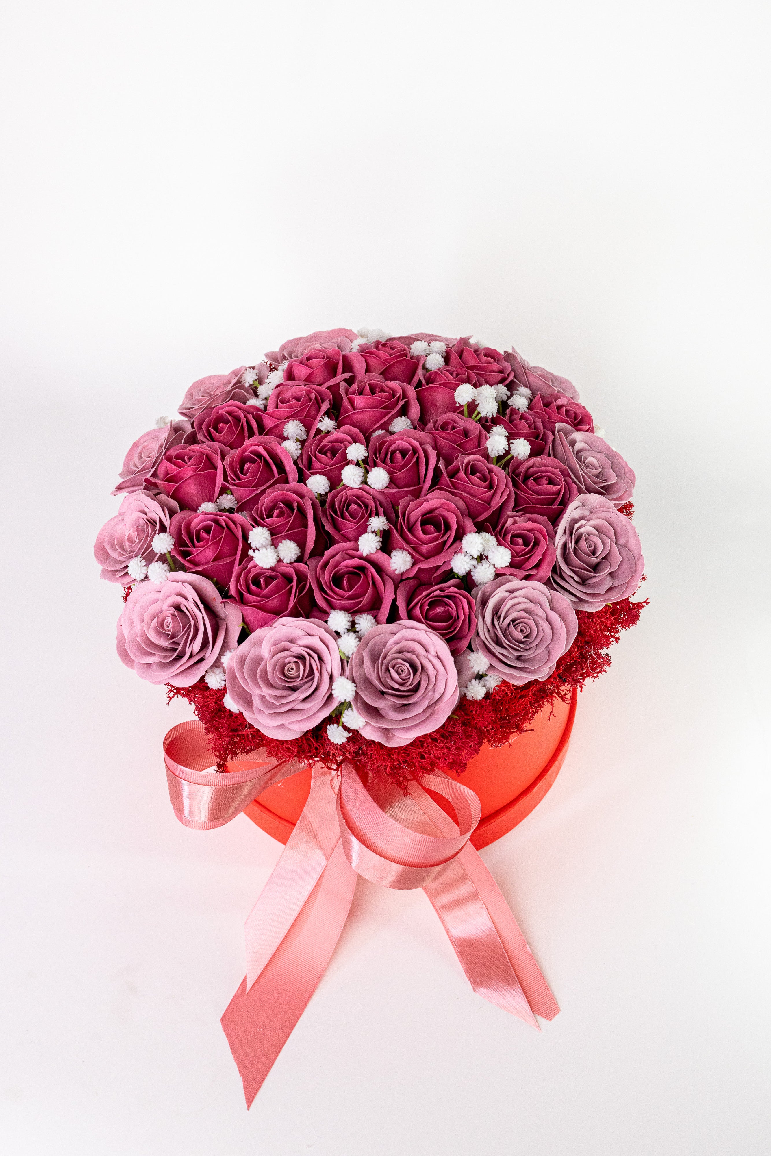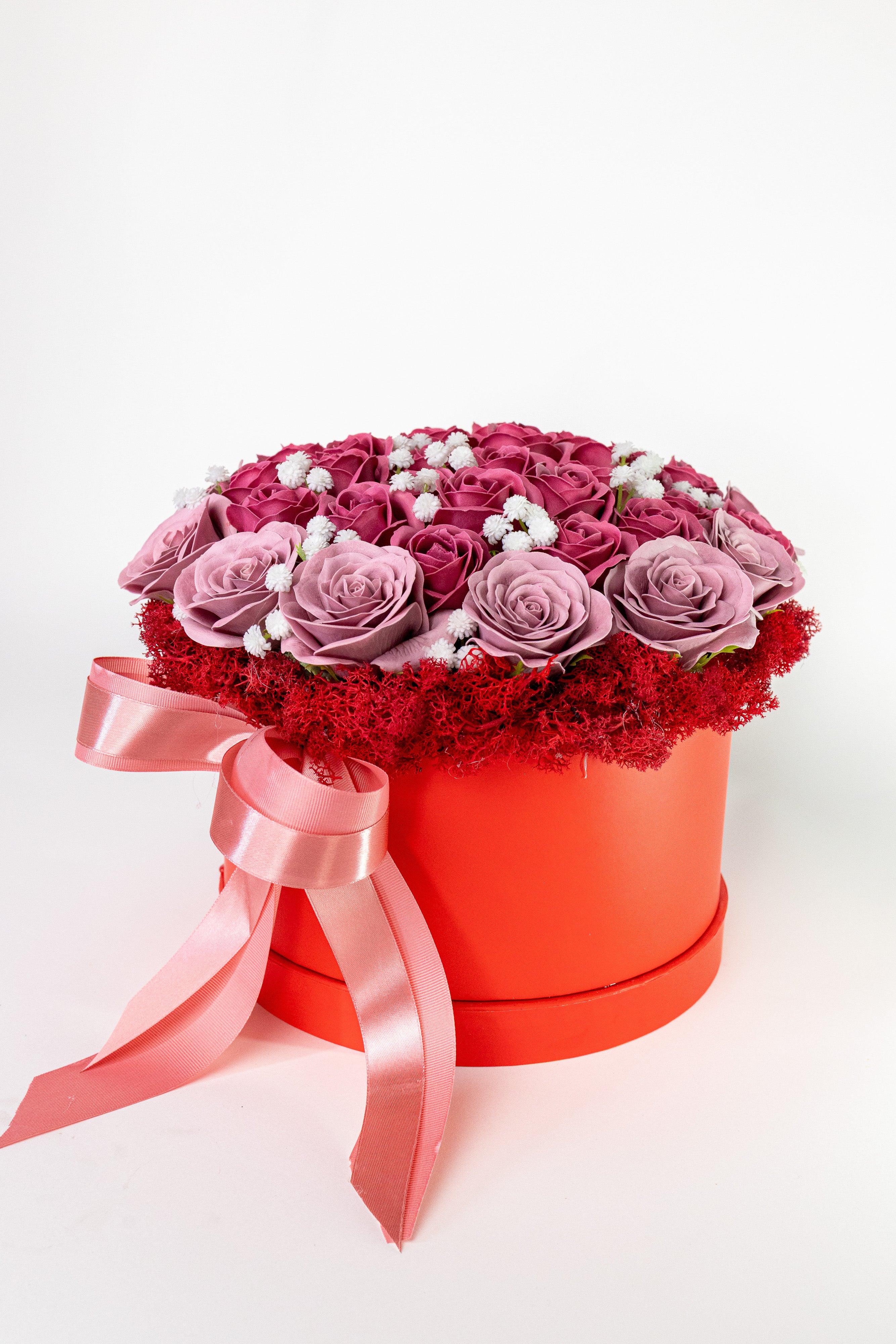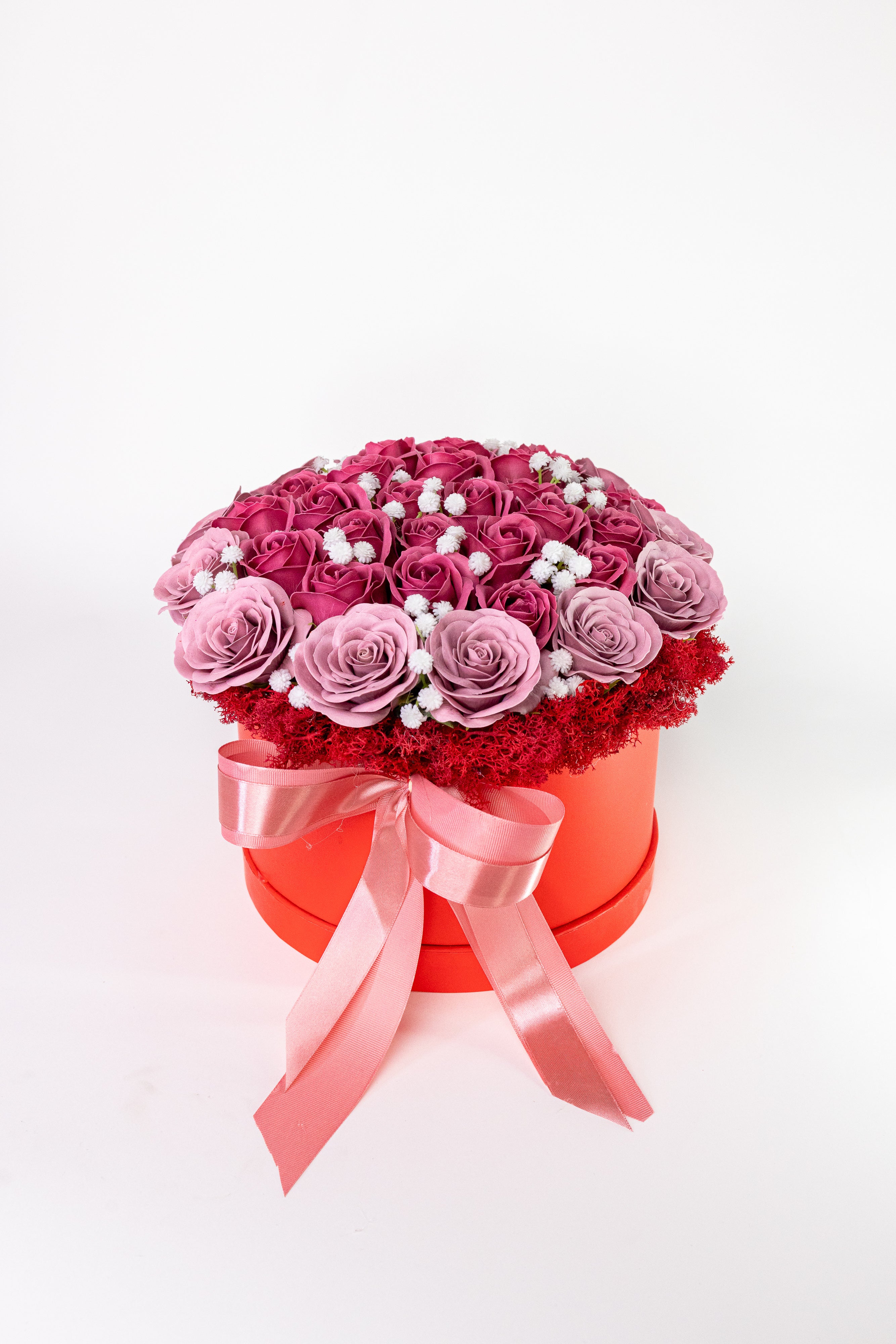 Cutie rotundă roșie elegantă cu trandafiri de săpun în nuanțe de magenta și roz prăfuit. Decorat cu mușchi natural roșu, flori albe delicate și o fundă satinată roz. Un cadou vibrant, parfumat și etern.