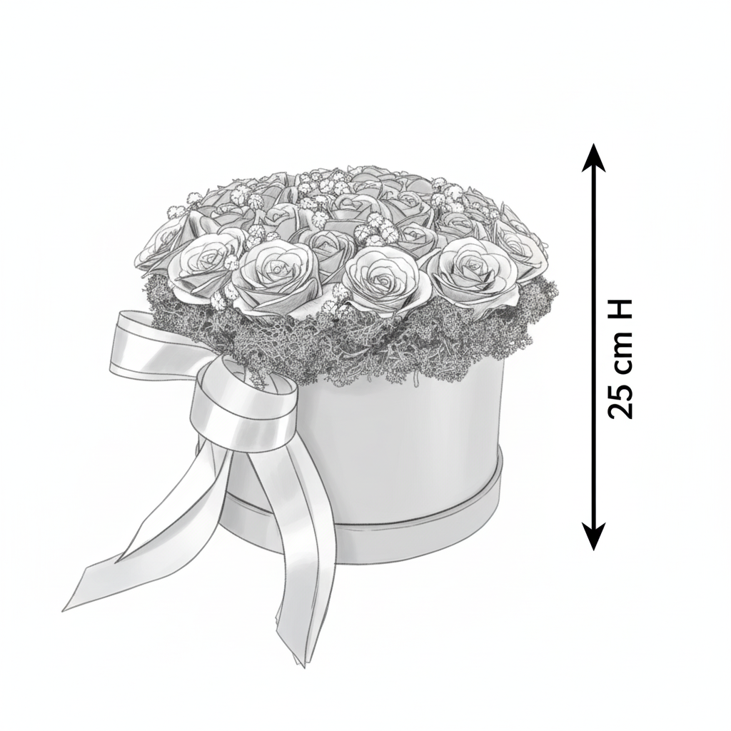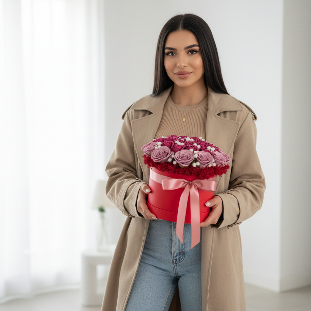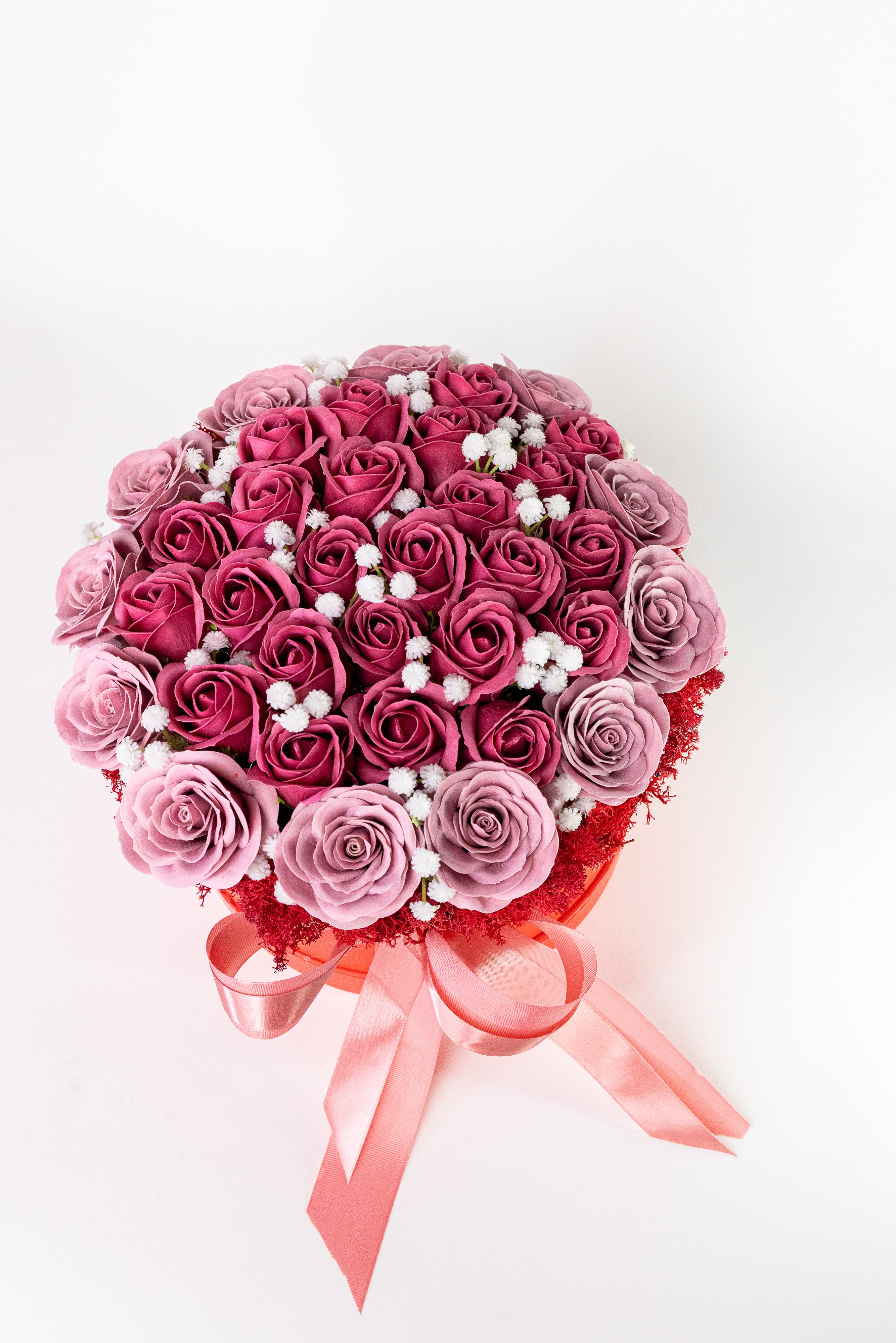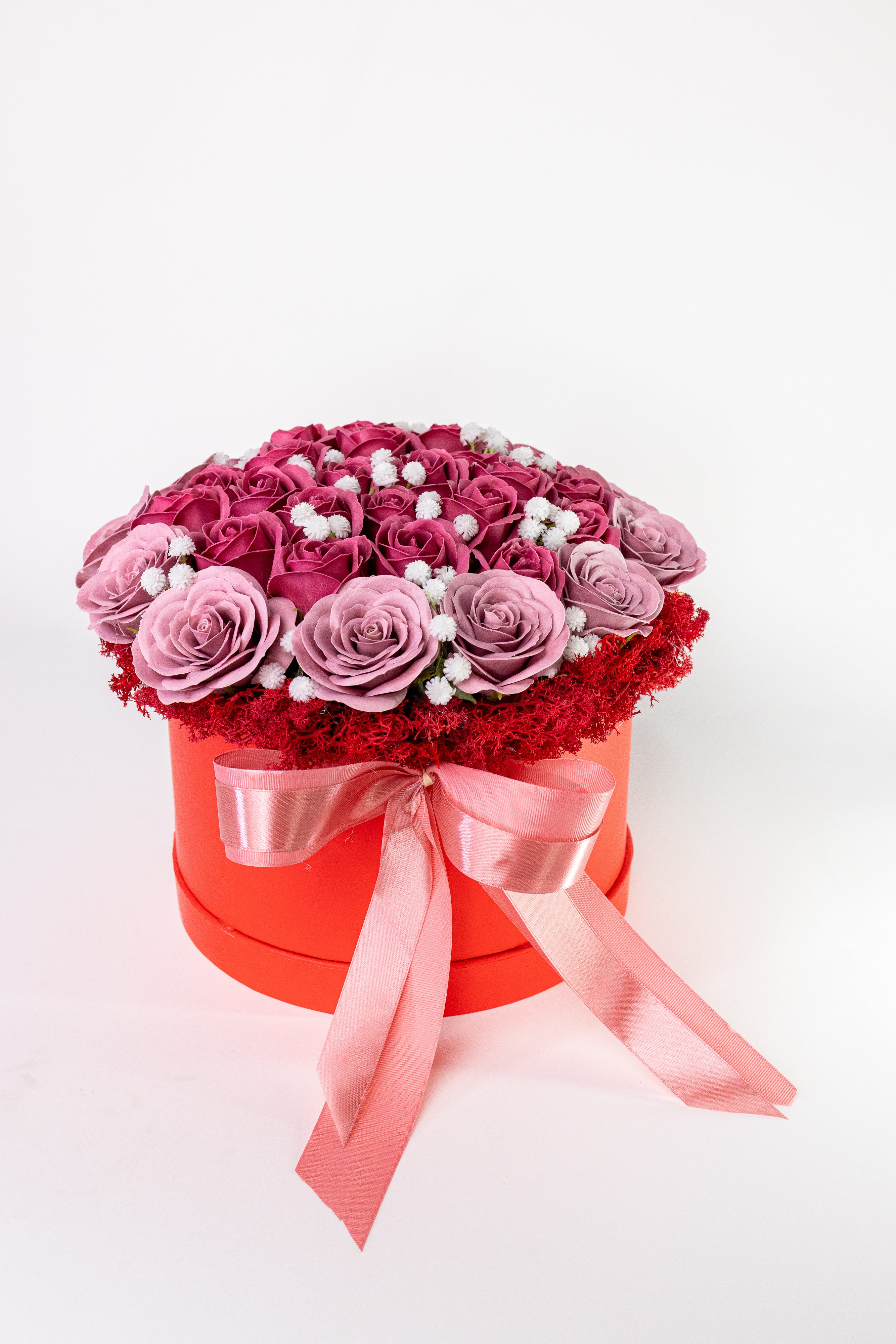 Cutie rotundă roșie elegantă cu trandafiri de săpun în nuanțe de magenta și roz prăfuit. Decorat cu mușchi natural roșu, flori albe delicate și o fundă satinată roz. Un cadou vibrant, parfumat și etern.