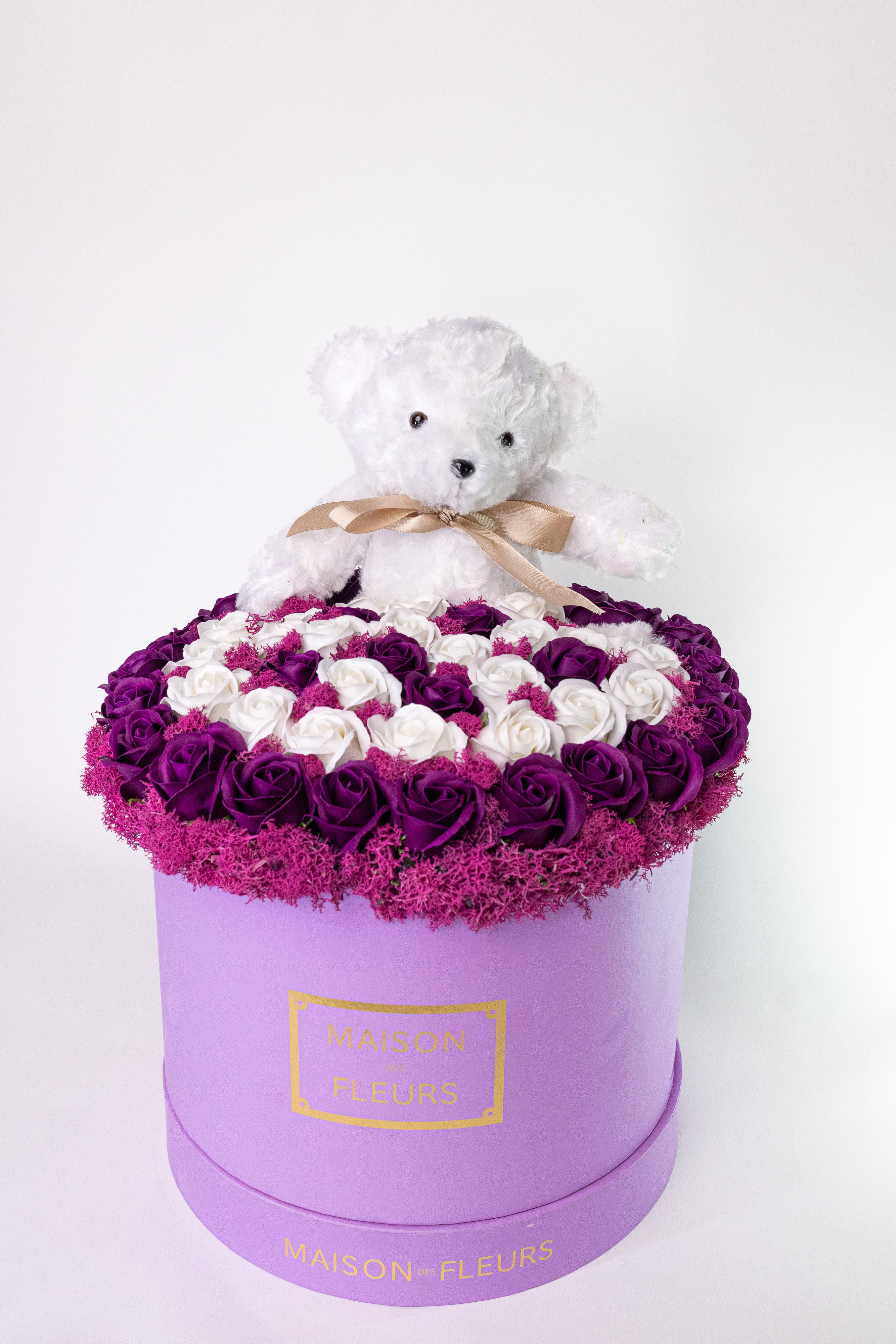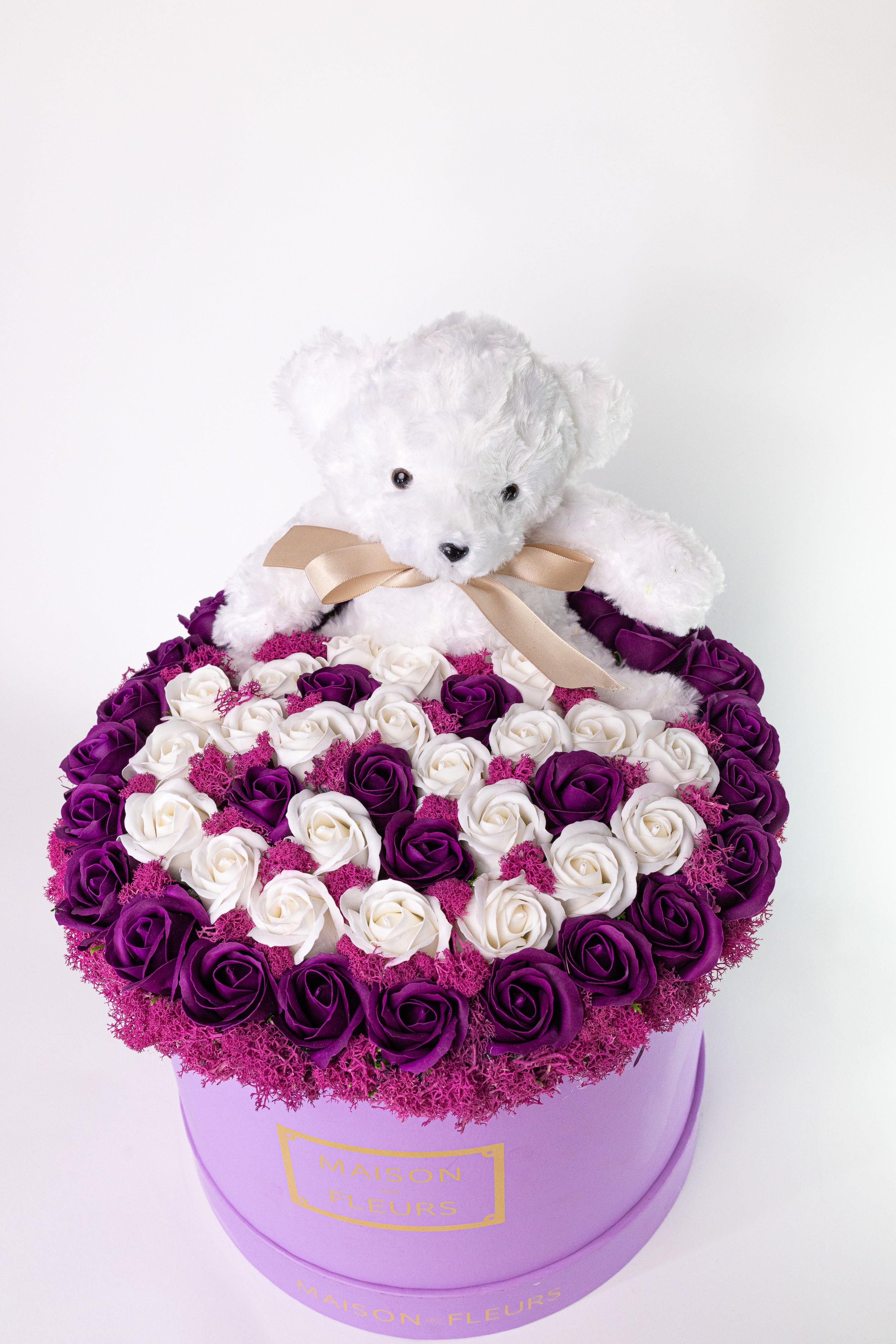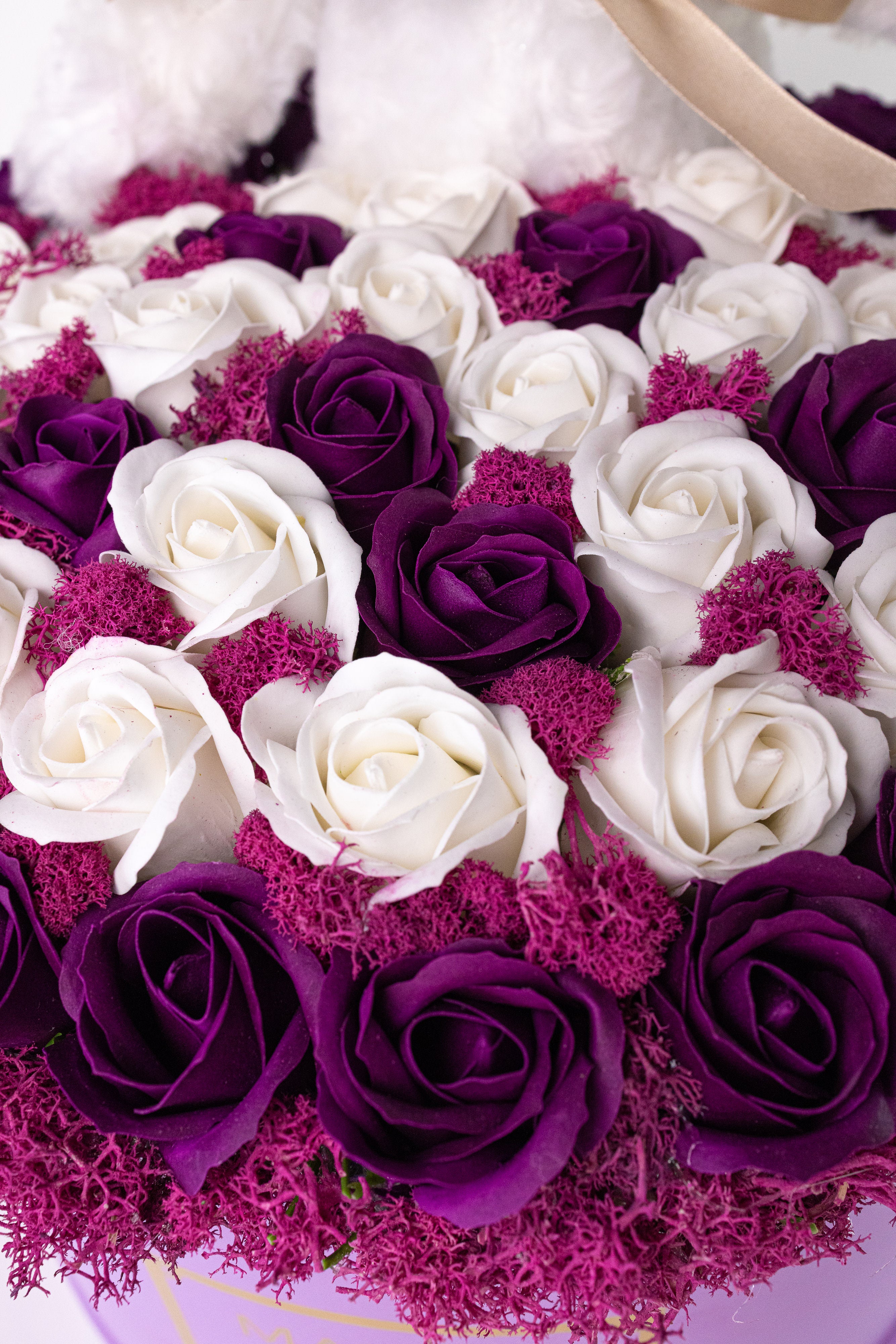 Aranjament Lux Trandafiri Săpun Mov-Alb, Ursulet Pufos