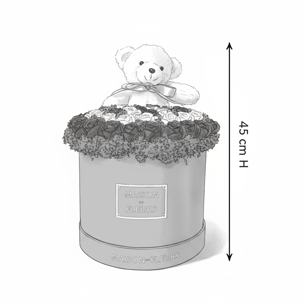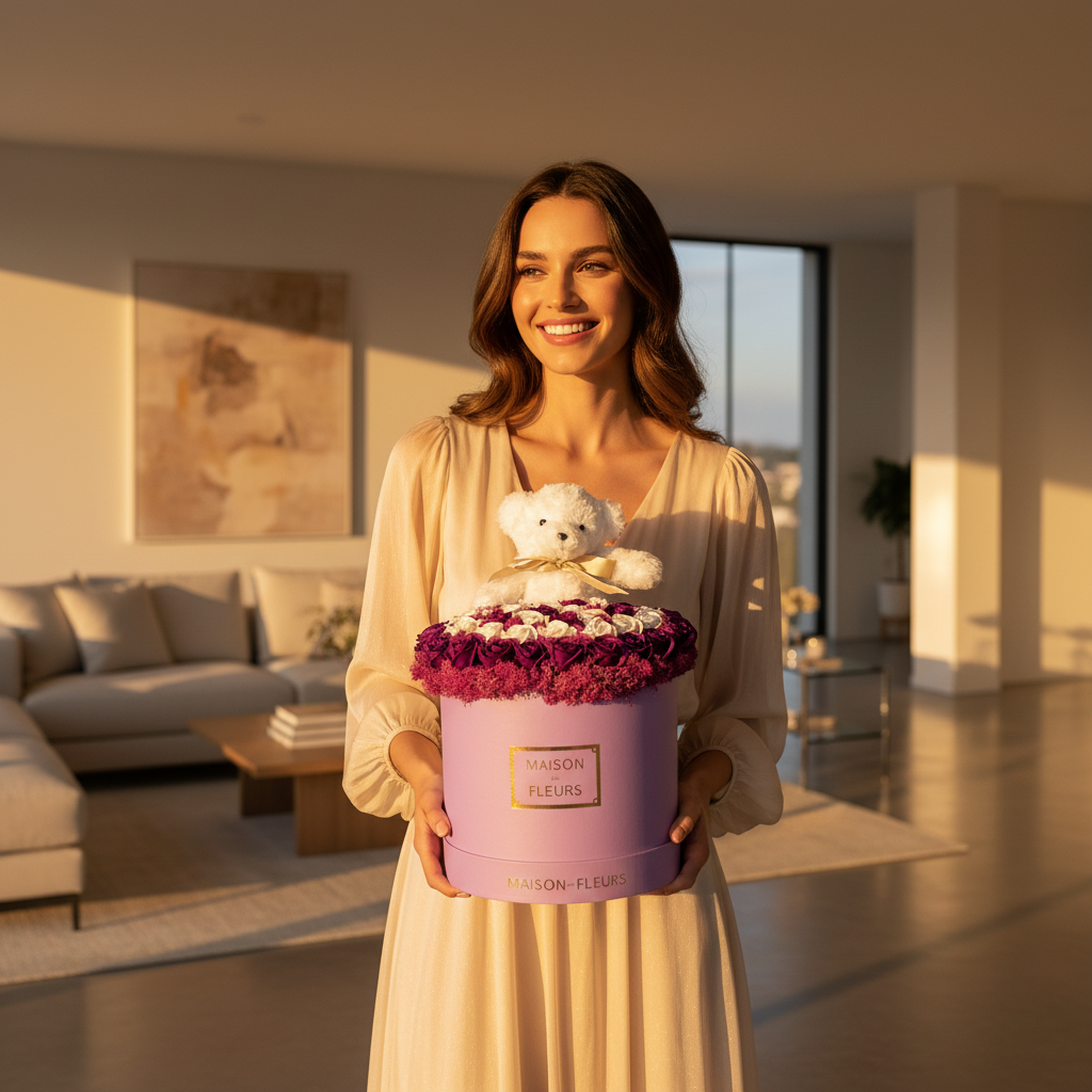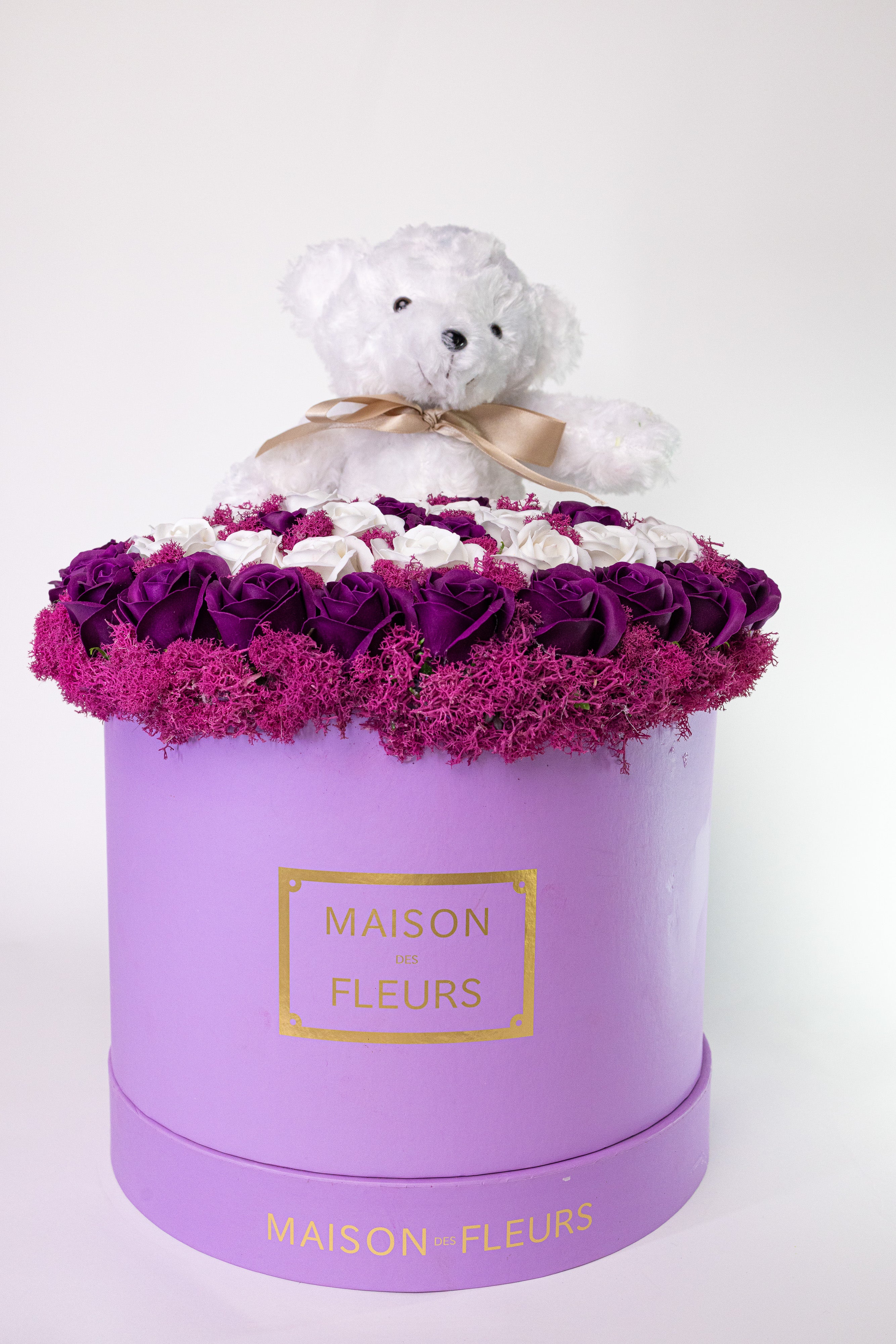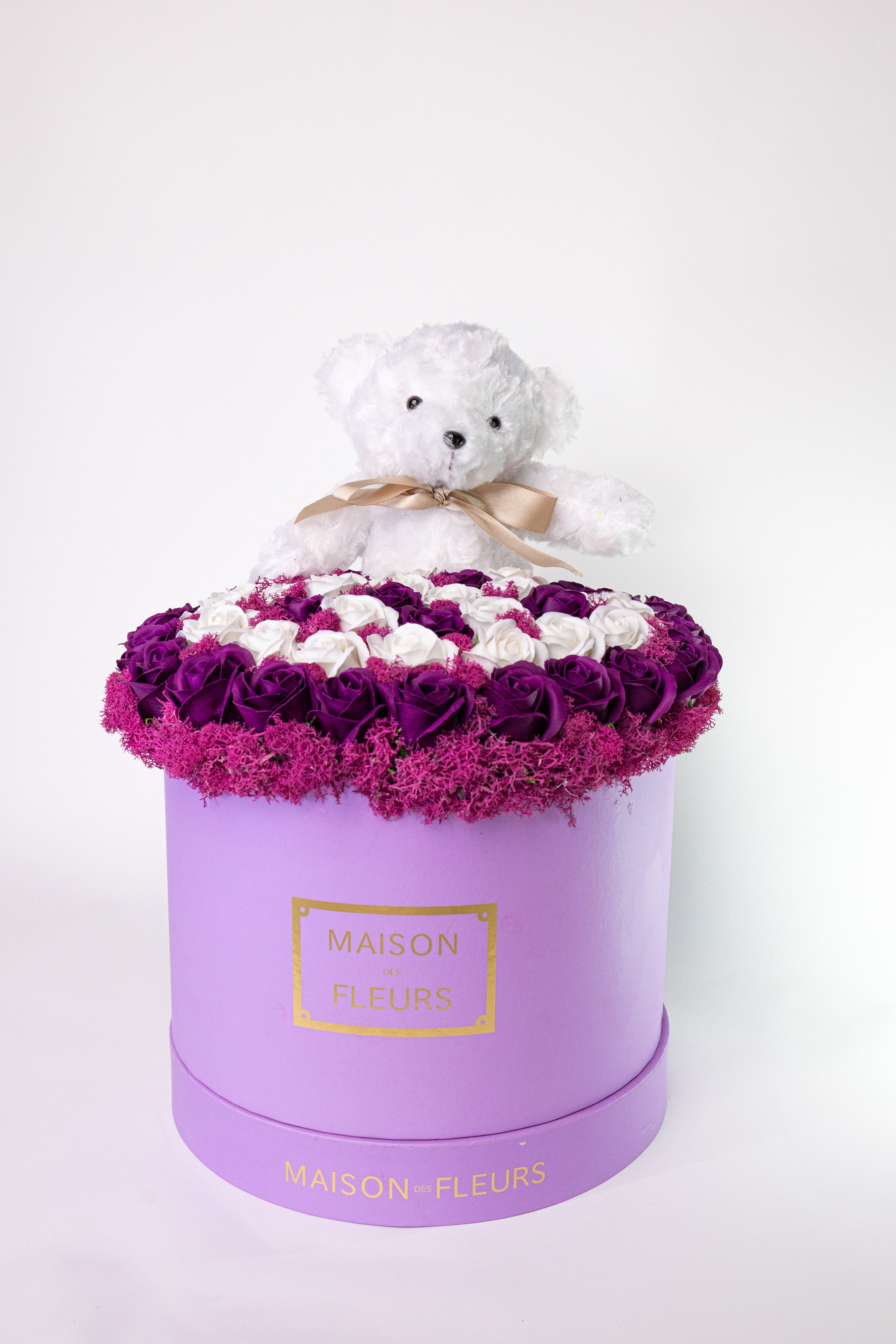 Aranjament Lux Trandafiri Săpun Mov-Alb, Ursulet Pufos