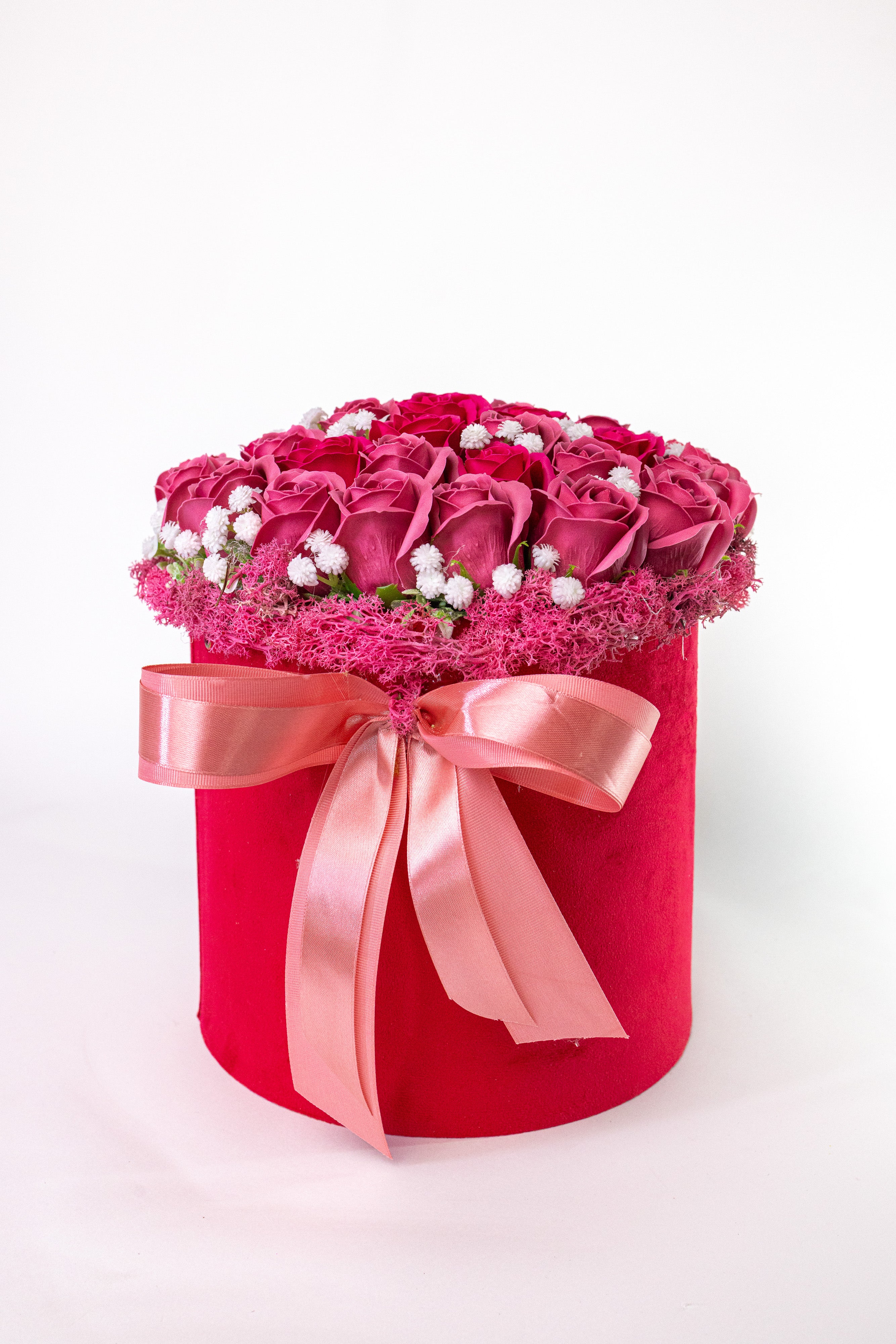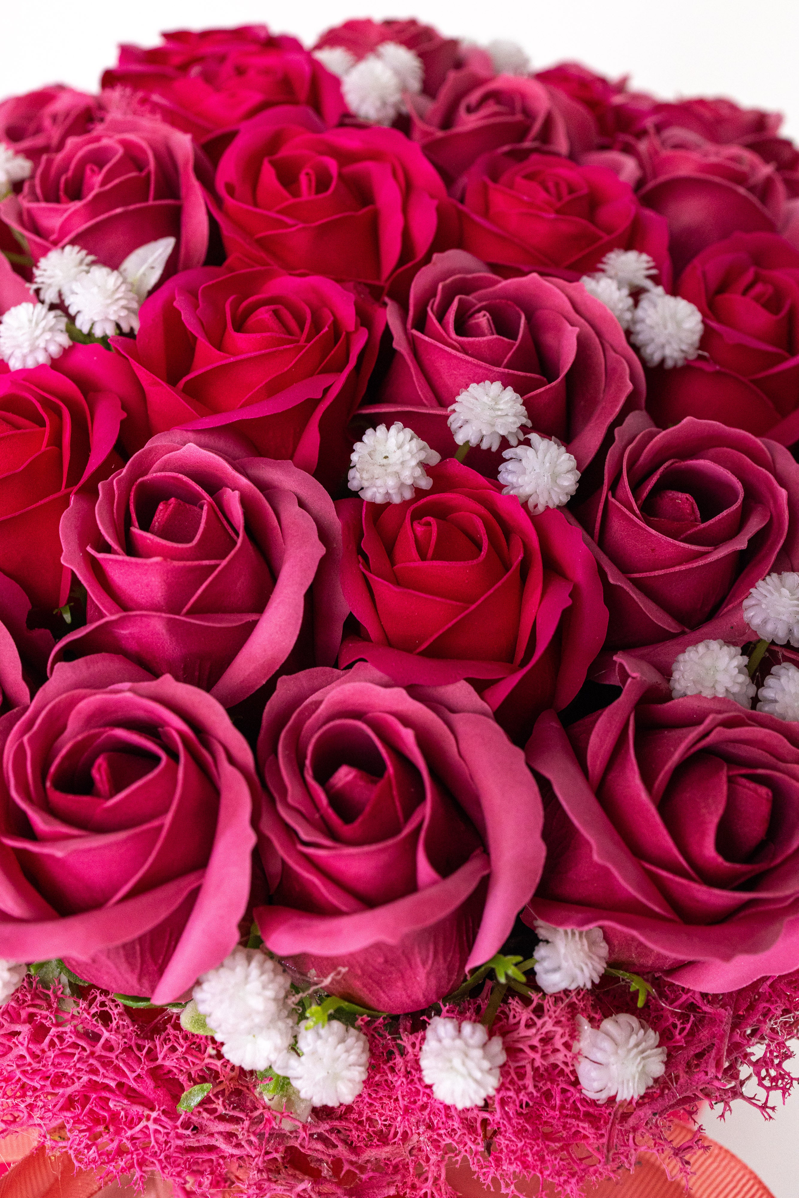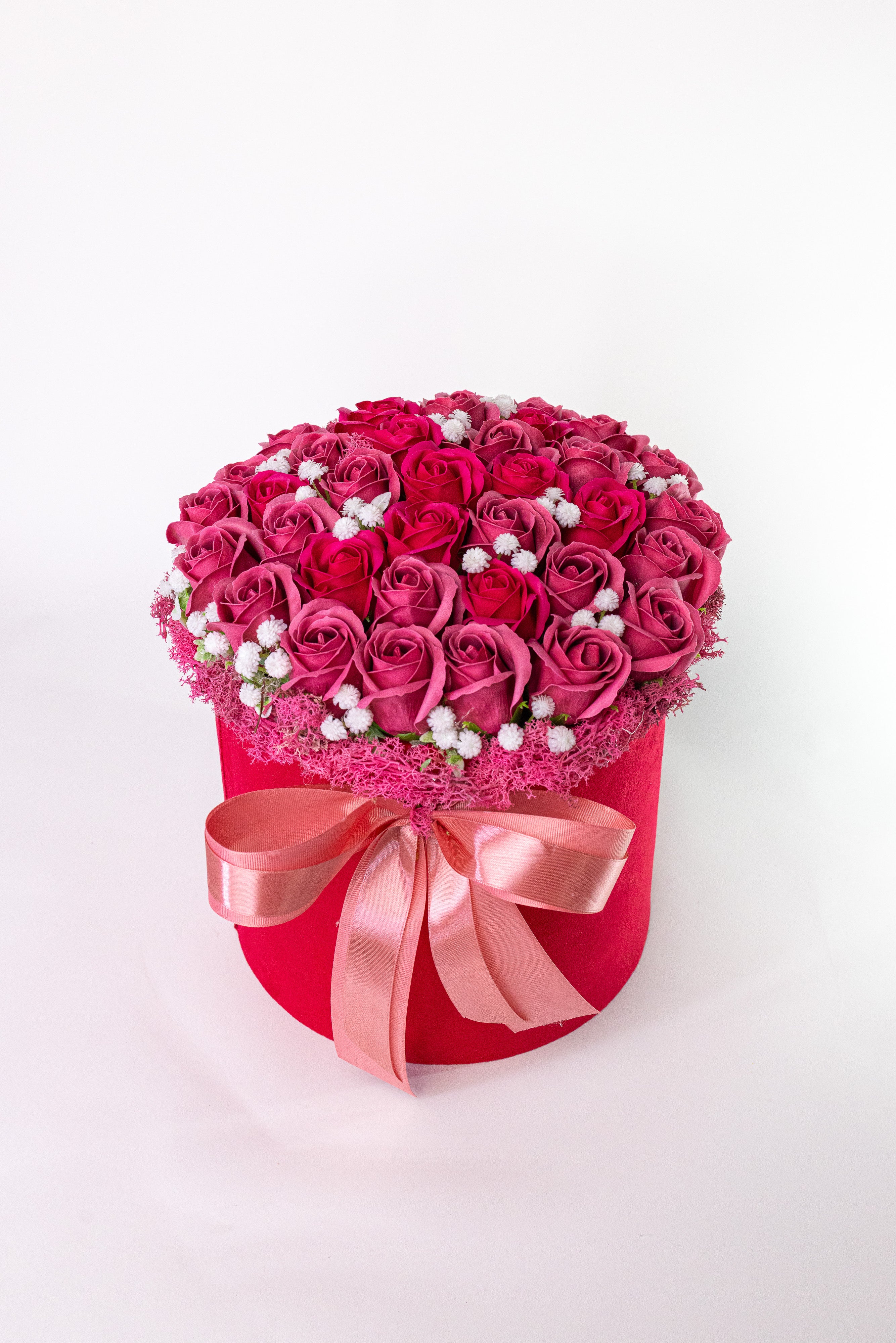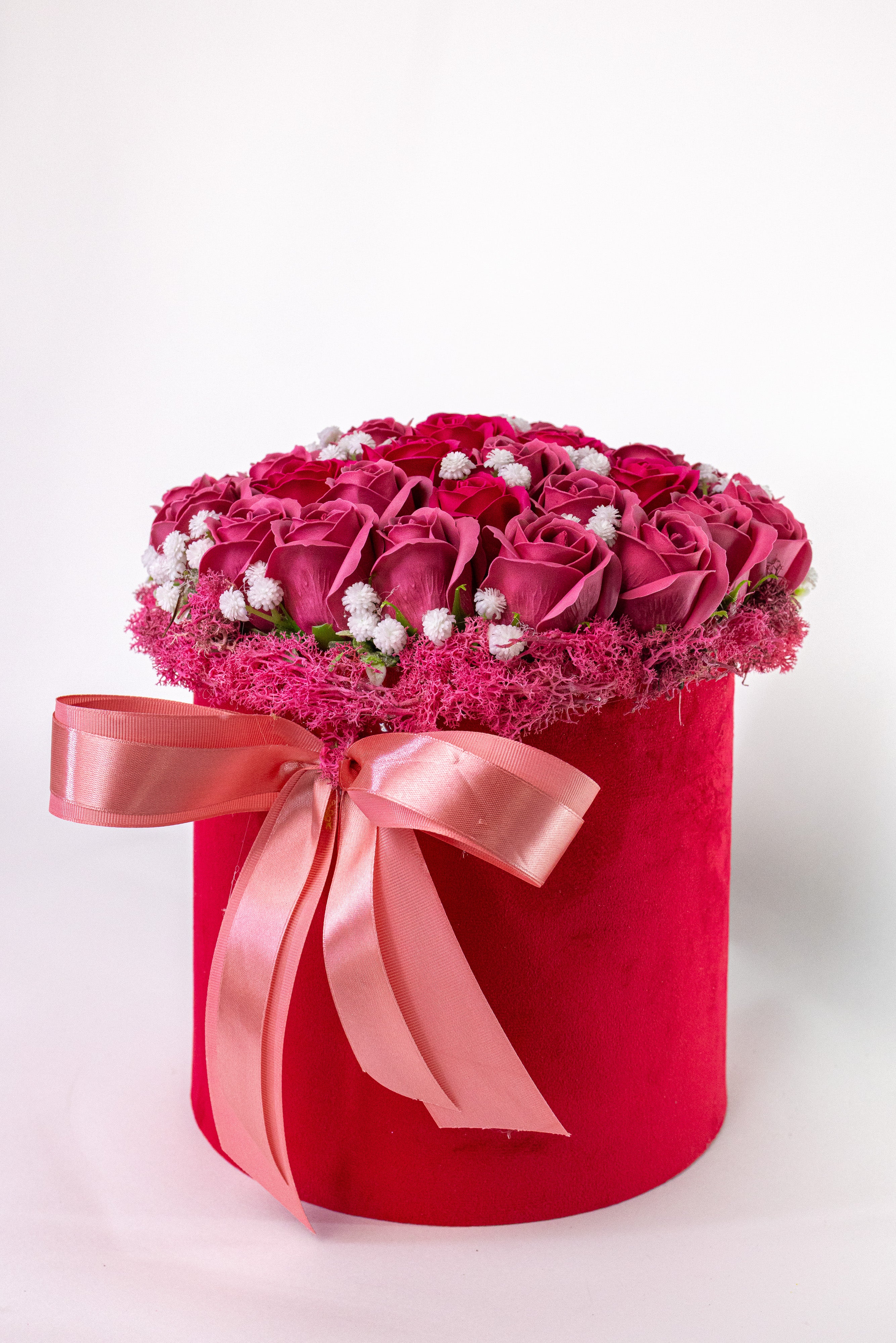 Cutie rotundă din catifea roșie fină, plină cu trandafiri de săpun în nuanțe intense de roșu și magenta, decorați cu flori albe delicate. Un cadou etern, parfumat și extrem de romantic.