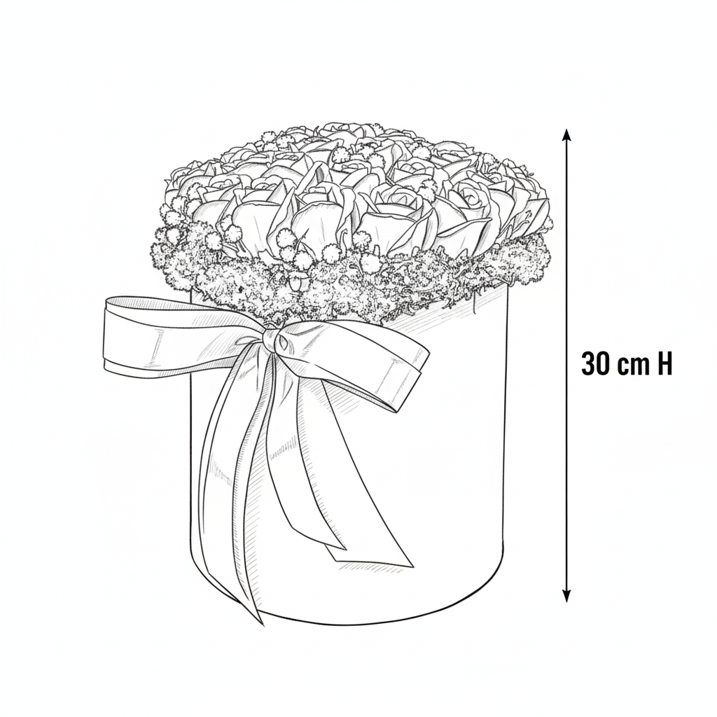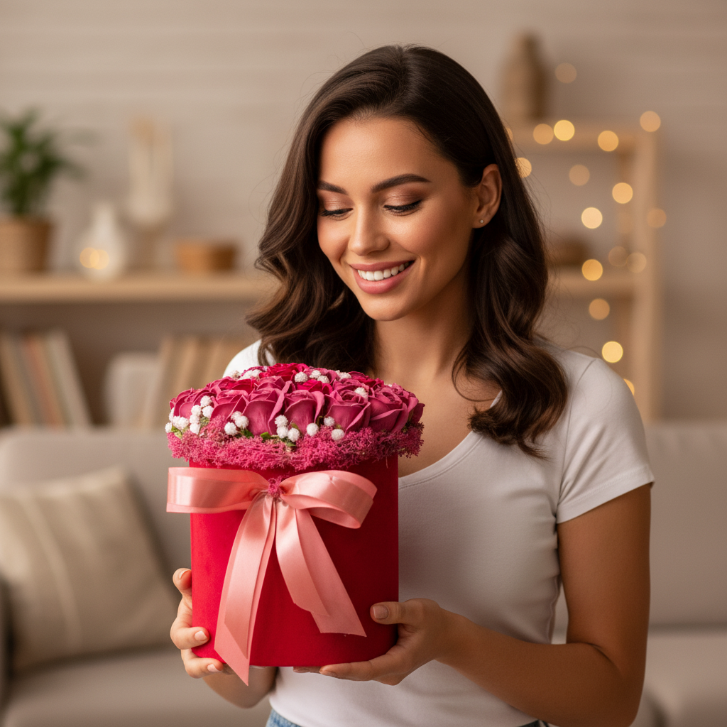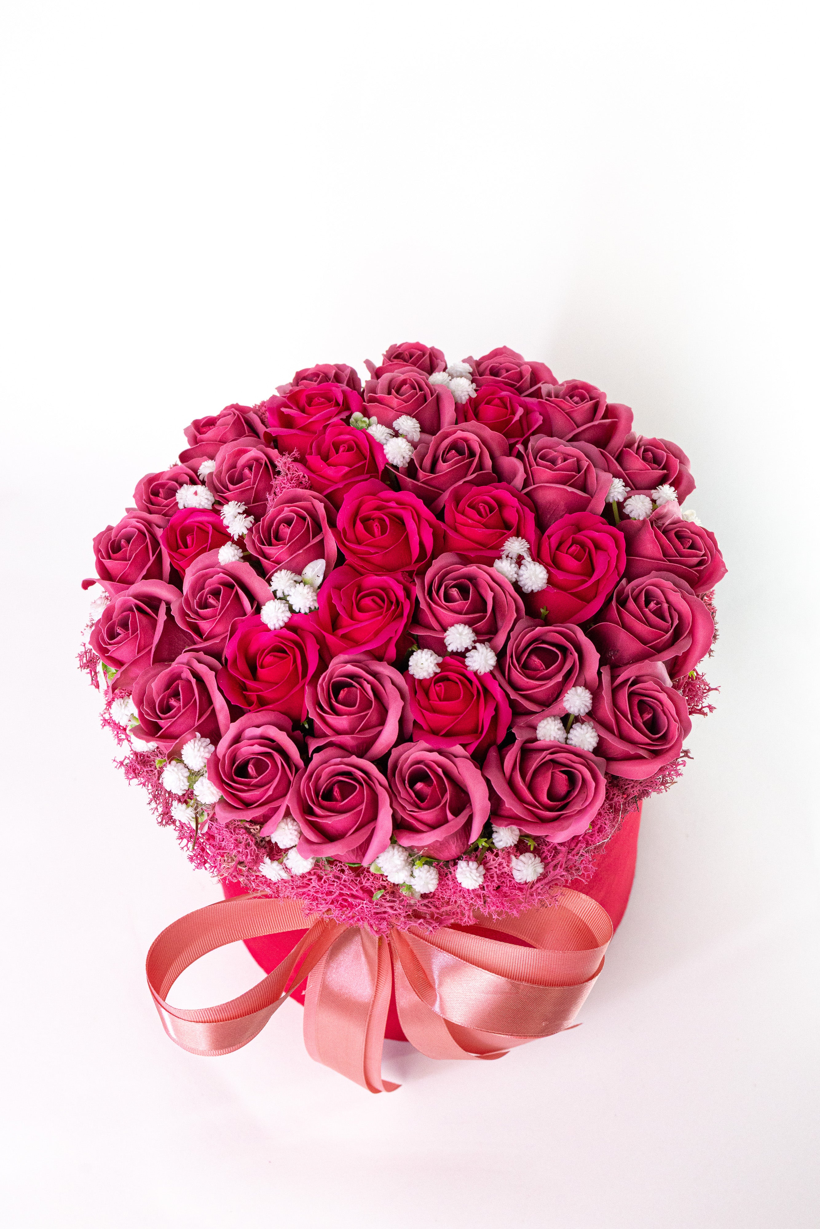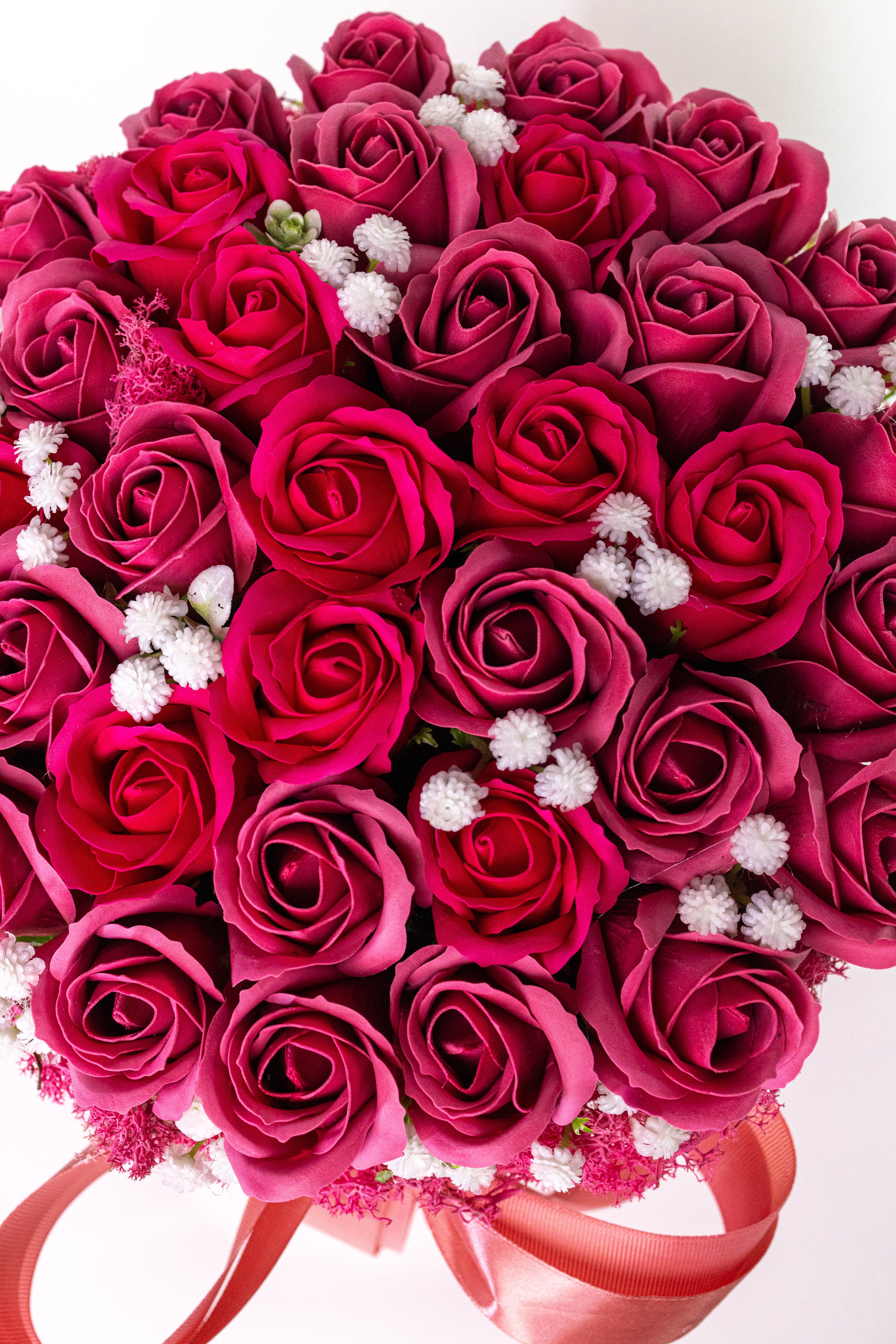 Cutie rotundă din catifea roșie fină, plină cu trandafiri de săpun în nuanțe intense de roșu și magenta, decorați cu flori albe delicate. Un cadou etern, parfumat și extrem de romantic.