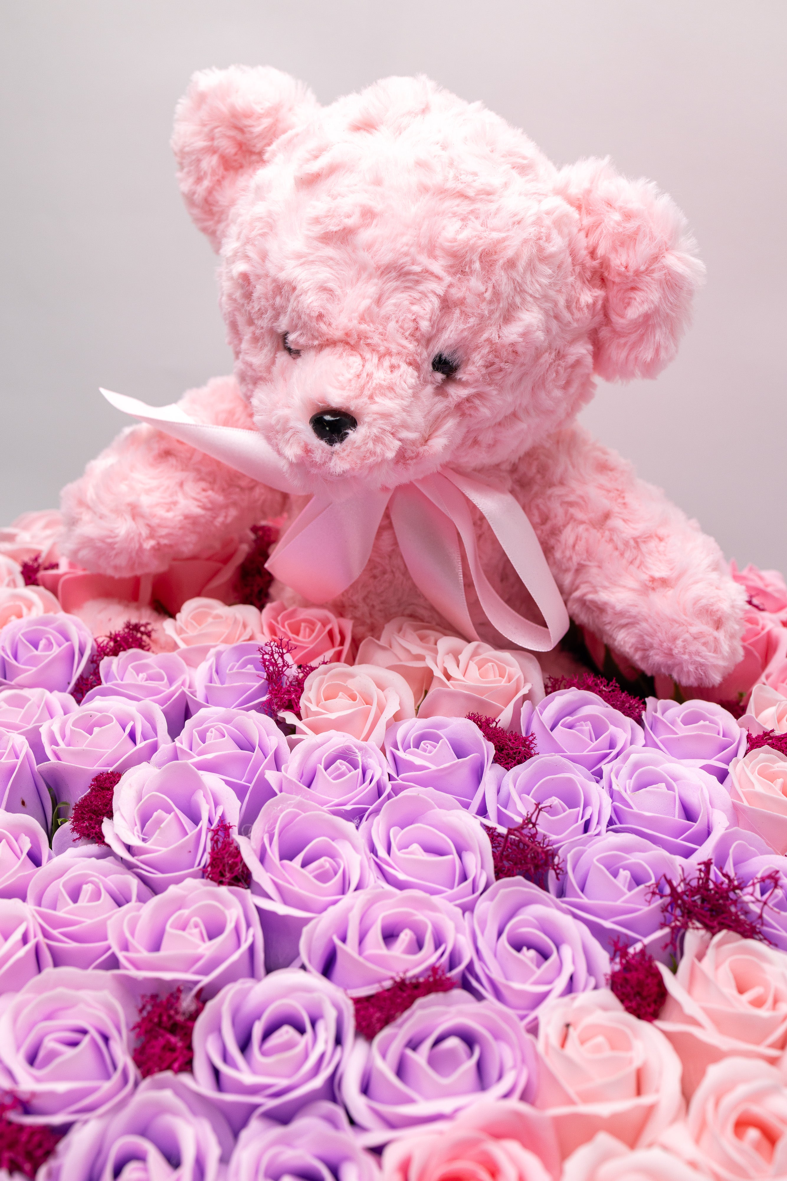Aranjament Lux Trandafiri Săpun Roz & Lila, Ursulet Gri