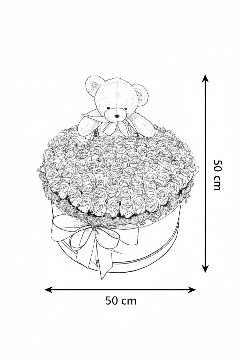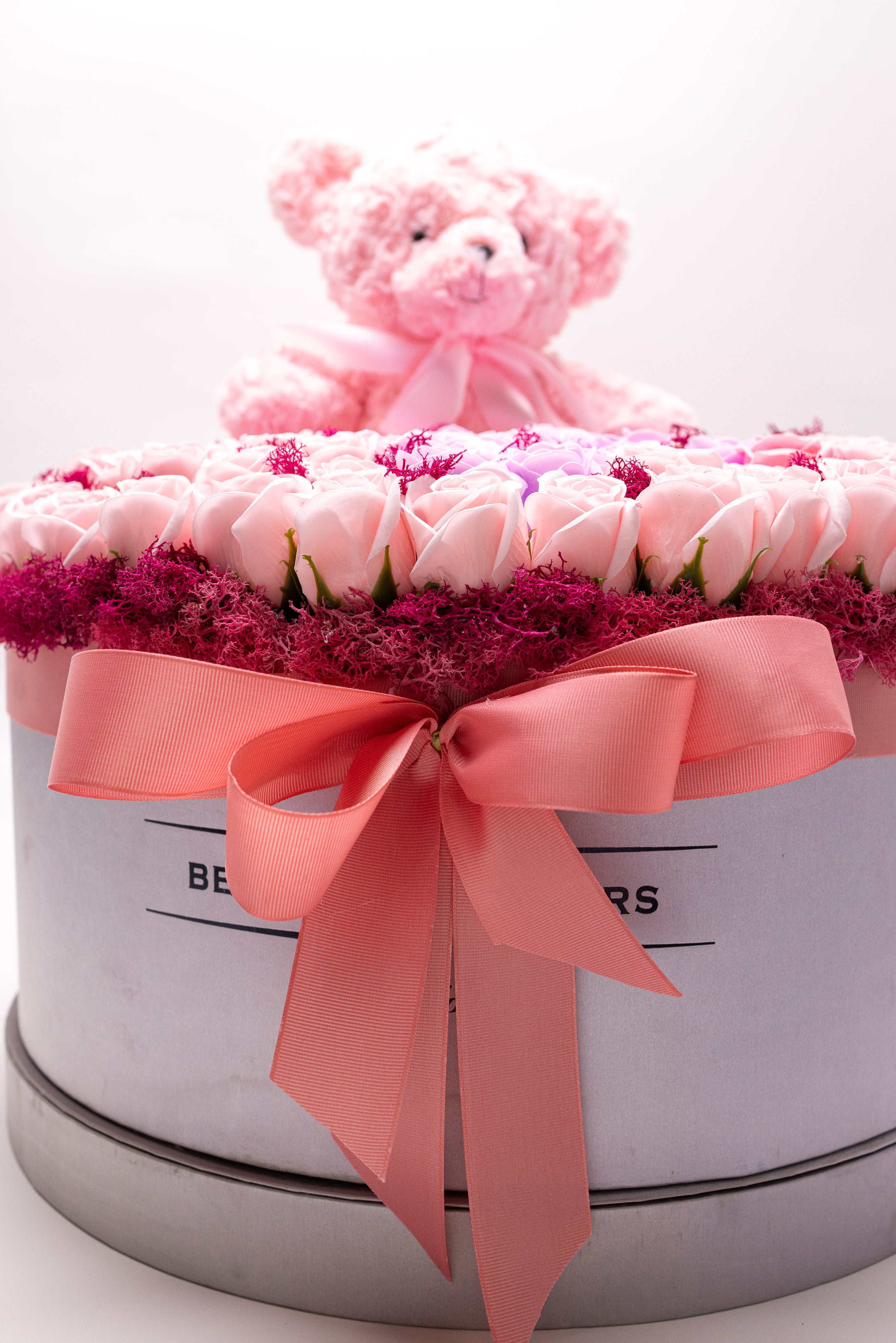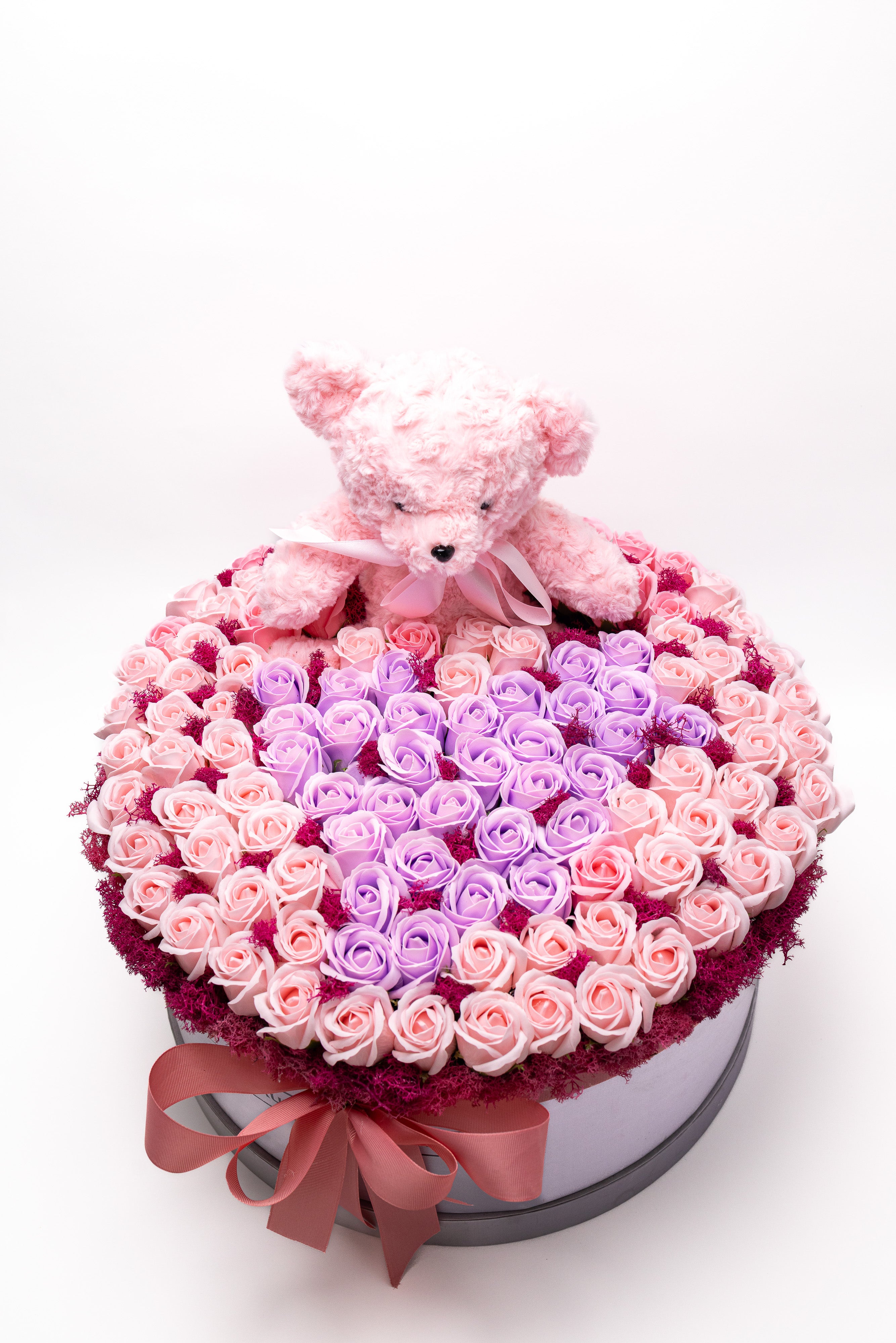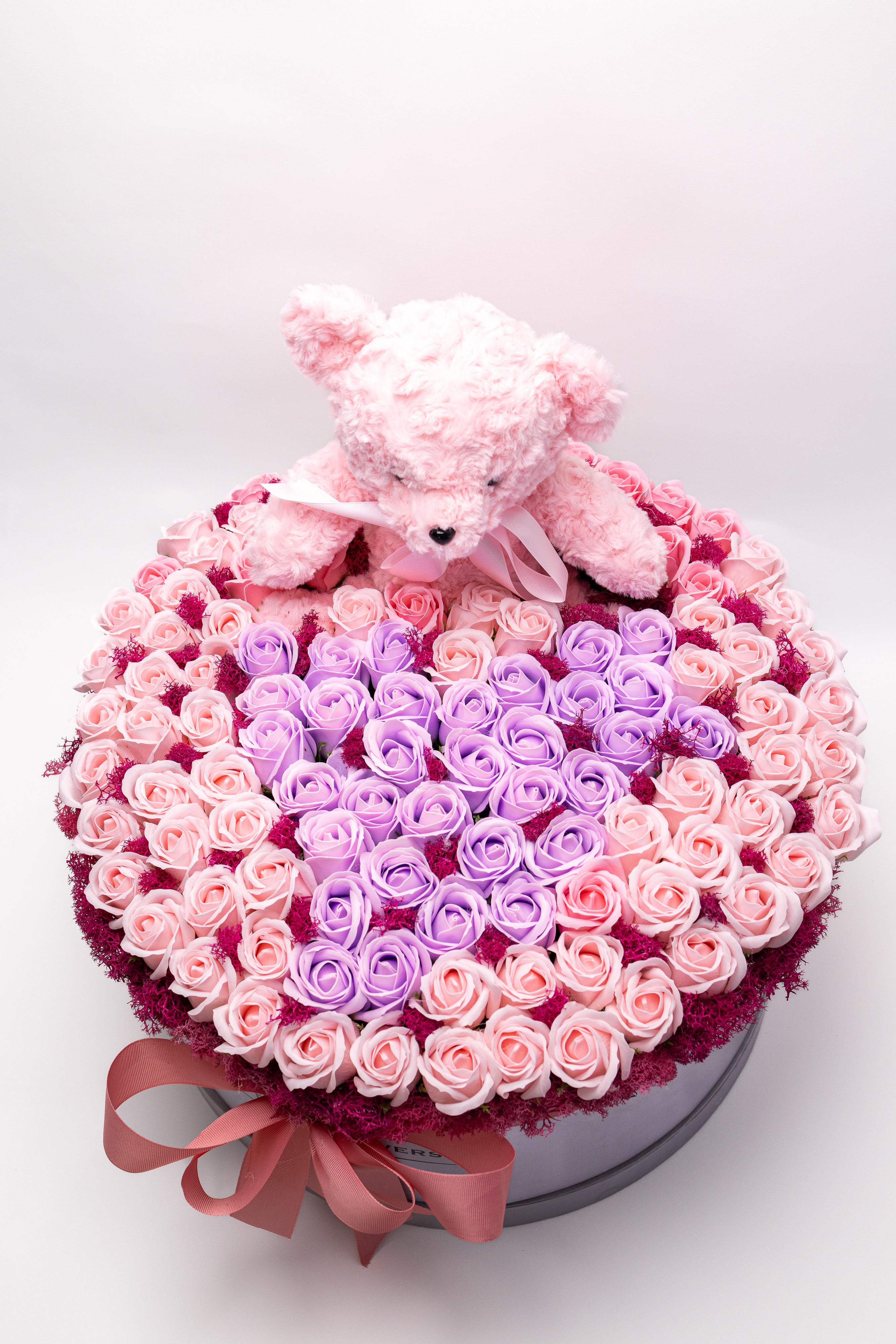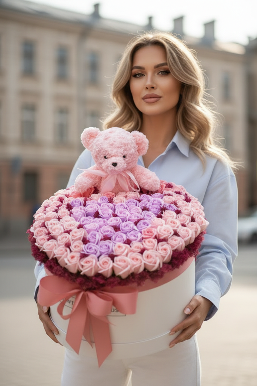 Cutie rotundă premium cu 159 trandafiri de săpun parfumați, în nuanțe pastelate de roz și lila. Include un ursuleț de pluș gri, pufos, pentru un cadou etern plin de tandrețe și rafinament vizual.