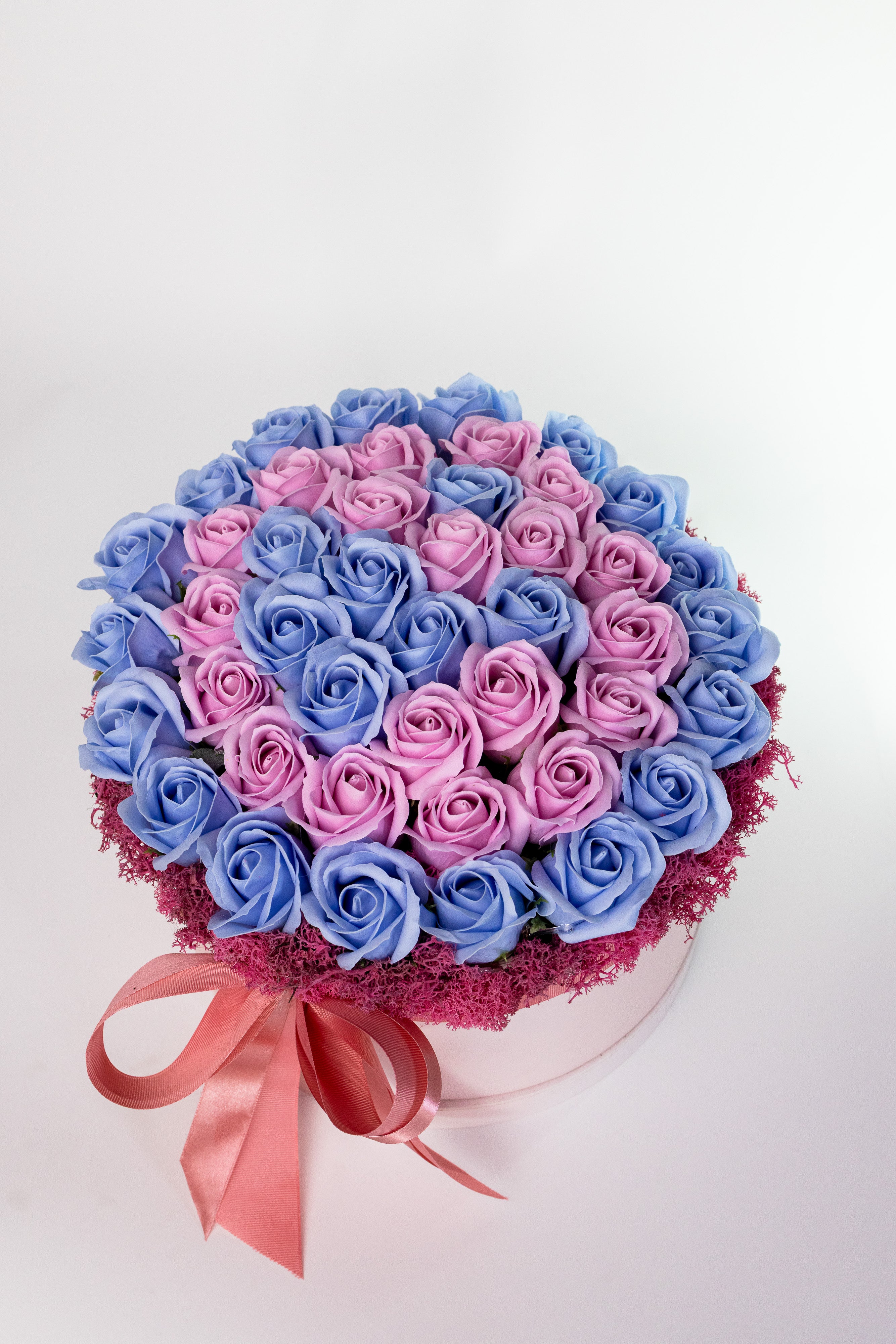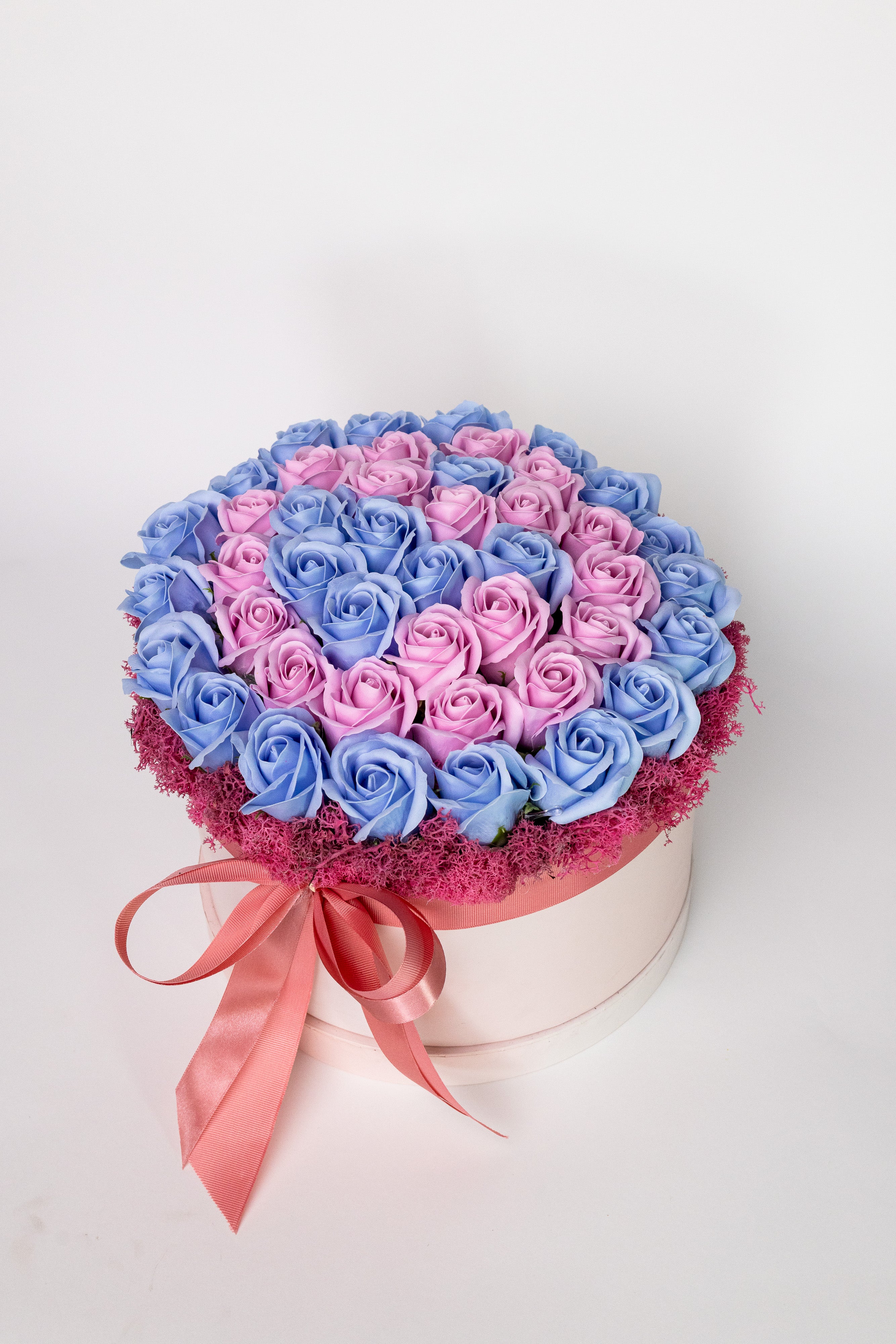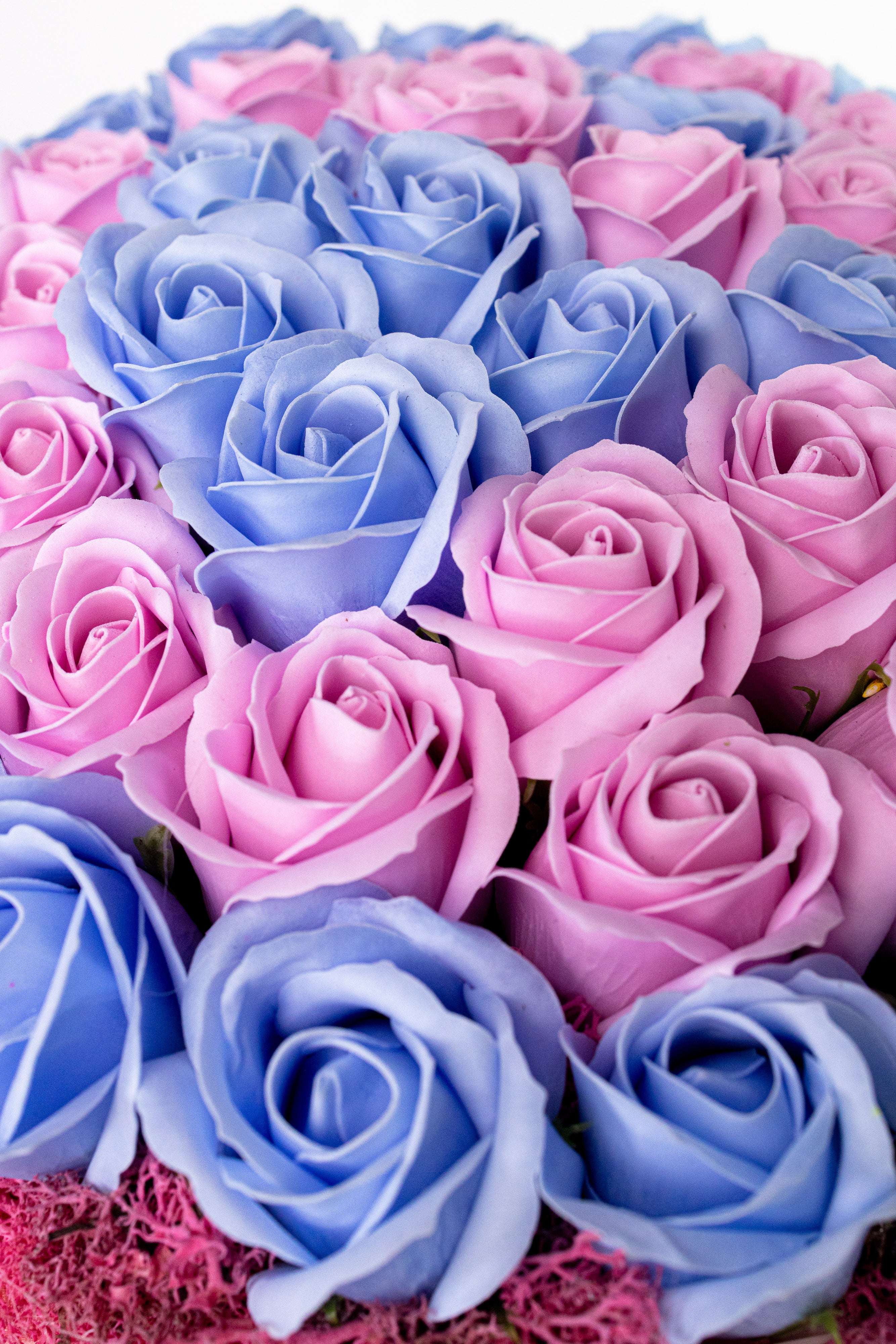 Cutie rotundă premium cu 59 de trandafiri de săpun în spirală roz și albastru, pe pat de mușchi natural. Accesorizată cu fundă satinată. Petale parfumate, textură catifelată și rezistență eternă.