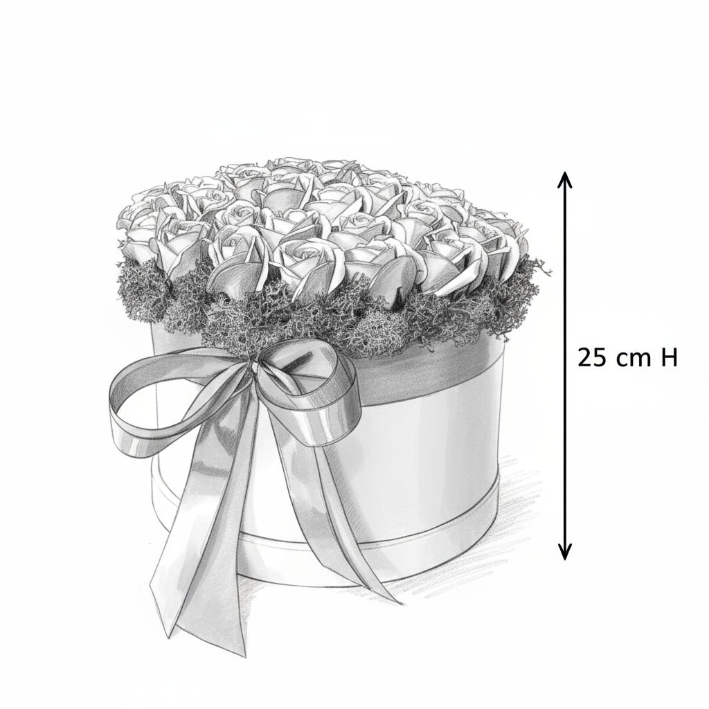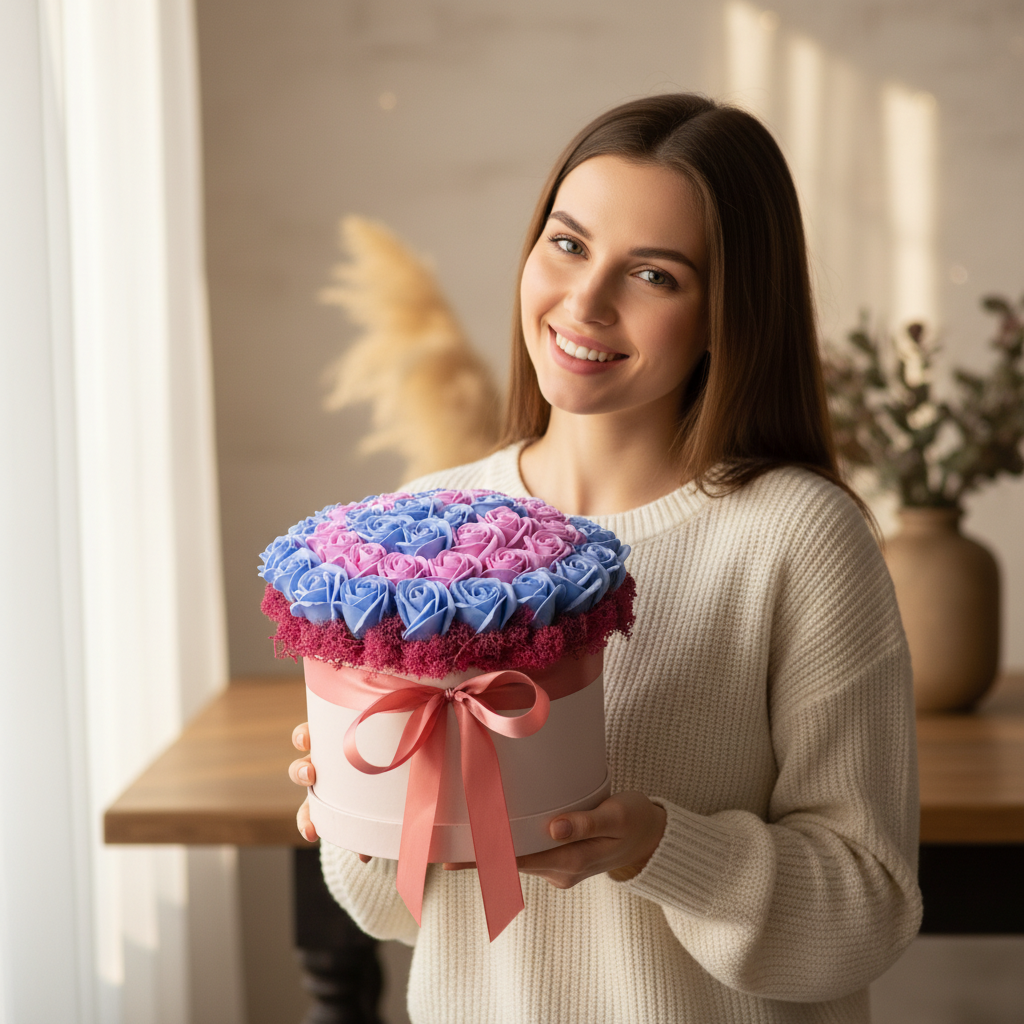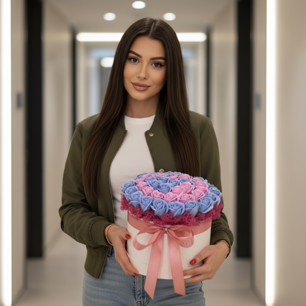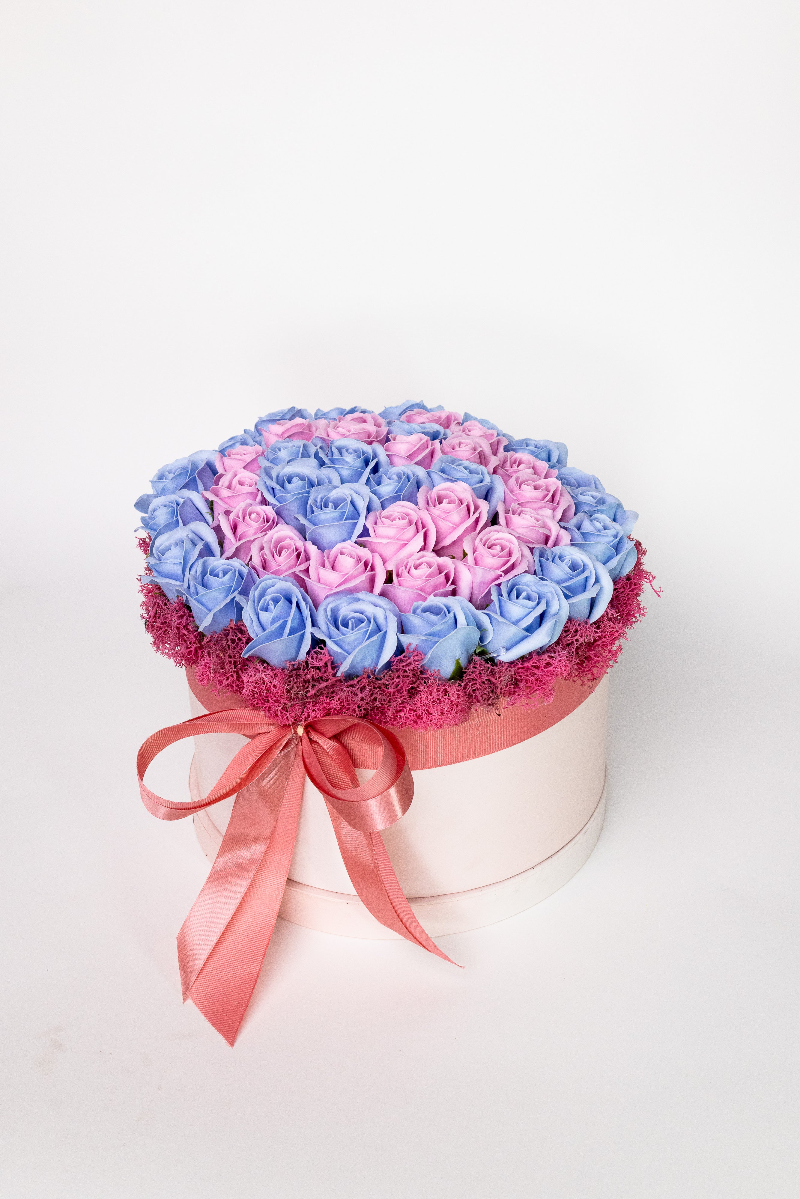 Cutie rotundă premium cu 59 de trandafiri de săpun în spirală roz și albastru, pe pat de mușchi natural. Accesorizată cu fundă satinată. Petale parfumate, textură catifelată și rezistență eternă.