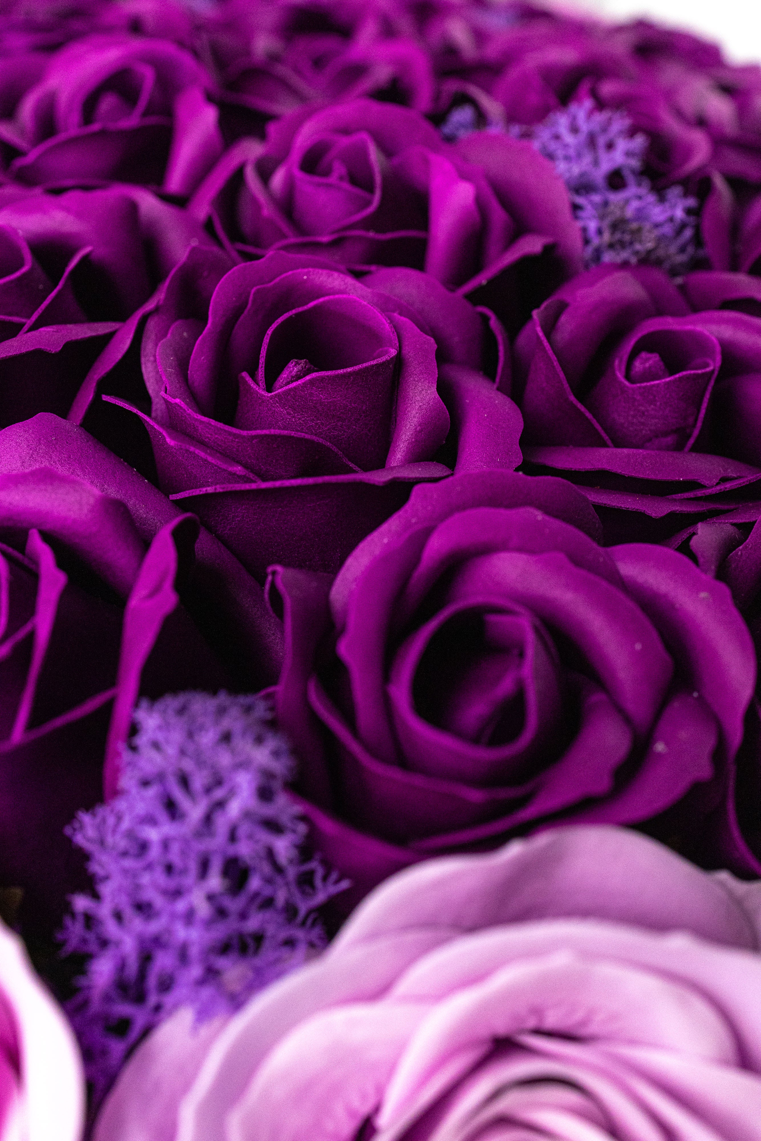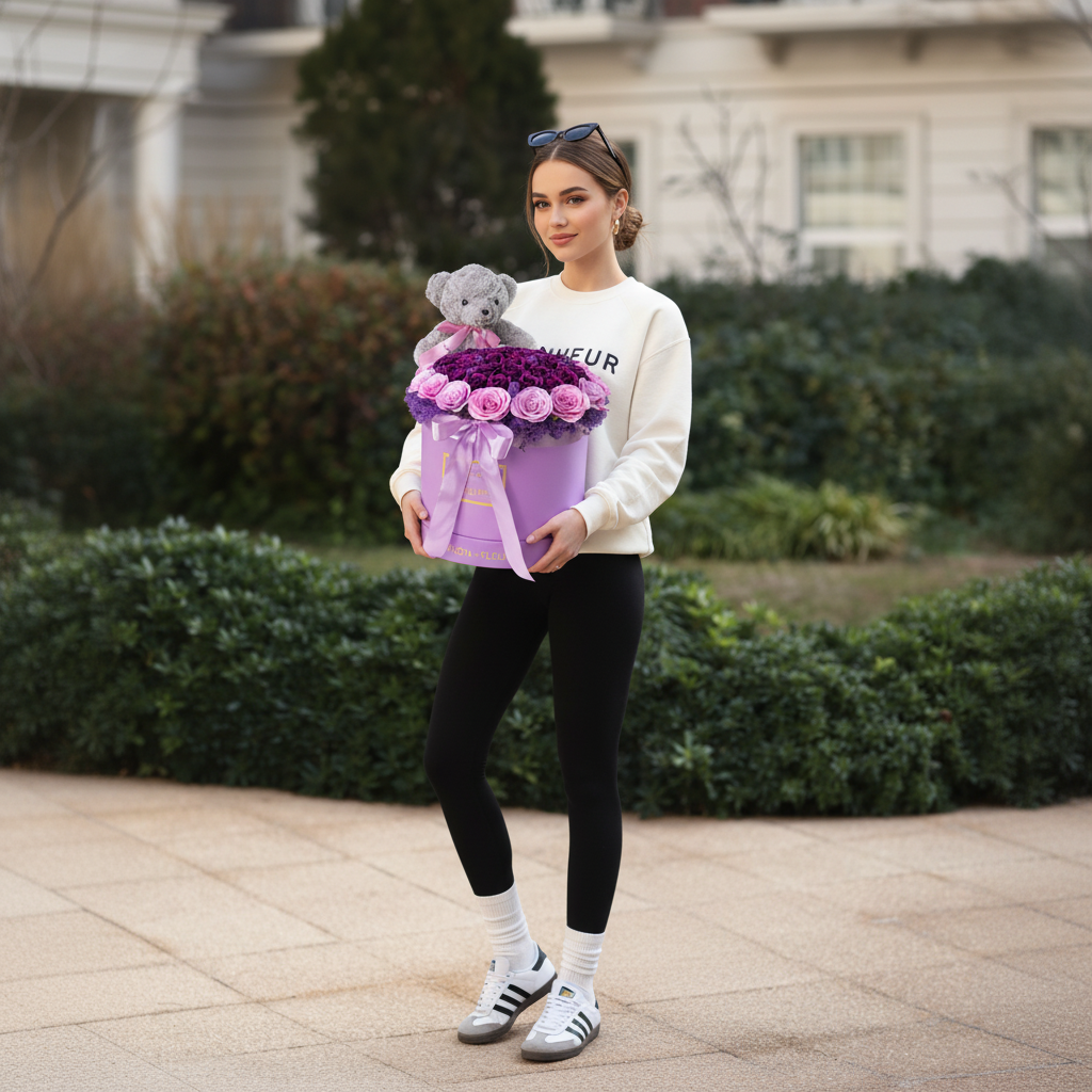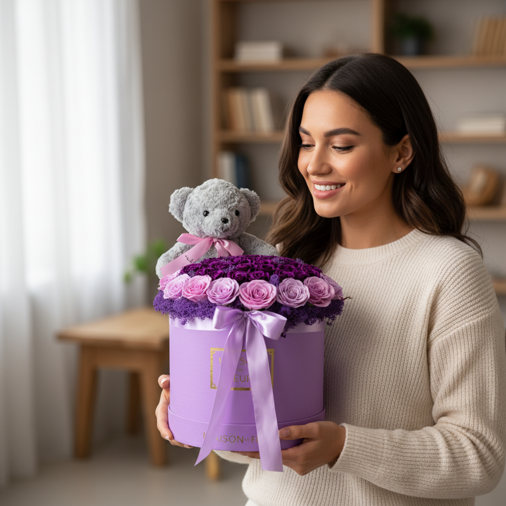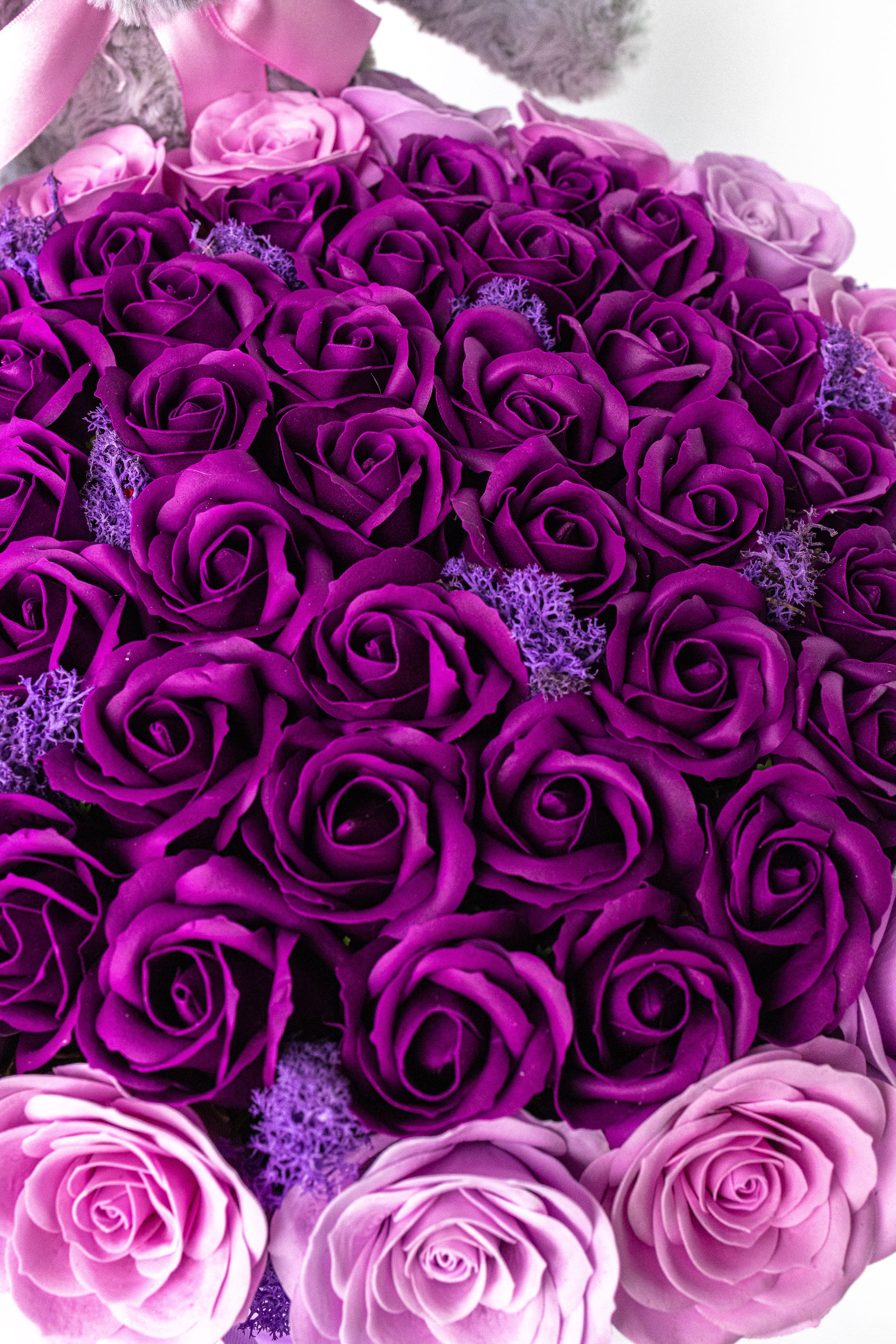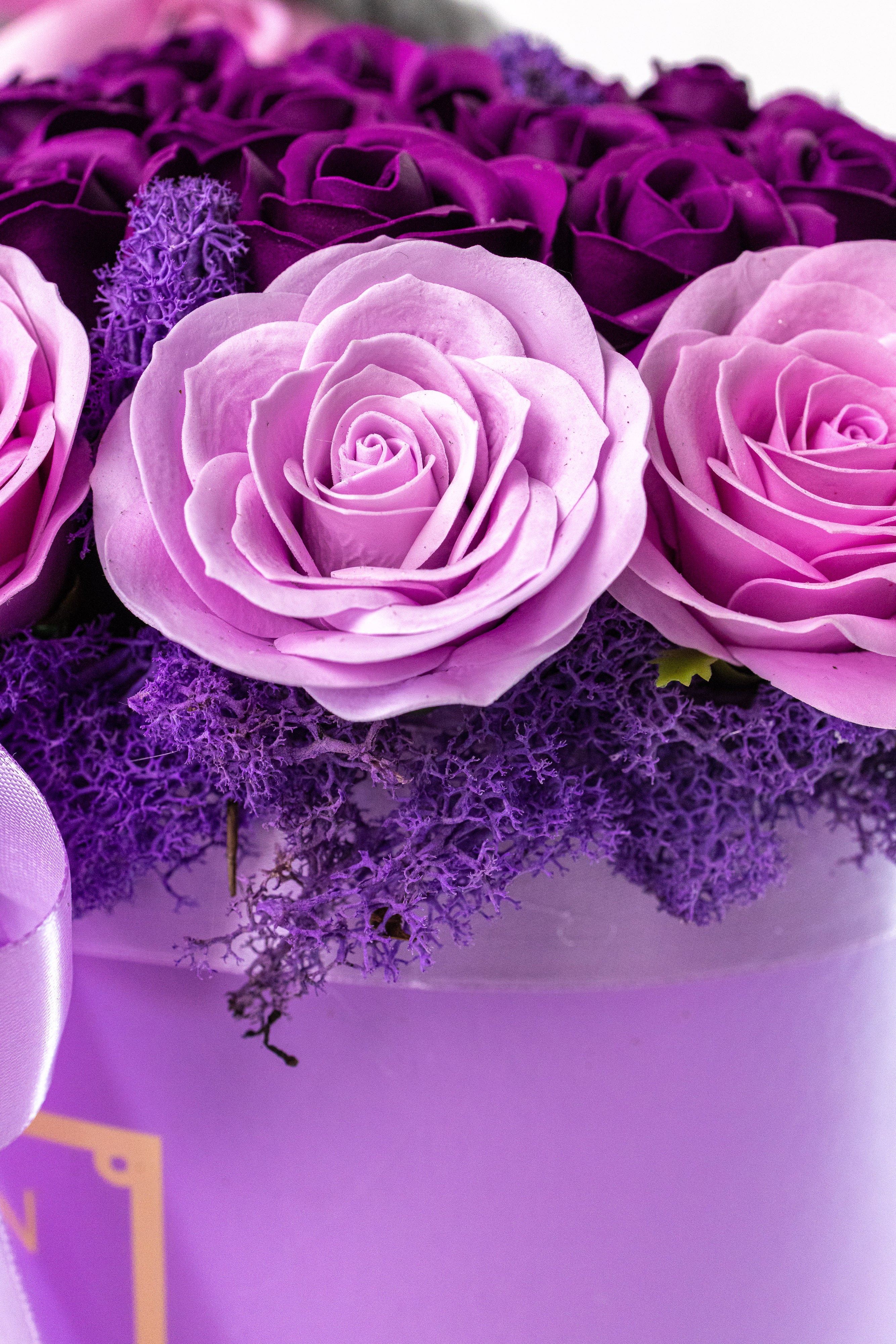 Cutie rotundă mov elegantă cu trandafiri de săpun în degrade violet și roz, pe pat de mușchi natural violet. Include un ursuleț gri de pluș fin și fundă satinată. Un cadou parfumat, vibrant și etern.