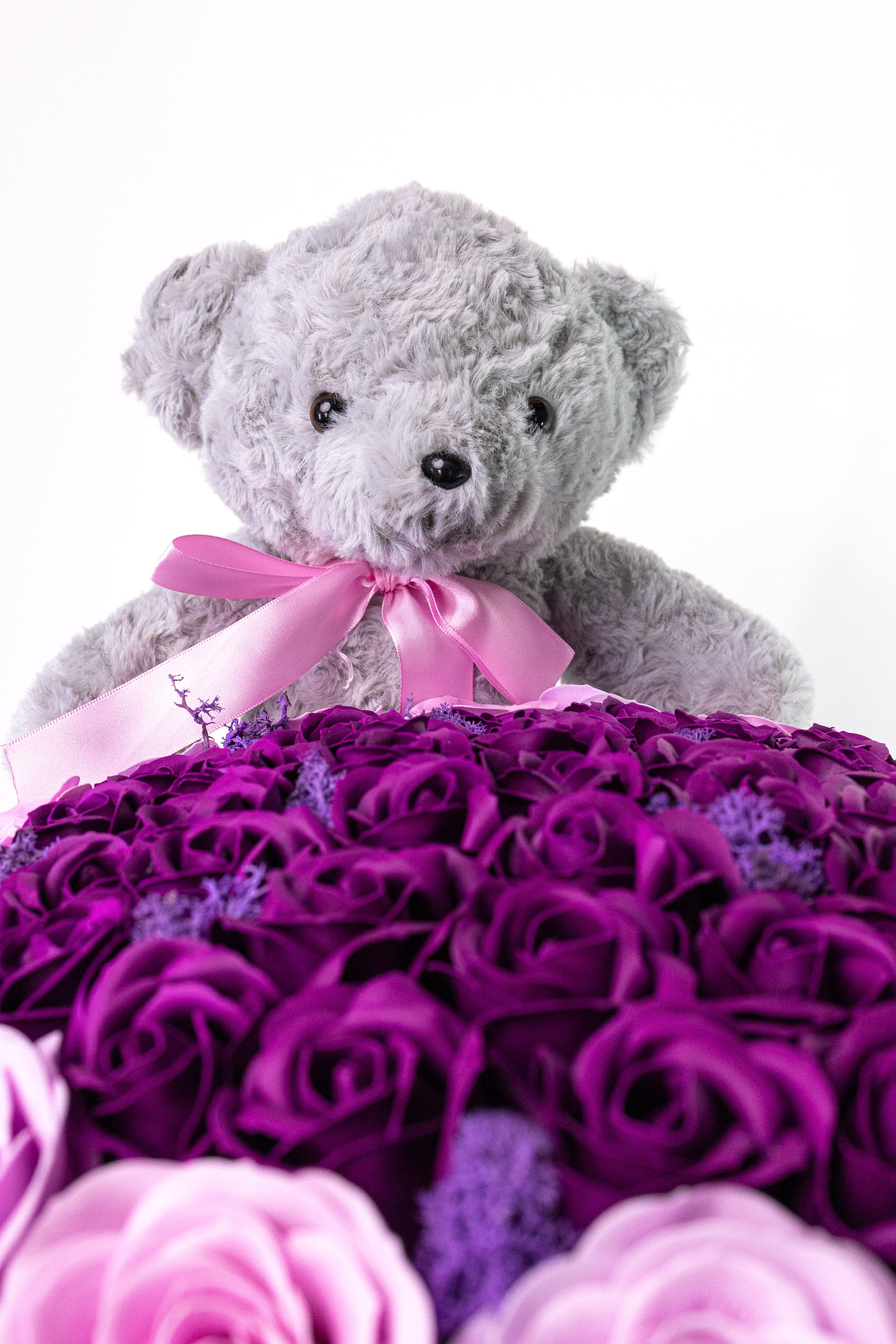 Aranjament Lux Trandafiri Săpun Violet-Roz, Ursulet Gri