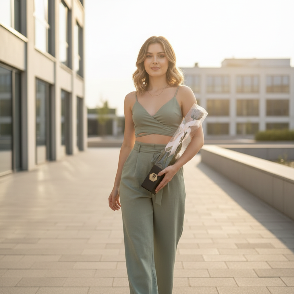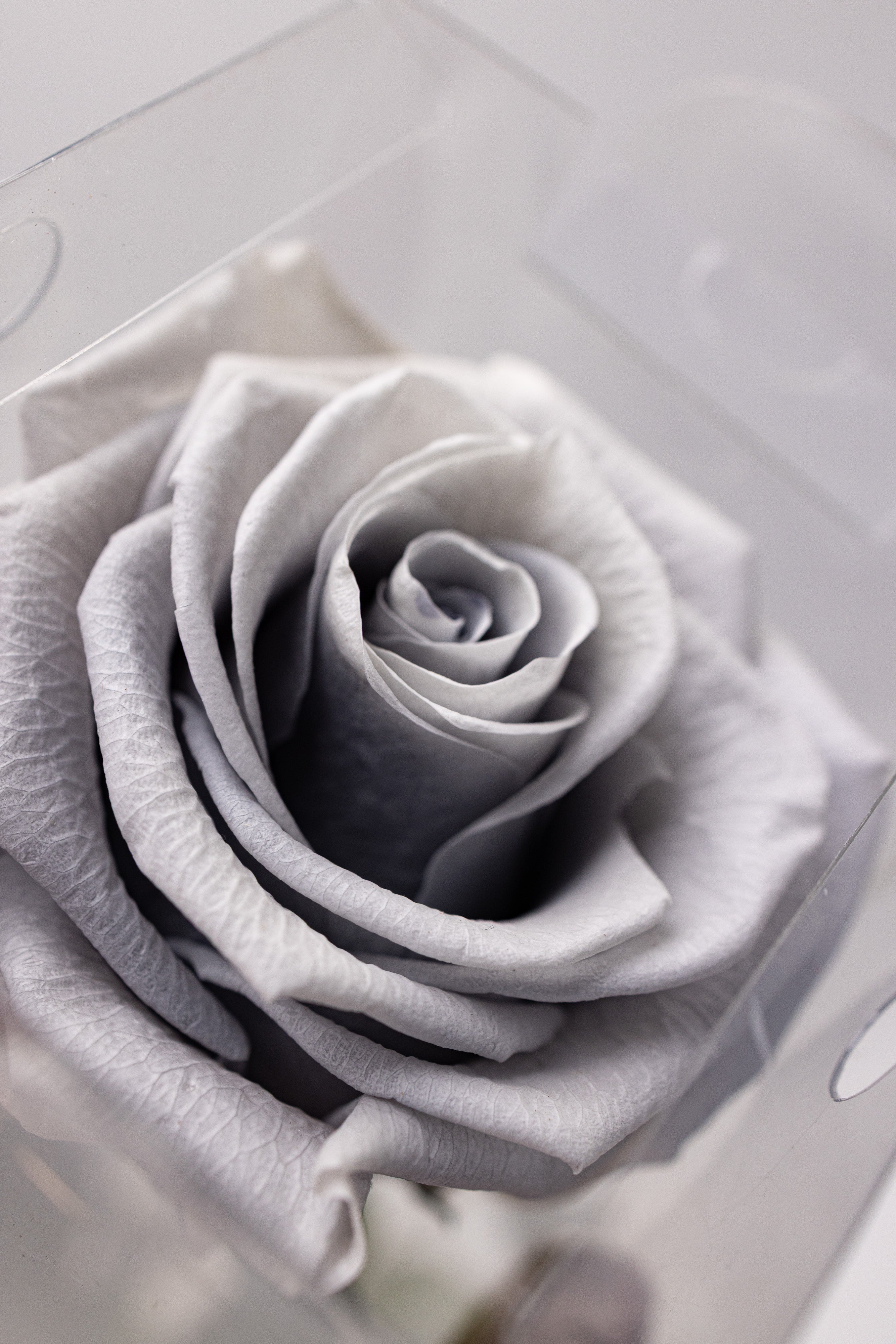 O raritate botanică ce sfidează timpul. Acest trandafir gri imperial, cu tulpină și frunze criogenate, este lucrat manual pentru a-și păstra perfecțiunea peste 30 de ani. Protejat într-o vitrină acrilică premium tip coloană, cu fundă de satin, este definiția exclusivității eterne.