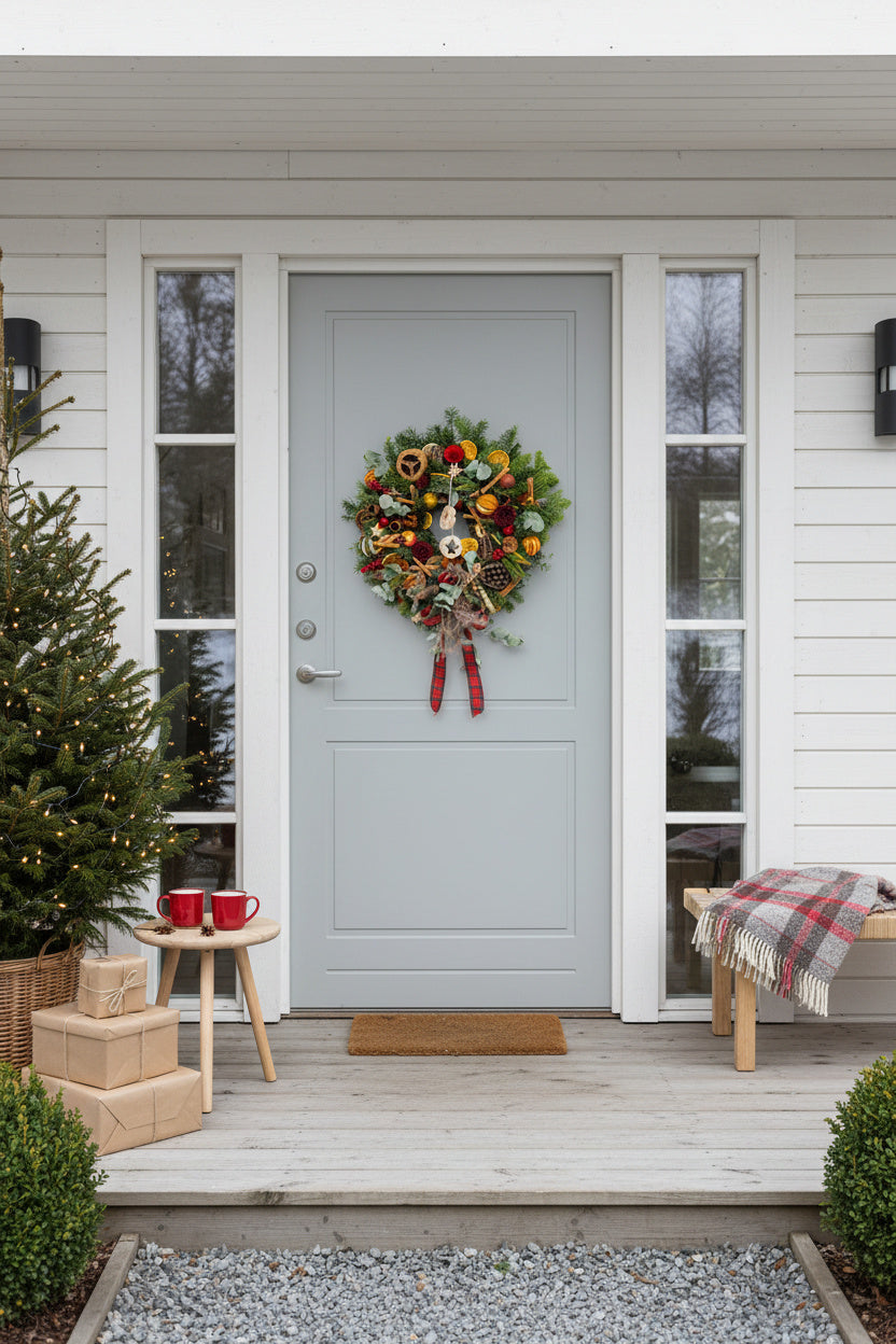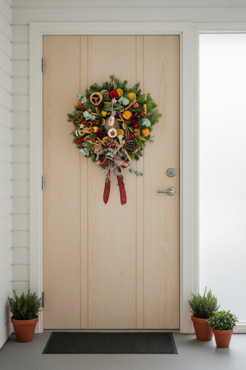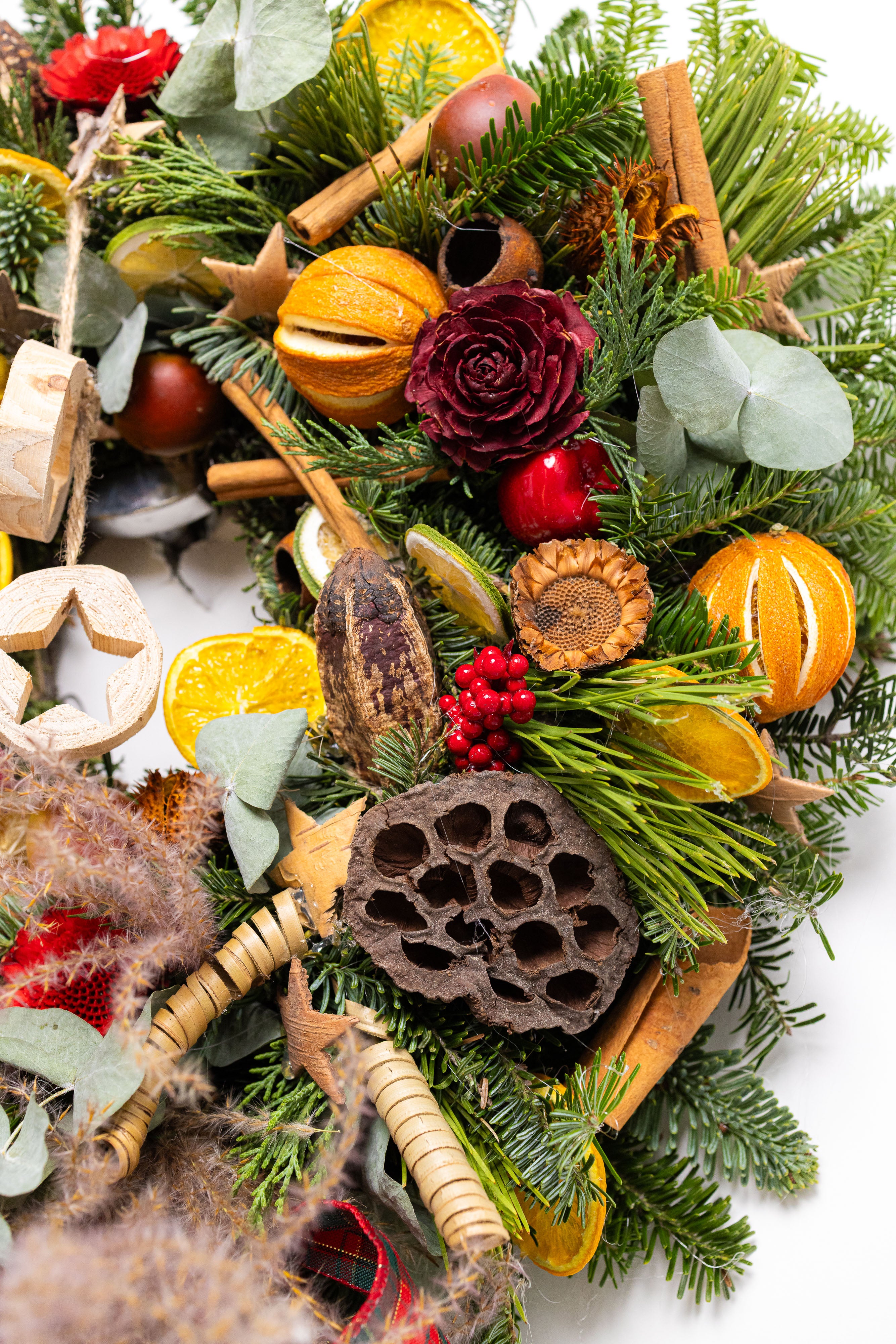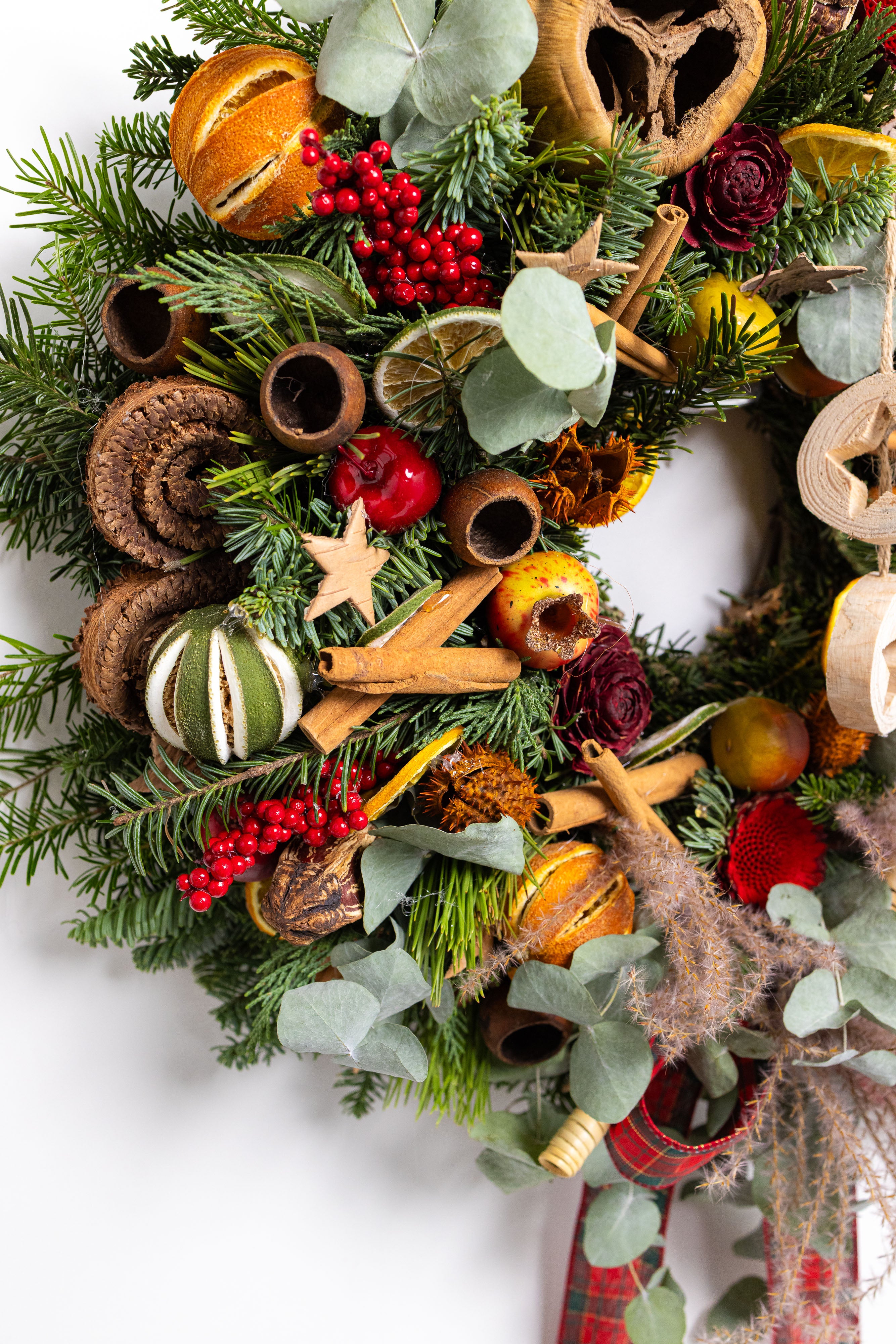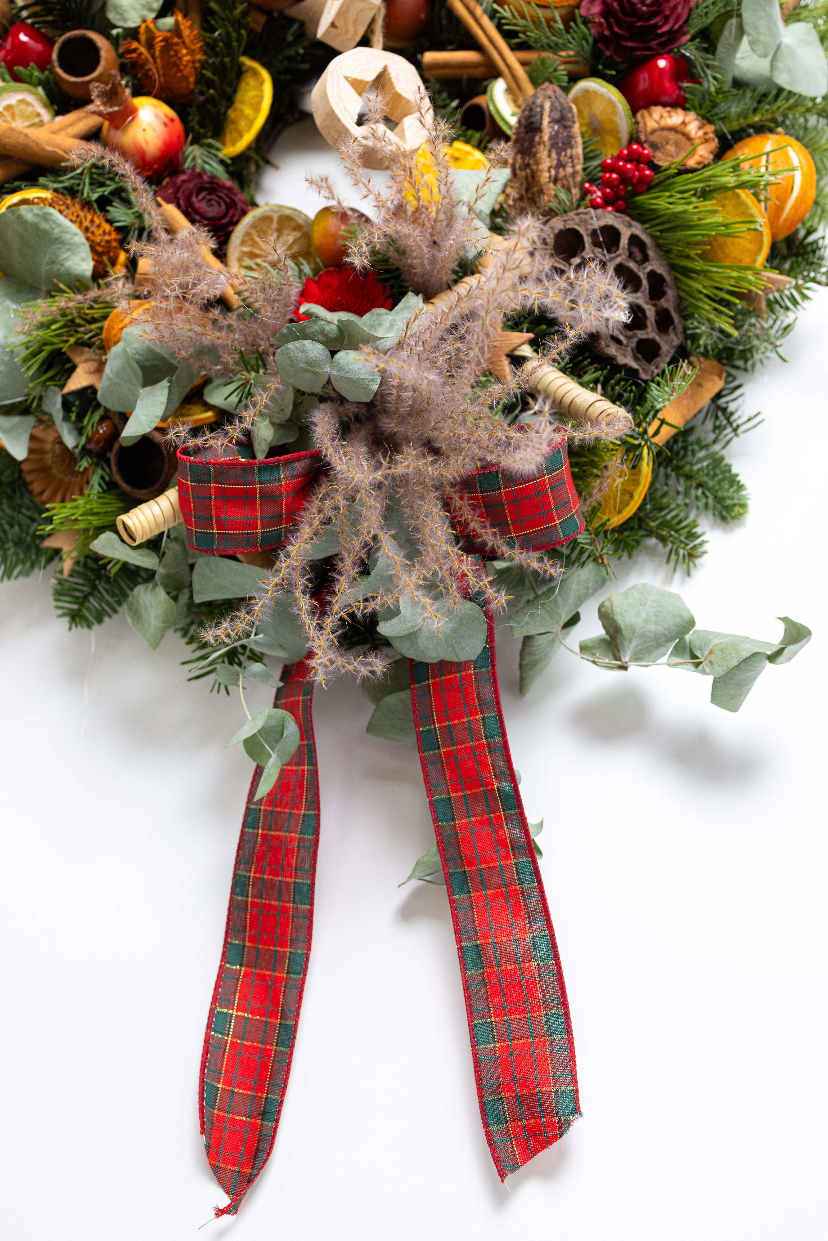 O capodoperă a designului floral, creată manual dintr-un mix bogat de brad natural și eucalipt. Aranjamentul este decorat cu flori din lemn sculptate manual, fructe de lotus, rodii miniaturale, citrice uscate și batoane de scorțișoară, fiind completat de o fundă elegantă tartan.