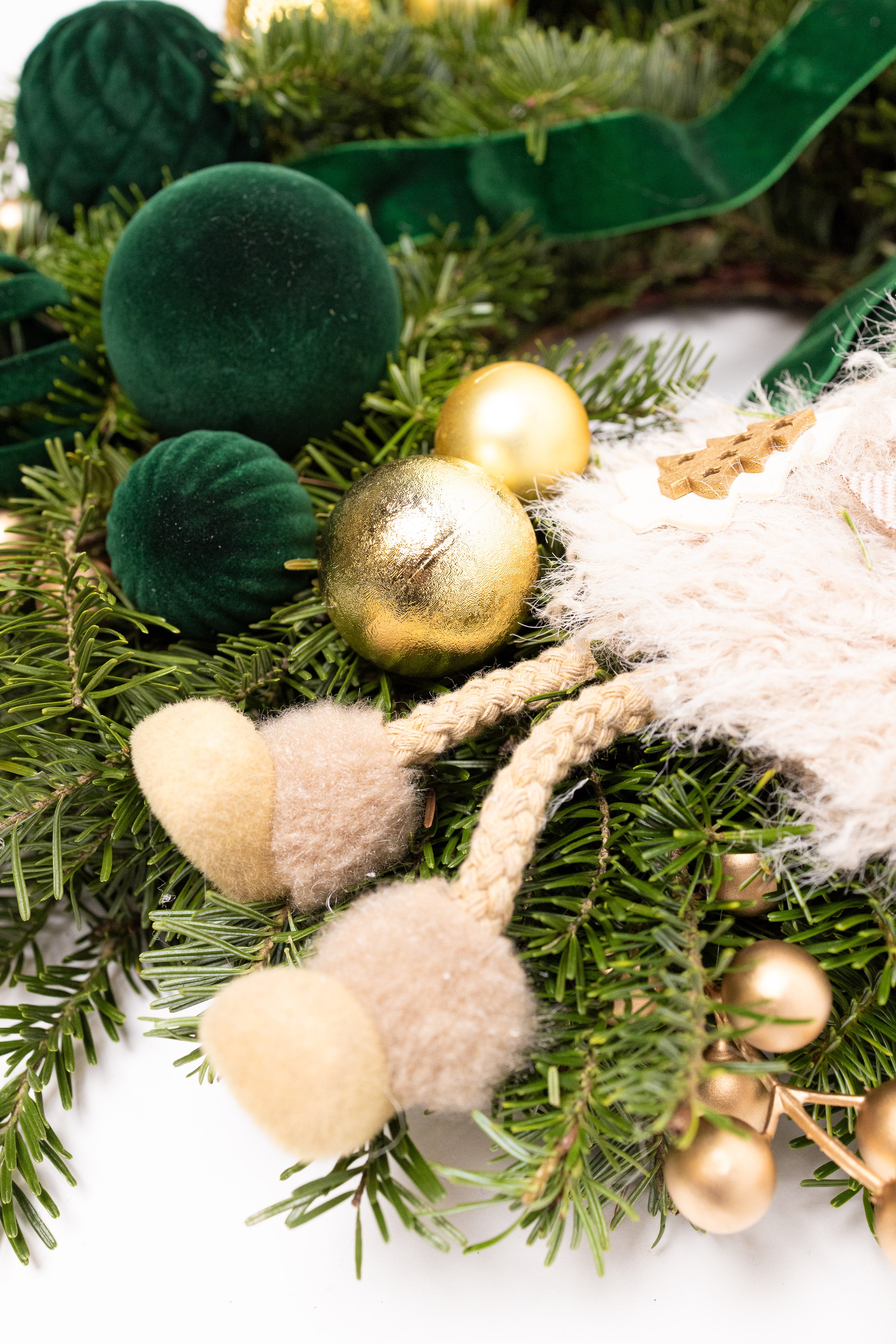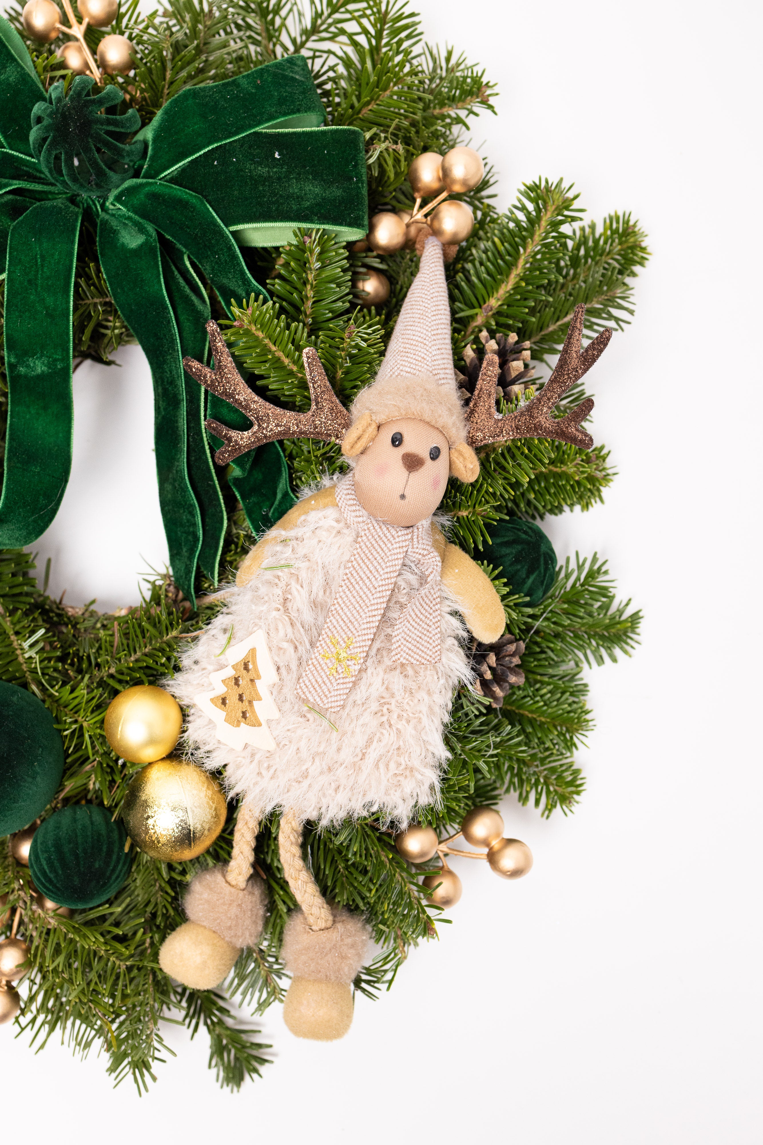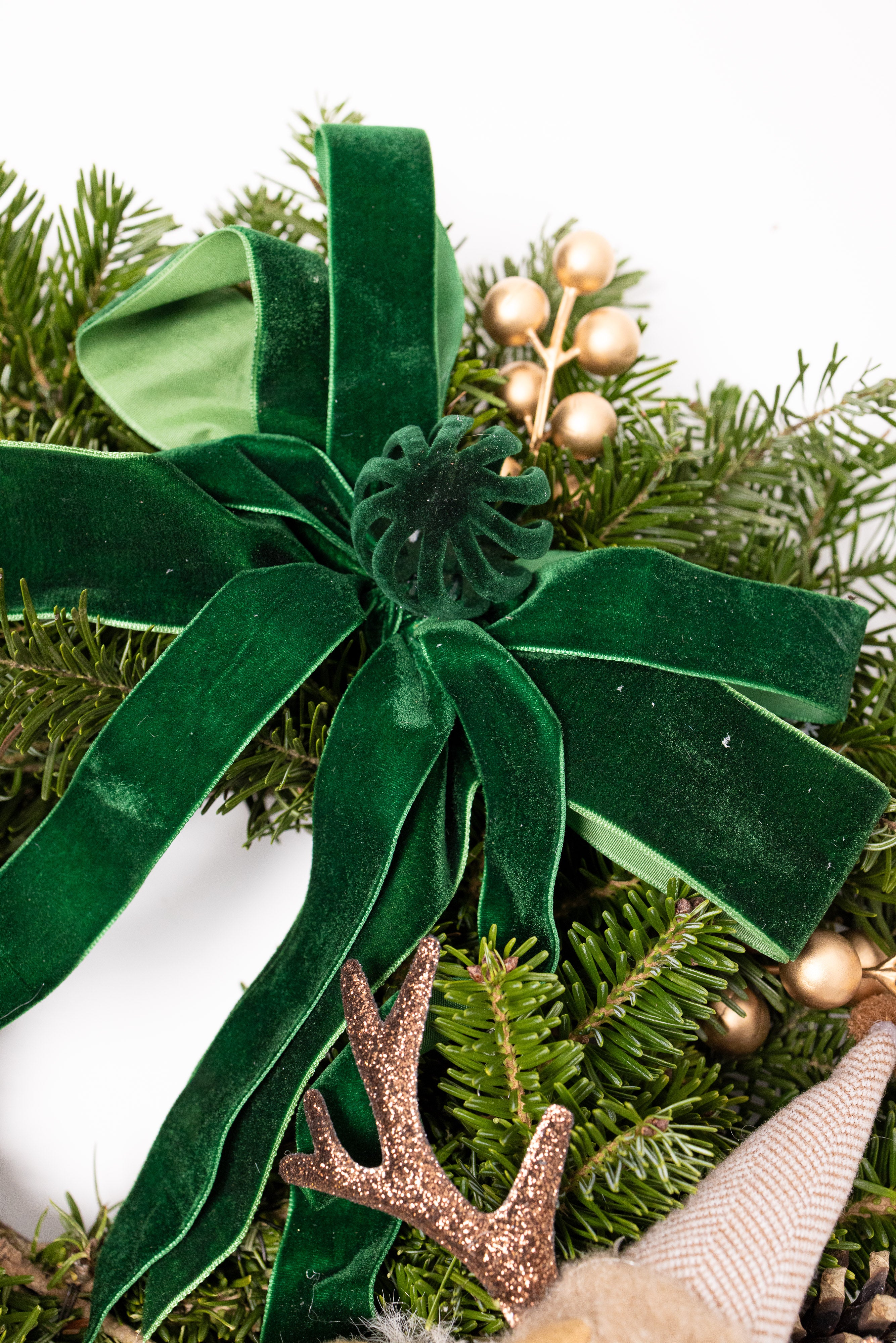 O piesă de o eleganță rară, lucrată manual pe o bază bogată din brad natural Nobilis, renumit pentru prospețimea și culoarea sa deosebită. Aranjamentul este decorat cu o fundă regală din catifea verde smarald, globuri catifelate asortate și o figurină ren artizanală cu detalii sclipitoare.
