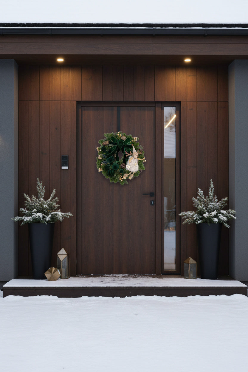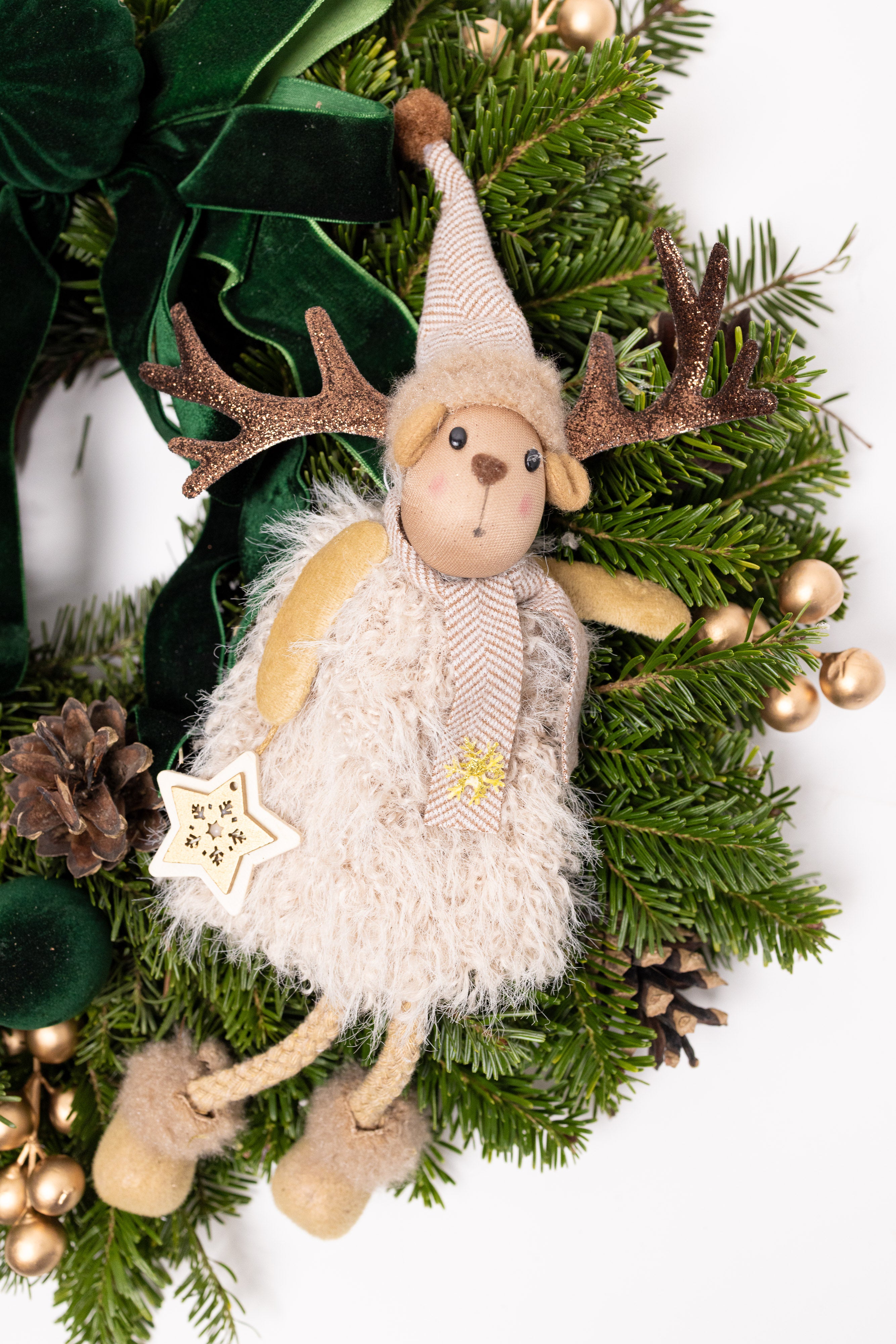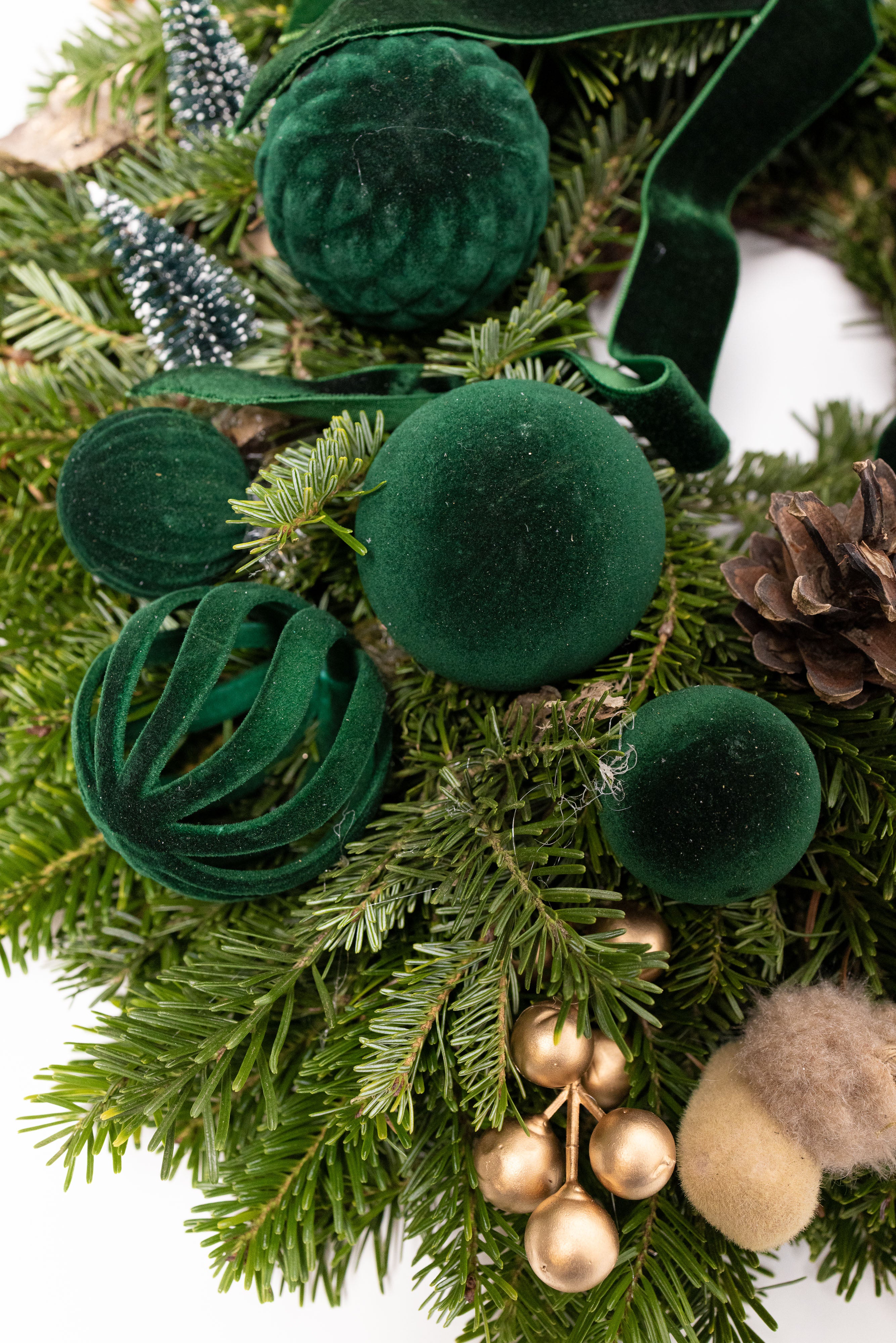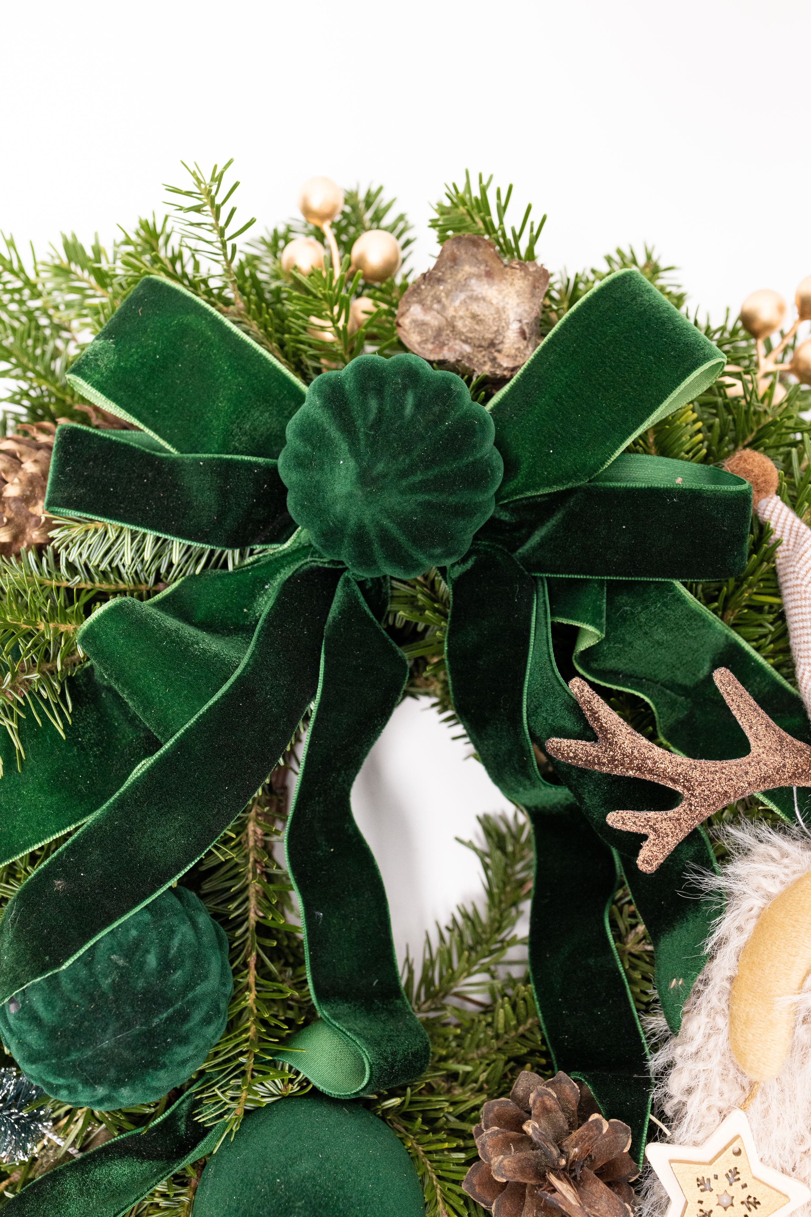 O piesă de lux somptuoasă, creată manual pe o bază bogată de brad natural Nobilis, renumit pentru rezistența sa și nuanța superbă de verde-argintiu. Aranjamentul dispune de o fundă regală din catifea verde smarald, un ren artizanal pufos, globuri catifelate și accente aurii rafinate.