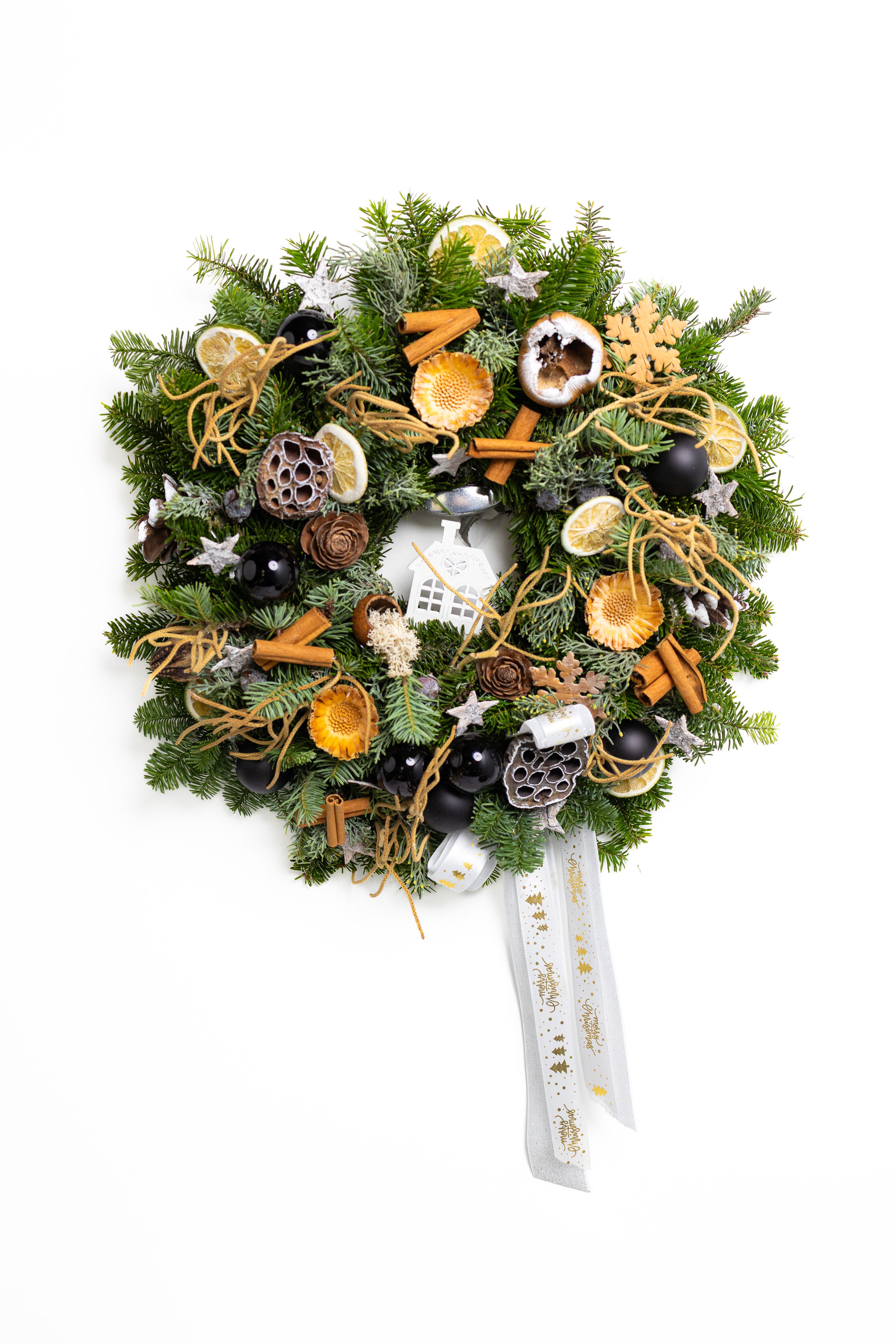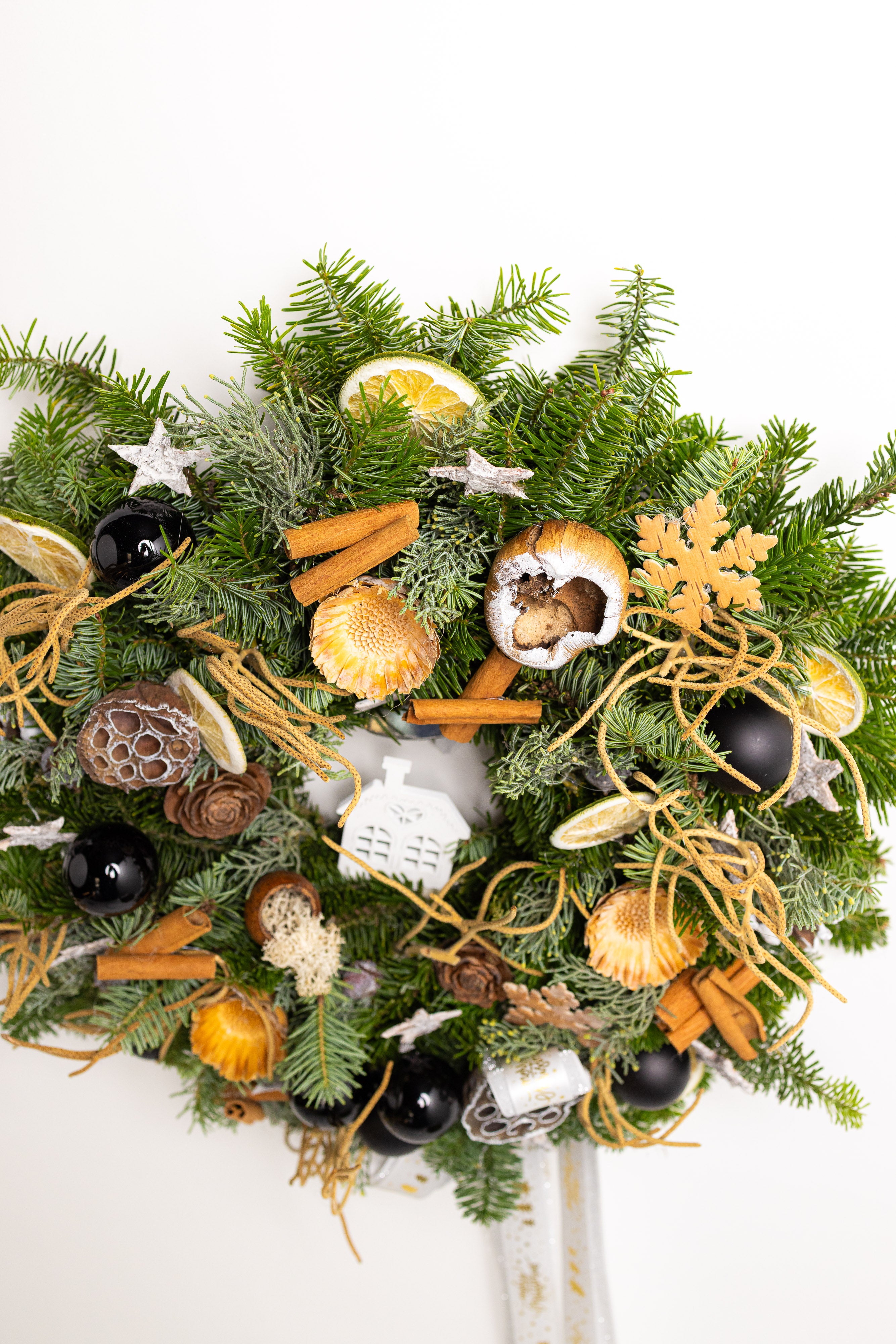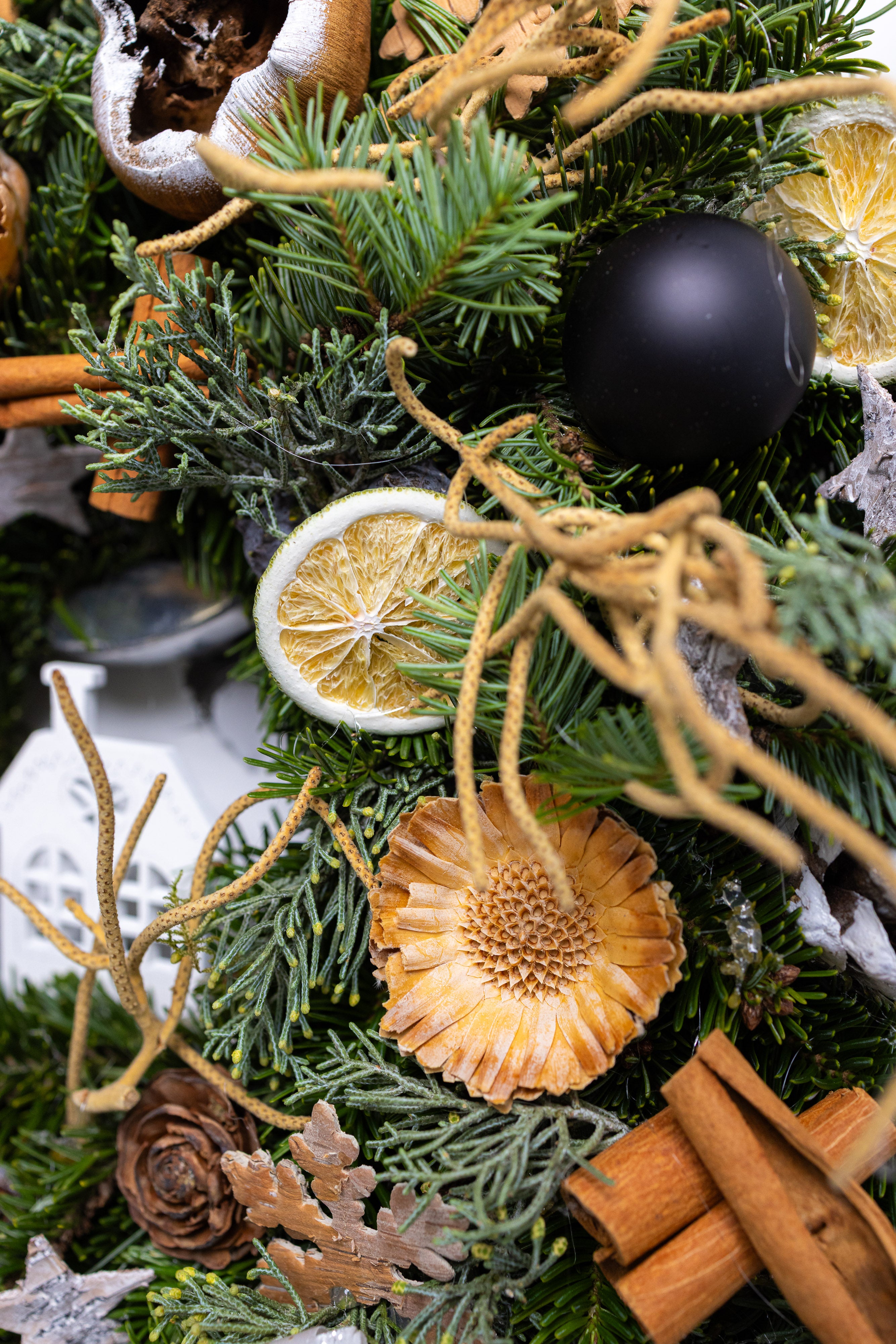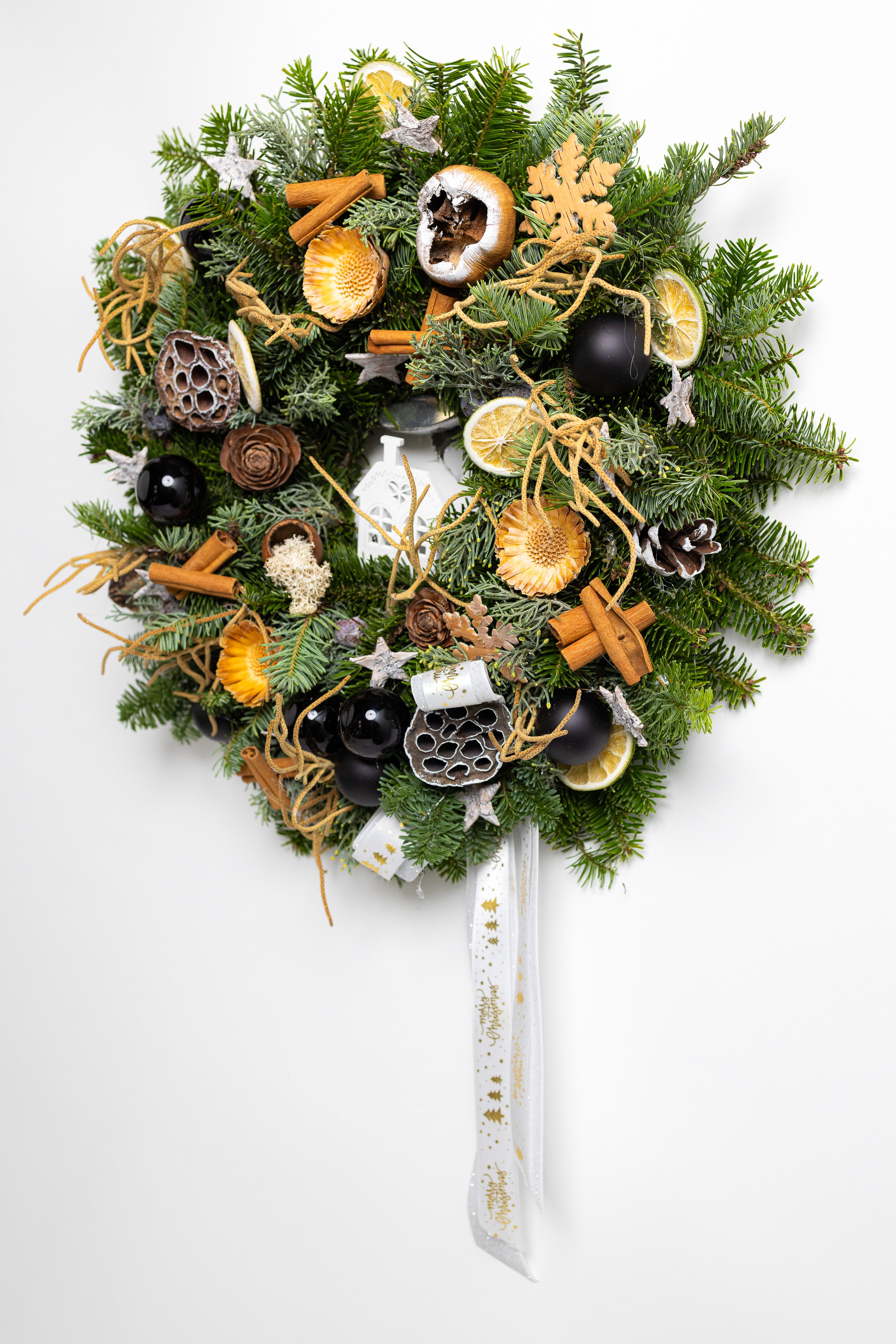 O decorațiune somptuoasă și plină de arome festive, lucrată manual pe o bază densă din brad natural Nobilis. Aranjamentul combină eleganța globurilor negre lucioase cu elemente botanice precum felii de lime, scorțișoară și lotus, oferind un contrast modern și sofisticat.