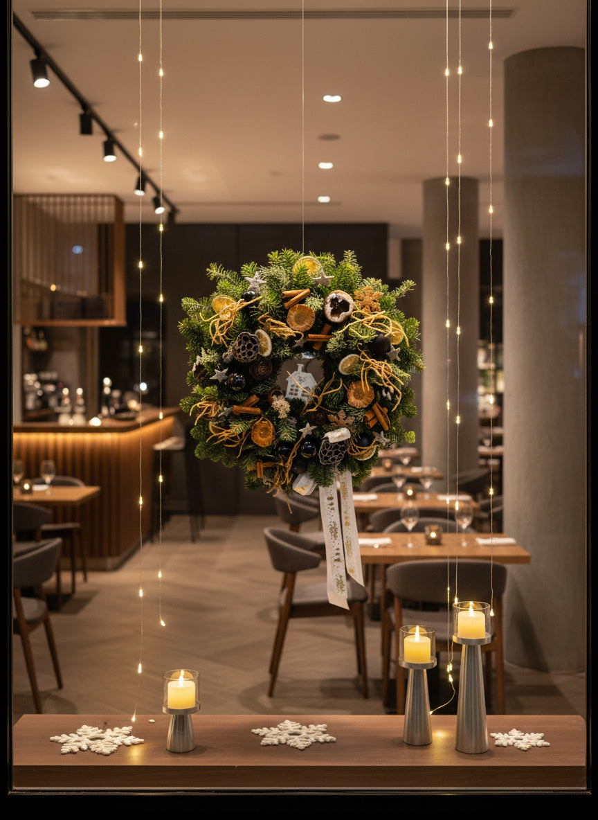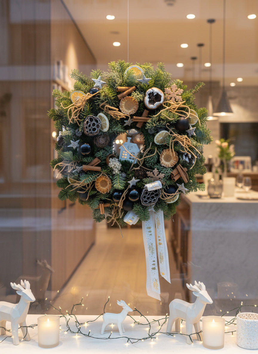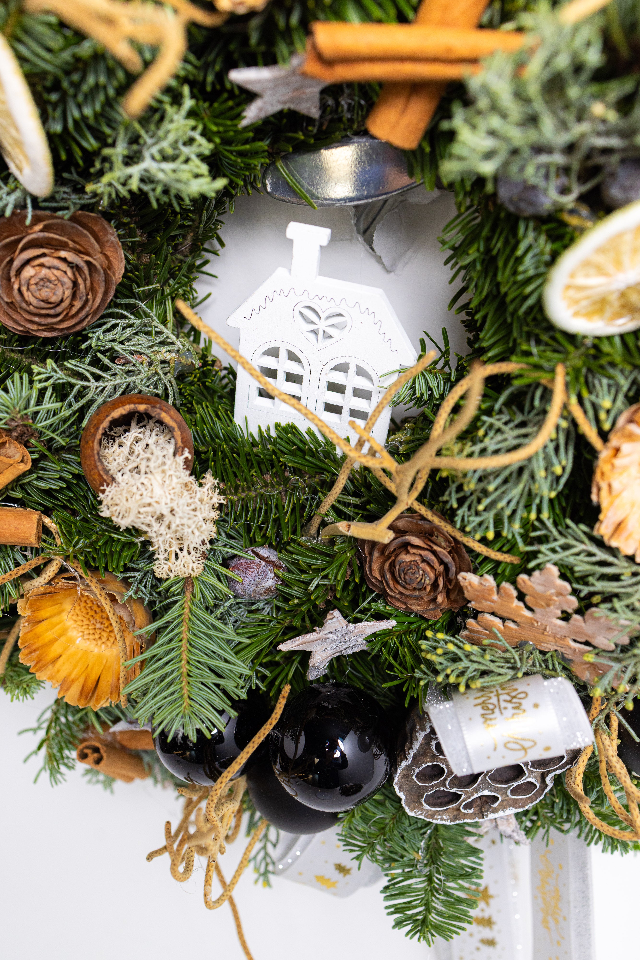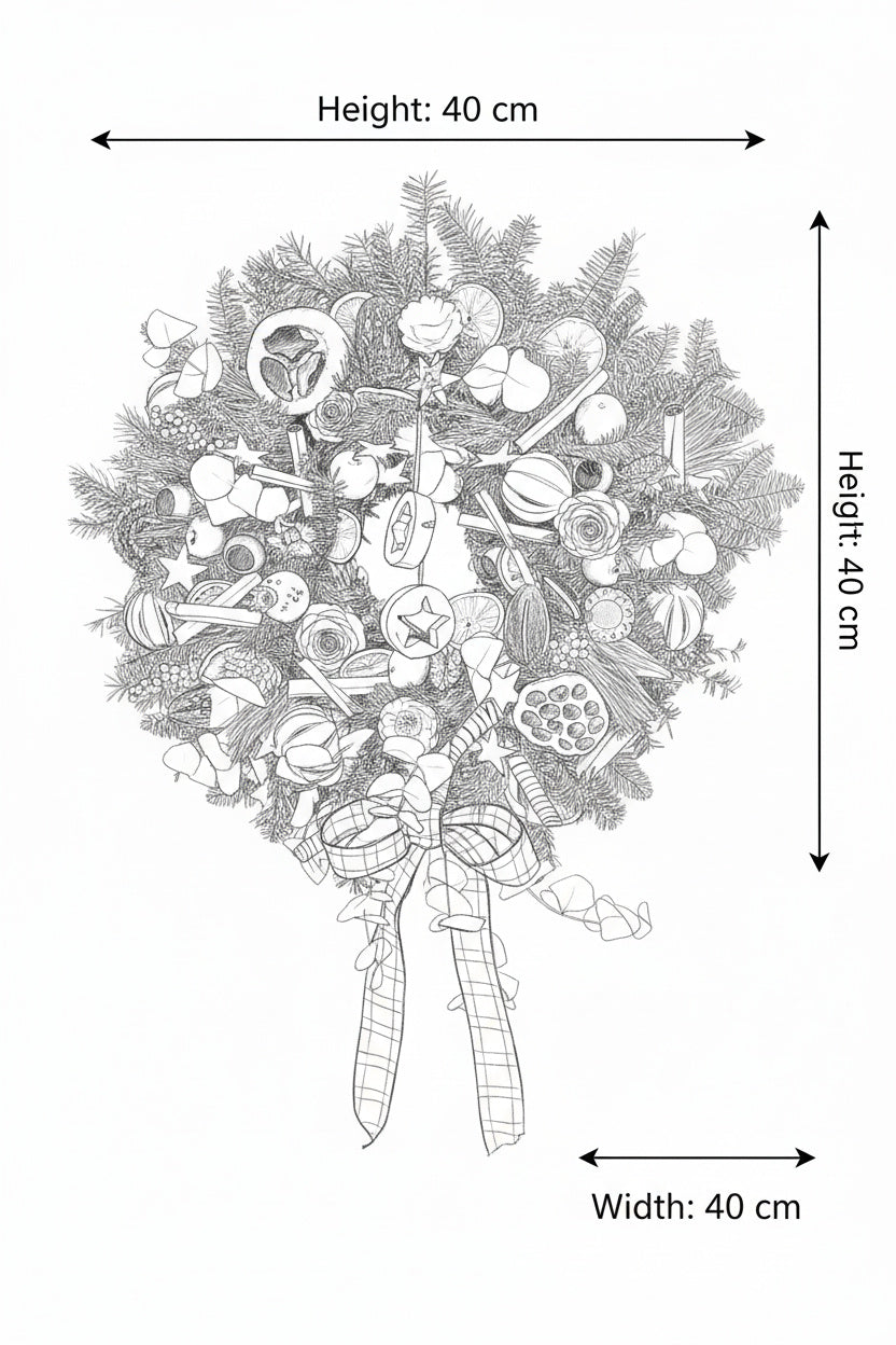 O decorațiune somptuoasă și plină de arome festive, lucrată manual pe o bază densă din brad natural Nobilis. Aranjamentul combină eleganța globurilor negre lucioase cu elemente botanice precum felii de lime, scorțișoară și lotus, oferind un contrast modern și sofisticat.
